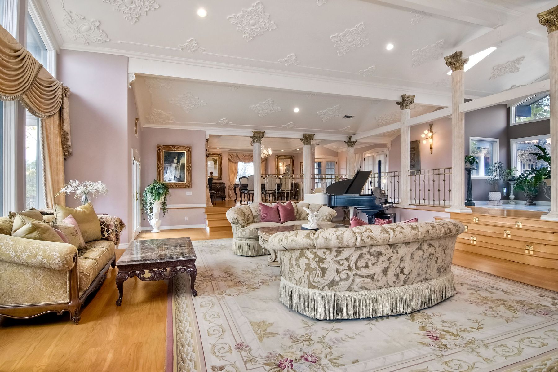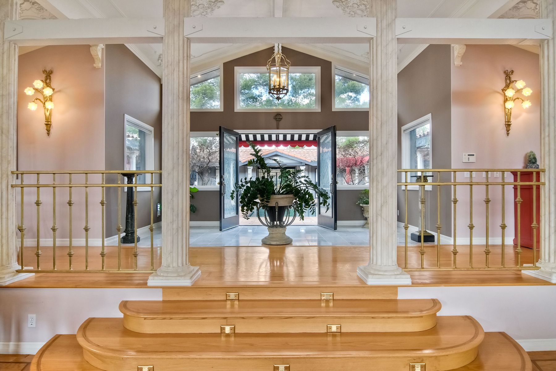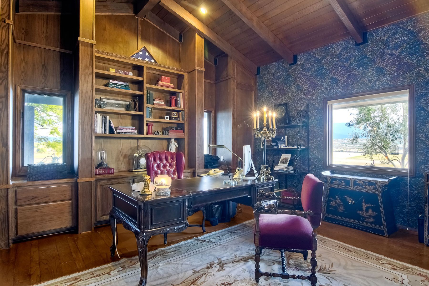 Beamed Ceilings, Built-in Features, Cathedral Ceiling(s), Ceiling Fan(s), Coffered Ceiling(s), Crown Molding, Elevator, Granite Counters, High Ceilings, Open Floorplan, Recessed Lighting, Storage, Wainscoting, Wired for Sound