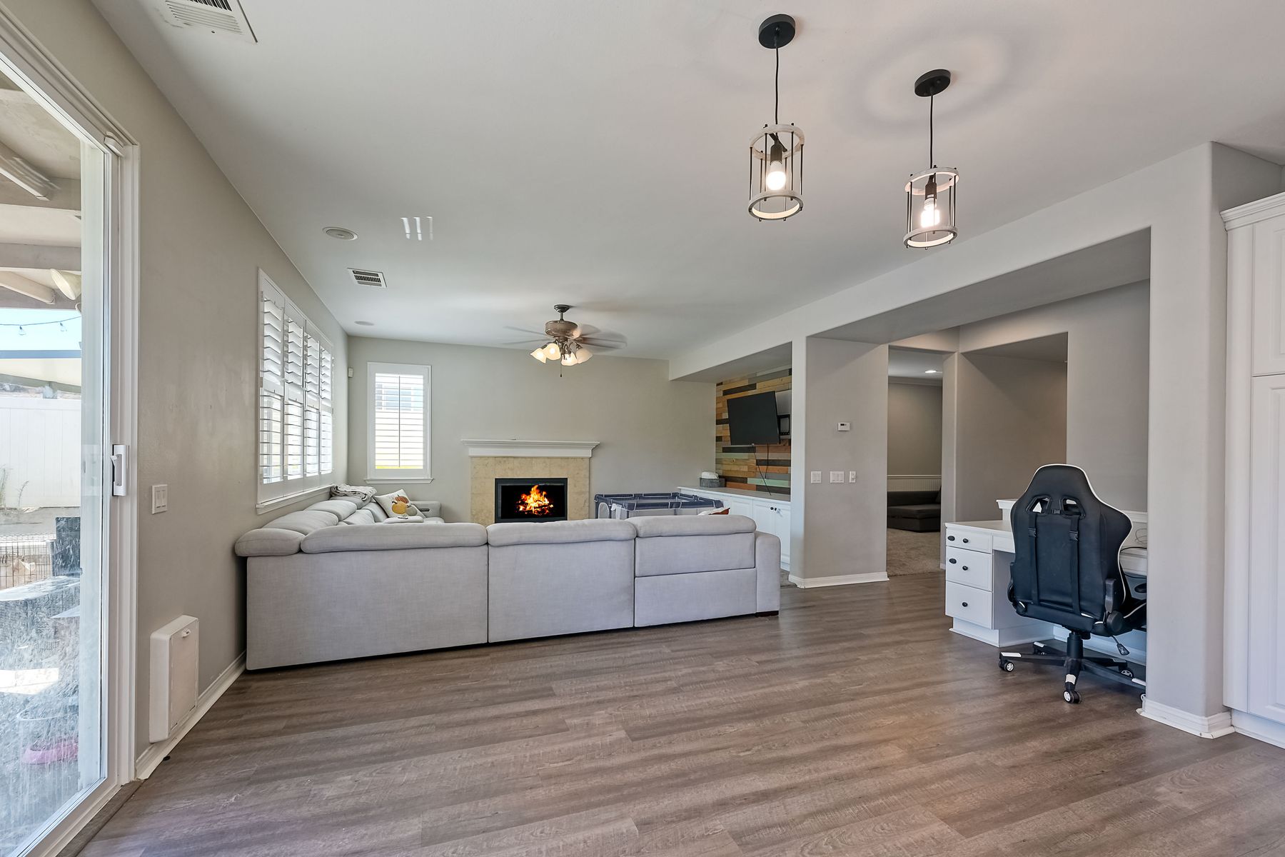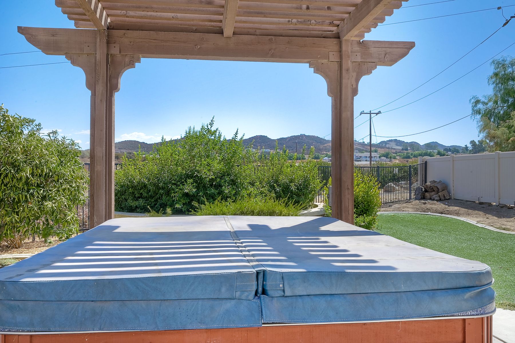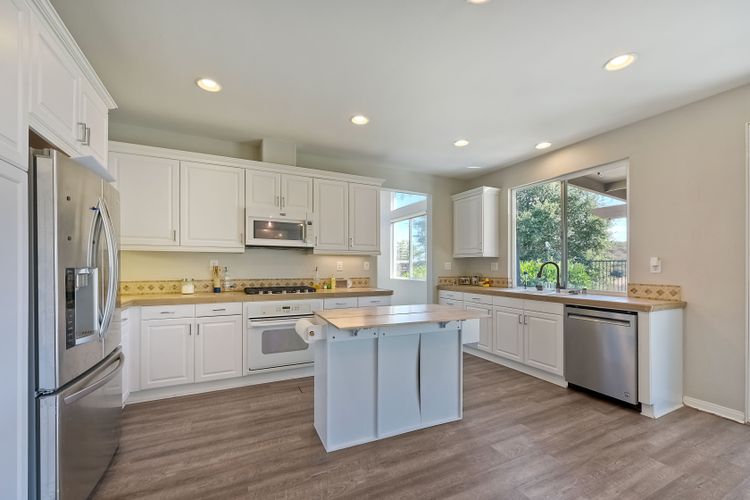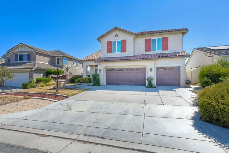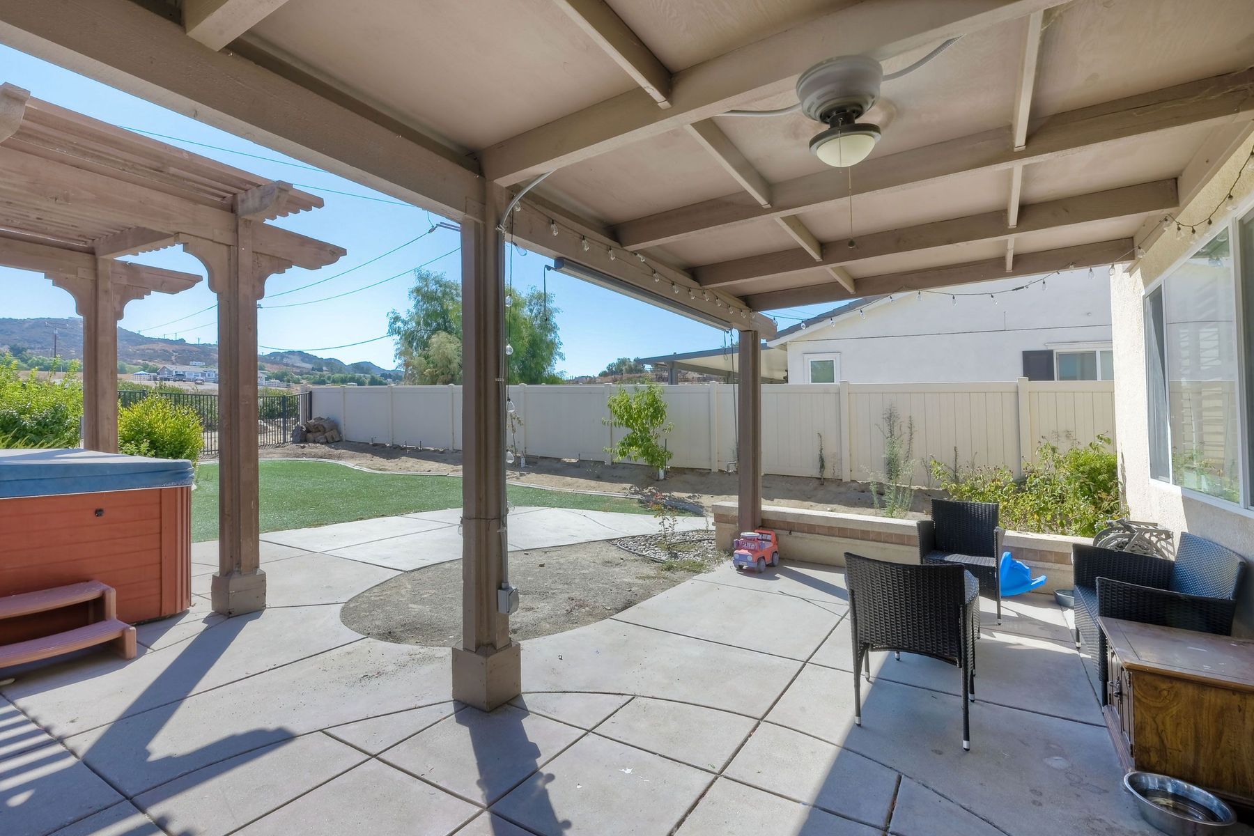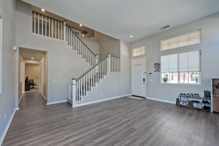 OWNED SOLAR. VIEWS! Discover your dream home in the highly sought-after community of The Farm! This spacious 4 bedroom, 2.5 bathroom home is the perfect gathering spot for friends and family. Step into an expansive great room with soaring ceilings that flows seamlessly into a separate dining area, creating an inviting atmosphere. Downstairs features an open concept family room that has built-in storage and a cozy fire place. The kitchen is equipped with newer appliances and ample cabinet space, ideal for all your culinary adventures. Upstairs, the generously sized primary bedroom includes a spa-like bathroom with a walk-in closet, dual sink vanities, a soaking tub, a separate shower, and an additional vanity area. Additionally, upstairs offers three more well-appointed bedrooms, a full bathroom, and a specially designed workspace that provides flexibility for your needs. Relax in a beautifully landscaped backyard featuring artificial turf, a covered hardscaped patio with a ceiling fan, an above-ground spa, and mature orange trees—all framed by stunning views of the surrounding hills. The home includes a spacious laundry room and a 3-car garage for all your storage needs. The community offers an array of amenities, including 3 pools, 2 spas, hiking trails, picnic areas, playgrounds, a basketball court, soccer and baseball fields, a catch-and-release fishing pond, and RV storage. Convenient access to freeways. Don’t miss out on this incredible opportunity to own a home that perfectly blends comfort, style, and community!