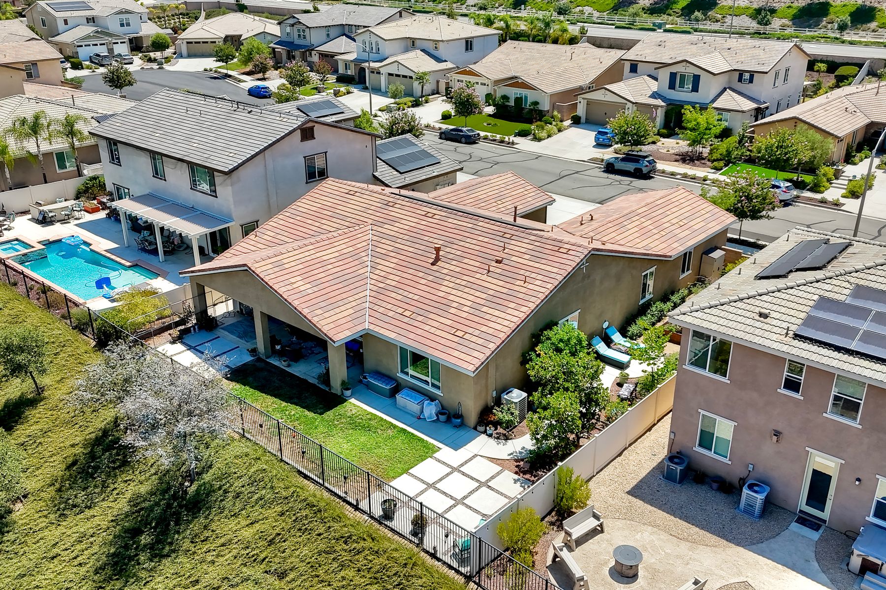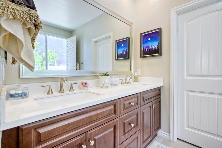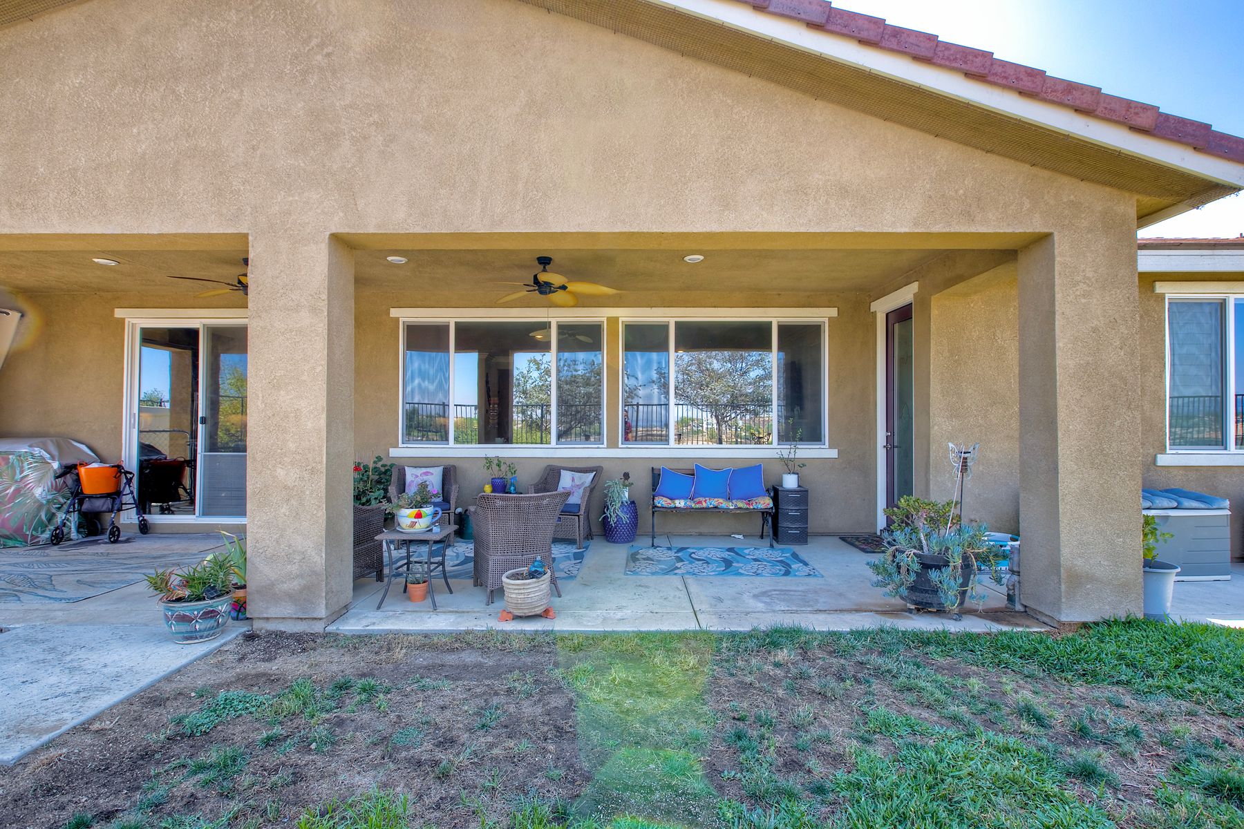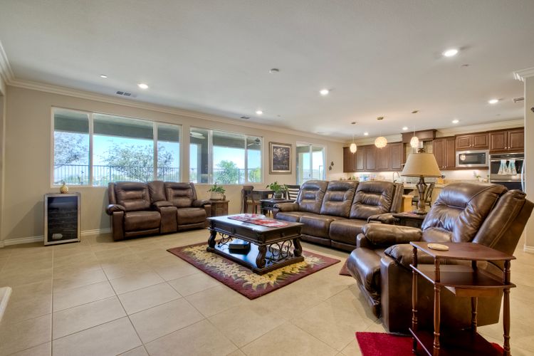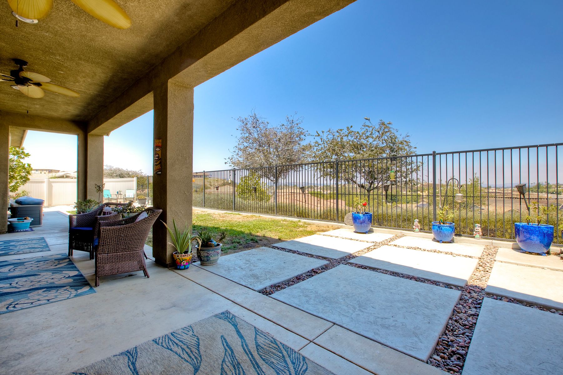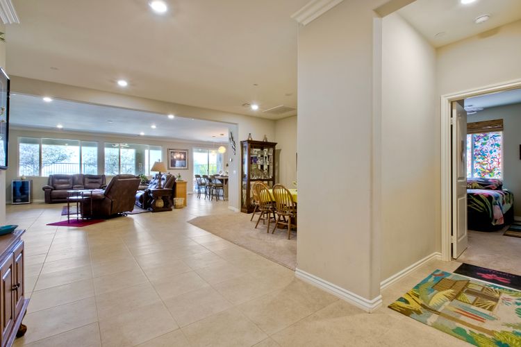 Searching for the perfect single-story home with a great floor plan - look no further. Open concept kitchen/dining and great room, flooded with natural light. Generous sized Primary Ensuite with large walk-in closet and door to patio to enjoy views. 2nd bedroom down the hall, another full bathroom, a dedicated office space and a teen/game room. 3rd bedroom with ensuite on opposite side of the house, perfect for in-law suite or guest room. Ceiling fans throughout as well as whole house fan. Head out to the backyard the views are amazing while you sit under the covered patio. Around the side of the home, raised garden beds, fruit trees, low maintenance yard. Solar is leased.
