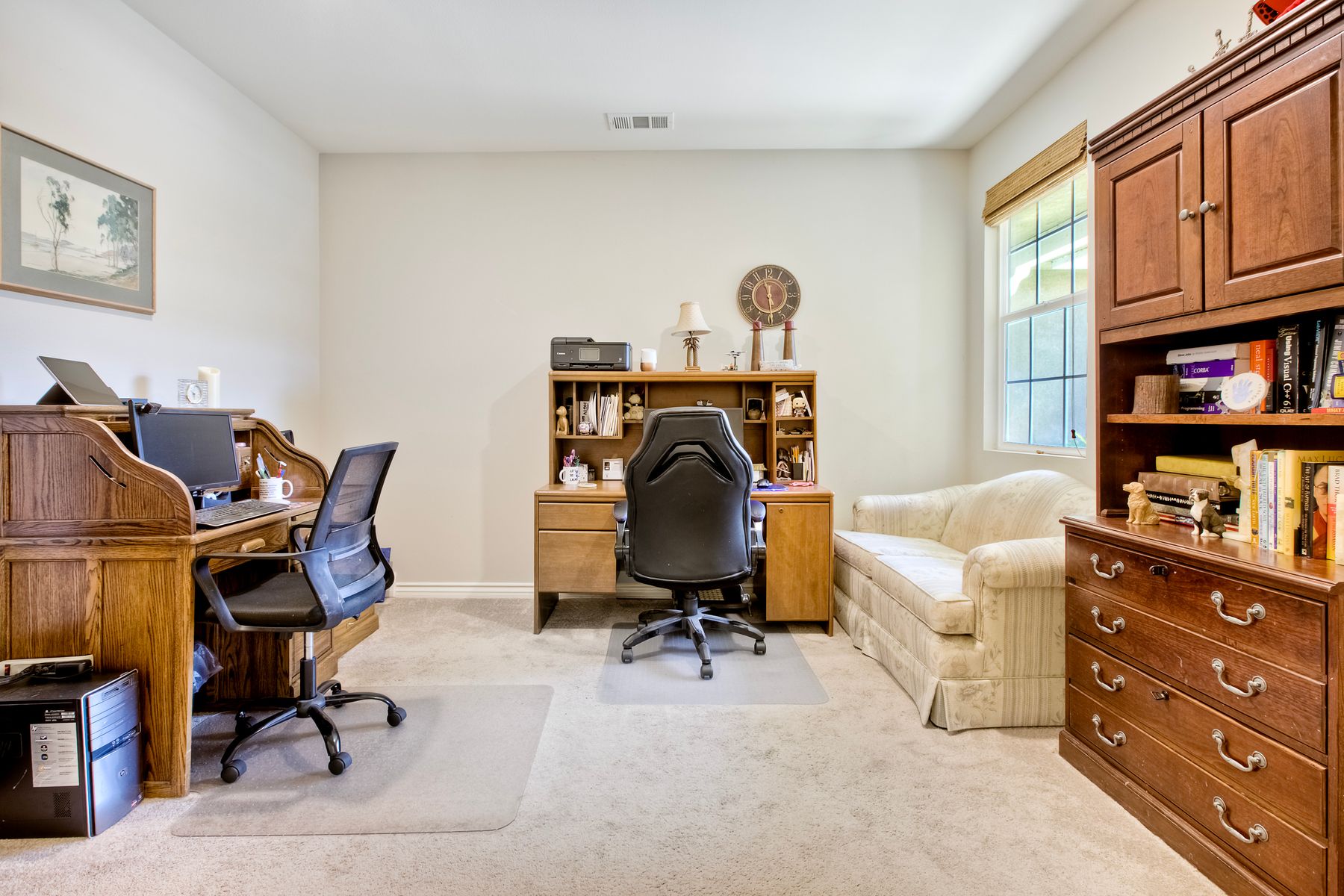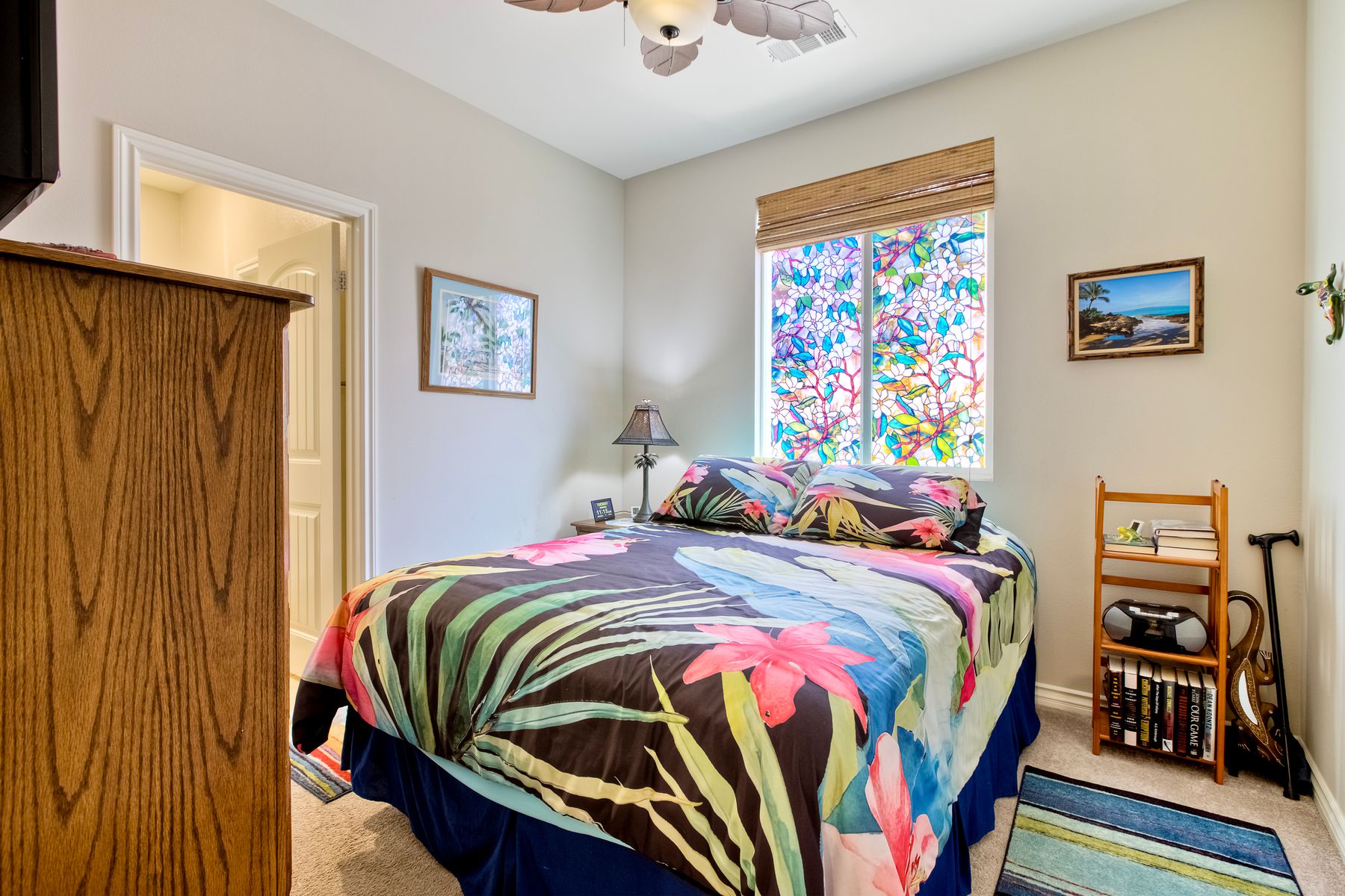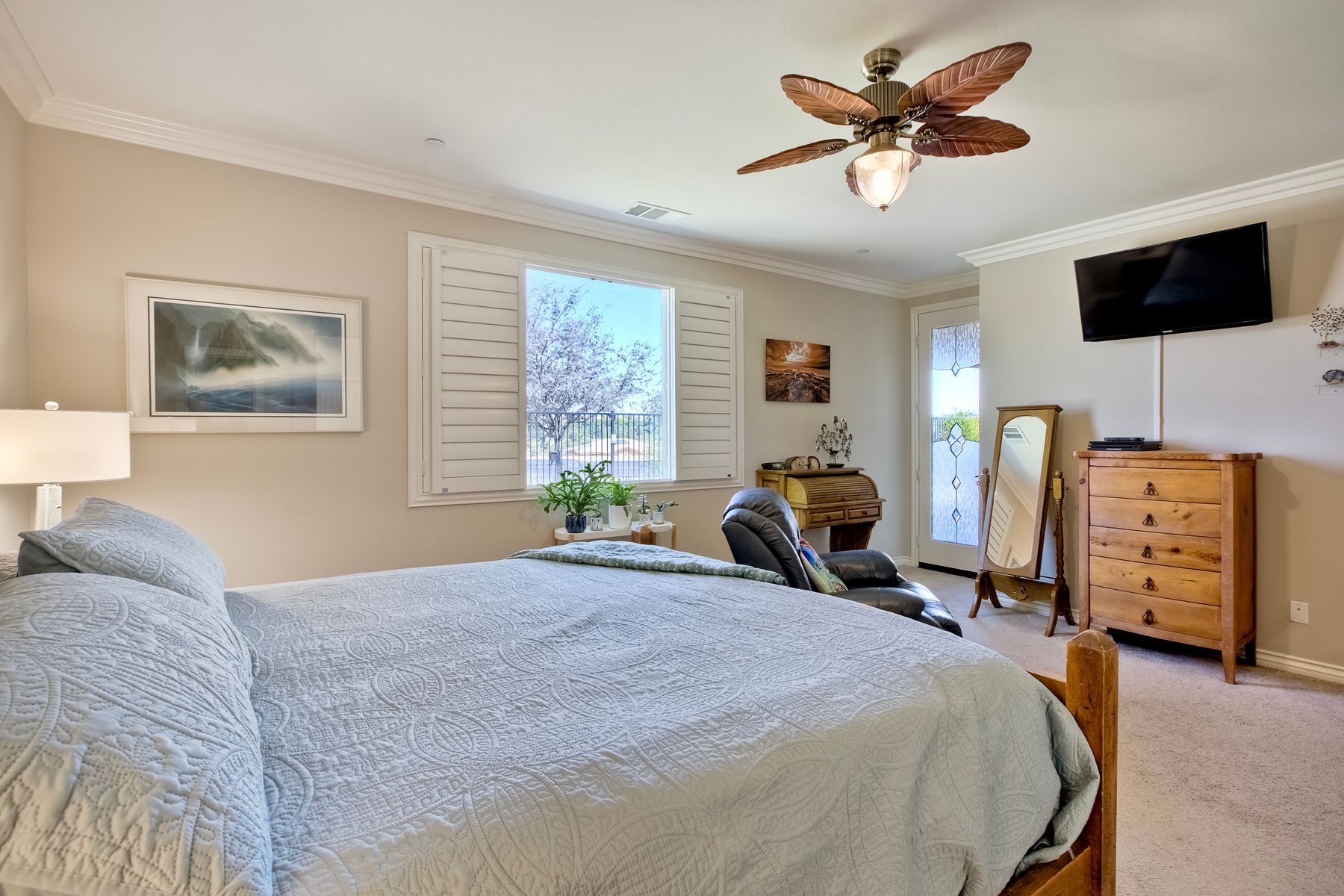 Searching for the perfect single-story home with a great floor plan - look no further. Open concept kitchen/dining and great room, flooded with natural light. Generous sized Primary Ensuite with large walk-in closet and door to patio to enjoy views. 2nd bedroom down the hall, another full bathroom, a dedicated office space and a teen/game room. 3rd bedroom with ensuite on opposite side of the house, perfect for in-law suite or guest room. Ceiling fans throughout as well as whole house fan. Head out to the backyard the views are amazing while you sit under the covered patio. Around the side of the home, raised garden beds, fruit trees, low maintenance yard. Solar is leased.