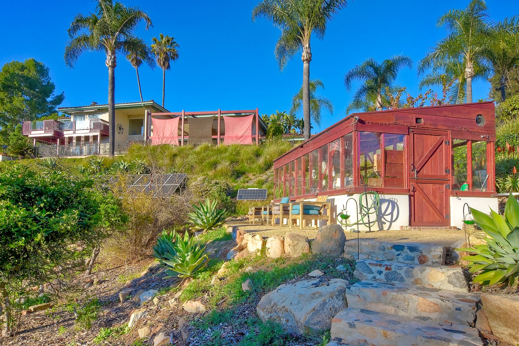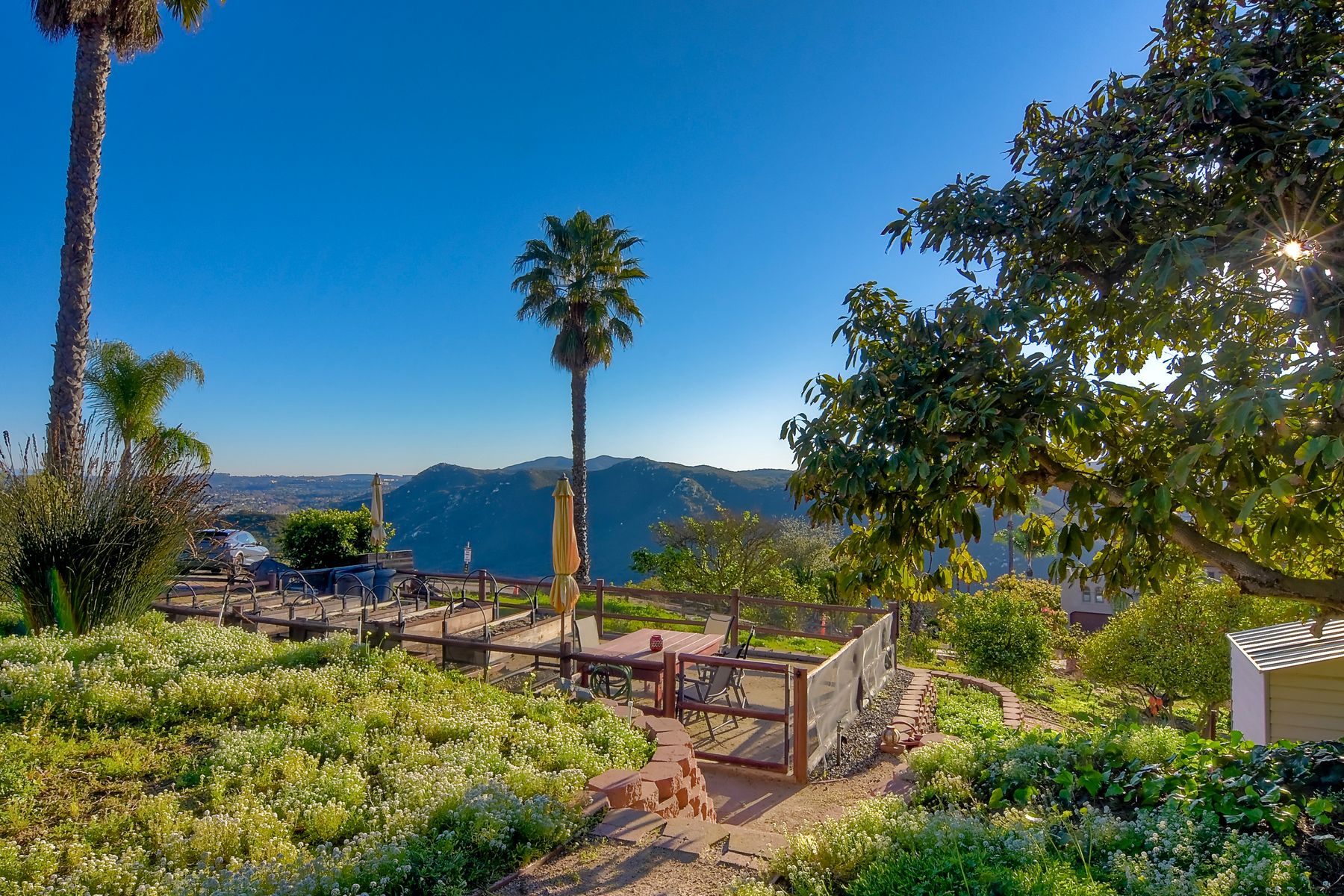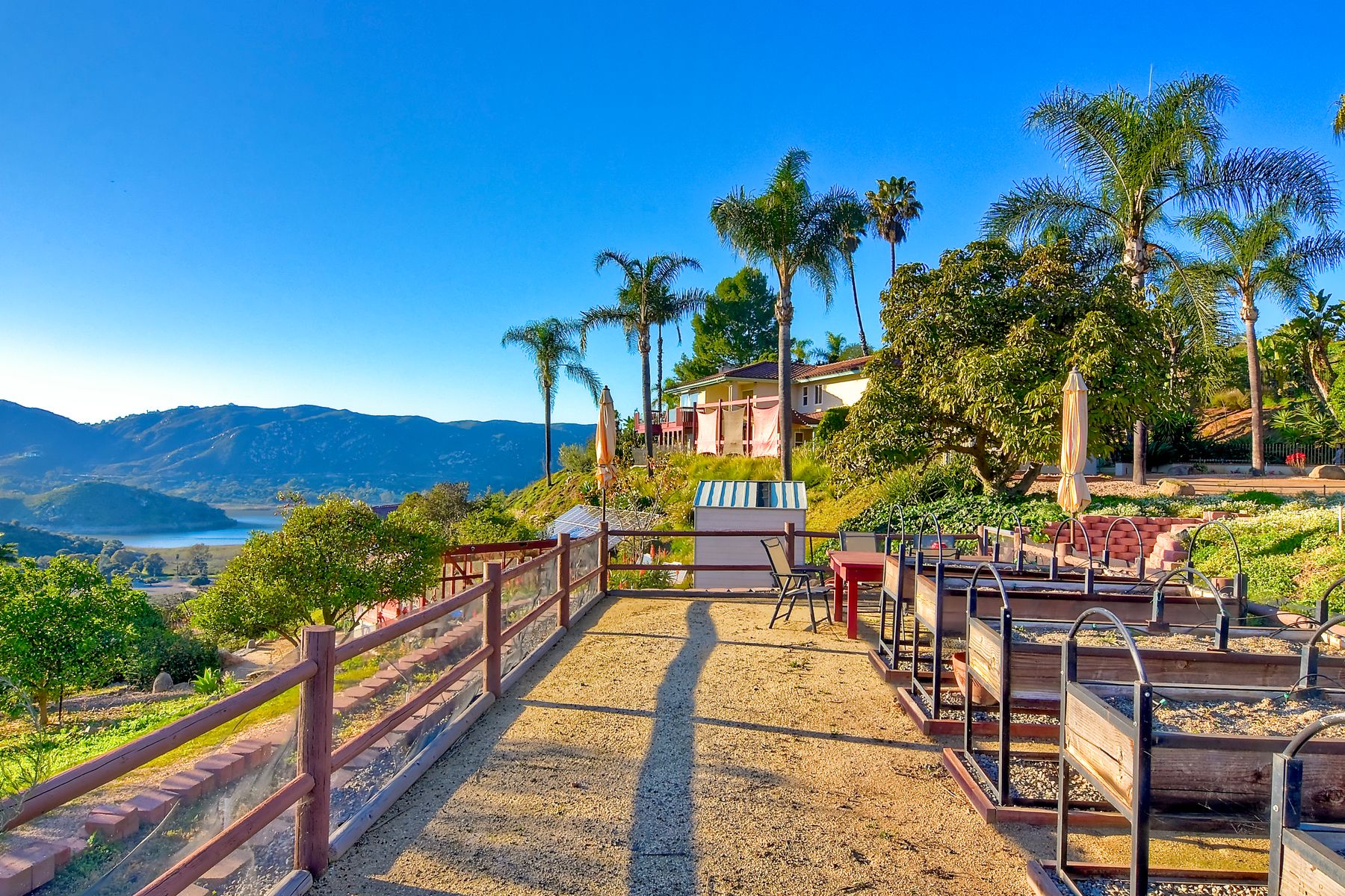 If growing your own food is on your bucket list, this home is for you. Is planting a vineyard something you've always dreamed of? There's room for that! The amazing green house and multiple fruits trees, are there for you to enjoy all year long. Featuring views of both Lake Hodges and Rancho Bernardo, this home offers privacy, quiet and room to roam. Large and spacious, with views from almost any room you're enter, you'll love the beautiful sunsets and sunrises. The Primary has a deck to enjoy coffee in the morning and wine at night. The other bedrooms feature Juliette balconies overlooking the beautiful yard. Swim in your solar heated pool all year long.