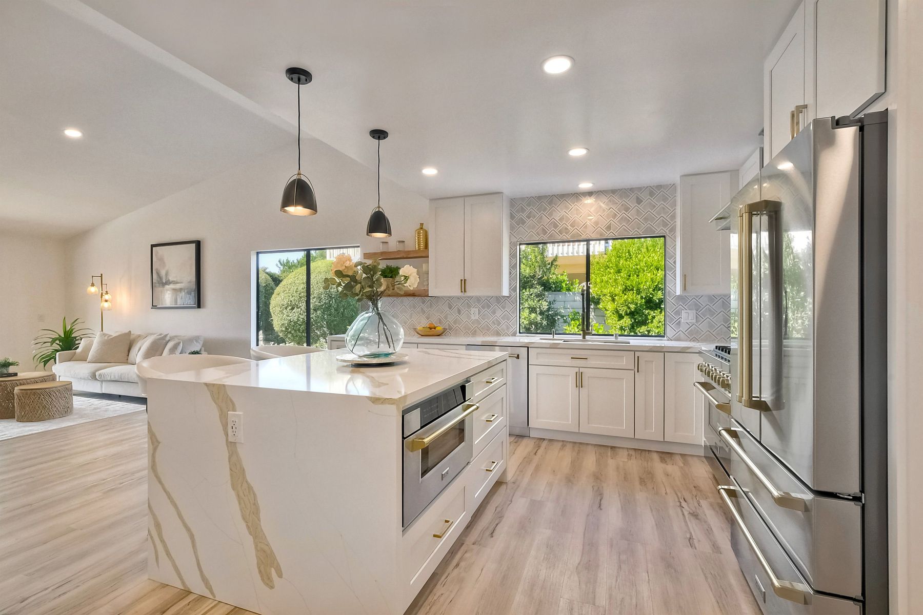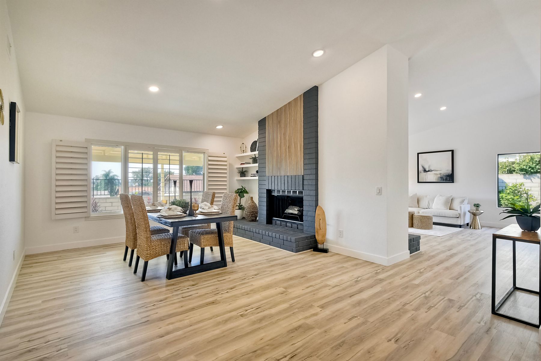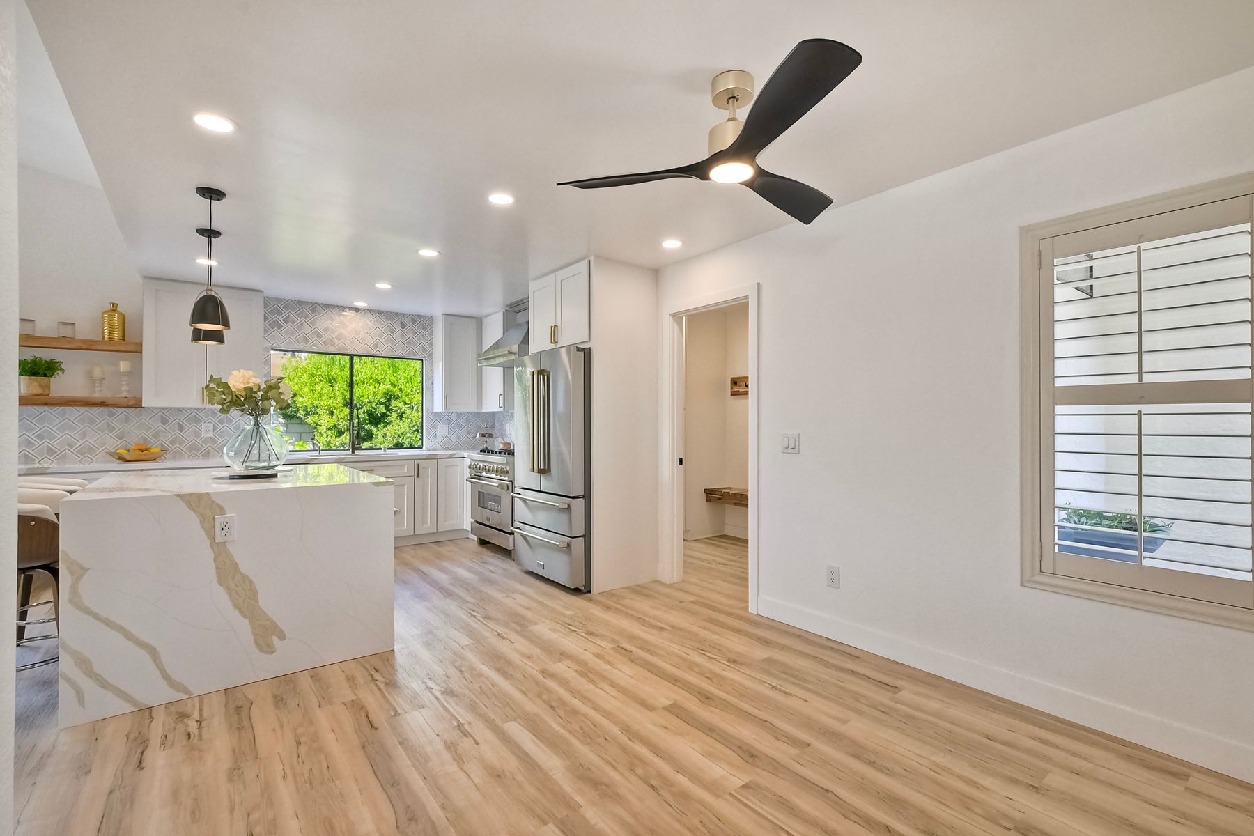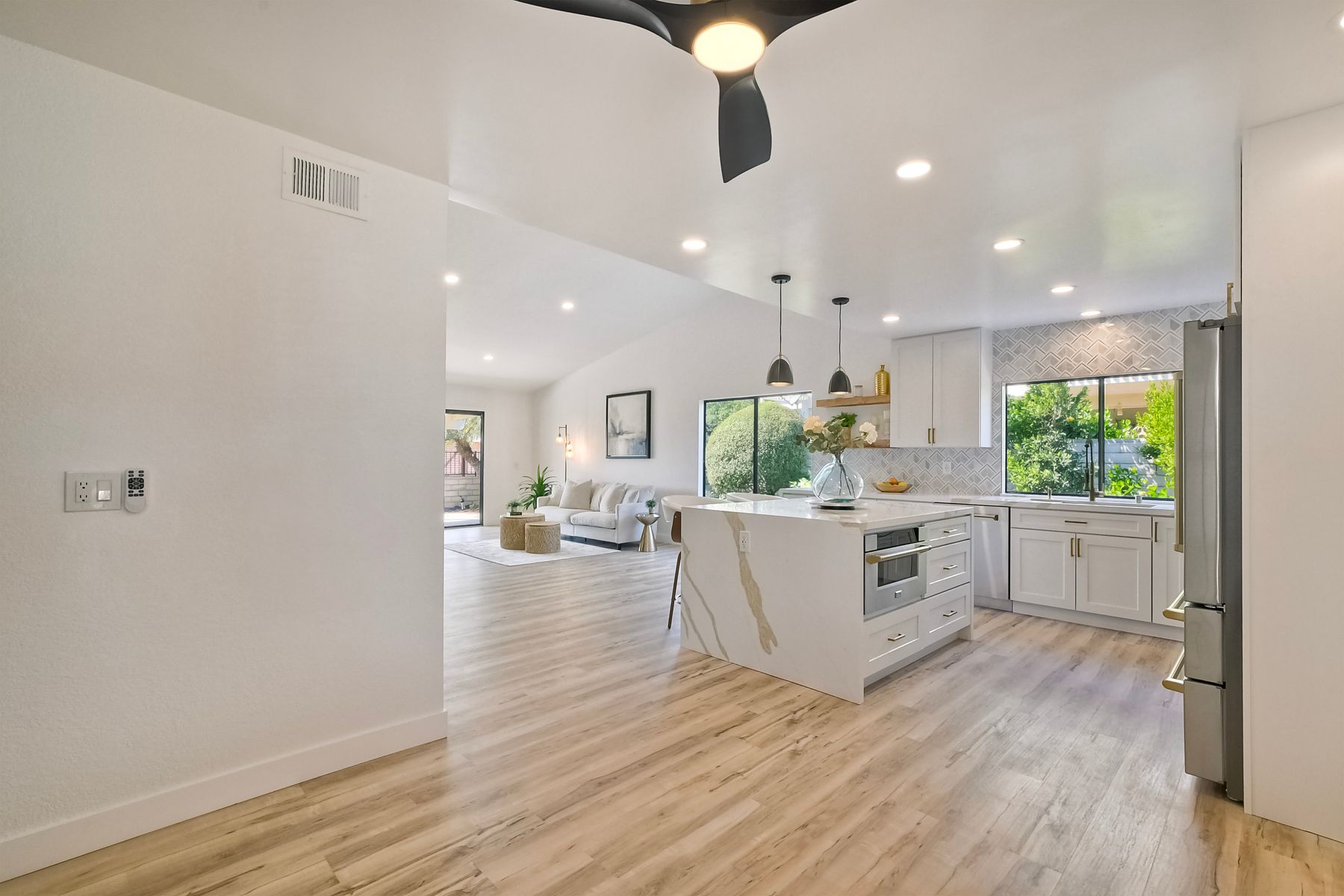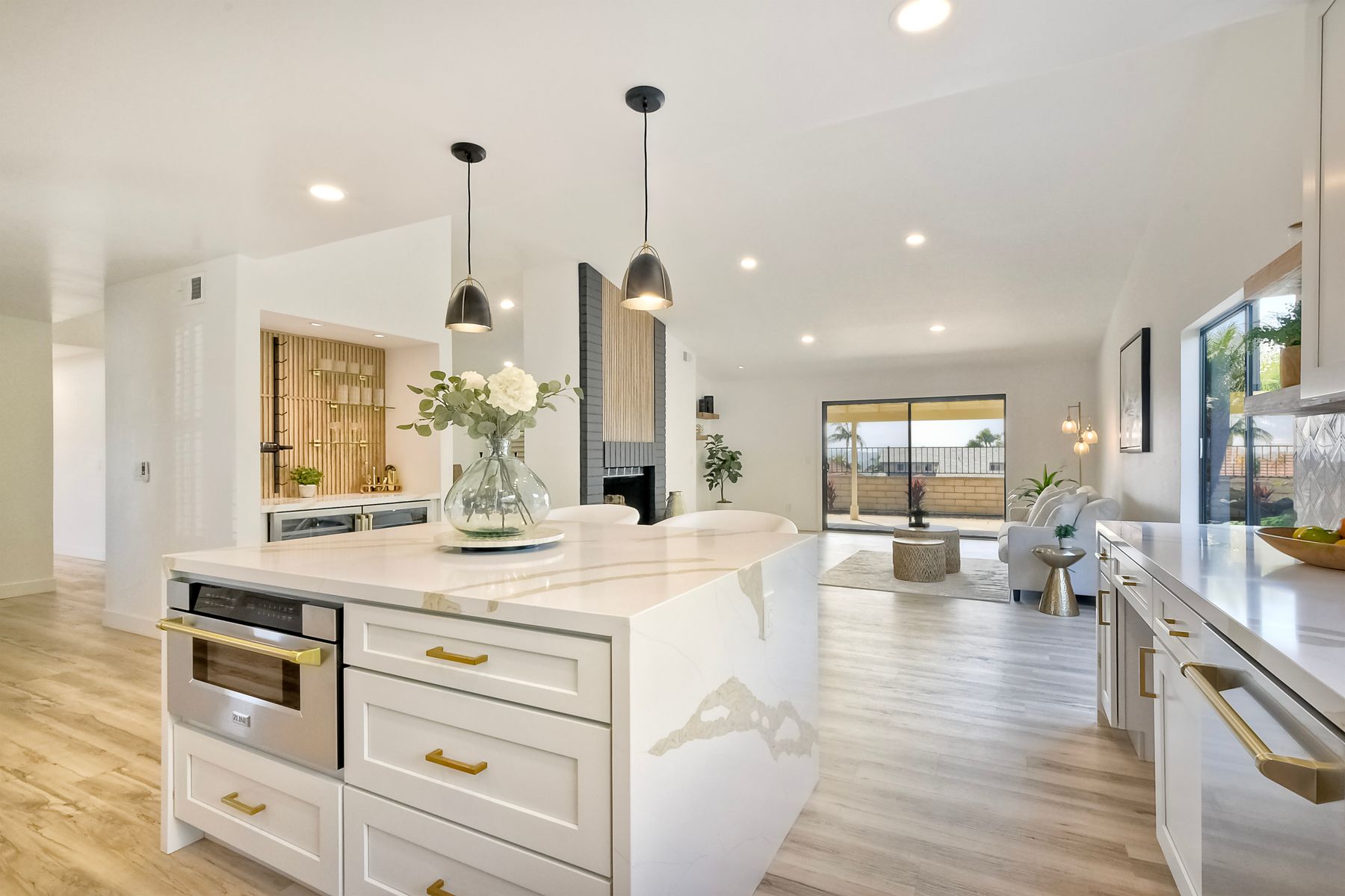 Beautifully modernized single story home with interior that blends elegance with comfort. The open floor plan features high ceilings, luxury vinyl floors, and plantation shutters, all bathed in natural light, creating a bright and airy atmosphere. The gourmet kitchen is a chef’s dream, boasting brand new cabinets, beverage center, Zline appliances, custom lighting fixtures, beverage center, pantry, and a stunning island with waterfall stone countertops. The attention to detail continues with cozy fireplaces in both the family and dining rooms. Both bathrooms have been fully remodeled with designer touches including new cabinets, countertops, custom tile, and upgraded fixtures. The master suite is a serene retreat with a large walk-in closet, custom organizers, an accent wall, and an en-suite bath featuring double sinks and luxurious finishes.Step outside into your own west-facing outdoor oasis, perfect for entertaining or simply relaxing. With low maintenance manicured landscaping, you’ll feel like you’ve entered your personal paradise. Plus, the coastal breeze keeps the home cool all year round. This is more than just a home—it’s a rare opportunity to experience luxury living in one of Carlsbad’s most sought-after neighborhoods. Meticulously designed home sits on a spacious 7,443 sq ft flat lot, with no HOA fees, Mello Roos, no powerlines or road noise. Beautifully modernized interior that blends elegance with comfort.