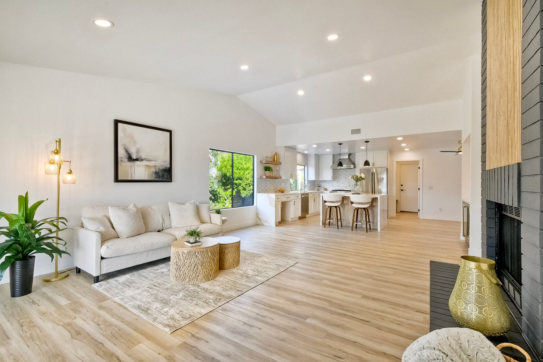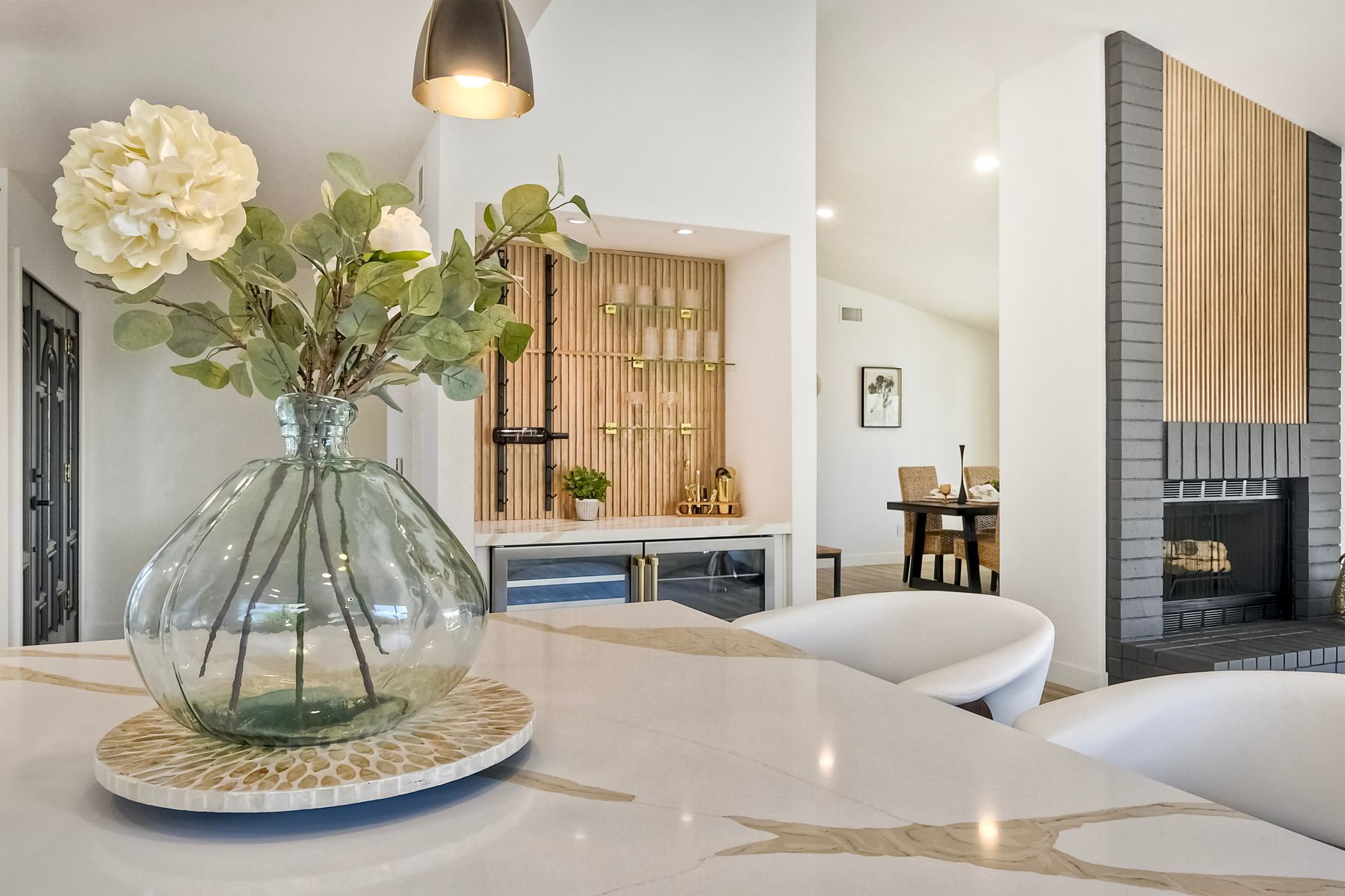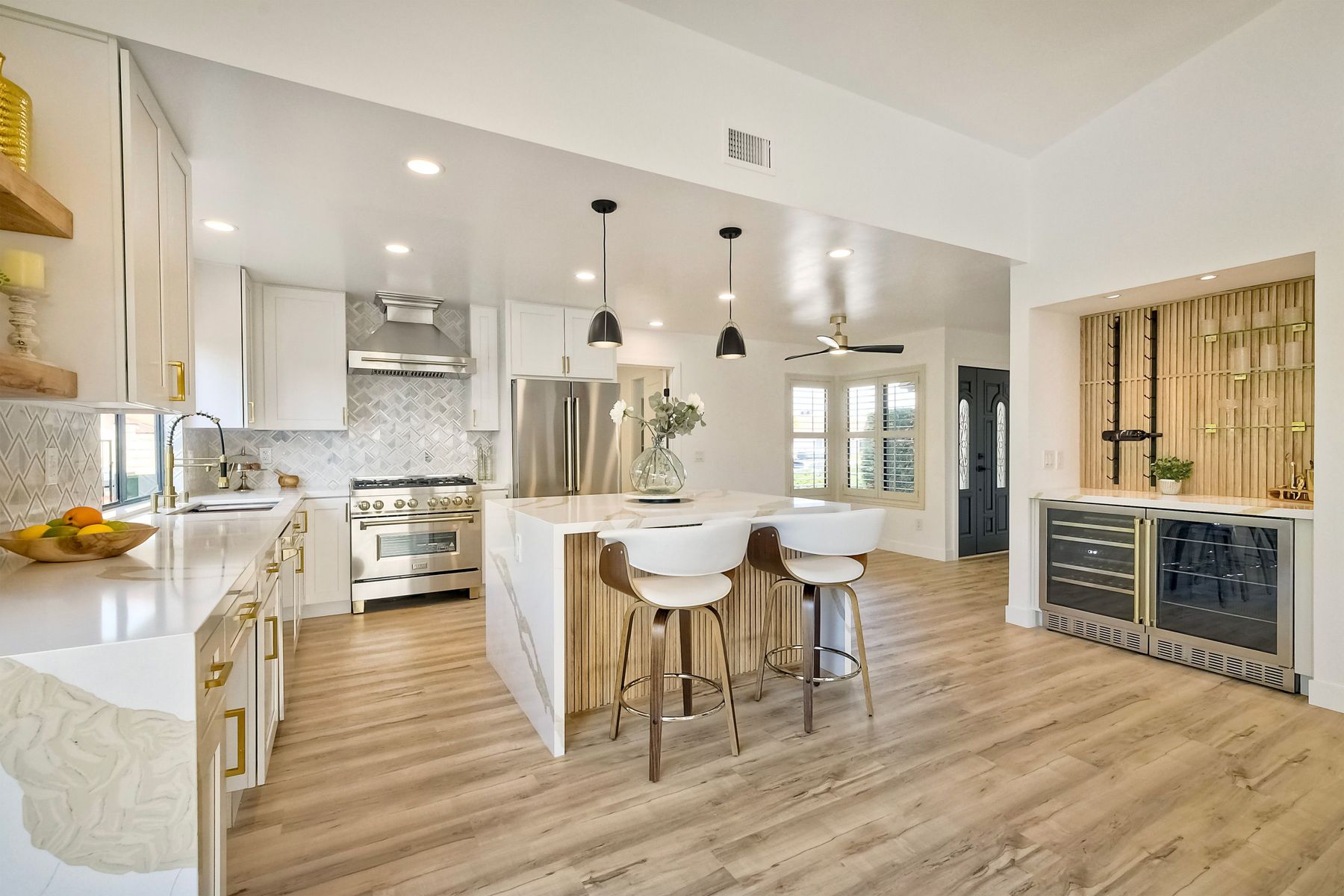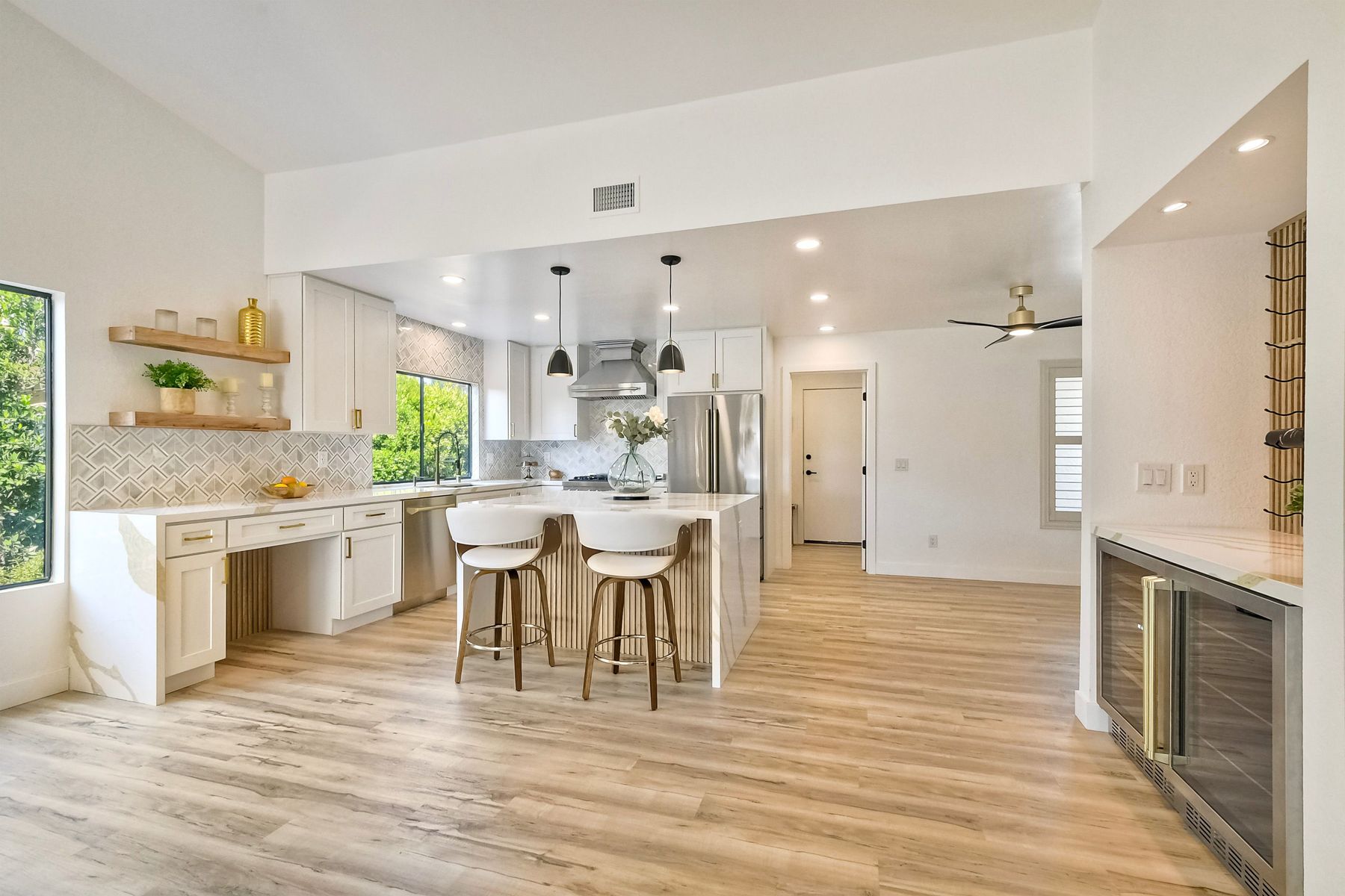Beautifully modernized single story home with interior that blends elegance with comfort. The open floor plan features high ceilings, luxury vinyl floors, and plantation shutters, all bathed in natural light, creating a bright and airy atmosphere. The gourmet kitchen is a chef’s dream, boasting brand new cabinets, beverage center, Zline appliances, custom lighting fixtures, beverage center, pantry, and a stunning island with waterfall stone countertops. The attention to detail continues with cozy fireplaces in both the family and dining rooms. Both bathrooms have been fully remodeled with designer touches including new cabinets, countertops, custom tile, and upgraded fixtures. The master suite is a serene retreat with a large walk-in closet, custom organizers, an accent wall, and an en-suite bath featuring double sinks and luxurious finishes.Step outside into your own west-facing outdoor oasis, perfect for entertaining or simply relaxing. With low maintenance manicured landscaping, you’ll feel like you’ve entered your personal paradise. Plus, the coastal breeze keeps the home cool all year round. This is more than just a home—it’s a rare opportunity to experience luxury living in one of Carlsbad’s most sought-after neighborhoods. Meticulously designed home sits on a spacious 7,443 sq ft flat lot, with no HOA fees, Mello Roos, no powerlines or road noise. Beautifully modernized interior that blends elegance with comfort.