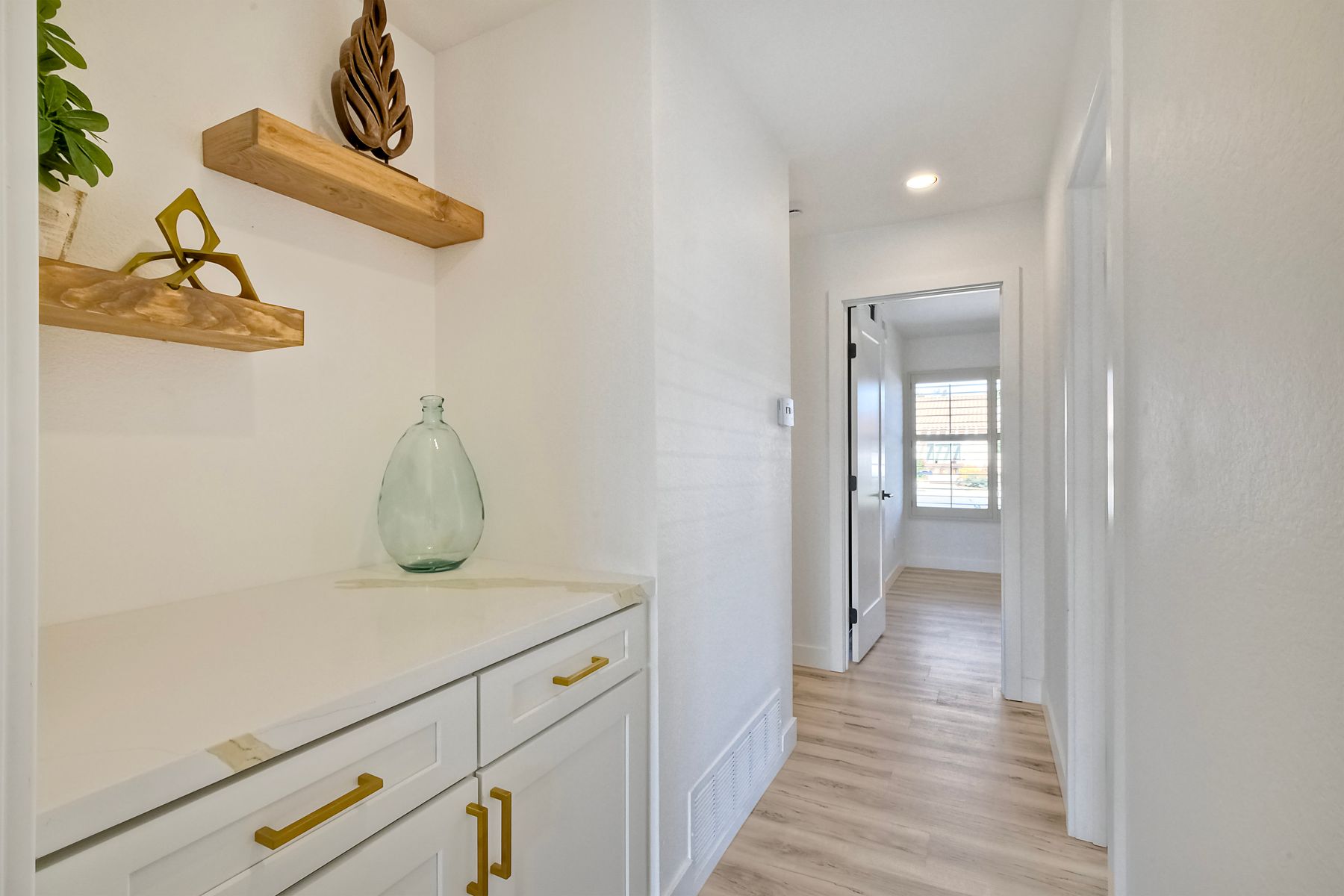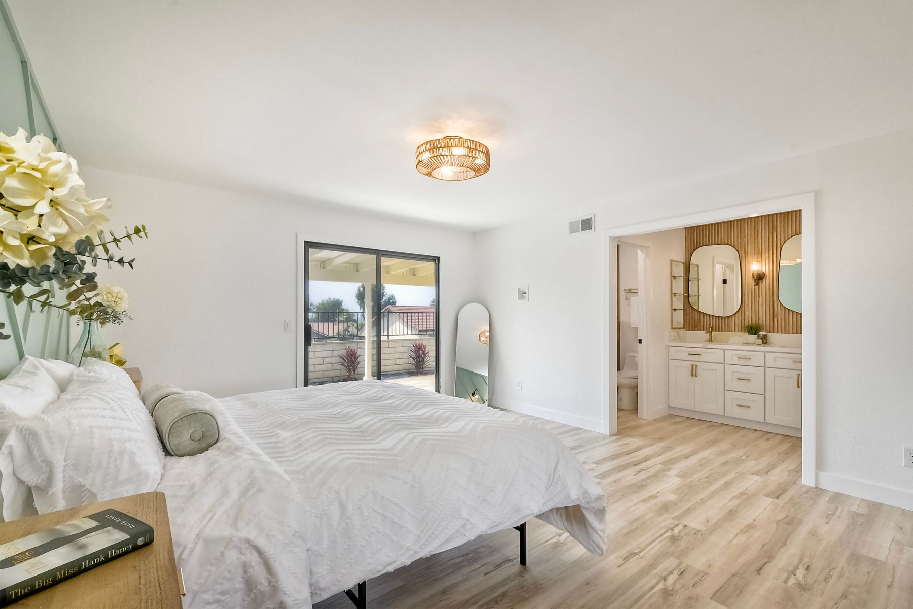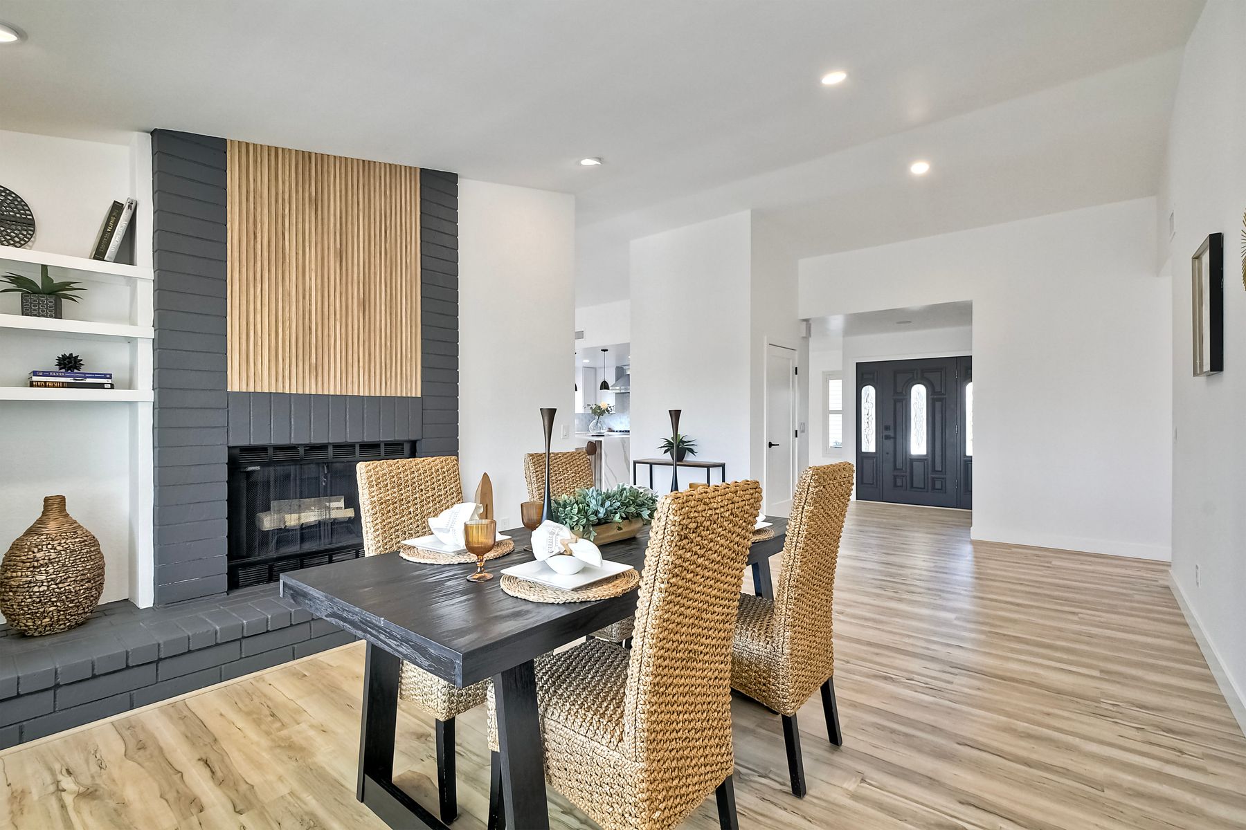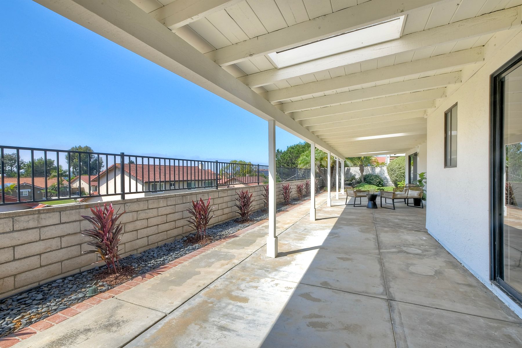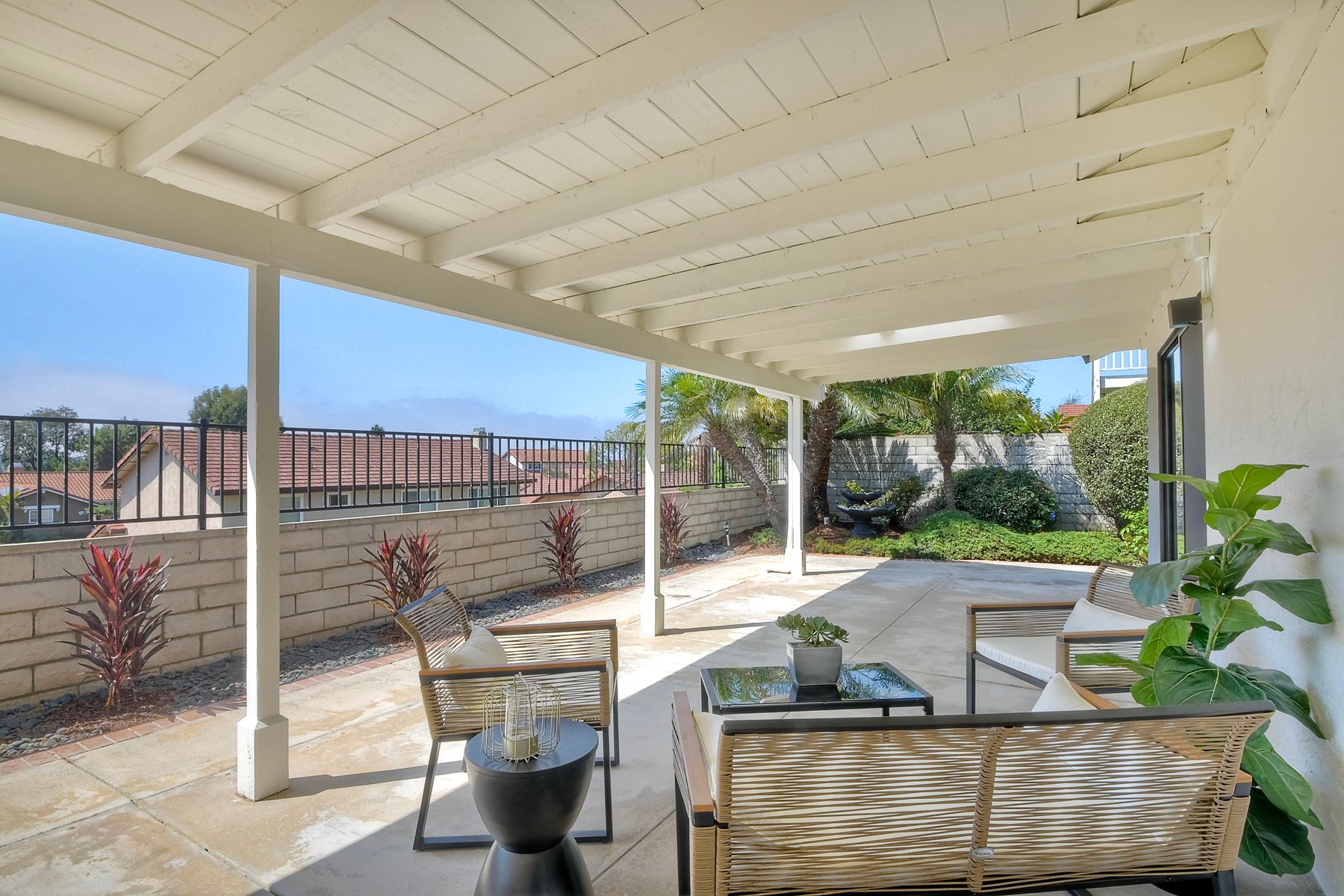 Beautifully modernized single story home with interior that blends elegance with comfort. The open floor plan features high ceilings, luxury vinyl floors, and plantation shutters, all bathed in natural light, creating a bright and airy atmosphere. The gourmet kitchen is a chef’s dream, boasting brand new cabinets, beverage center, Zline appliances, custom lighting fixtures, beverage center, pantry, and a stunning island with waterfall stone countertops. The attention to detail continues with cozy fireplaces in both the family and dining rooms. Both bathrooms have been fully remodeled with designer touches including new cabinets, countertops, custom tile, and upgraded fixtures. The master suite is a serene retreat with a large walk-in closet, custom organizers, an accent wall, and an en-suite bath featuring double sinks and luxurious finishes.Step outside into your own west-facing outdoor oasis, perfect for entertaining or simply relaxing. With low maintenance manicured landscaping, you’ll feel like you’ve entered your personal paradise. Plus, the coastal breeze keeps the home cool all year round. This is more than just a home—it’s a rare opportunity to experience luxury living in one of Carlsbad’s most sought-after neighborhoods. Meticulously designed home sits on a spacious 7,443 sq ft flat lot, with no HOA fees, Mello Roos, no powerlines or road noise. Beautifully modernized interior that blends elegance with comfort.