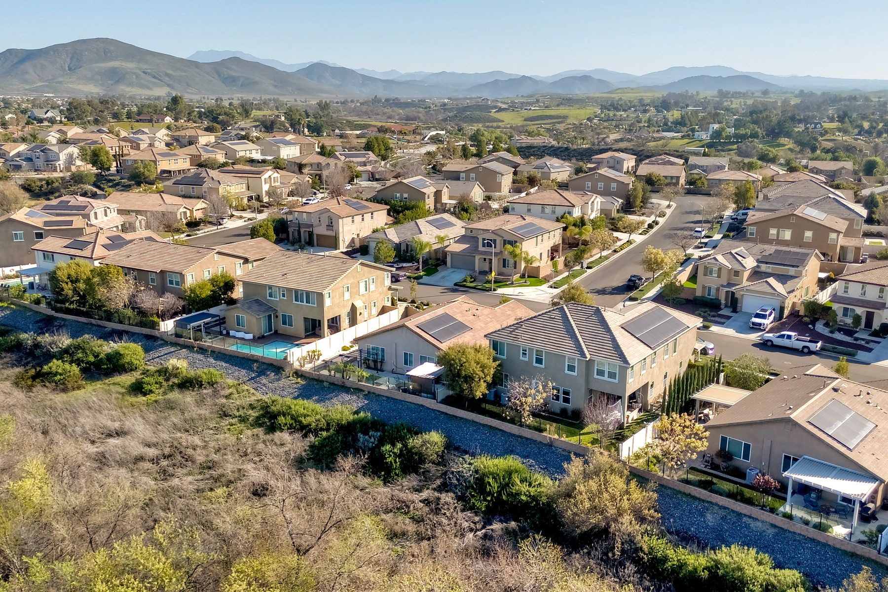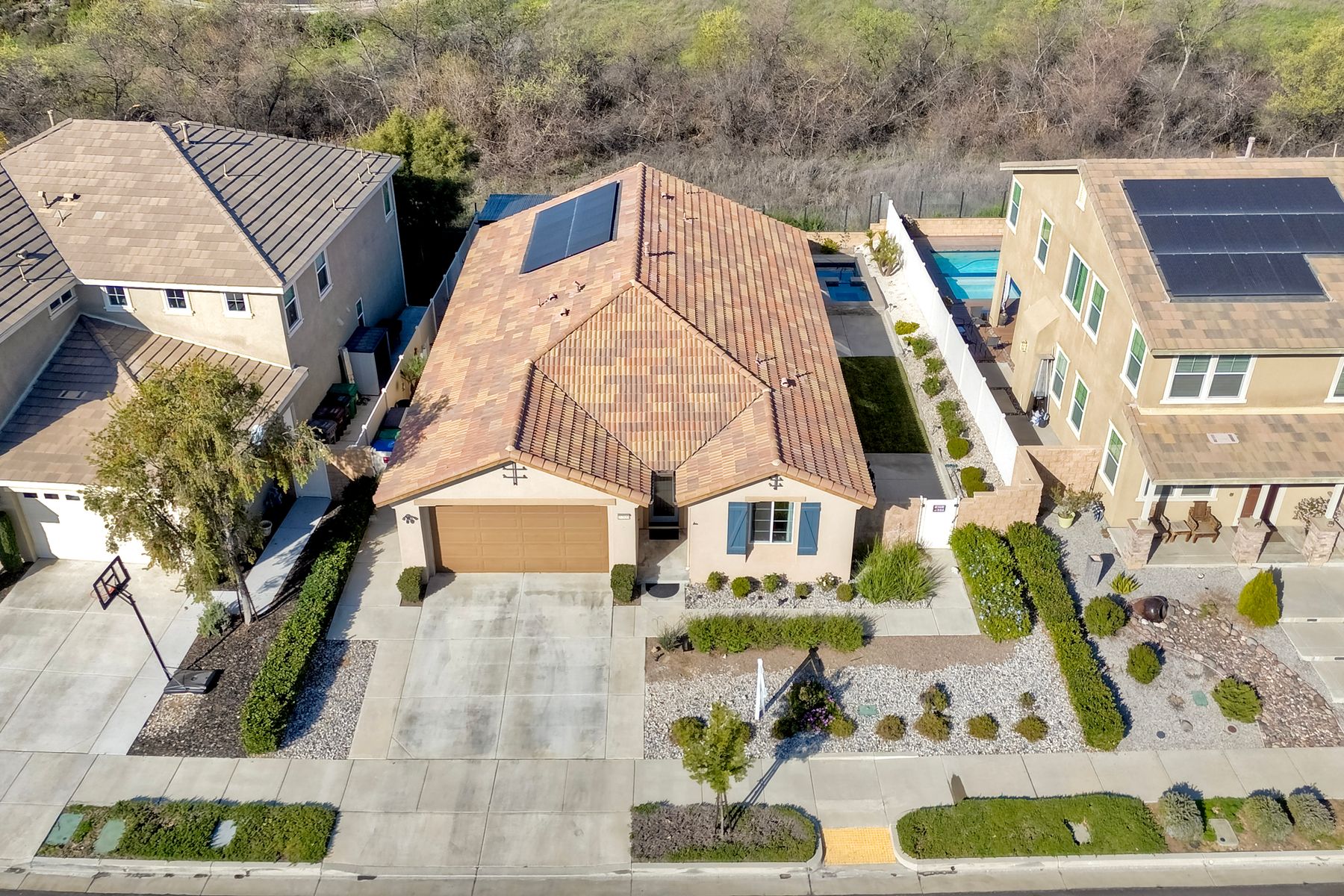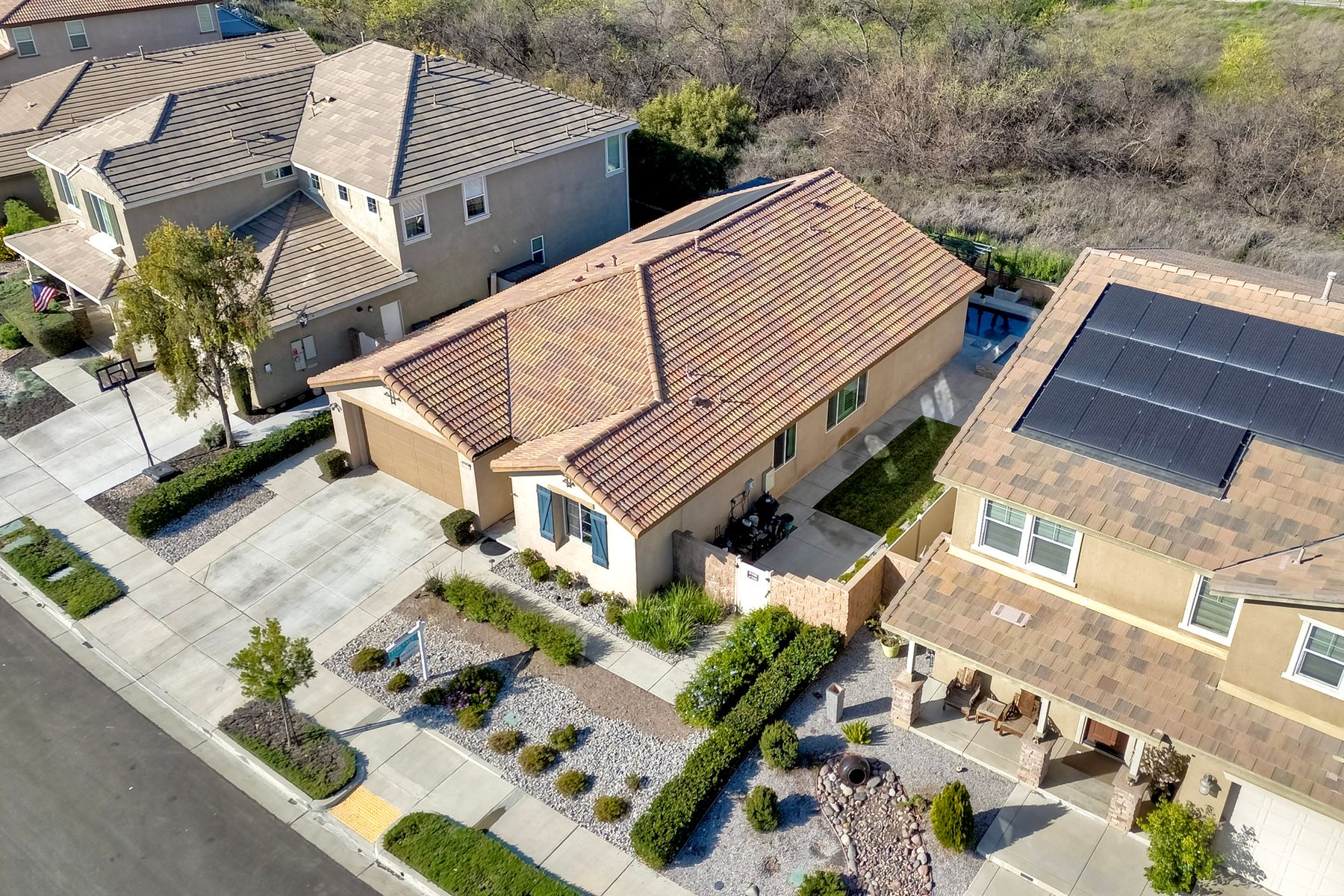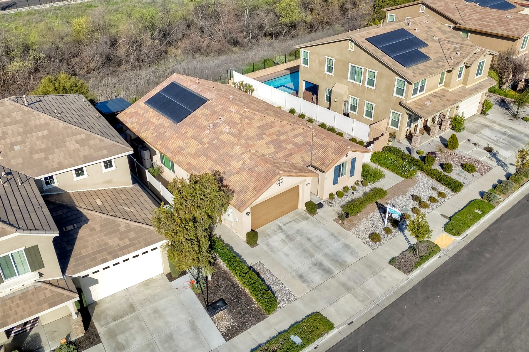 *Price Reduced, Sellers have found their replacement home and are motivated to sell!* Stunning Single-Story Heated POOL/SPA HOME Oasis Backing to a Serene Nature View with NO DIRECT NEIGHBORS behind**Don't miss this rare single-story gem perfectly positioned on a premium lot backing to a peaceful nature view, offering unmatched privacy.*The backyard is your private sanctuary with a sparkling SALTWATER POOL and SPA, which are complemented with a UV light purification system for the ultimate clean swim on app-controlled features. Enjoy evenings around your custom-built natural gas fire pit, relax under the pergola patio, or unwind beneath the canopy cover over the pool, which comes with a shade cover. The large yard offers real grass for your family/guests/pets to enjoy! There is also a convenient outdoor solar-powered rinse-off shower, and additional side gate entries in each side of the home. Located in the highly sought-after Rancho Bella Vista community—known for its ideal location in top-rated TEMECULA SCHOOLS, LOWER TAXES than many new builds, LOW HOA of only $45 a month, and just minutes to the popular Temecula Wine Country—this home delivers the blend of comfort, sophistication, and resort-style living. Step inside and experience exquisite entry to hardwood floors, an open, airy layout enhanced by thoughtful upgrades throughout. The heart of the home features a grand 11+ foot granite kitchen island, perfect for entertaining, along with hardwood flooring in the main walkway areas and open dining room area, porcelain wood-like plank tiles in the kitchen and bathrooms, a large walk-in pantry in the kitchen, and a second pantry area in the hallway, and elegant plantation shutters in the main area. This energy-efficient home comes equipped with OWNED solar panels, EV-ready 240V outlet, a Culligan water softener system, and reverse osmosis drinking water—all providing long-term savings and superior home comfort. This home is perfectly suited for modern living with touches like the front door custom glass insert, a powered blind in the primary bathroom, decorative exterior holiday accent lighting, a Ring camera perimeter system, a cozy gas fireplace, and newer carpet in the bedrooms. This home offers so much, the pictures don't do enough justice; this is a must see it to appreciate all that it offers.