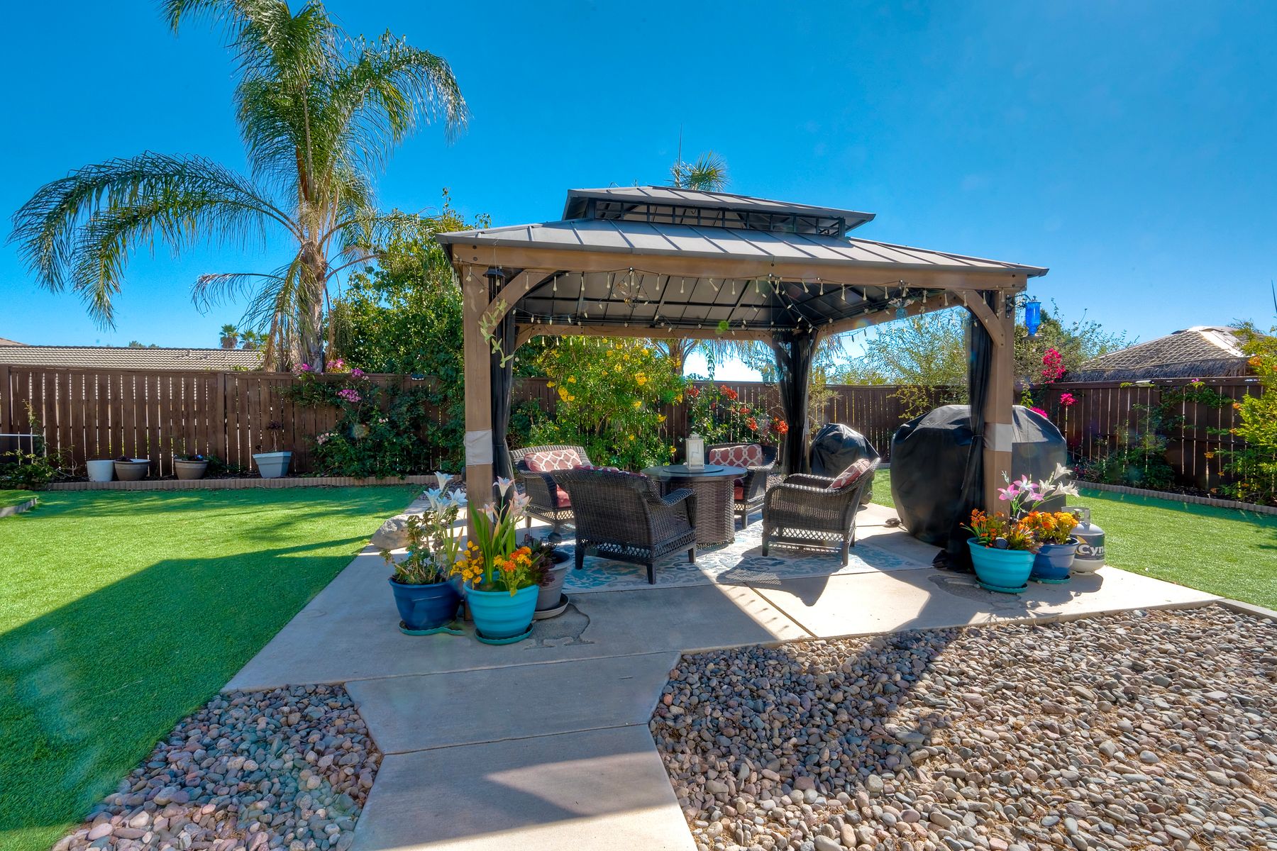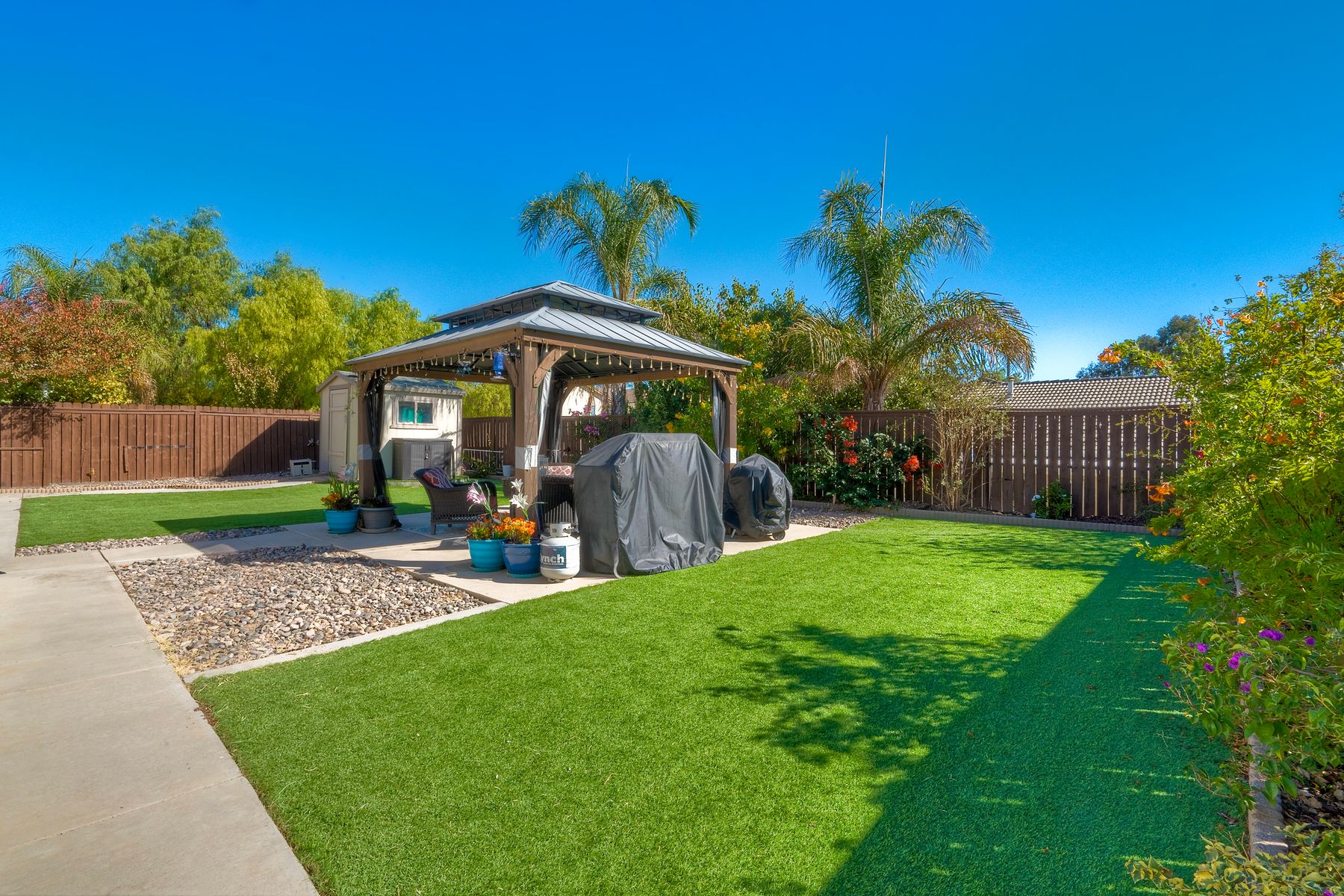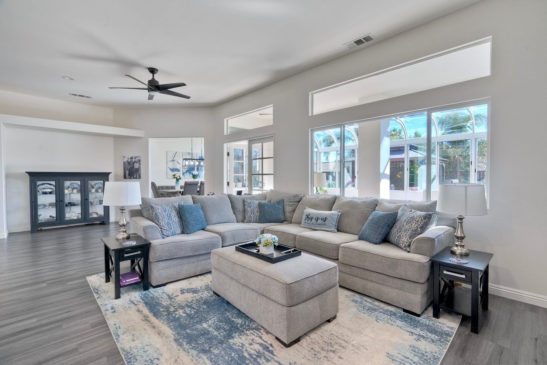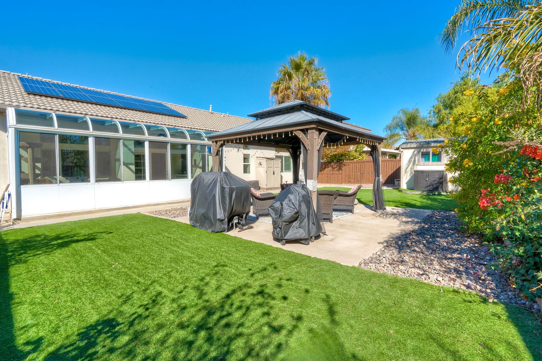 Absolutely Move-In Ready with Income Potential & Paid for Solar! This stunningly upgraded 3-bedroom, 3-bathroom single-story on a friendly cul-de-sac not only boasts luxury but also offers financial benefits. The open floor plan welcomes you the moment you step inside. The kitchen connects effortlessly to the living area and includes a handy pass-through and an island with bar seating, making it easy to stay connected with guests. The kitchen itself features new stainless-steel appliances, ample counter space, cabinet storage, and a pantry, delivering both style and convenience. The dining room could easily be converted to a 4th bedroom if needed. One of the most unique aspects of this home is the detached Casita, which can serve as a private guest suite, home office, or rental opportunity. With California's ADU-friendly policies, this Casita could easily become a money-making accessory dwelling unit (ADU). Perfect for short-term or long-term rentals, this space could provide significant income for savvy homeowners. The spacious master retreat includes an upgraded ensuite with dual closets, a double vanity, and a separate shower and tub for a spa-like experience. Each bedroom features generous closet space and ceiling fans for added comfort. Outside, the lush backyard provides plenty of space to unwind and includes a convenient storage shed. Located close to freeways, shopping, entertainment, and The Golf Club at Rancho California, this home blends luxury, comfort, and financial opportunity all under one roof.
