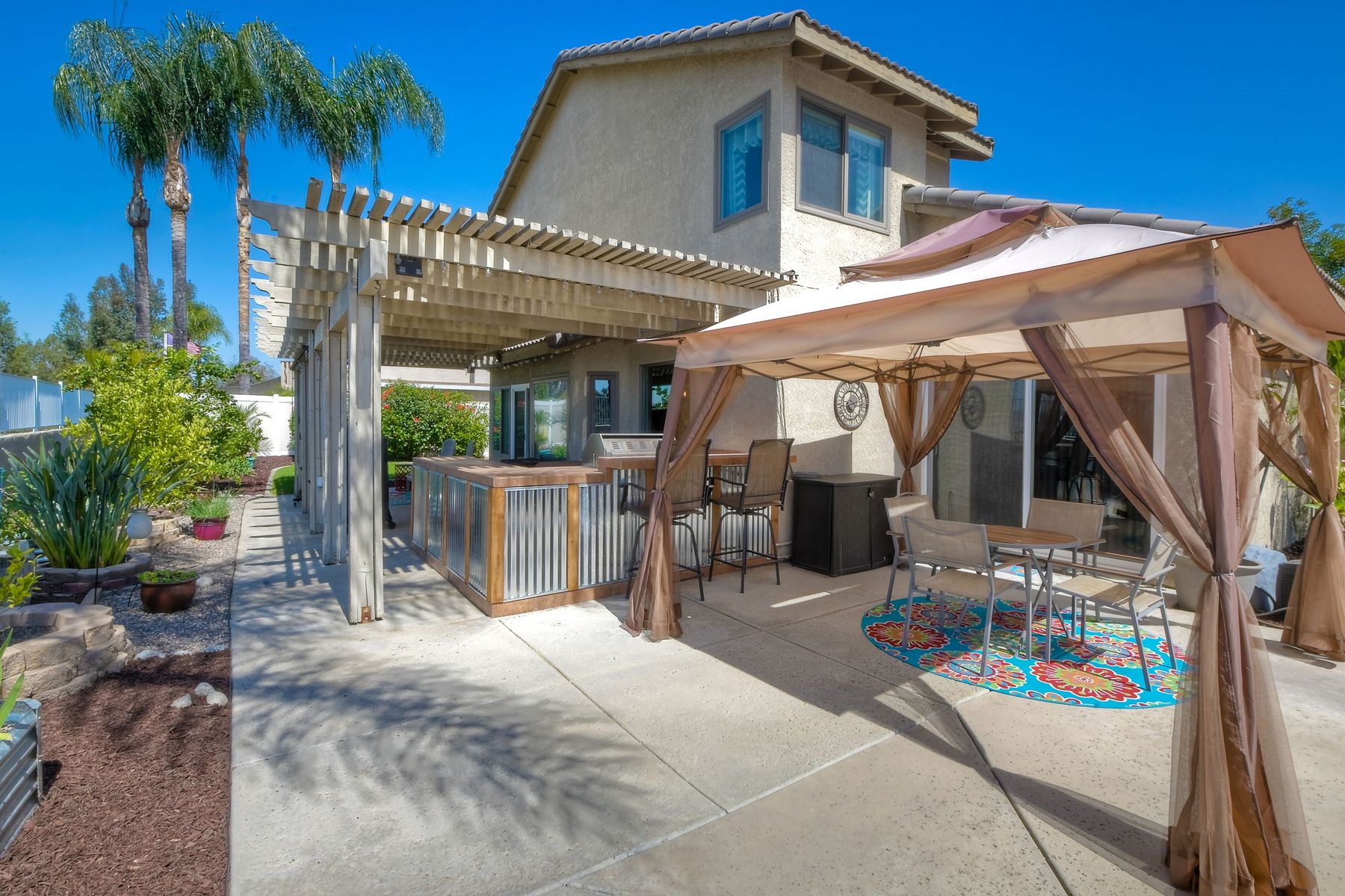 STOP THE CAR!!! You just found your Dream Pool Home! TURNKEY, ENERGY EFFICIENT, Summertime is here for your family! This delightful home boasts 2162 sq. ft, 4 bedrooms, 3 bathrooms with extensive upgrades throughout the home. This home is situated on over 16,000 sq. ft. lot. Entertain your family and friends in your own private oasis! The Pebble Tech Pool and Spa that offer a tanning ledge, pool slide and in pool umbrella insert. The yard is so spacious there is plenty of room around the pool for several chaise lounges to hang out and relax on the green grass area or under the covered patio area. The outdoor patio kitchen offers bar top seating, a family size BBQ, microwave, and mesmerizing mountain views with cool breezes and no neighbors behind the home for ultimate privacy. The interior of the home is equally impressive as you are greeted by the high ceilings, open area, lavish flooring, and natural sunlight provided by the dual pane skylight. Impressive laminate flooring with custom baseboards throughout the lower level. The kitchen has been remodeled with Whirlpool appliances, Shaker cabinets with stylish hardware, a quartz countertop with coordinating tile backsplash, and contemporary lighting. There is plenty of storage space in the large pantry. The kitchen opens into the family room with a stacking stone tile decor fireplace and sliding glass door leading out to the resort-style backyard. Upstairs you will find 4 bedrooms and a hallway bathroom with newer fixtures, mirrors, and vanity and a tub/shower combo. The stunning master bedroom opens up to a beautiful custom wood accent wall and breathtaking views of the hilltops and peaceful backyard. Master bathroom offers a deep soaking tub and a large tile walk-in shower. The remaining 3 secondary bedrooms are carpeted with ceiling fans and substantial closet space. Mature lawn and beautifully landscaped with palm trees and vegetable garden and tranquil water fountain. This home includes Solar Panels, upgraded Millgard windows and sliding doors, 22' Blown in attic insulation for superior insulation, dual A/C units, a whole house fan, and Energy Star Appliances, 3 car garage with plenty of storage cabinets and a garage door opener. Situated in the phenomenal location of Central Murrieta, it is conveniently between the 15 & 215 freeways and minutes to schools, restaurants, movie theaters, shopping centers & parks. WELCOME HOME and enjoy panoramic sunsets every day!