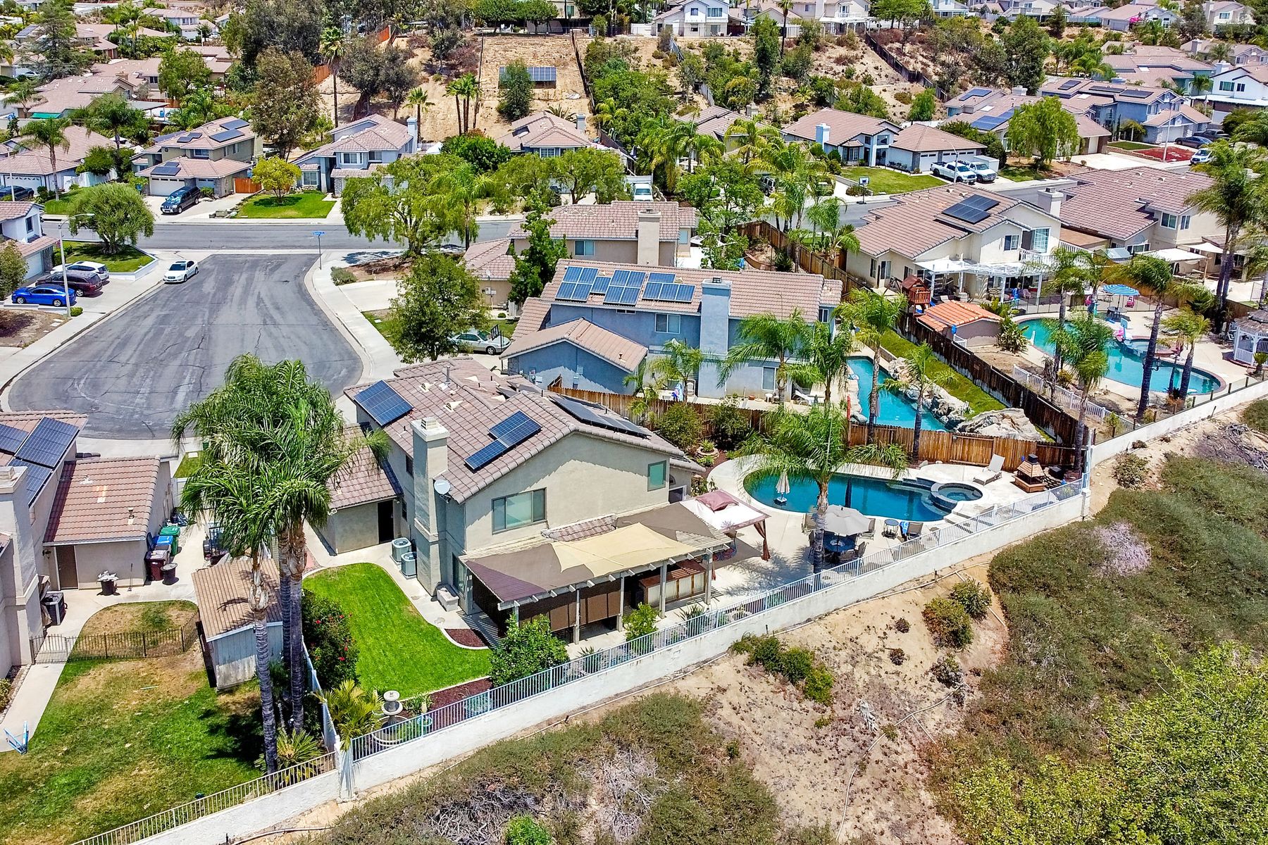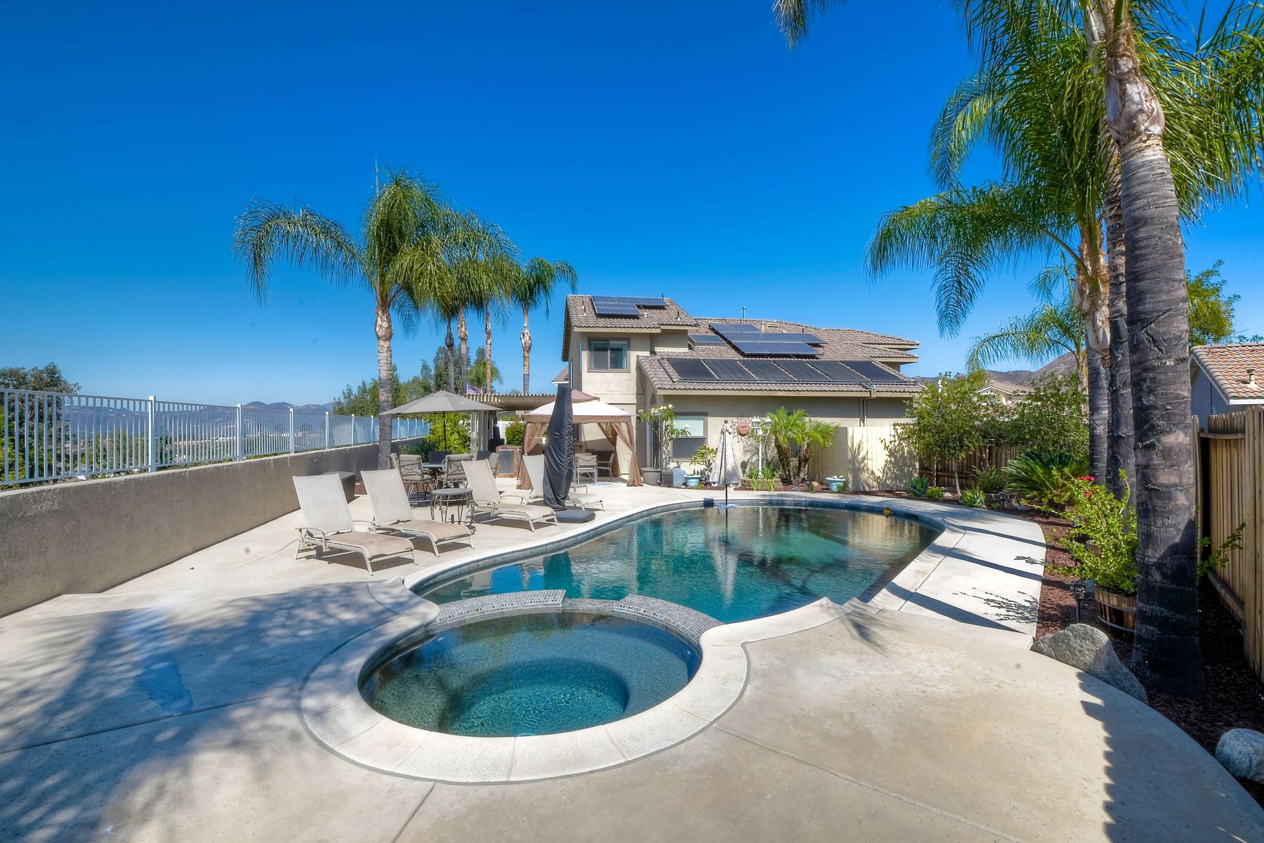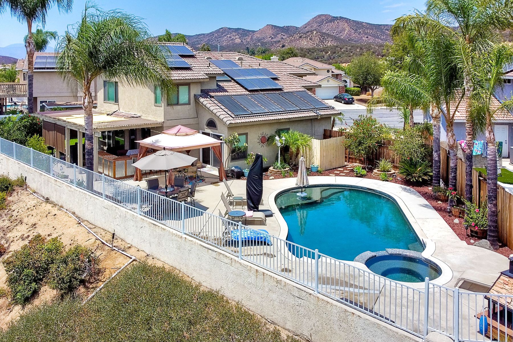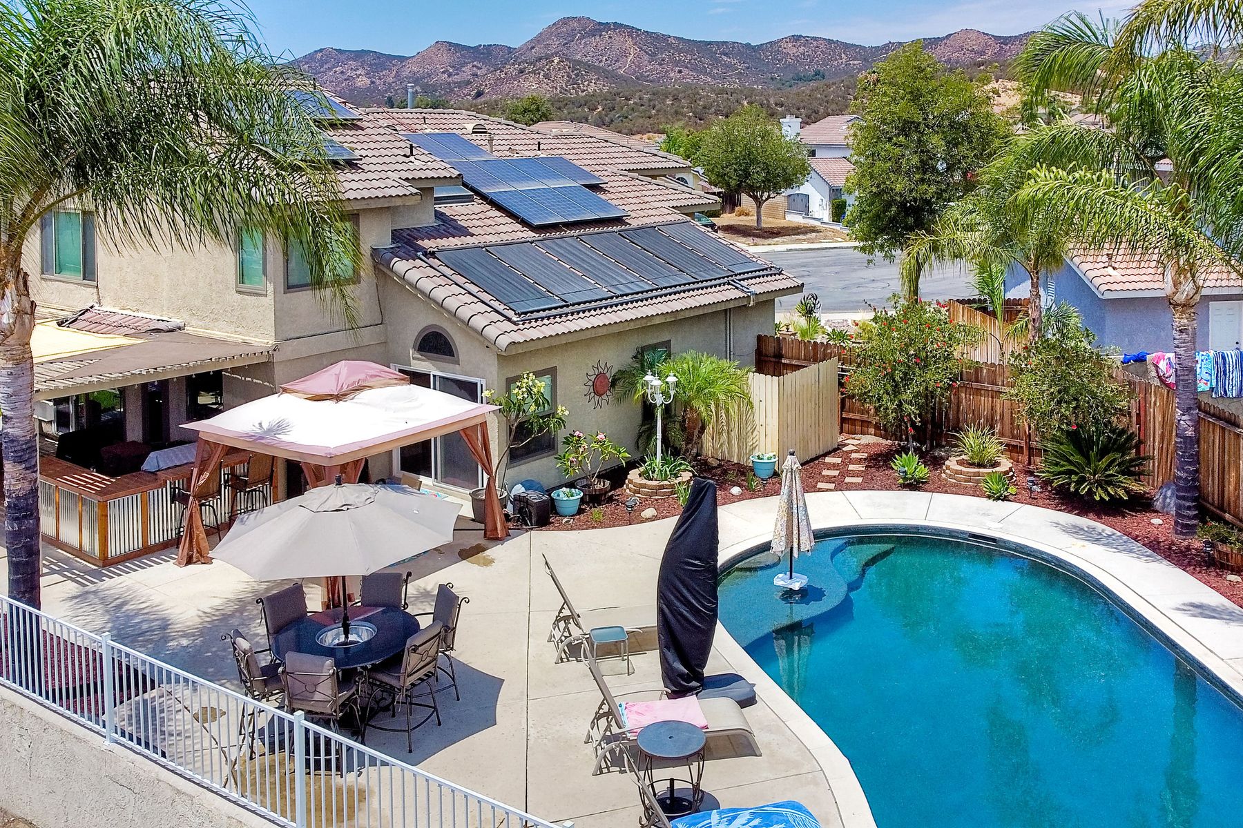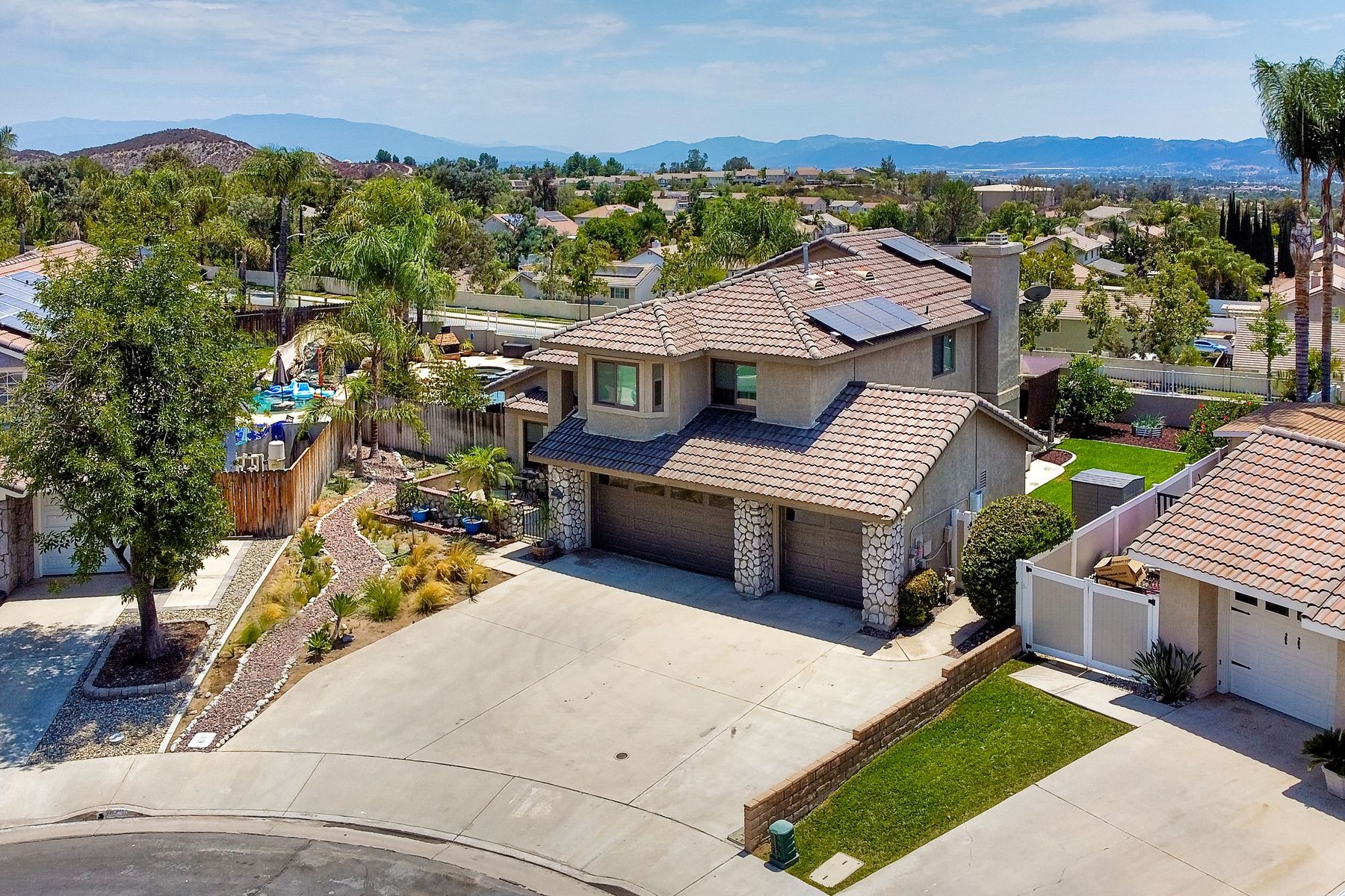 STOP THE CAR!!! You just found your Dream Pool Home! TURNKEY, ENERGY EFFICIENT, Summertime is here for your family! This delightful home boasts 2162 sq. ft, 4 bedrooms, 3 bathrooms with extensive upgrades throughout the home. This home is situated on over 16,000 sq. ft. lot. Entertain your family and friends in your own private oasis! The Pebble Tech Pool and Spa that offer a tanning ledge, pool slide and in pool umbrella insert. The yard is so spacious there is plenty of room around the pool for several chaise lounges to hang out and relax on the green grass area or under the covered patio area. The outdoor patio kitchen offers bar top seating, a family size BBQ, microwave, and mesmerizing mountain views with cool breezes and no neighbors behind the home for ultimate privacy. The interior of the home is equally impressive as you are greeted by the high ceilings, open area, lavish flooring, and natural sunlight provided by the dual pane skylight. Impressive laminate flooring with custom baseboards throughout the lower level. The kitchen has been remodeled with Whirlpool appliances, Shaker cabinets with stylish hardware, a quartz countertop with coordinating tile backsplash, and contemporary lighting. There is plenty of storage space in the large pantry. The kitchen opens into the family room with a stacking stone tile decor fireplace and sliding glass door leading out to the resort-style backyard. Upstairs you will find 4 bedrooms and a hallway bathroom with newer fixtures, mirrors, and vanity and a tub/shower combo. The stunning master bedroom opens up to a beautiful custom wood accent wall and breathtaking views of the hilltops and peaceful backyard. Master bathroom offers a deep soaking tub and a large tile walk-in shower. The remaining 3 secondary bedrooms are carpeted with ceiling fans and substantial closet space. Mature lawn and beautifully landscaped with palm trees and vegetable garden and tranquil water fountain. This home includes Solar Panels, upgraded Millgard windows and sliding doors, 22' Blown in attic insulation for superior insulation, dual A/C units, a whole house fan, and Energy Star Appliances, 3 car garage with plenty of storage cabinets and a garage door opener. Situated in the phenomenal location of Central Murrieta, it is conveniently between the 15 & 215 freeways and minutes to schools, restaurants, movie theaters, shopping centers & parks. WELCOME HOME and enjoy panoramic sunsets every day!