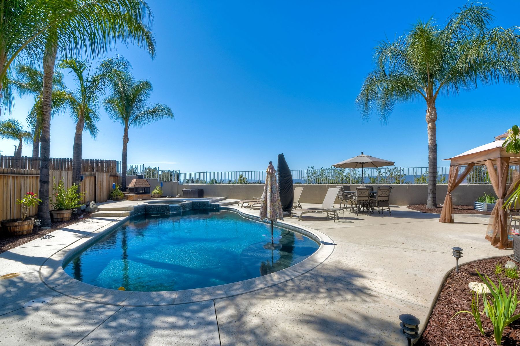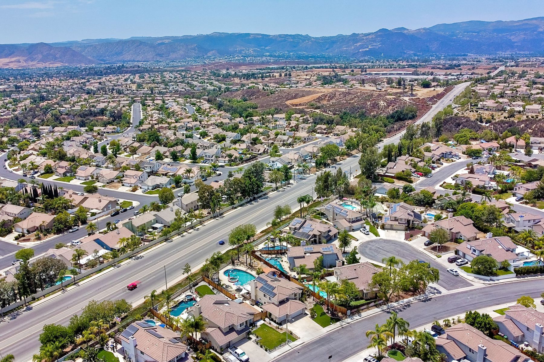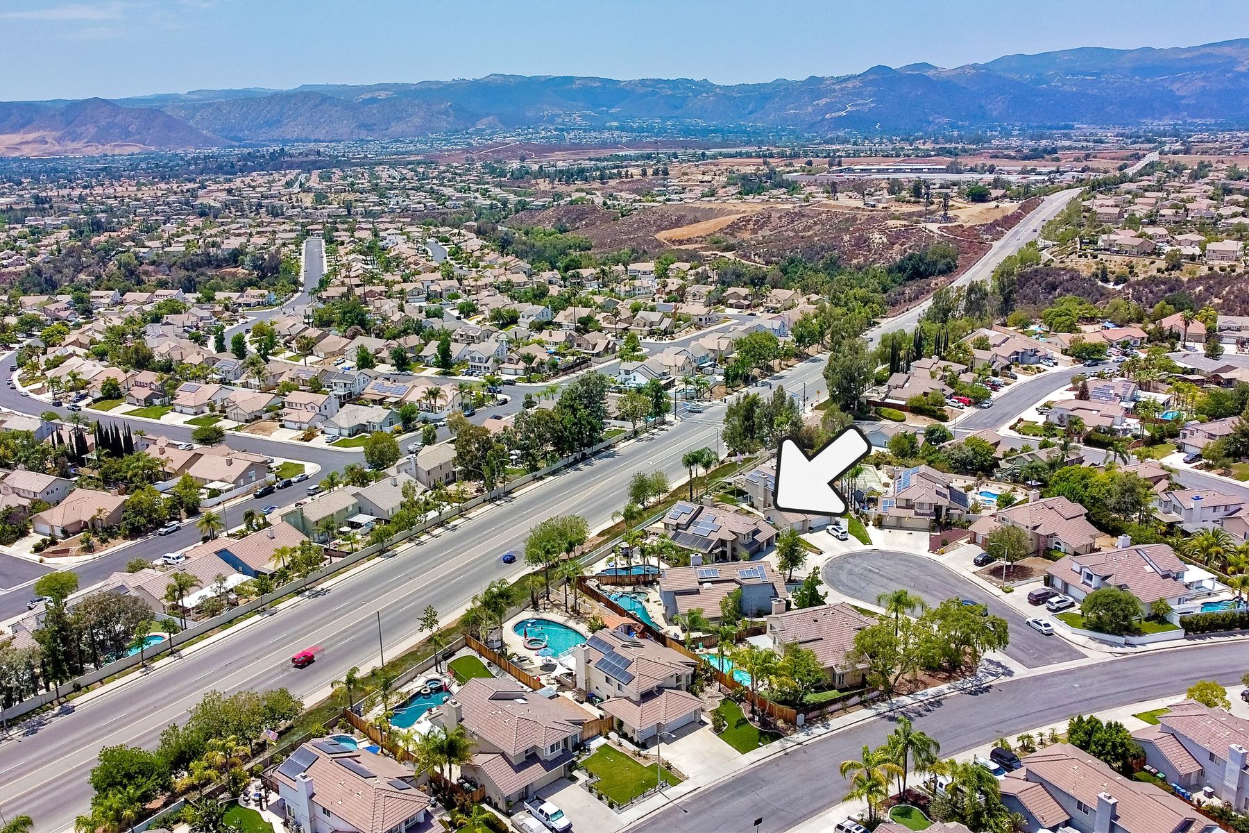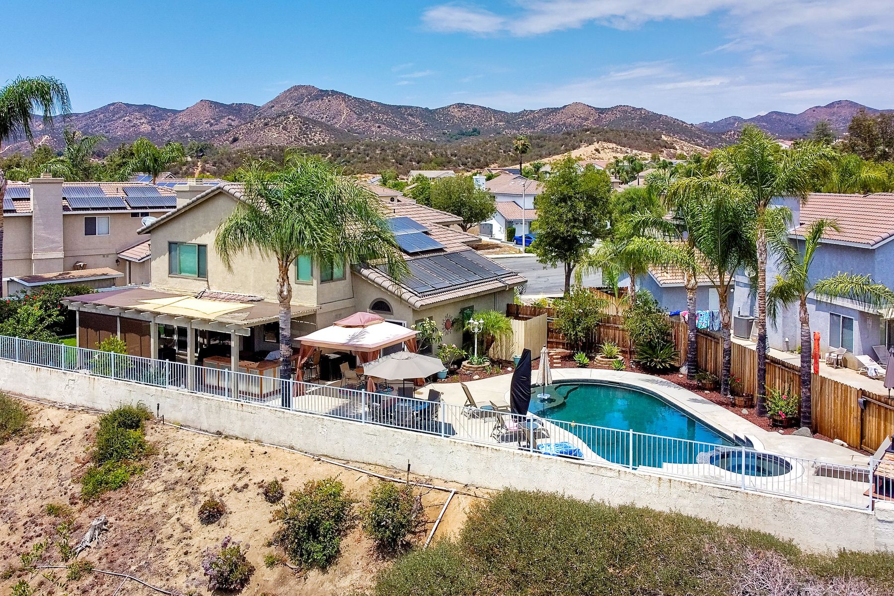 STOP THE CAR!!! You just found your Dream Pool Home! TURNKEY, ENERGY EFFICIENT, Summertime is here for your family! This delightful home boasts 2162 sq. ft, 4 bedrooms, 3 bathrooms with extensive upgrades throughout the home. This home is situated on over 16,000 sq. ft. lot. Entertain your family and friends in your own private oasis! The Pebble Tech Pool and Spa that offer a tanning ledge, pool slide and in pool umbrella insert. The yard is so spacious there is plenty of room around the pool for several chaise lounges to hang out and relax on the green grass area or under the covered patio area. The outdoor patio kitchen offers bar top seating, a family size BBQ, microwave, and mesmerizing mountain views with cool breezes and no neighbors behind the home for ultimate privacy. The interior of the home is equally impressive as you are greeted by the high ceilings, open area, lavish flooring, and natural sunlight provided by the dual pane skylight. Impressive laminate flooring with custom baseboards throughout the lower level. The kitchen has been remodeled with Whirlpool appliances, Shaker cabinets with stylish hardware, a quartz countertop with coordinating tile backsplash, and contemporary lighting. There is plenty of storage space in the large pantry. The kitchen opens into the family room with a stacking stone tile decor fireplace and sliding glass door leading out to the resort-style backyard. Upstairs you will find 4 bedrooms and a hallway bathroom with newer fixtures, mirrors, and vanity and a tub/shower combo. The stunning master bedroom opens up to a beautiful custom wood accent wall and breathtaking views of the hilltops and peaceful backyard. Master bathroom offers a deep soaking tub and a large tile walk-in shower. The remaining 3 secondary bedrooms are carpeted with ceiling fans and substantial closet space. Mature lawn and beautifully landscaped with palm trees and vegetable garden and tranquil water fountain. This home includes Solar Panels, upgraded Millgard windows and sliding doors, 22' Blown in attic insulation for superior insulation, dual A/C units, a whole house fan, and Energy Star Appliances, 3 car garage with plenty of storage cabinets and a garage door opener. Situated in the phenomenal location of Central Murrieta, it is conveniently between the 15 & 215 freeways and minutes to schools, restaurants, movie theaters, shopping centers & parks. WELCOME HOME and enjoy panoramic sunsets every day!