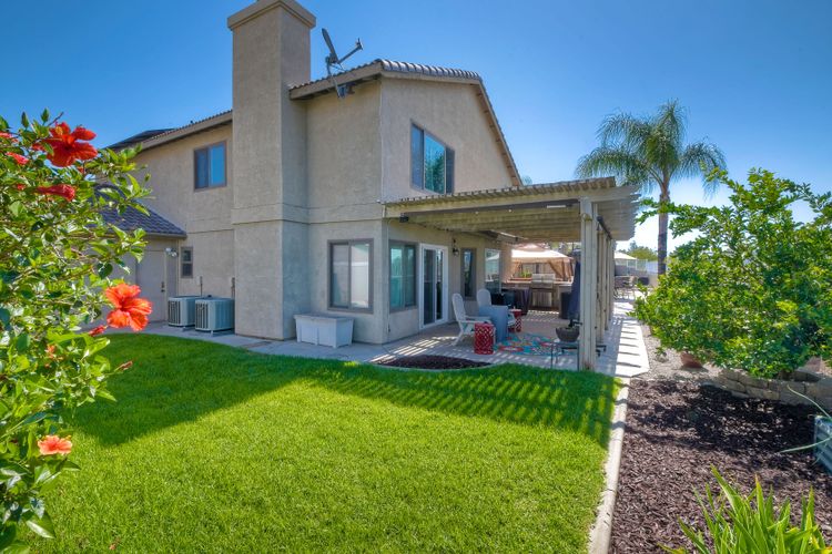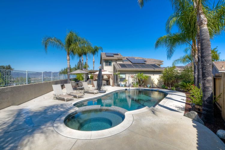 STOP THE CAR!!!  You just found your Dream Pool Home! TURNKEY, ENERGY EFFICIENT, Summertime is here for your family!  This delightful home boasts 2162 sq. ft, 4 bedrooms, 3 bathrooms with extensive  upgrades throughout the home. This home is situated on over 16,000 sq. ft. lot. Entertain your family and friends in your own private oasis! The  Pebble Tech Pool and Spa that offer a  tanning ledge, pool slide and in pool umbrella insert. The yard is so  spacious there is plenty of room around the pool for several chaise lounges to hang out and relax on the green grass area or under the covered patio area. The outdoor patio kitchen offers bar top seating,  a family size BBQ, microwave, and mesmerizing mountain views with cool breezes and no neighbors  behind the home for ultimate privacy.  The interior of the home is equally impressive  as you are greeted by the high ceilings, open  area, lavish flooring, and natural sunlight provided by the dual pane skylight.  Impressive laminate flooring with custom baseboards throughout the lower level. The kitchen has been remodeled with Whirlpool appliances, Shaker cabinets with stylish hardware, a quartz countertop with coordinating tile backsplash, and contemporary lighting. There is plenty of storage space in the large pantry. The kitchen opens into the family room with a stacking stone tile decor fireplace and sliding glass door leading out to the resort-style backyard. Upstairs you will find 4 bedrooms and a hallway bathroom with newer fixtures, mirrors, and vanity and a tub/shower combo. The stunning master bedroom opens up to a beautiful custom wood accent wall and breathtaking views of the hilltops and peaceful backyard. Master bathroom offers a deep soaking tub and a large tile walk-in shower.  The remaining 3 secondary bedrooms are carpeted with ceiling fans and substantial closet space. Mature lawn and beautifully landscaped with palm trees and vegetable garden and tranquil water fountain. This home includes Solar Panels, upgraded Millgard windows and sliding doors, 22' Blown in attic insulation for superior insulation, dual A/C units, a whole house fan, and Energy Star Appliances, 3 car garage with plenty of storage cabinets and a garage door opener. Situated in the phenomenal location of Central Murrieta, it is conveniently between the 15 & 215 freeways and minutes to schools, restaurants, movie theaters, shopping centers & parks.  WELCOME HOME and enjoy panoramic sunsets every day!