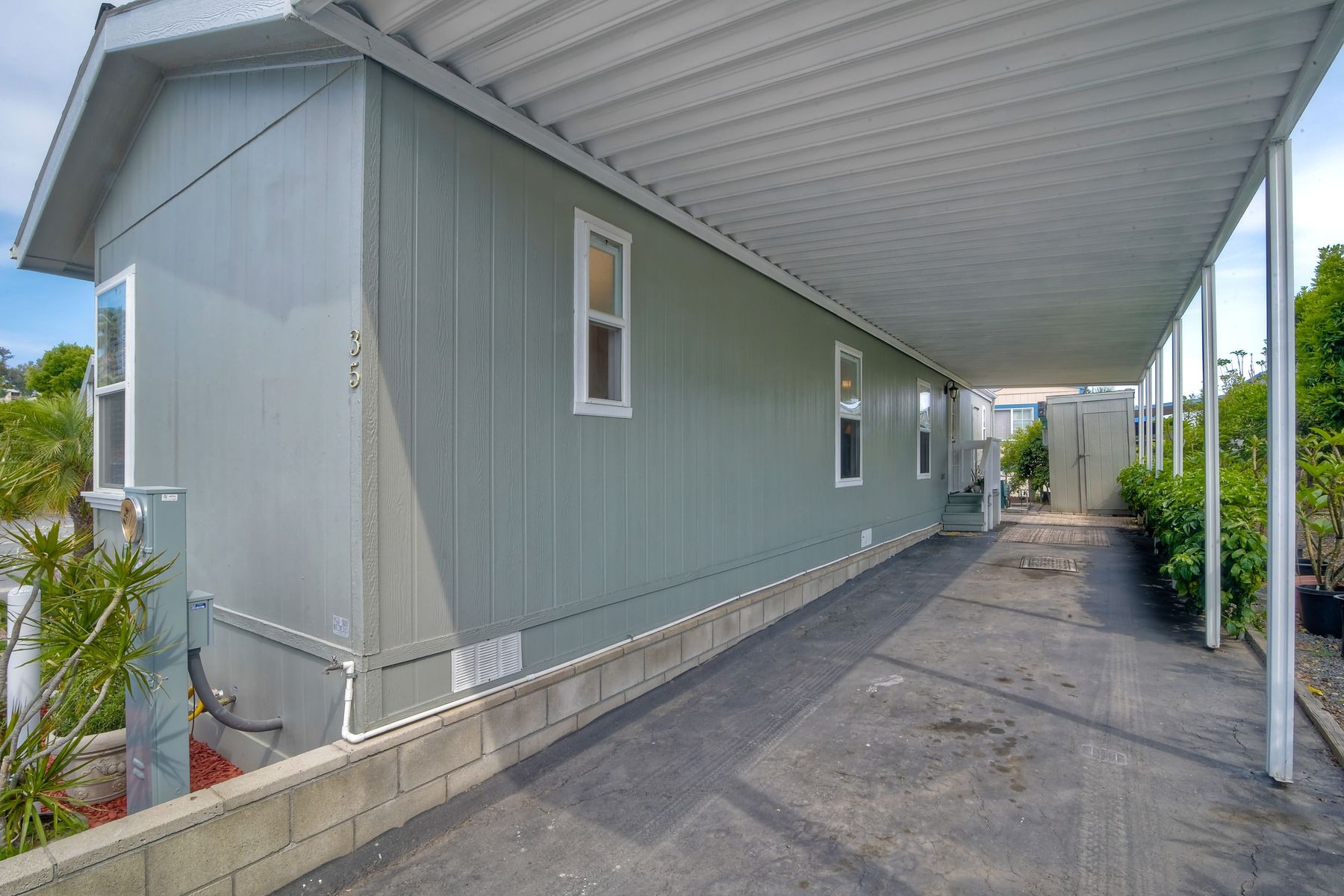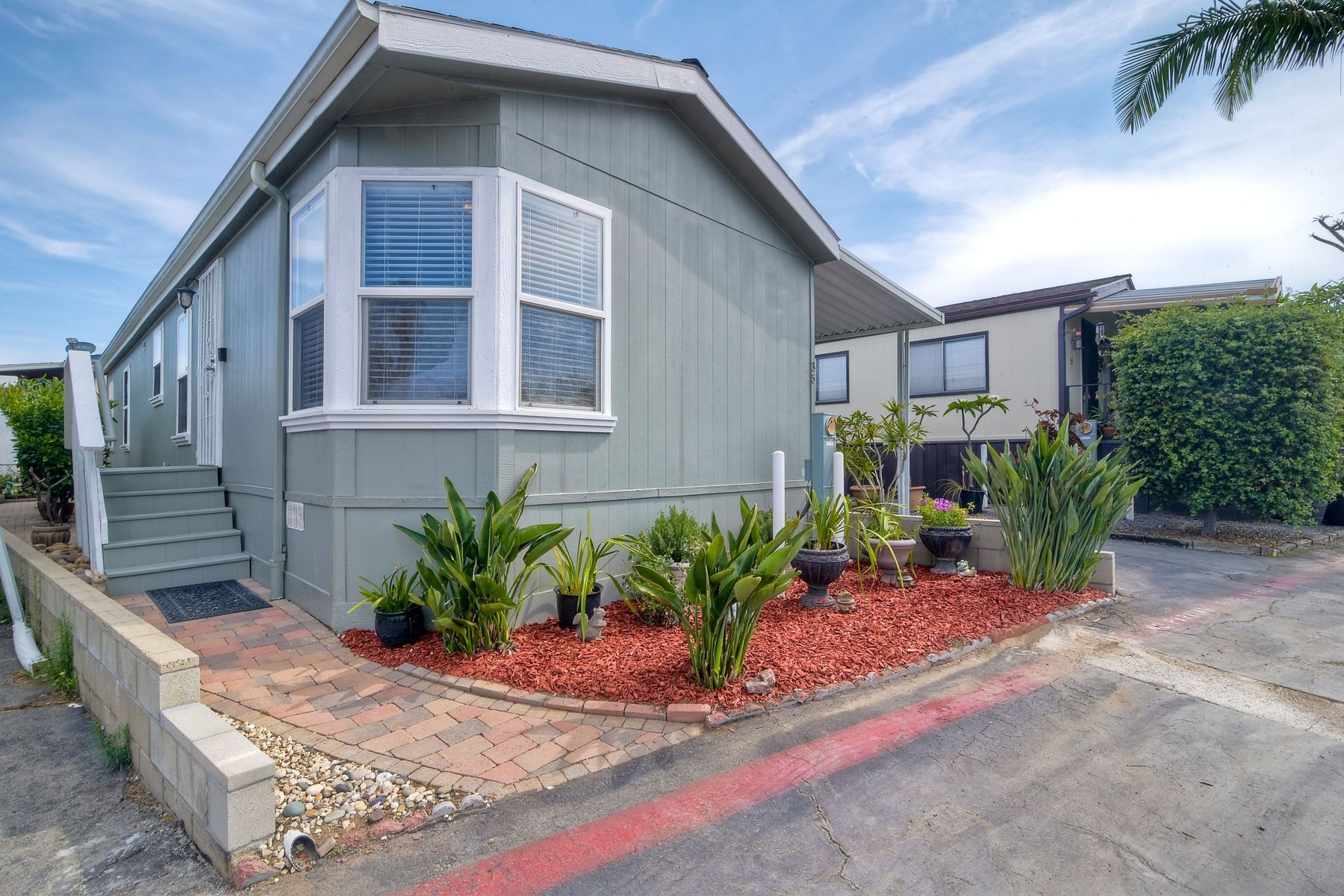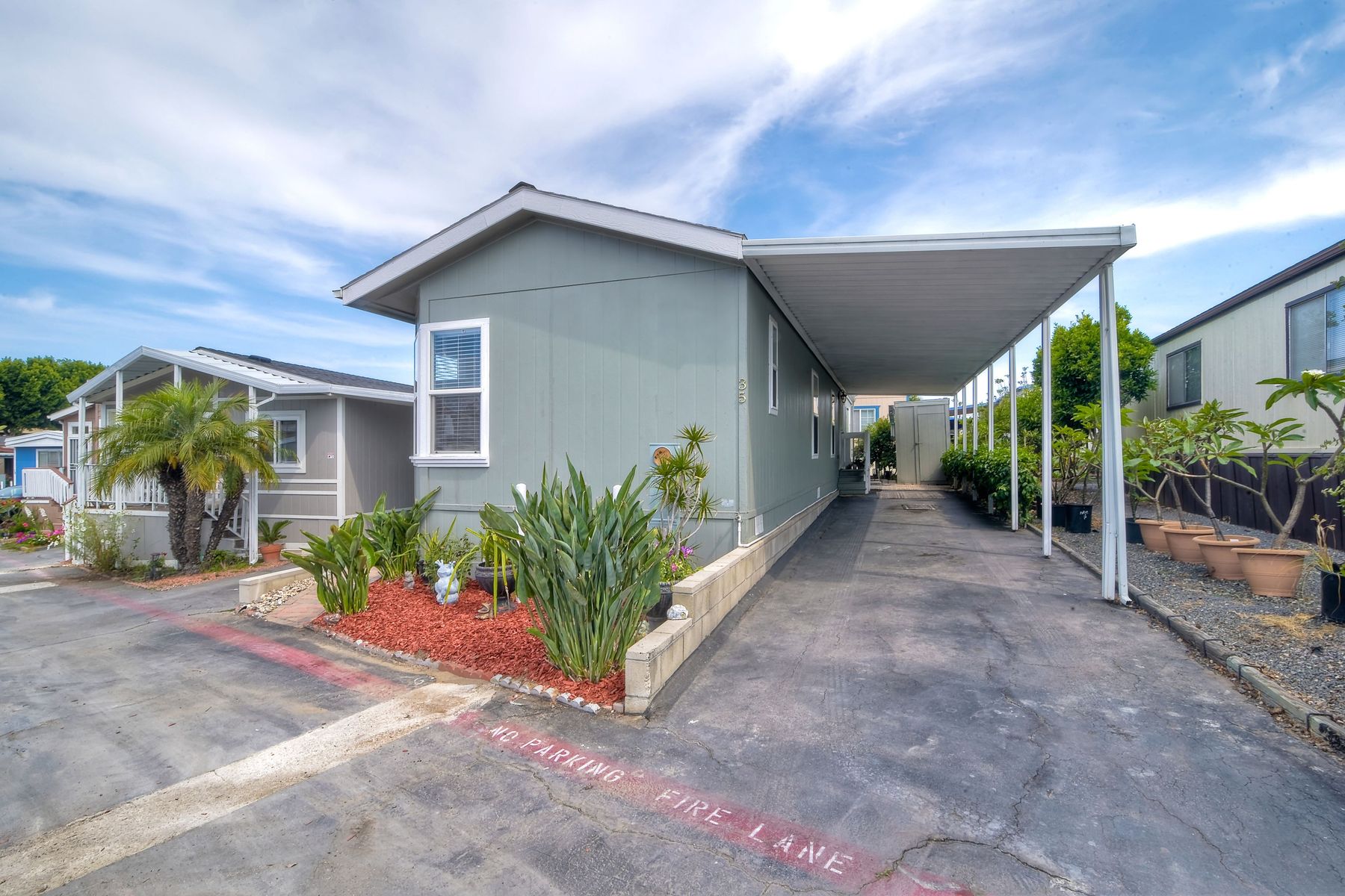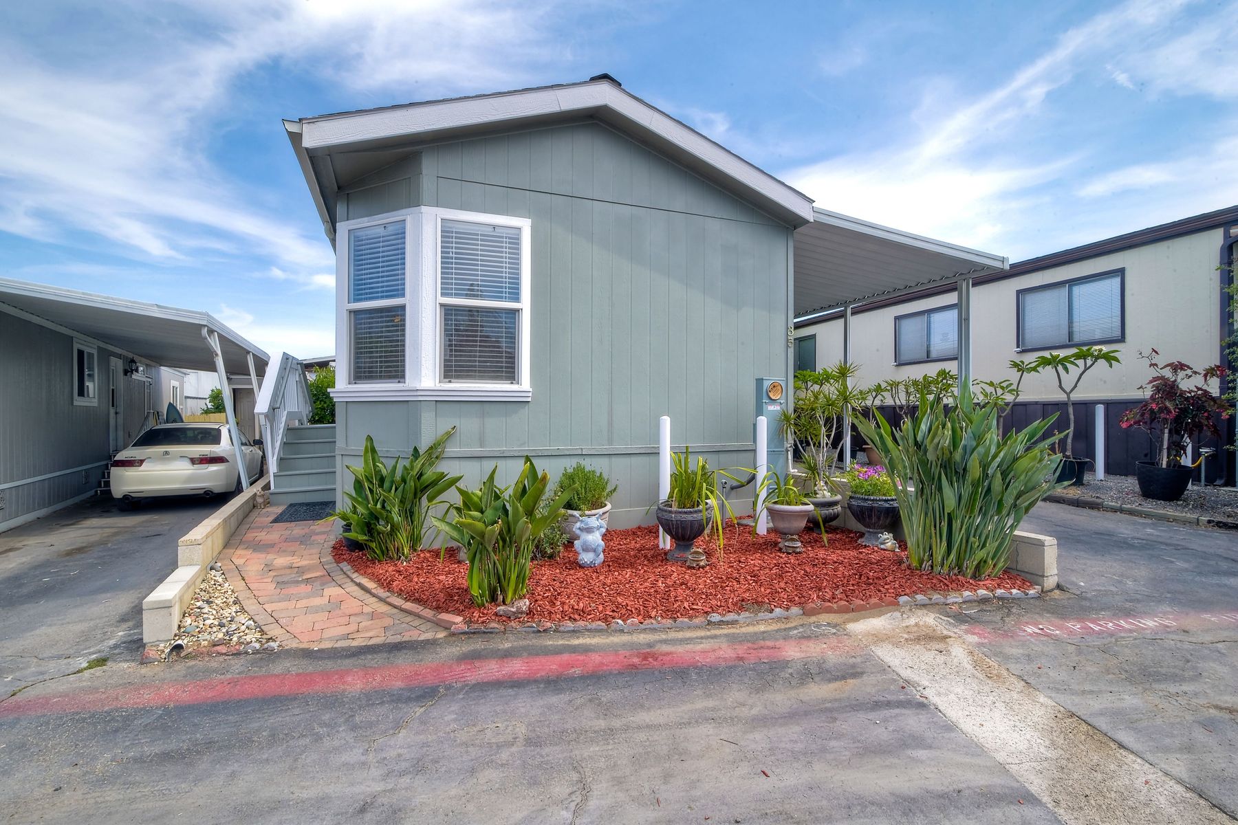 This home is located in an all age community Park that allows pets. This lovely well-maintained home has 2 bedrooms, 2 full baths with a beautifully remodeled kitchen with new cabinetry and quartz countertops and stainless steel appliances. The flooring throughout the house is wood-grained laminate flooring. This home offers the open floor concept with high ceiling and is well-lite with many windows. The carport fits 2 cars and there is a shed for storage. There are fruit trees in the yard. There is a laundry space in the hallway closet. The space rent is around $800. includes trash sewer water, etc. The Park offers swimming pool and recreational facilities.
