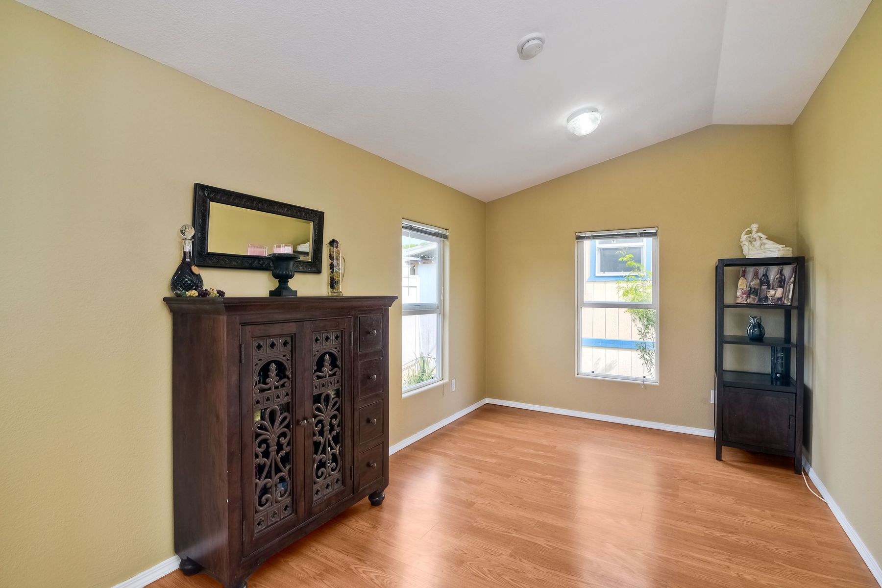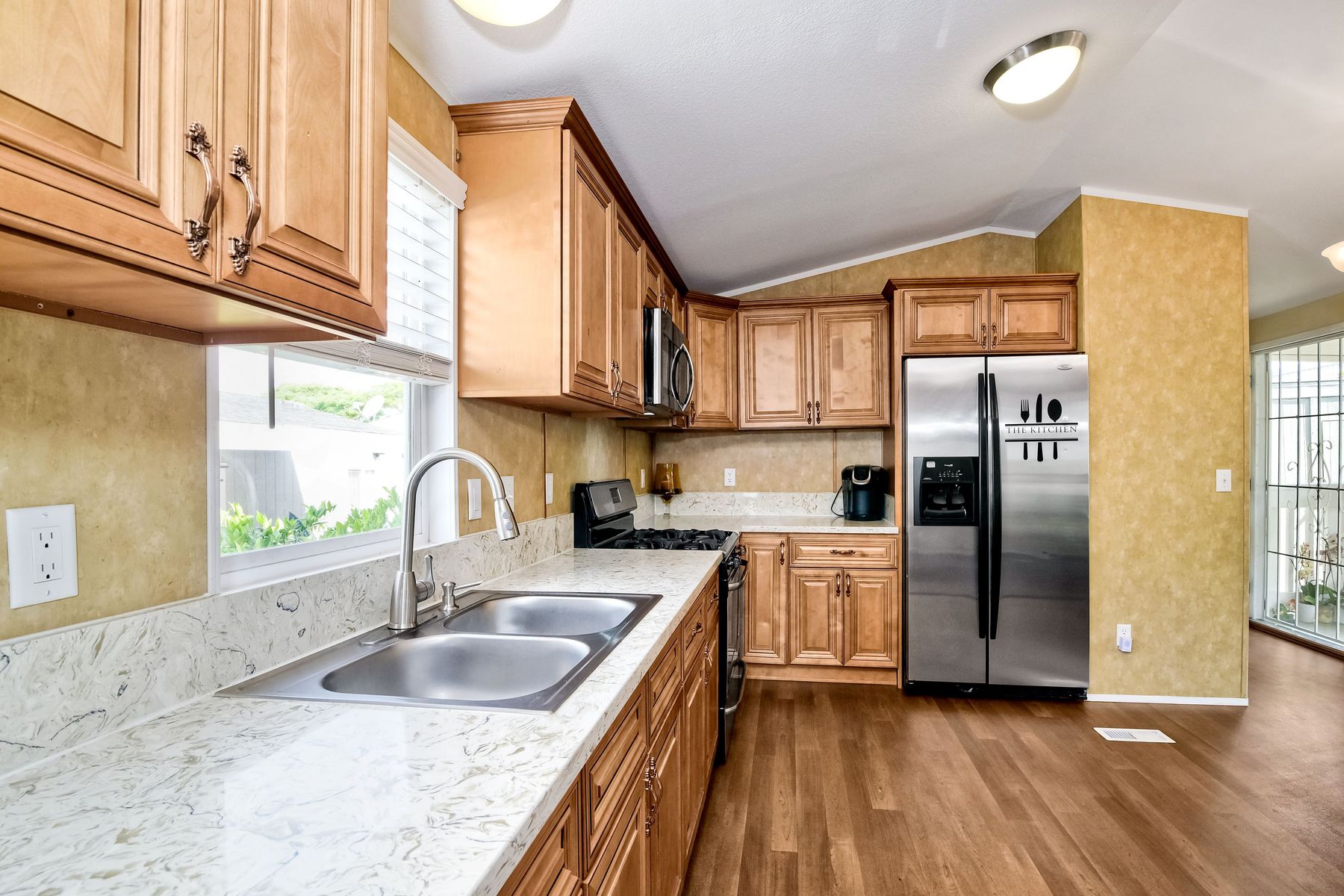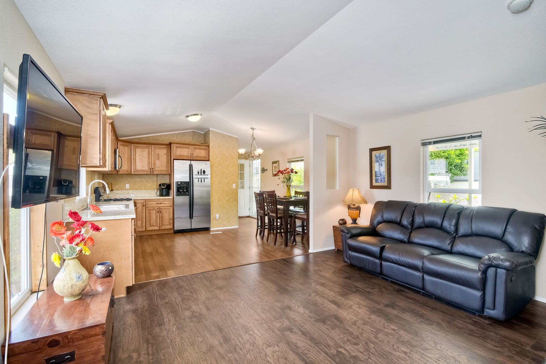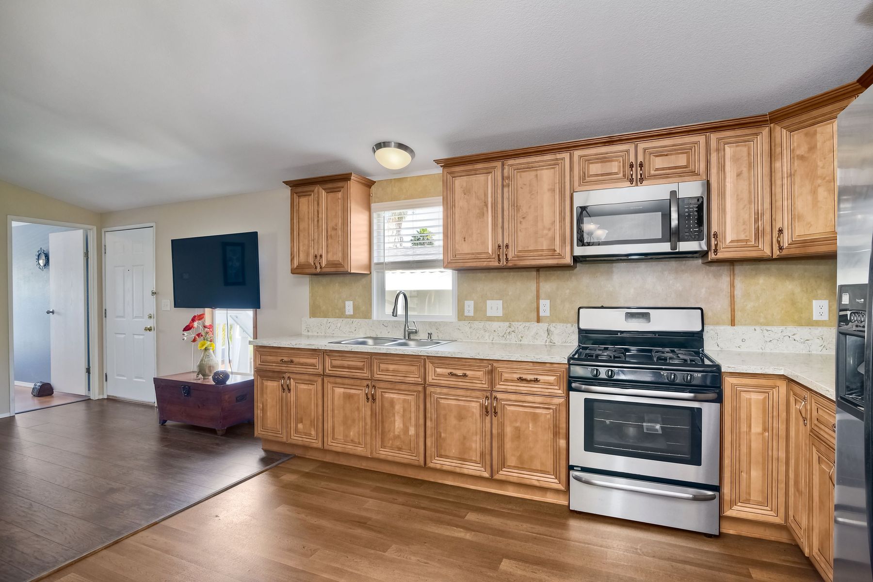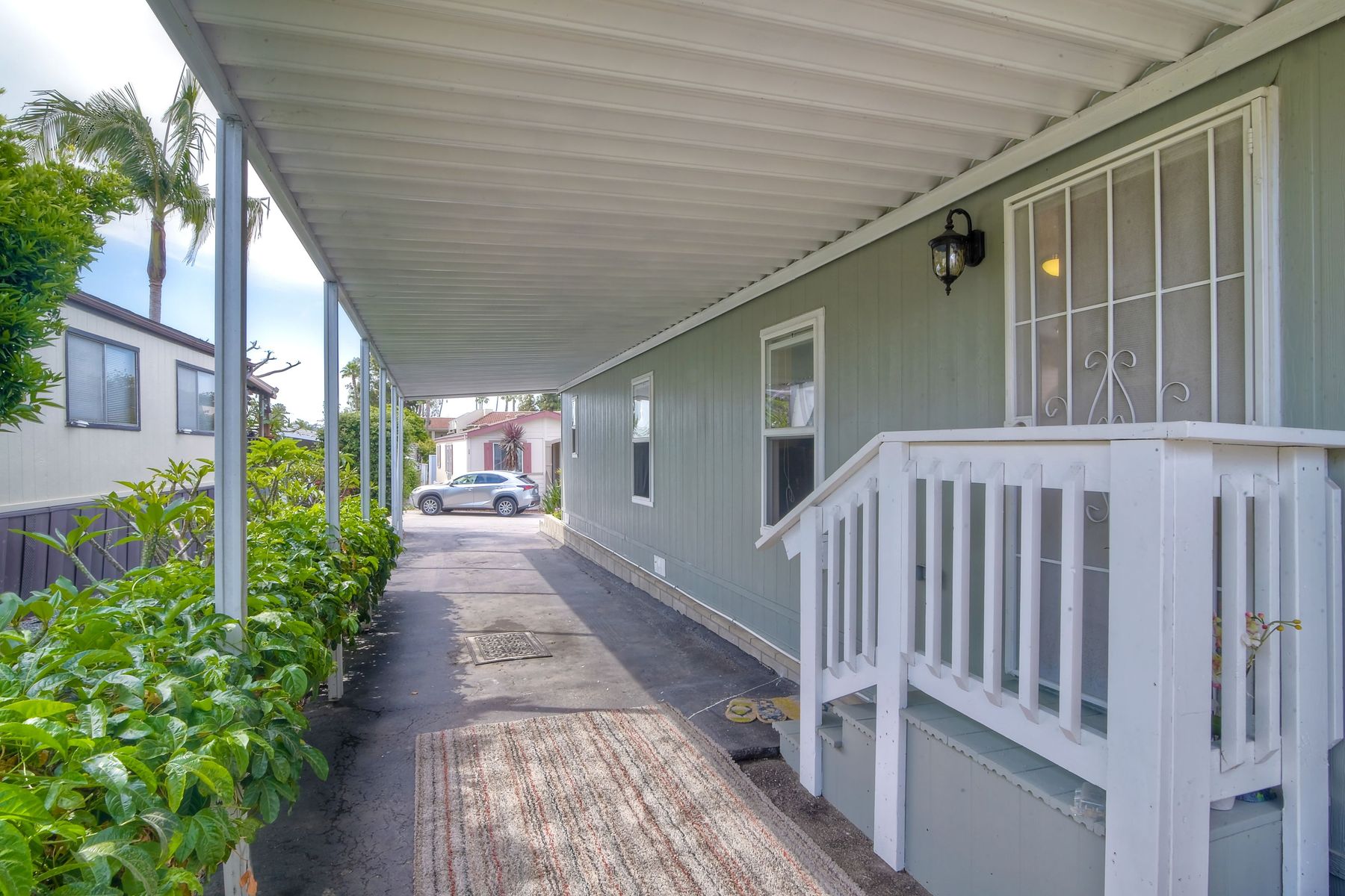 This home is located in an all age community Park that allows pets. This lovely well-maintained home has 2 bedrooms, 2 full baths with a beautifully remodeled kitchen with new cabinetry and quartz countertops and stainless steel appliances. The flooring throughout the house is wood-grained laminate flooring. This home offers the open floor concept with high ceiling and is well-lite with many windows. The carport fits 2 cars and there is a shed for storage. There are fruit trees in the yard. There is a laundry space in the hallway closet. The space rent is around $800. includes trash sewer water, etc. The Park offers swimming pool and recreational facilities.