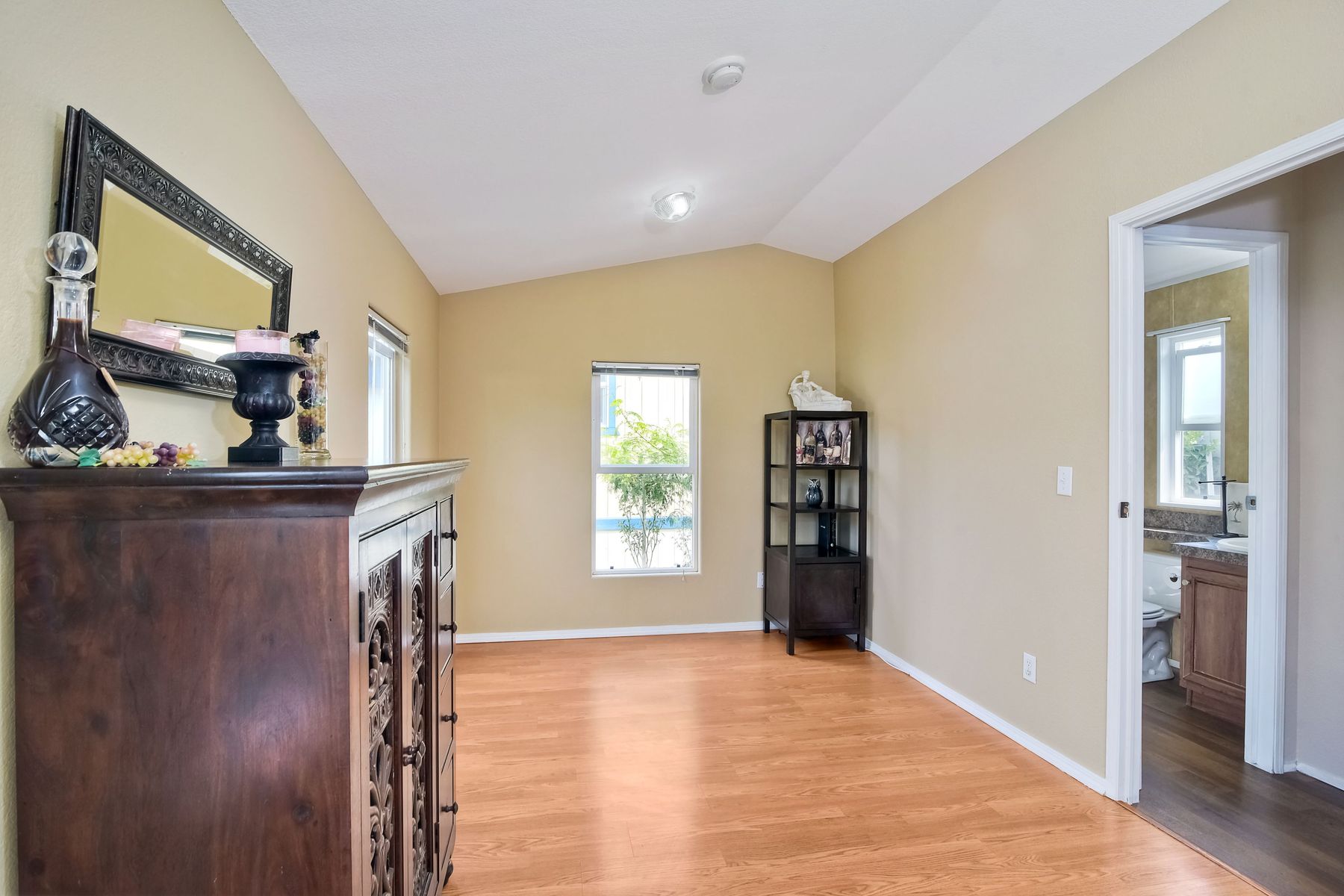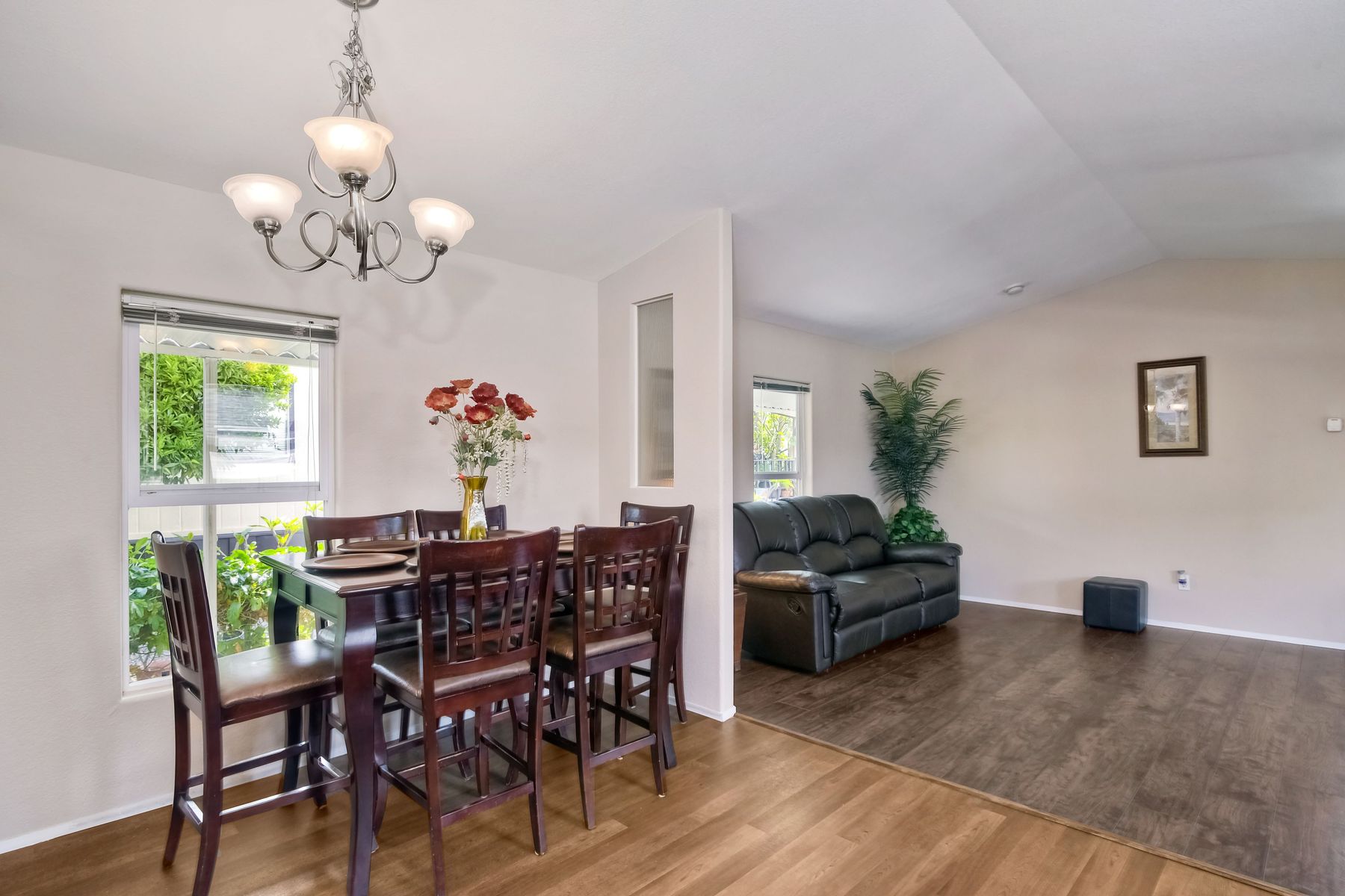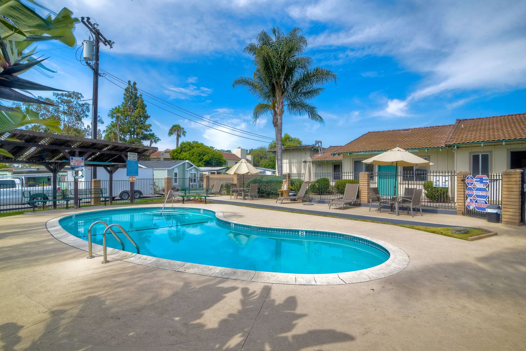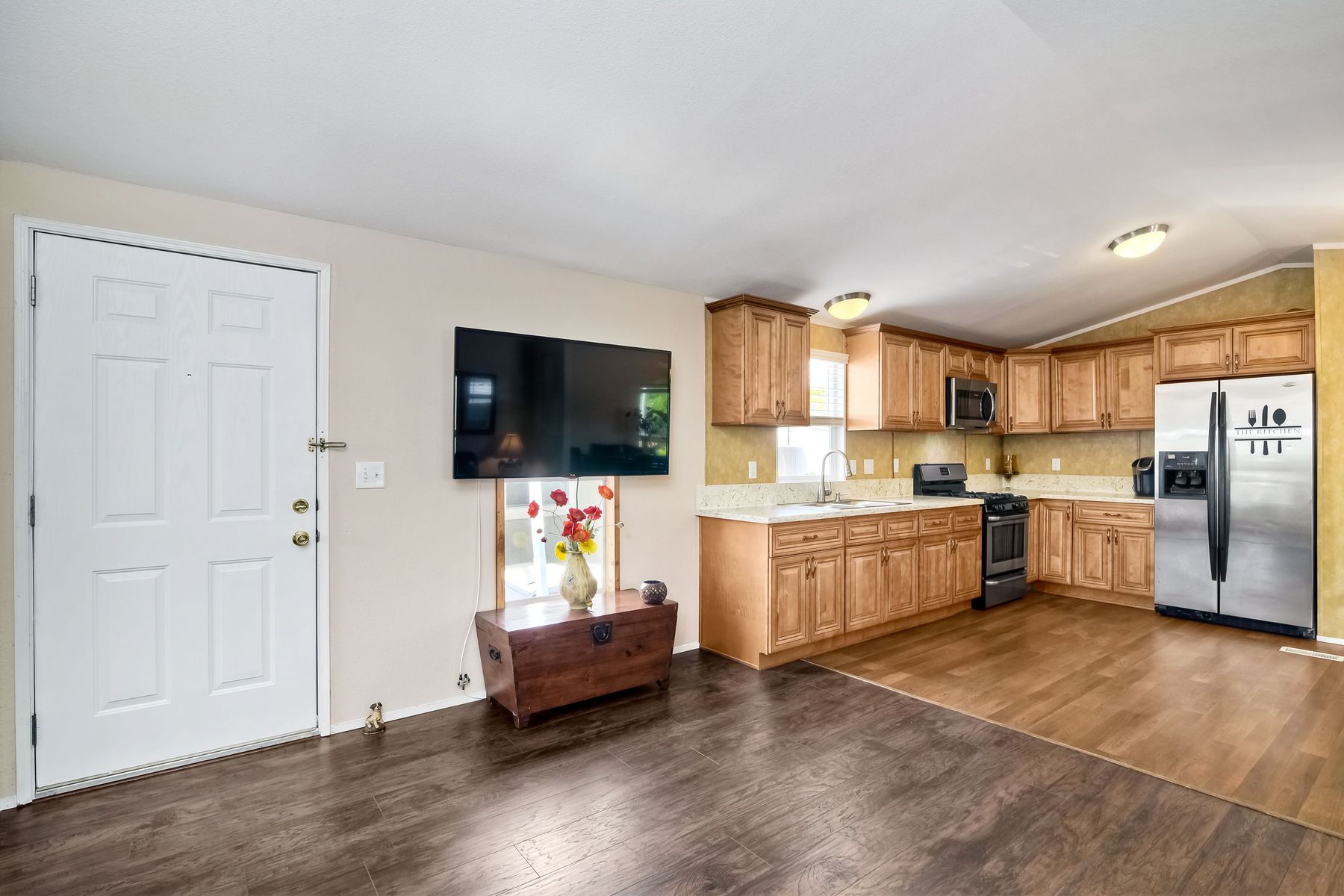 This home is located in an all age community Park that allows pets. This lovely well-maintained home has 2 bedrooms, 2 full baths with a beautifully remodeled kitchen with new cabinetry and quartz countertops and stainless steel appliances. The flooring throughout the house is wood-grained laminate flooring. This home offers the open floor concept with high ceiling and is well-lite with many windows. The carport fits 2 cars and there is a shed for storage. There are fruit trees in the yard. There is a laundry space in the hallway closet. The space rent is around $800. includes trash sewer water, etc. The Park offers swimming pool and recreational facilities.