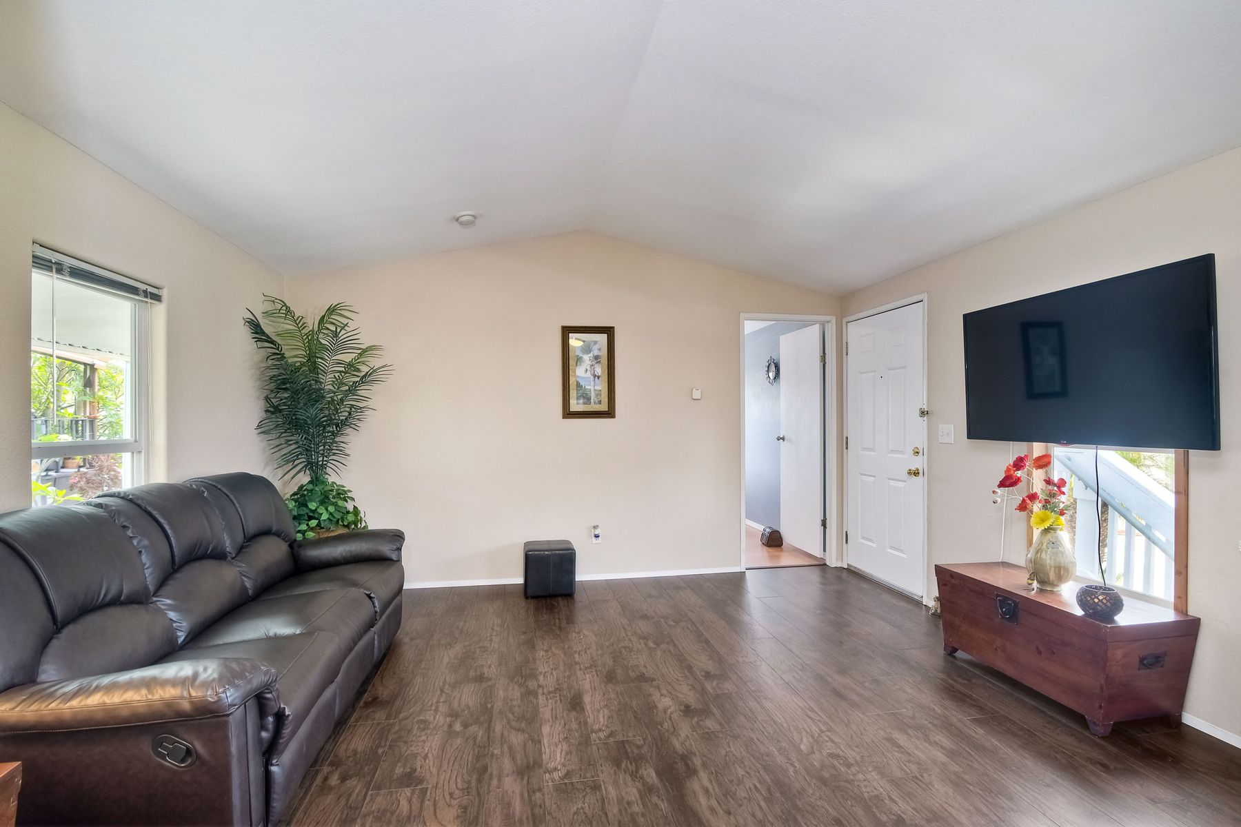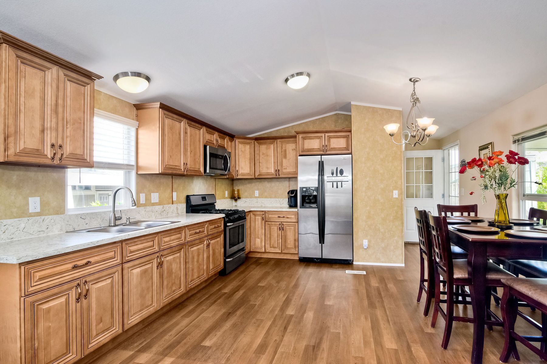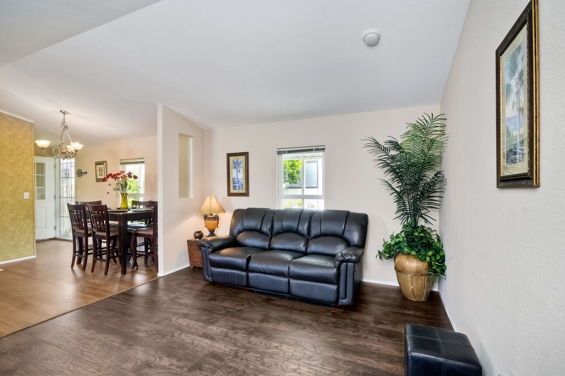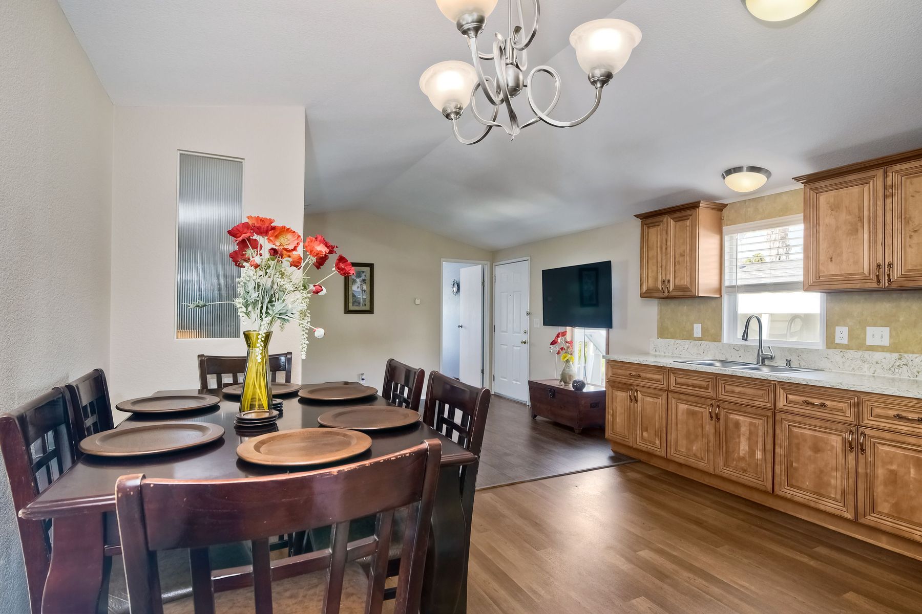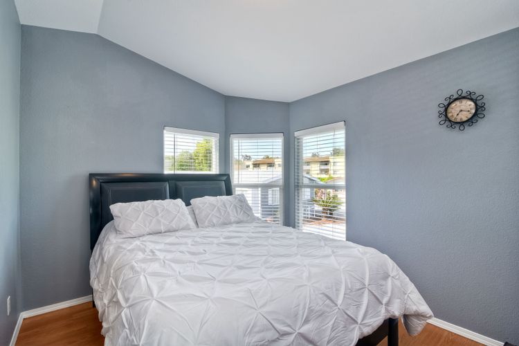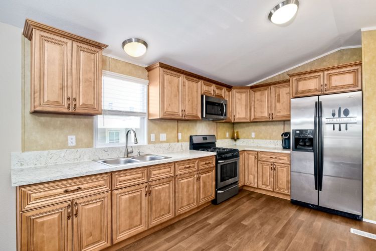 This home is located in an all age community Park that allows pets. This lovely well-maintained home has 2 bedrooms, 2 full baths with a beautifully remodeled kitchen with new cabinetry and quartz countertops and stainless steel appliances. The flooring throughout the house is wood-grained laminate flooring. This home offers the open floor concept with high ceiling and is well-lite with many windows. The carport fits 2 cars and there is a shed for storage. There are fruit trees in the yard. There is a laundry space in the hallway closet. The space rent is around $800. includes trash sewer water, etc. The Park offers swimming pool and recreational facilities.