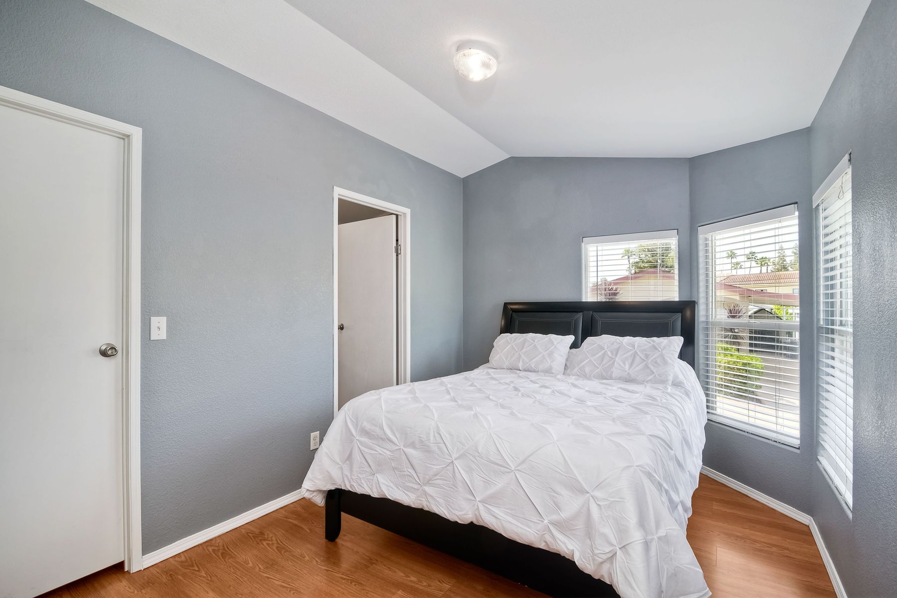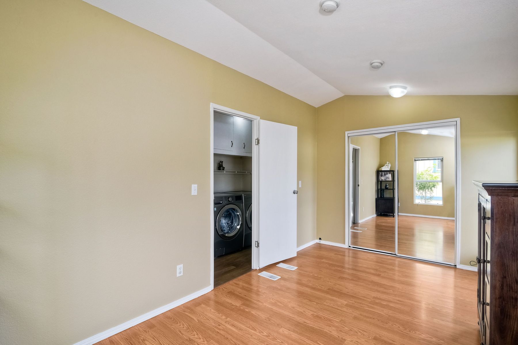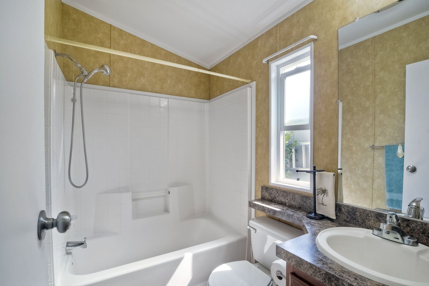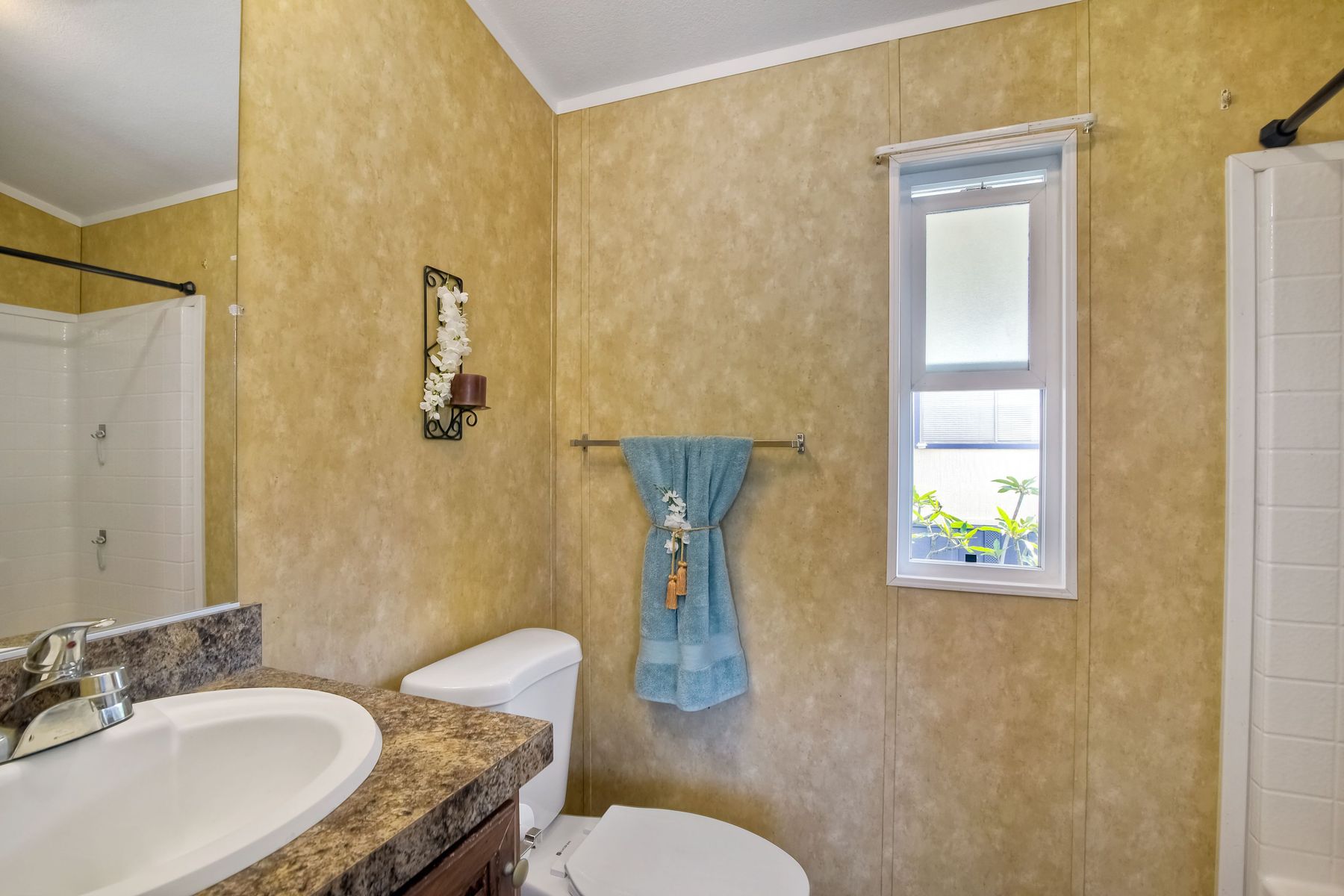 This home is located in an all age community Park that allows pets. This lovely well-maintained home has 2 bedrooms, 2 full baths with a beautifully remodeled kitchen with new cabinetry and quartz countertops and stainless steel appliances. The flooring throughout the house is wood-grained laminate flooring. This home offers the open floor concept with high ceiling and is well-lite with many windows. The carport fits 2 cars and there is a shed for storage. There are fruit trees in the yard. There is a laundry space in the hallway closet. The space rent is around $800. includes trash sewer water, etc. The Park offers swimming pool and recreational facilities.