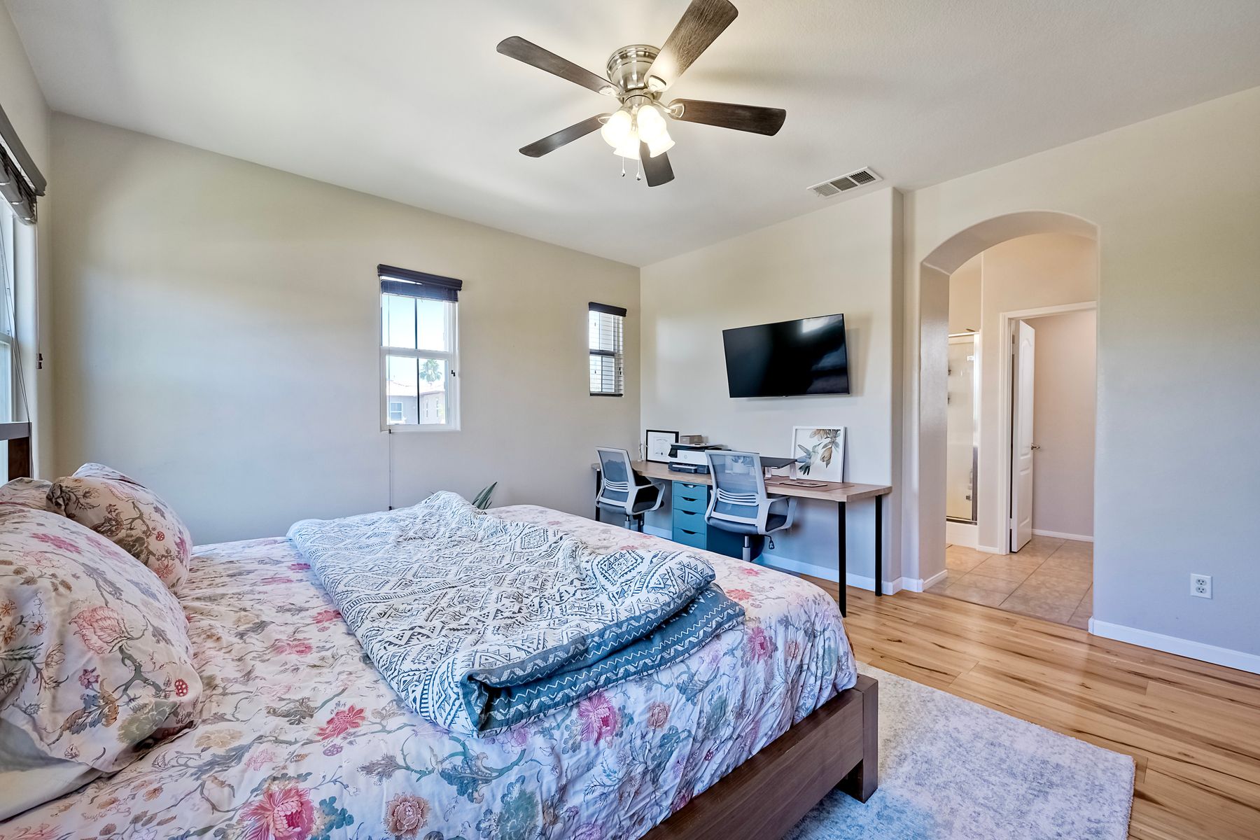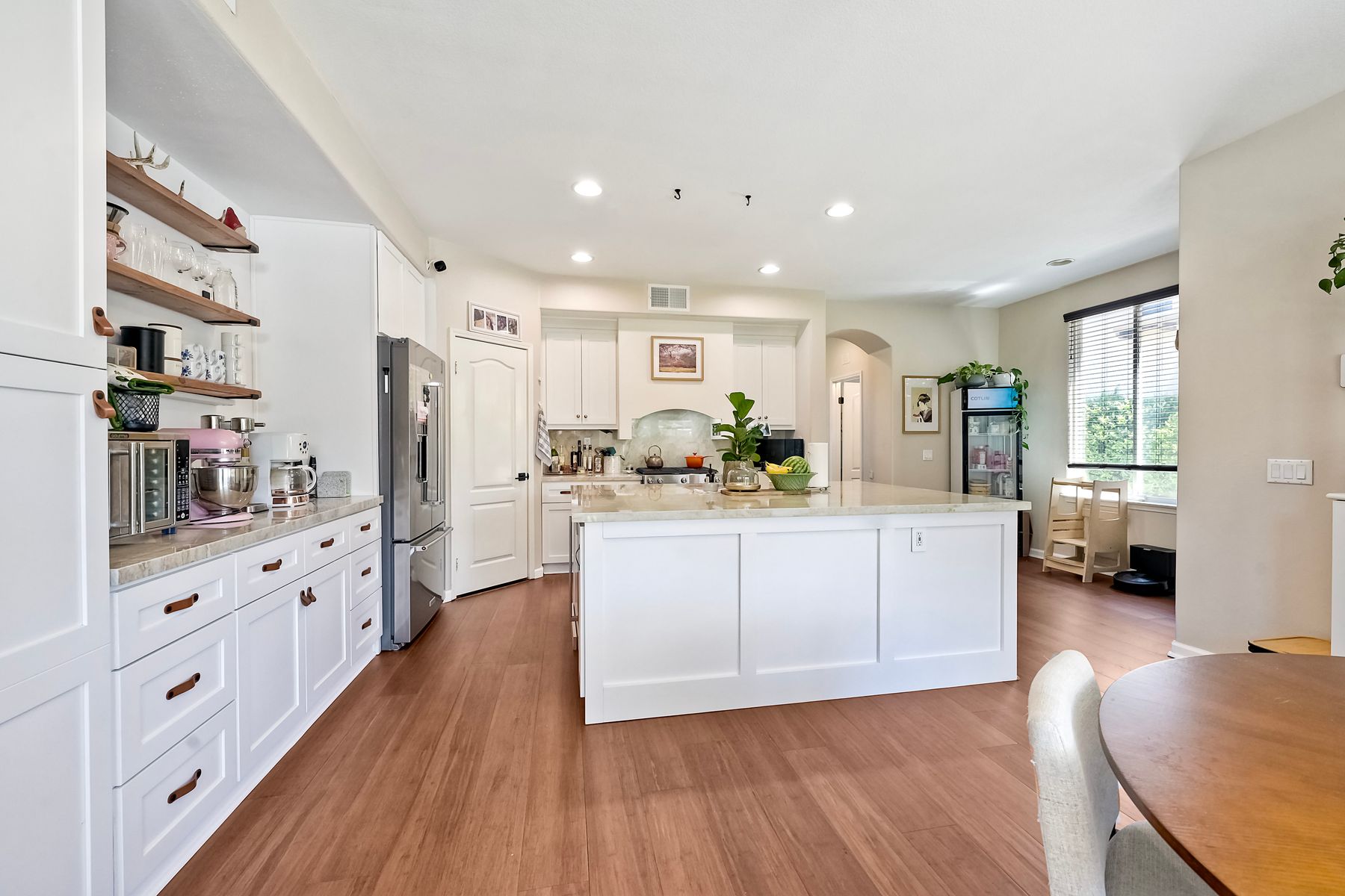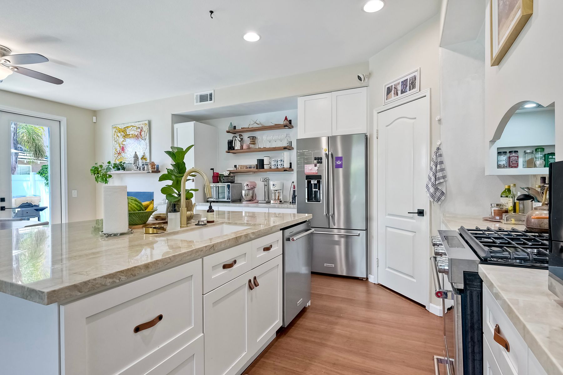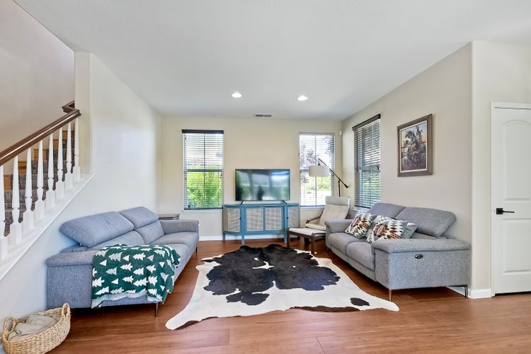 Absolutely Stunning 4-Bedroom Home in the Coveted Harveston Community Welcome to your dream home in the highly sought-after Harveston neighborhood! This beautifully upgraded 4-bedroom, 2.5-bath home offers over 2,100 sq. ft. of stylish living space and is just steps from the scenic Harveston Lake, parks, and walking trails. Step inside to a spacious formal living room, perfect for relaxing or entertaining. The heart of the home is a gorgeous remodeled kitchen featuring luxurious Taj Mahal Quartzite countertops, updated soft-close cabinetry with custom leather pulls, a massive center island, upgraded stainless steel appliances, and a large walk-in pantry. Enjoy casual meals at the breakfast bar or in the cozy in-kitchen dining area. Upstairs, the expansive primary suite includes a spa-like bathroom with dual sinks, a soaking tub, a step-in shower, and a generous walk-in closet. Three additional bedrooms offer plenty of space and storage, along with a full hallway bathroom. The upstairs laundry room adds extra convenience, complete with a sink. Step outside to a private backyard with a patio slab and lush green lawn—ideal for outdoor dining or play. The home also features an extra-long driveway for additional parking, a two-car attached garage, and a solar system with battery backup for energy efficiency. Plus, the HVAC system was replaced in 2021 for peace of mind. This home has it all—style, space, and location. Don’t miss your chance to own a piece of Harveston paradise!