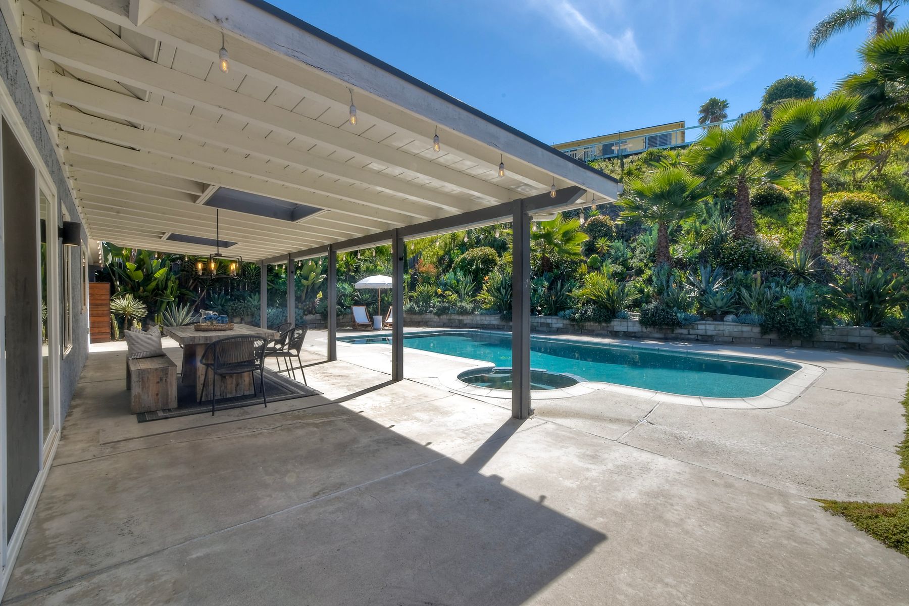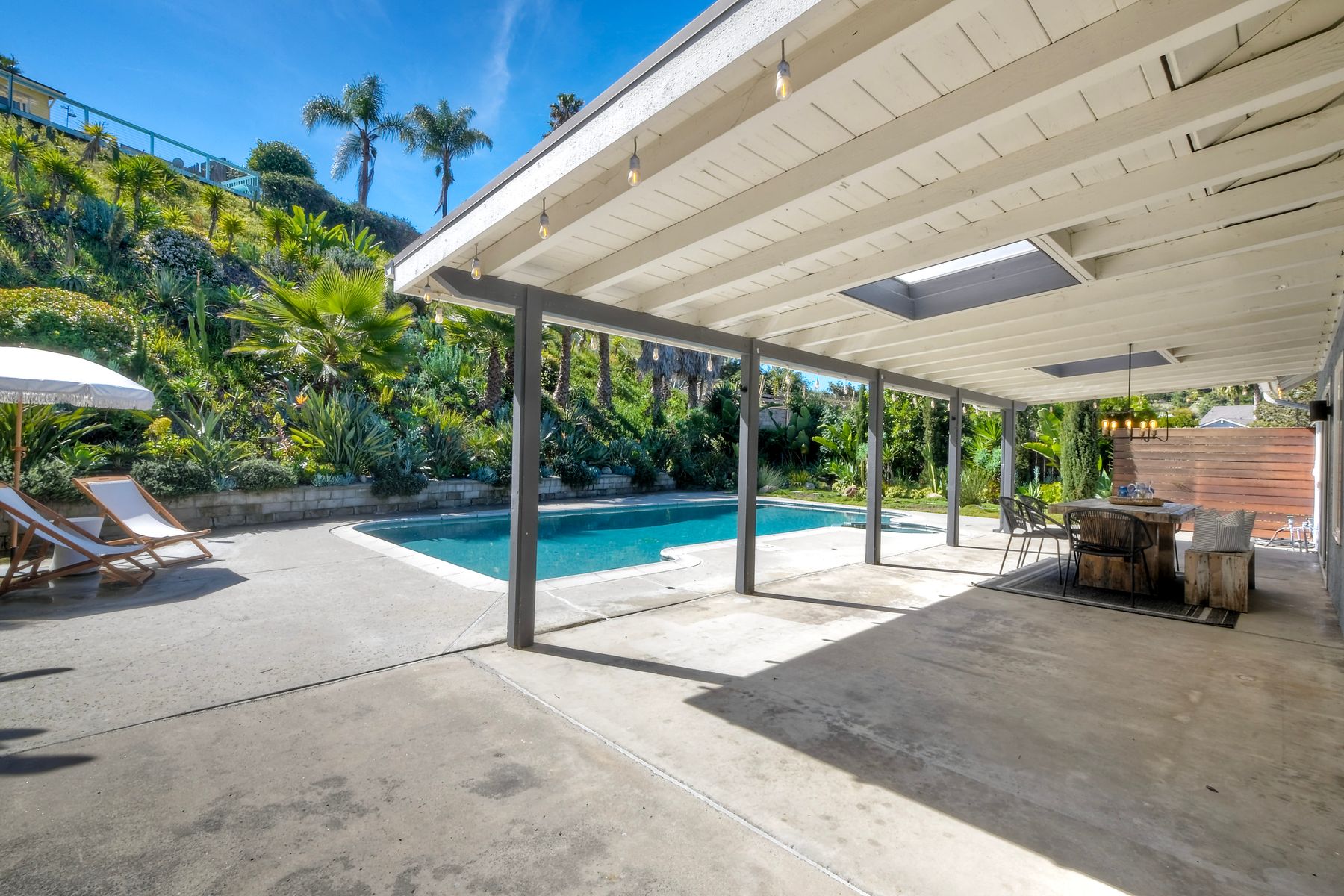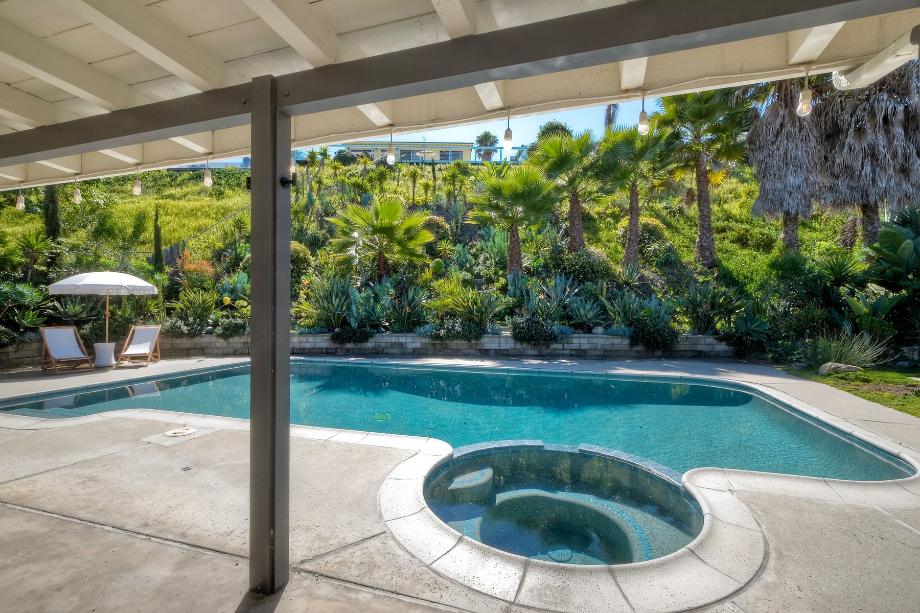 A playful yet refined coastal retreat just five miles from the beach in Oceanside - San Diego’s newest vacation destination. Designed to live like a single story, this beautifully remodeled home blends everyday comfort with a relaxed, getaway-inspired vibe. From the moment you arrive, custom drought-tolerant landscaping and designer details set the tone for effortless coastal living. The expansive backyard is an entertainer’s dream, featuring a sparkling pool and spa finished in mini pebble tec, a large covered patio with skylights, and ample space to relax, gather, or expand. No HOA adds flexibility and freedom, while a very private primary suite on the entry level enhances livability and privacy. Completely remodeled from top to bottom, this move-in-ready home showcases luxury vinyl plank flooring throughout, newer windows and sliders, and high-end wooden shutters that elevate both style and function. The spacious kitchen features granite counters and opens seamlessly to the great room and dining area, accented by tasteful tile feature walls and designer finishes. Two and a half custom baths include gorgeous tile floors, custom vanities with granite counters, and soft-close drawers. An entry-level bedroom currently staged as an office offers flexible use as a dining room or bedroom, while upstairs guest bedrooms feature vaulted ceilings and a cozy loft ideal for reading or relaxing. Major system upgrades include a roof replaced in 2023, newer furnace, and newer water heater, offering peace of mind for years to come. Additional highlights include a whole-house fan including the garage, abundant attic storage, and a three-car garage with stylish accent doors. Ideally located near shopping, beautiful beaches, and easy freeway access, this immaculate home delivers a lifestyle that feels like a vacation while remaining perfectly suited for full-time living.