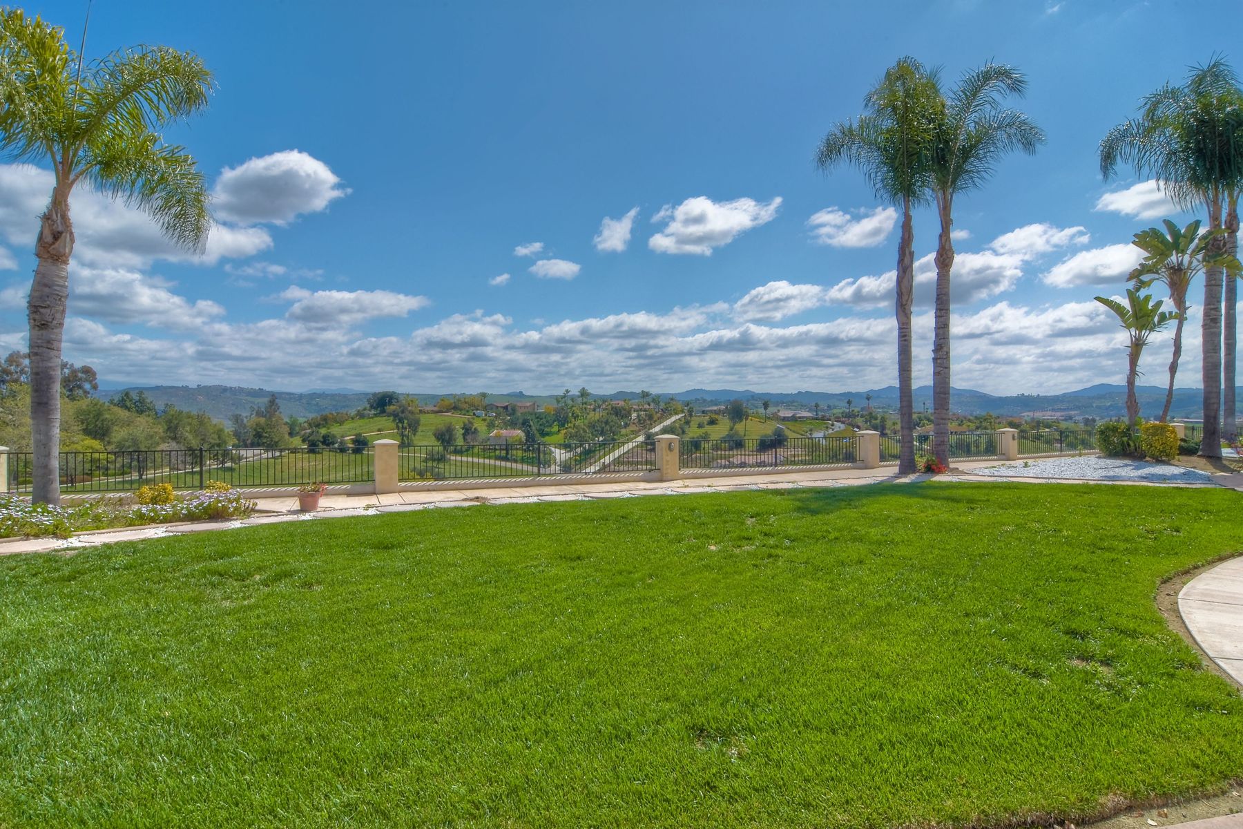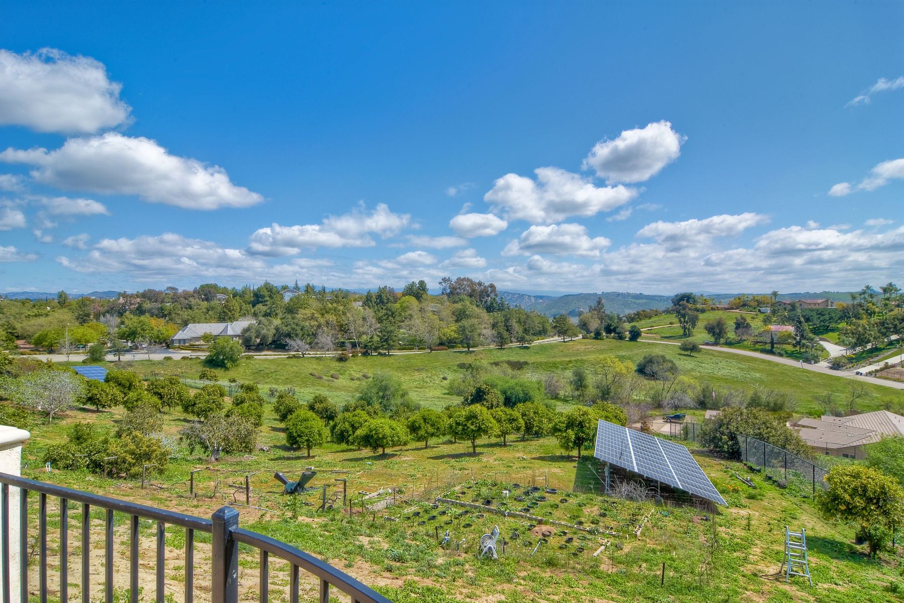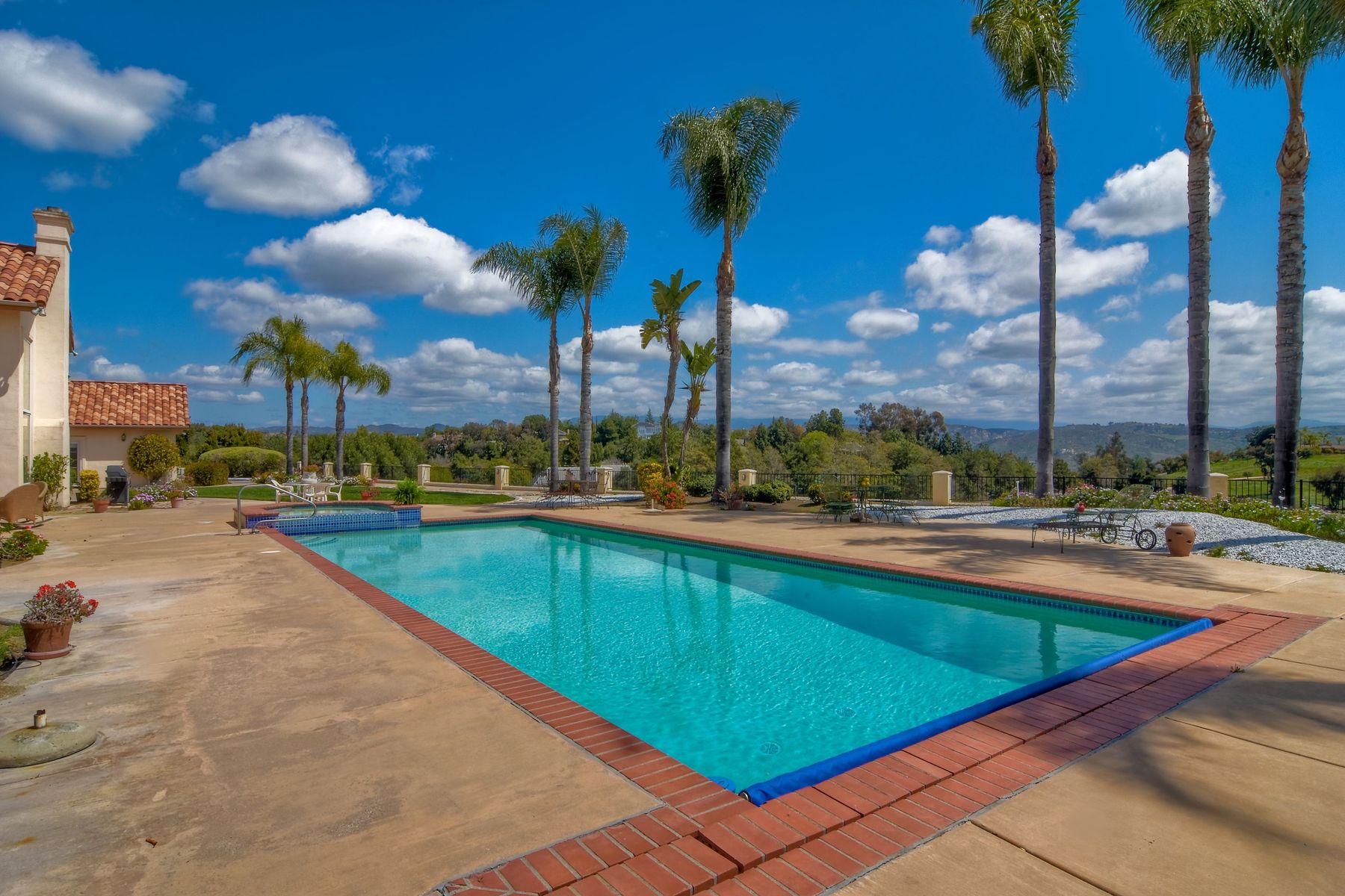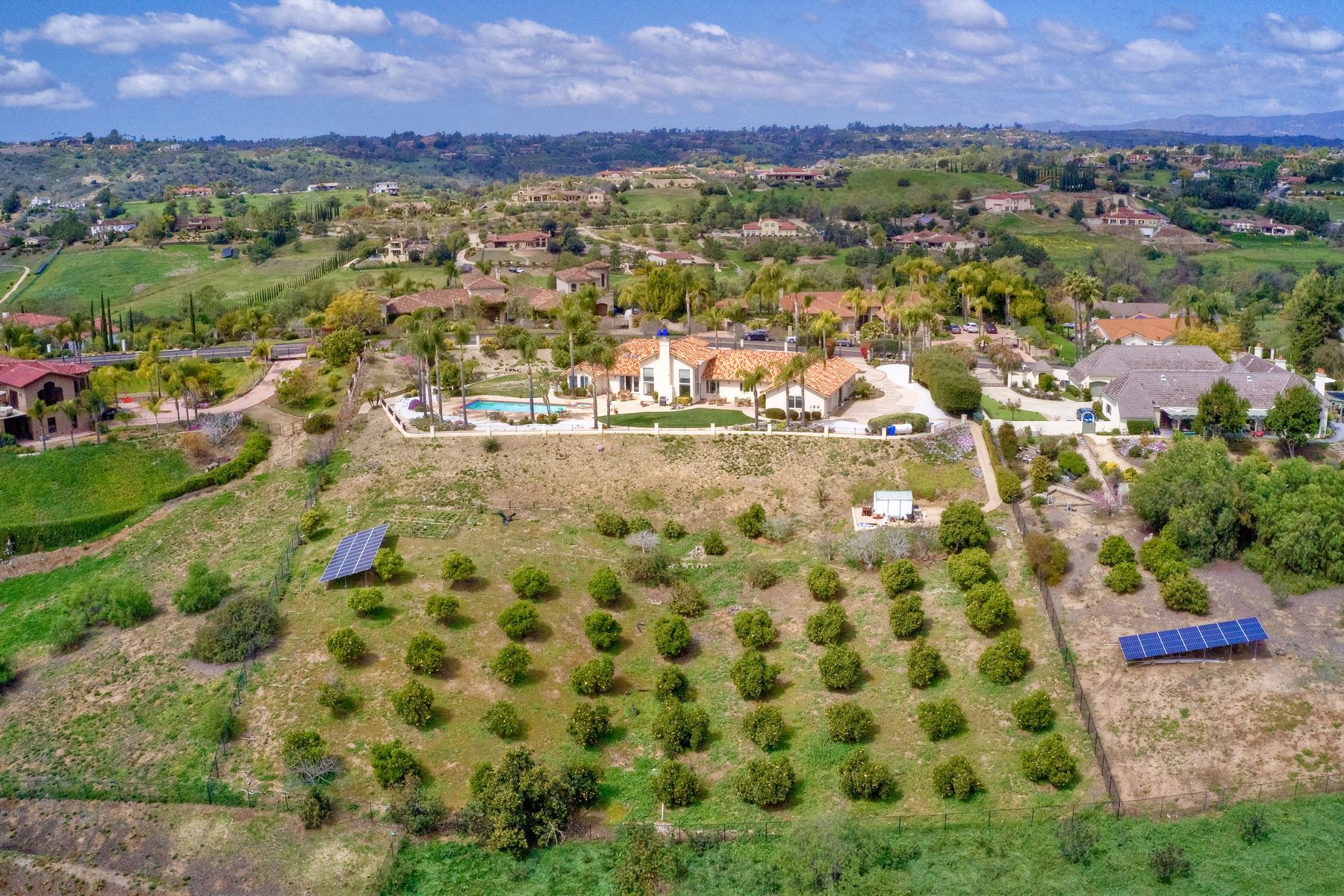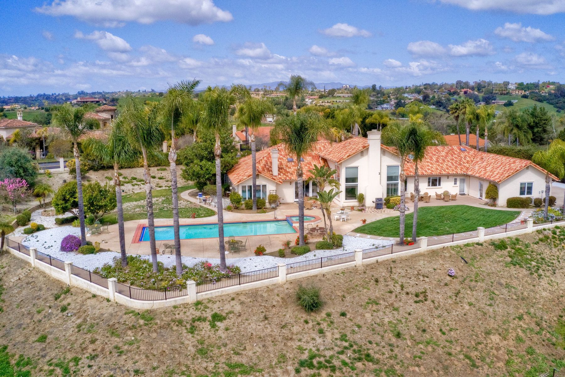 Enjoy incredible panoramic views and gorgeous sunrises every day from this single story resort style living home in Fallbrook! Sparkling outdoor swimming pool and spa are ready for your summer entertaining. Expansive outdoor living space is excellent for indoor/outdoor living! 5 large bedrooms with 5 Full Baths, soaring family room ceilings are ready for your family or guests! Paid solar system for low electric bills! Easy access to Hwy 76, I-15 and I-5, shopping, beaches and restaurants. Enjoy the wonderful ocean breezes from this premium location that also includes approximately 100 mature citrus trees and other " family fruit" selection of trees! A concrete path leads down to the grove where this also a large metal shed. Fully fenced and gated in a neighborhood of other estate quality homes!
