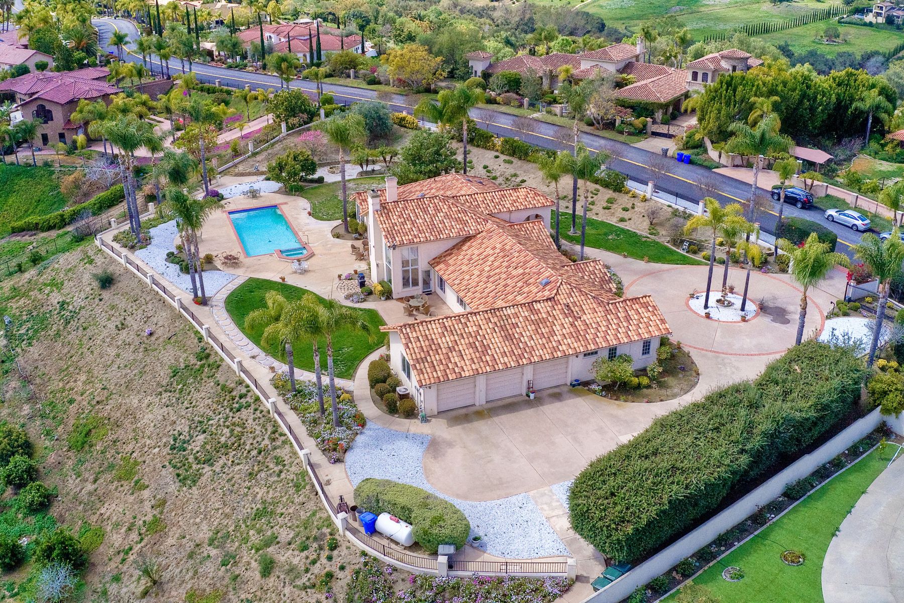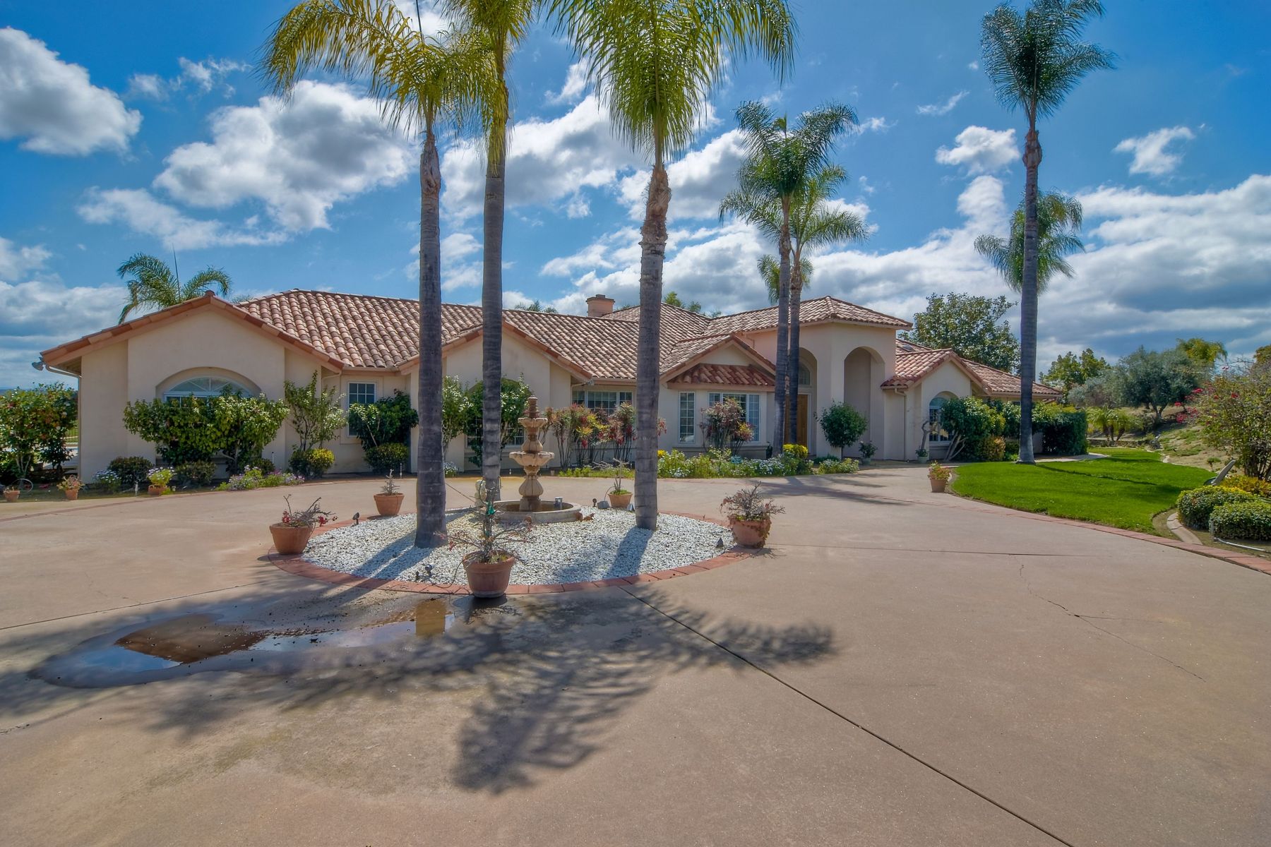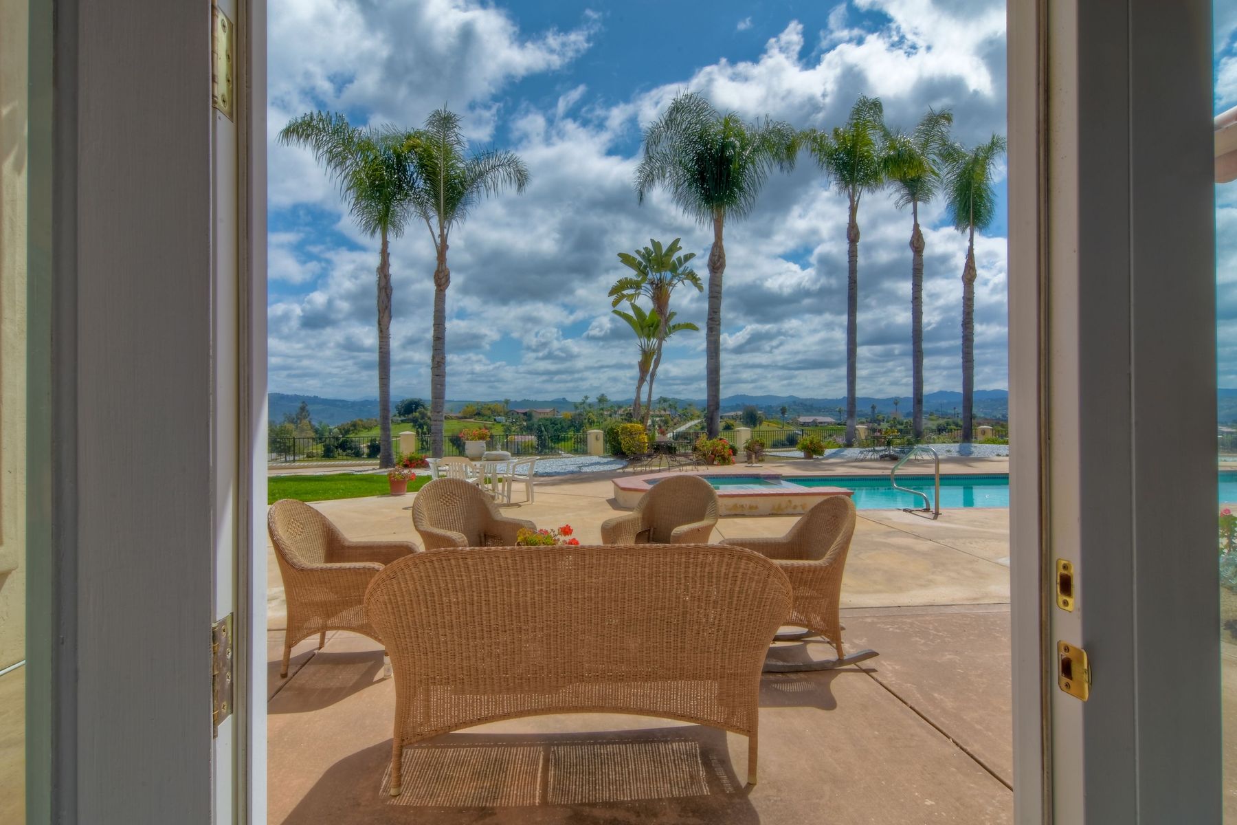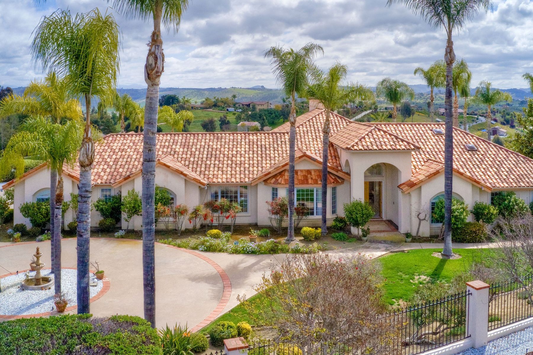 Enjoy incredible panoramic views and gorgeous sunrises every day from this single story resort style living home in Fallbrook! Sparkling outdoor swimming pool and spa are ready for your summer entertaining. Expansive outdoor living space is excellent for indoor/outdoor living! 5 large bedrooms with 5 Full Baths, soaring family room ceilings are ready for your family or guests! Paid solar system for low electric bills! Easy access to Hwy 76, I-15 and I-5, shopping, beaches and restaurants. Enjoy the wonderful ocean breezes from this premium location that also includes approximately 100 mature citrus trees and other " family fruit" selection of trees! A concrete path leads down to the grove where this also a large metal shed. Fully fenced and gated in a neighborhood of other estate quality homes!