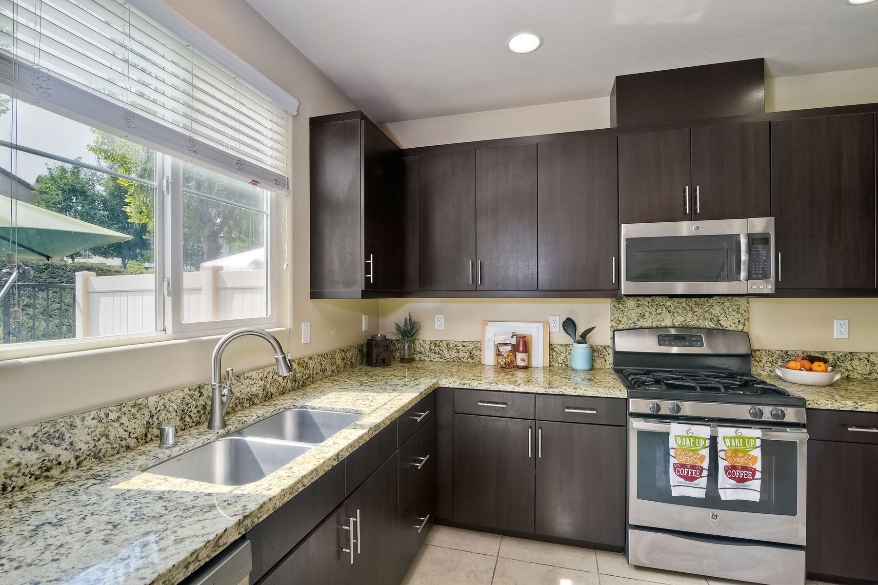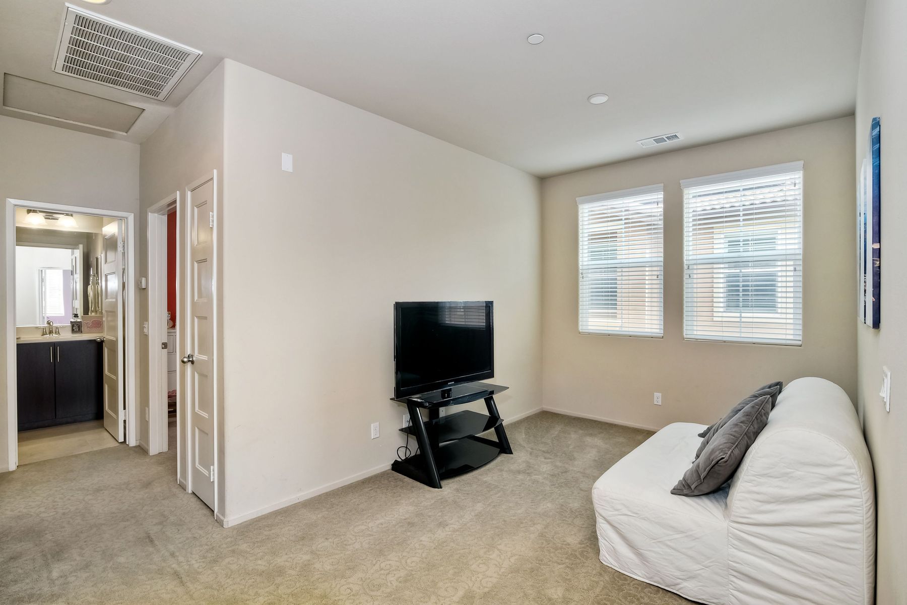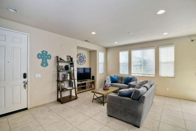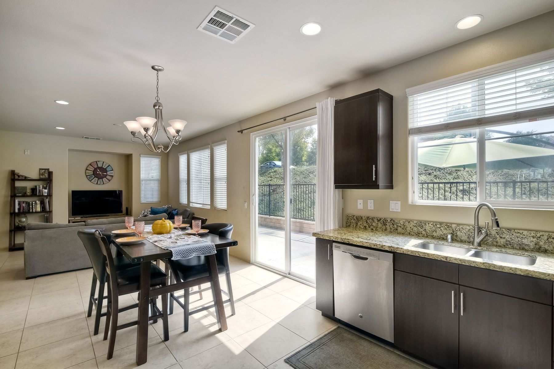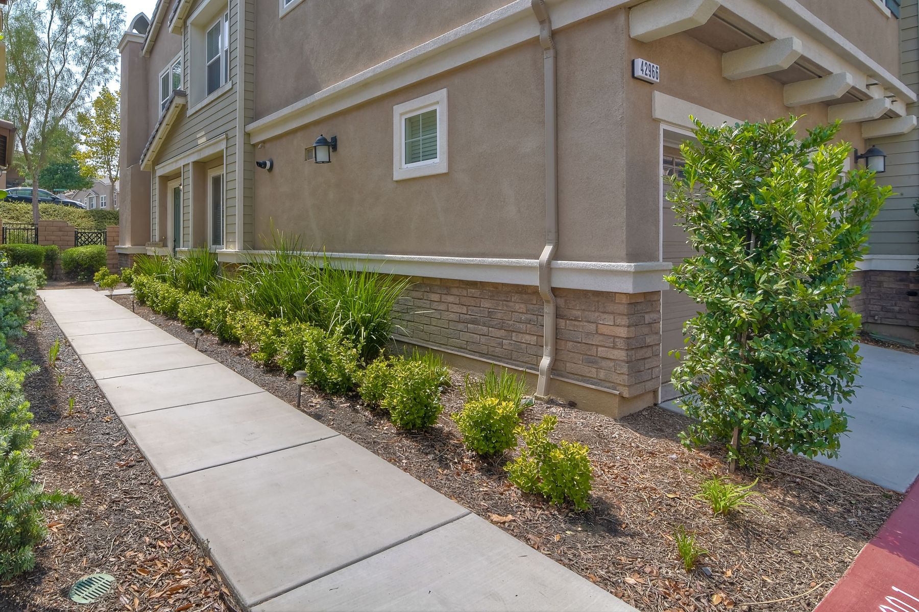 LOW, LOW TAXES, NO MELLO-ROOS! Highly desirable BelVista Plan 3. Premium location, no back yard neighbor. Large back patio with grassy area, perfect or SoCal outdoor living. Adjoining walls are constructed w/ 4" air gap separation with a double layer of drywall on each living space side. This provides nearly sound-proof living. Granite kitchen counters w/ contemporary dark cabinets. Upgrades include open stair rail system, 20x20 porcelain tile in kitchen, dining room and living room. Ceiling fans in all bedrooms, prewired in loft. Builder pre-paid 20-year solar lease providing huge energy savings with no solar payments. You'll only pay low, low usage cost. Tankless water heater, radiant barrier roof sheathing, and Low-E dual glazed windows add to the utility savings. Direct access 2-car garage. Resort-style living with pool, spa, parks, barbecue grills, covered picnic areas, and tot lot. Temecula schools are top notch and the elementary school was recently renovated with state of the art features. You'll enjoy the close proximity to restaurants, Temecula's majestic wineries, golf courses, and the Promenade mall. This is the largest model in Bel Vista boasting 1,739 square feet, 3 bedrooms, 2 1/2 baths, PLUS den downstairs and loft upstairs. The den can easily be converted to a bedroom and powder room to full bath as it is pre-plumbed to add a shower. Empty-nesters, young professionals, and families all love Bel Vista. Sure to sell quickly, so don't miss out.