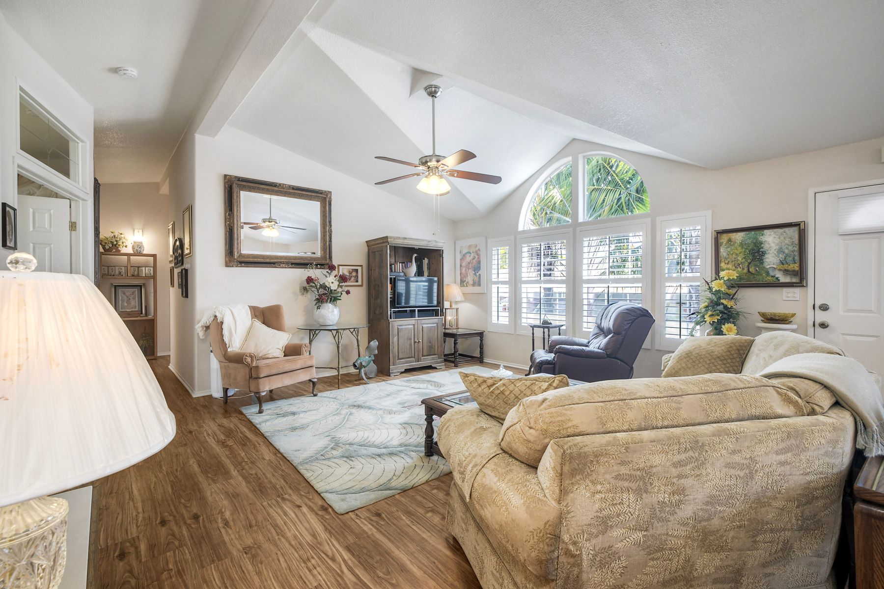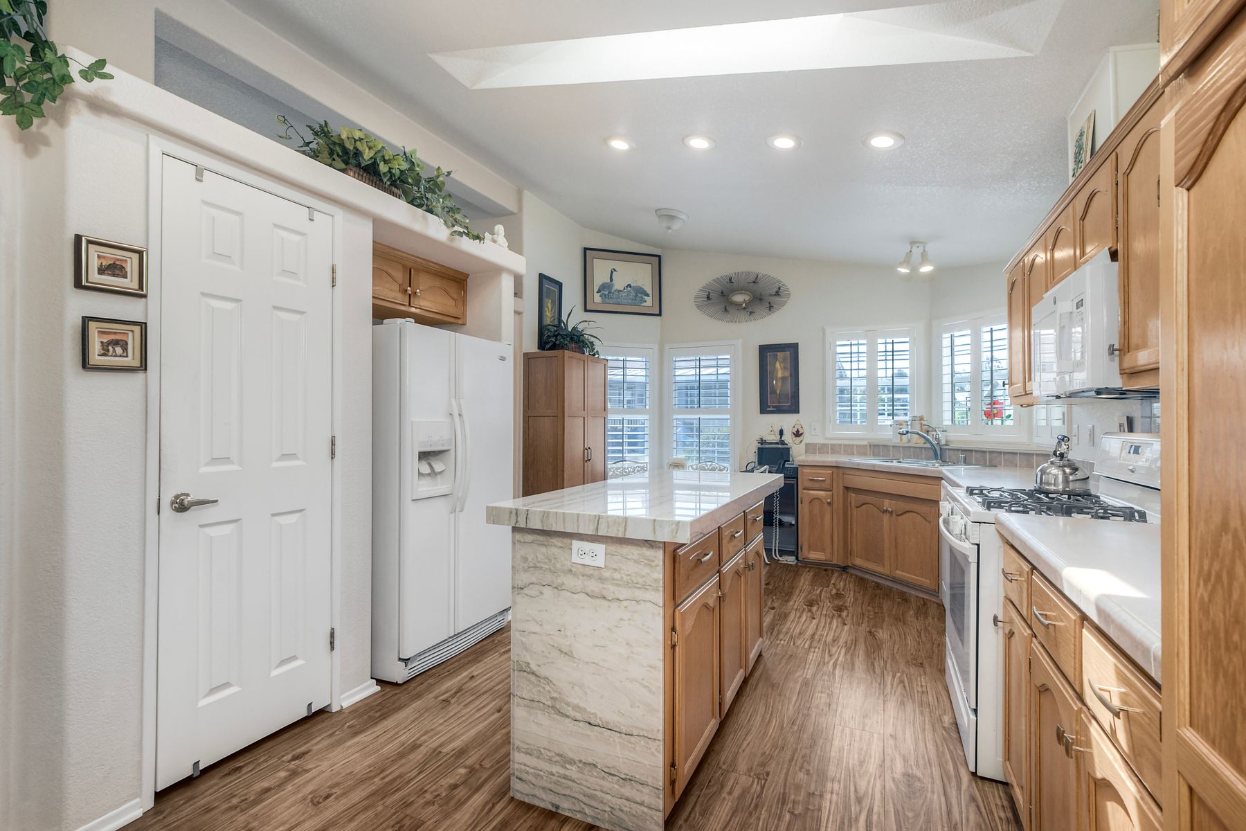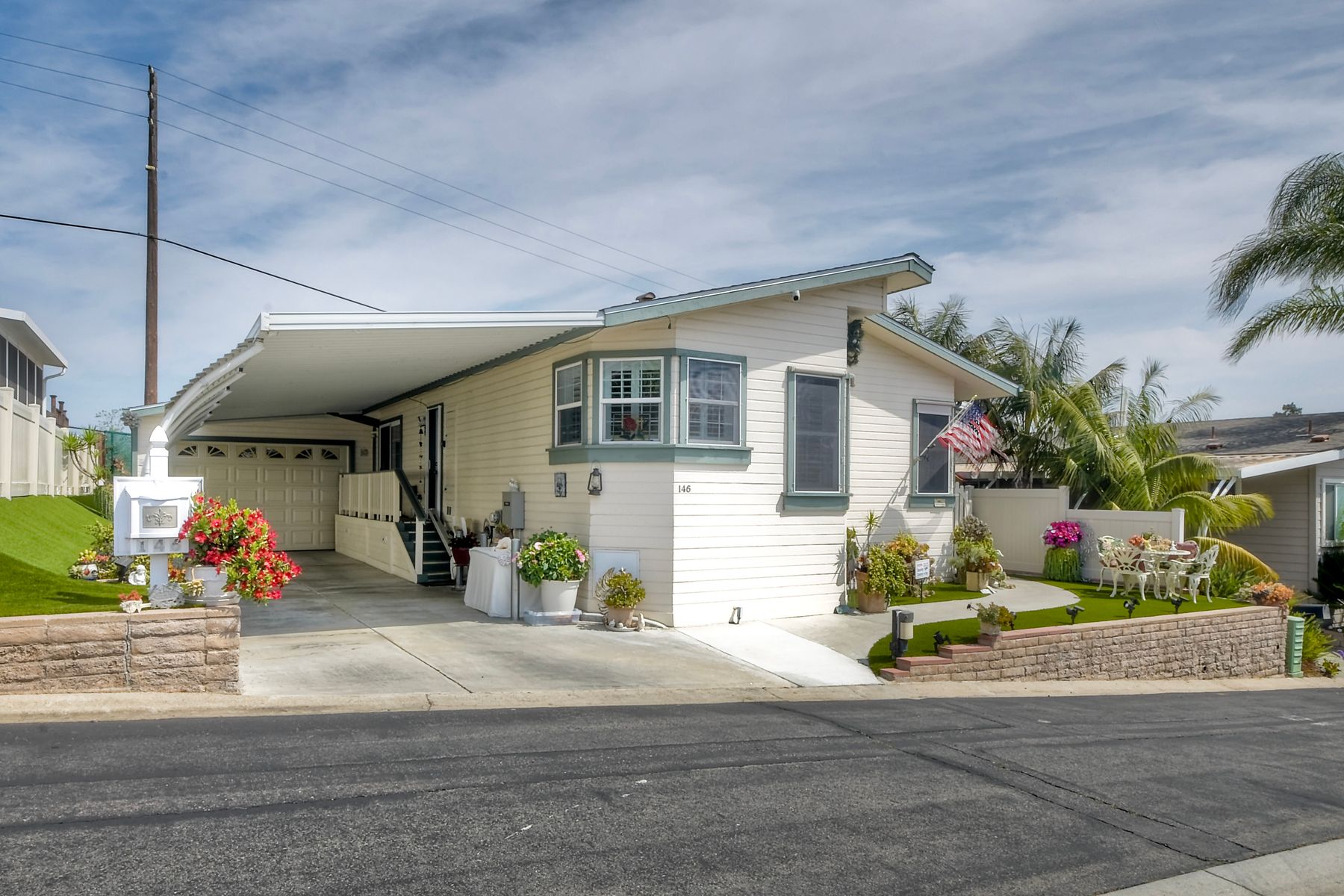 This beautifully upgraded 3-bedroom, 2-bath manufactured home offers 1,564 sq ft of spacious living in a highly desirable 55+ land-owned community—where you own the land (433A certified) and enjoy low-maintenance, resort-style living. Built in 2006 and extensively upgraded, this home features soaring high ceilings, an open-concept layout, and abundant natural light throughout. The inviting living room has a fireplace, creating the perfect space to relax or entertain. The chef-inspired kitchen showcases a quartz center island, ample cabinetry, and a NEW microwave (2025), seamlessly flowing into the dining and living areas. Recent improvements provide exceptional value and peace of mind, including a NEW roof (2025), new dual-pane windows, new water-resistant flooring, and a fully updated forced-air furnace. Additional upgrades include plantation shutters and a chair lift with remote control, offering both style and enhanced accessibility. The custom-built garage (2017) is a rare bonus, featuring an insulated garage door, automatic opener, built-in storage cabinets, and a 100-amp circuit breaker, ideal for additional power needs or workshop use. The exterior has been enhanced with a new concrete driveway and elegant porcelain tile sidewalks, boosting curb appeal and durability. Enjoy exceptional outdoor living with two covered patios plus two patio awnings in the backyard, perfect for entertaining or relaxing year-round. The low-maintenance turf landscaping, along with mature avocado and orange trees, creates a private and inviting outdoor retreat. Located in a vibrant, resident-owned 55+ community, residents enjoy resort-style amenities including a pool and spa, and a well-appointed clubhouse featuring a library, billiards room, kitchen, shuffleboard, and fitness center—ideal for an active and social lifestyle. Prime Encinitas location just minutes to beaches, shopping, dining, and easy freeway access. Turnkey, highly upgraded, and move-in ready—this is coastal 55+ living at its finest!