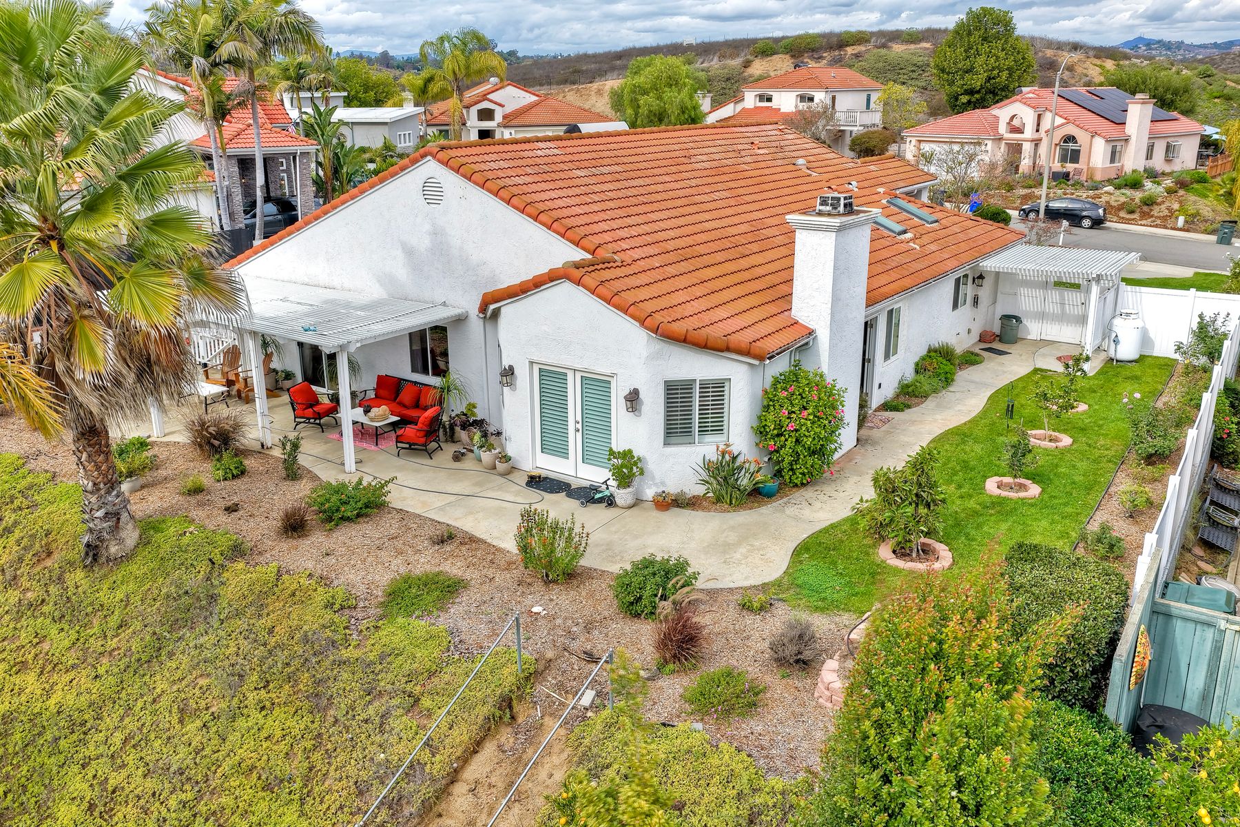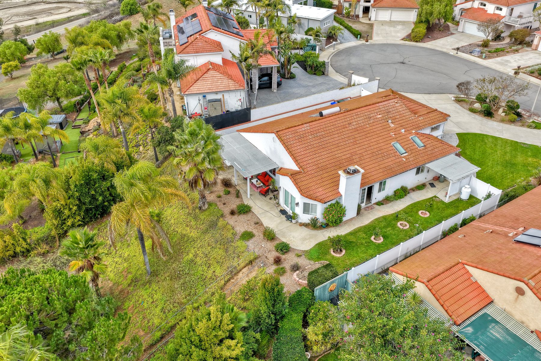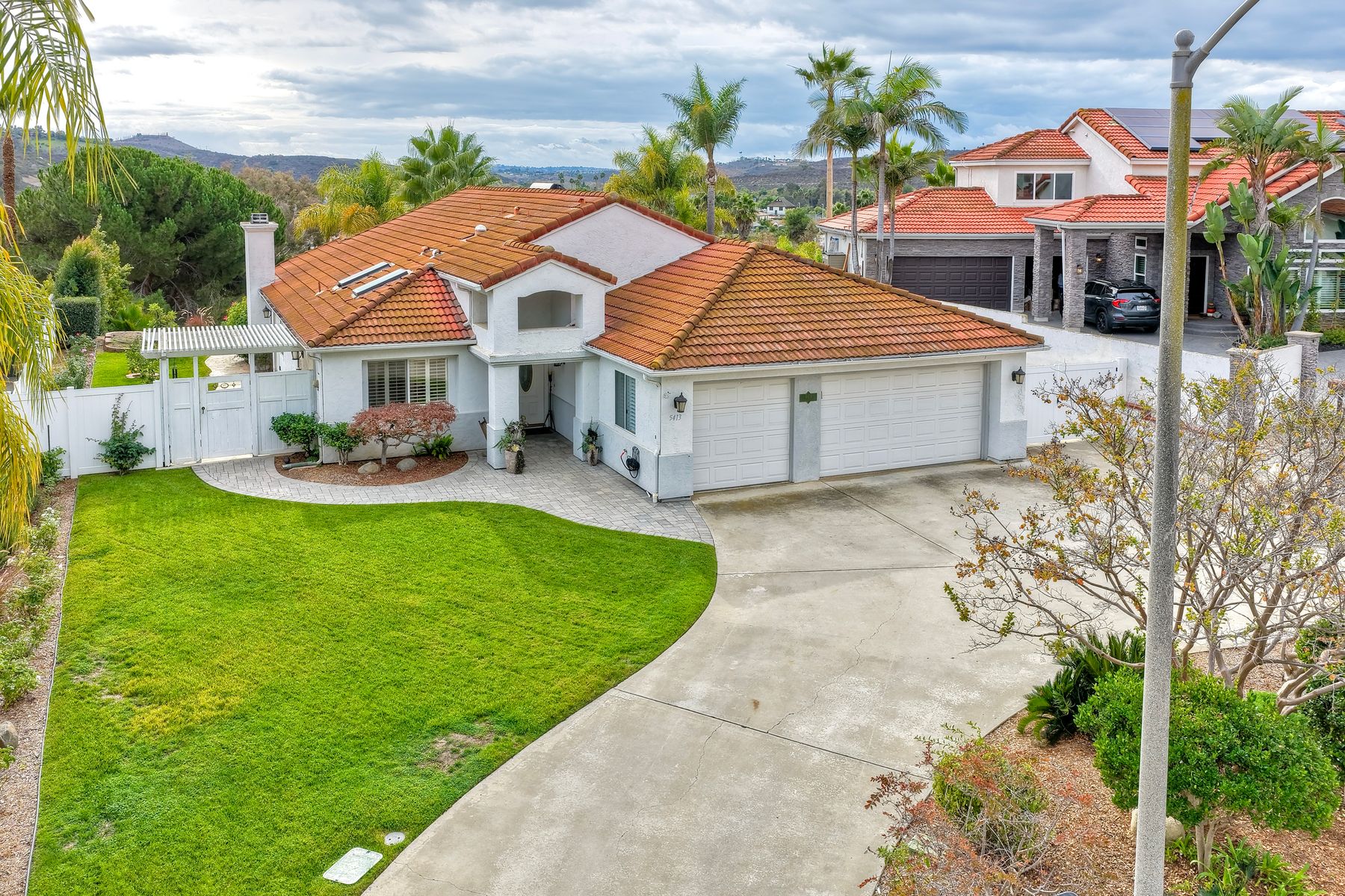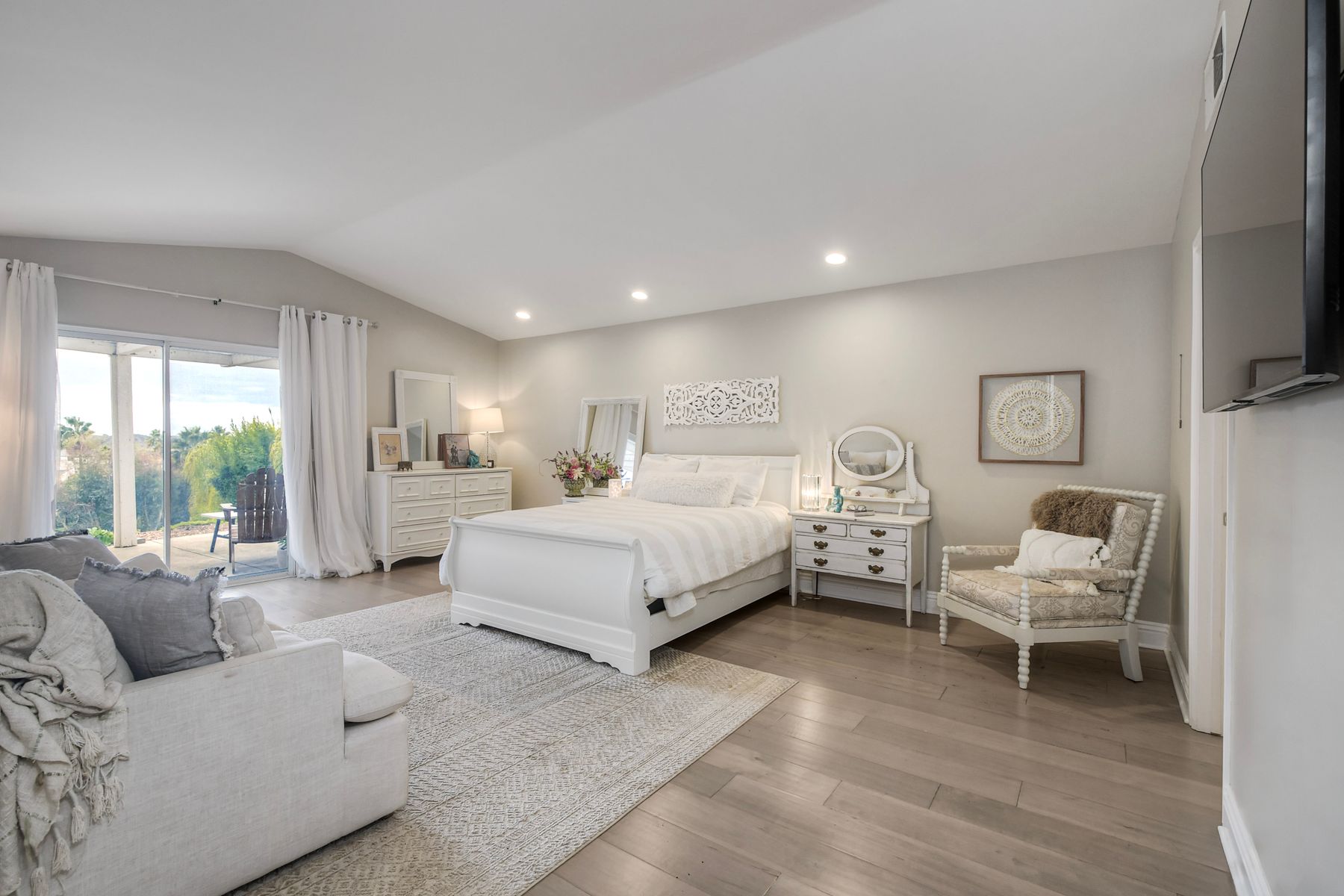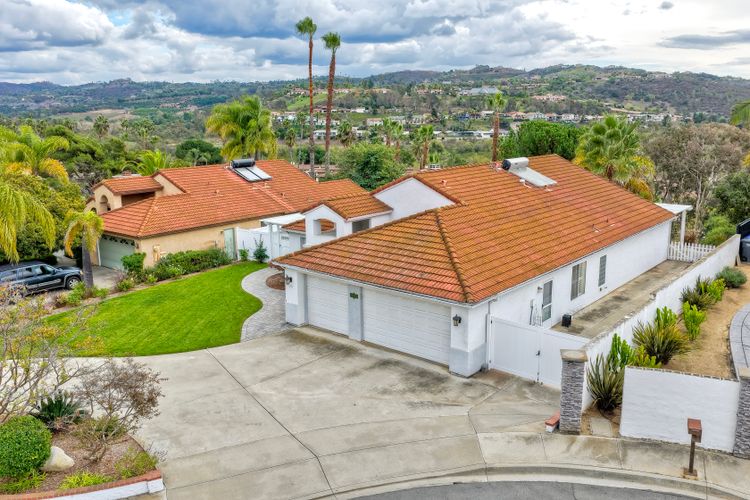 Move-In Ready Single-Story Bonsall Retreat on ½-Acre Lot — No HOA & RV Parking! This beautifully updated 3BR/3BA home features dual ensuite primary bedrooms, vaulted ceilings, and a spacious open great room layout perfect for modern living. Stylish hardwood floors run throughout the inviting living spaces. The remodeled chef’s kitchen showcases a Thermador 6-burner dual-oven range with griddle, custom natural stone countertops, designer backsplash, walk-in pantry, newer appliances, and dual skylights that bring in abundant natural light. A large laundry room with extra storage adds everyday convenience. The main primary suite offers a large walk-in closet and a spa-like, no-glass walk-in shower. Additional highlights include plantation shutters, a finished 3-car garage, a large private, gated RV parking area, and a circular driveway for easy access and additional parking. The generous ½-acre lot also provides excellent potential for an ADU. Perched at the top of a quiet cul-de-sac, the home enjoys panoramic views and cool breezes off the San Luis Rey River. The expansive backyard features multiple fruit trees and full irrigation—ideal for gardening or entertaining. Just a short walk to the new Bonsall Community Park now being built, featuring sports fields, a dog park, and scenic trails. This prime location offers quick access to Highway 76, the I-15 freeway, and is only 30 minutes from the beach. Conveniently close to shopping, dining, golf, and top-rated Bonsall schools. No HOA. A rare, fully renovated, move-in-ready Bonsall property.