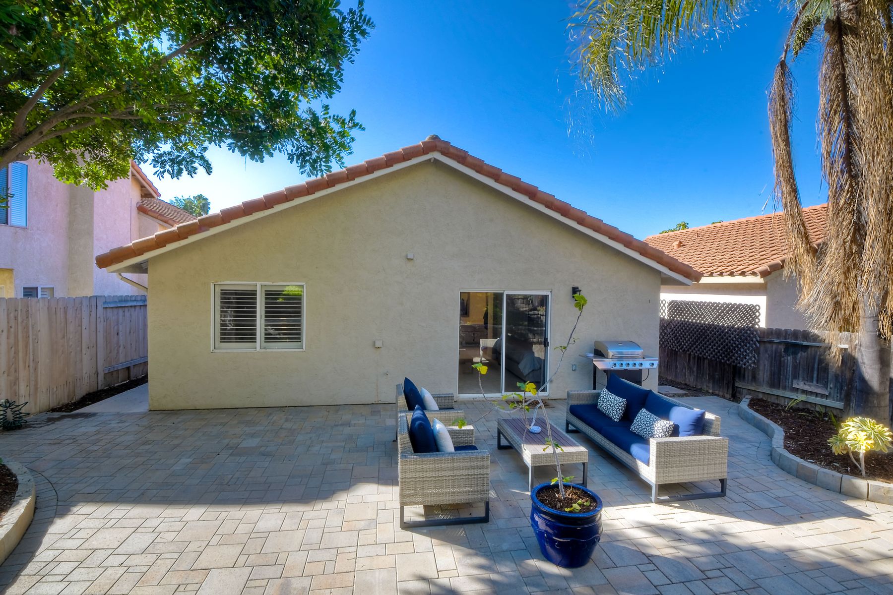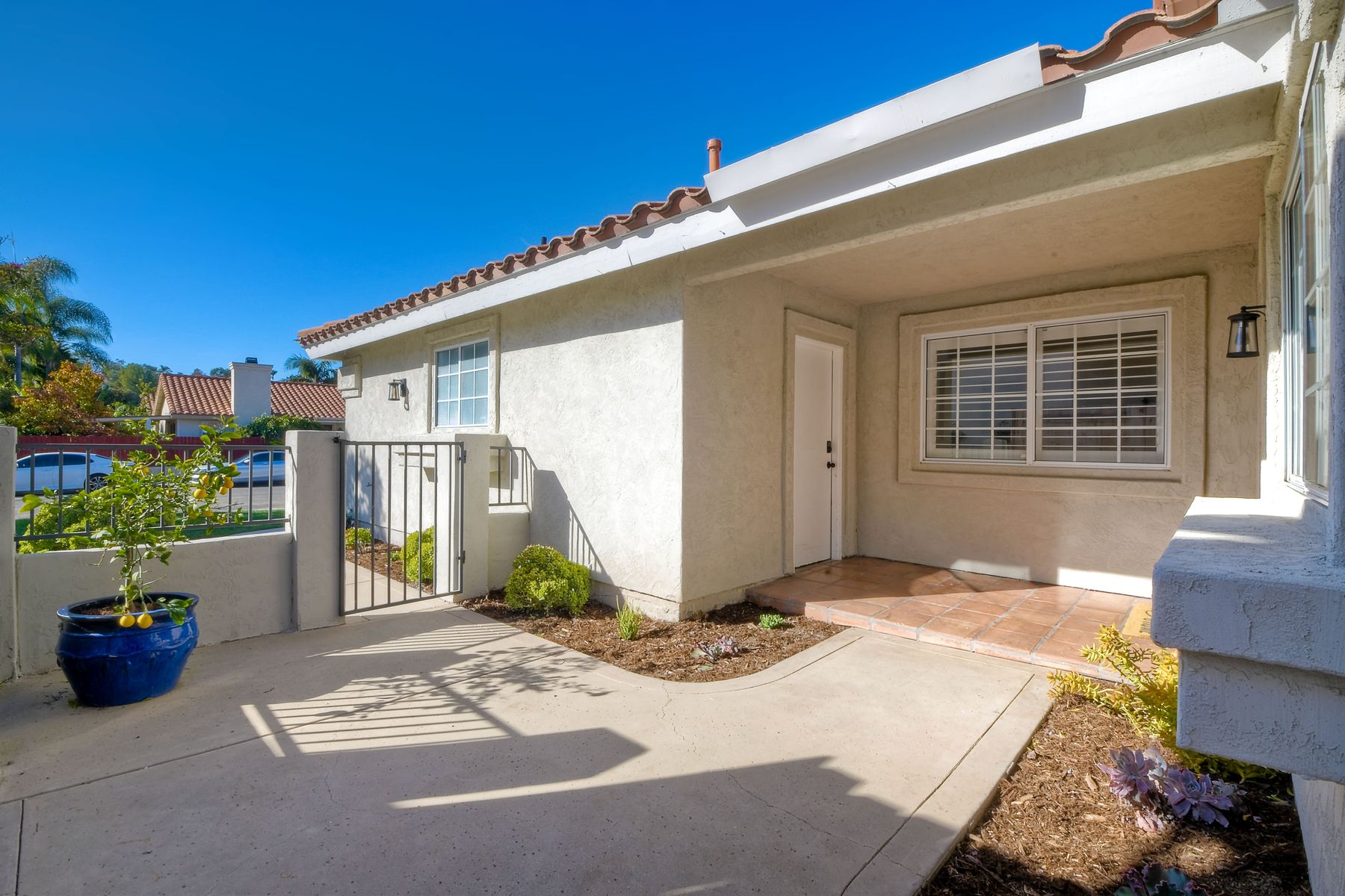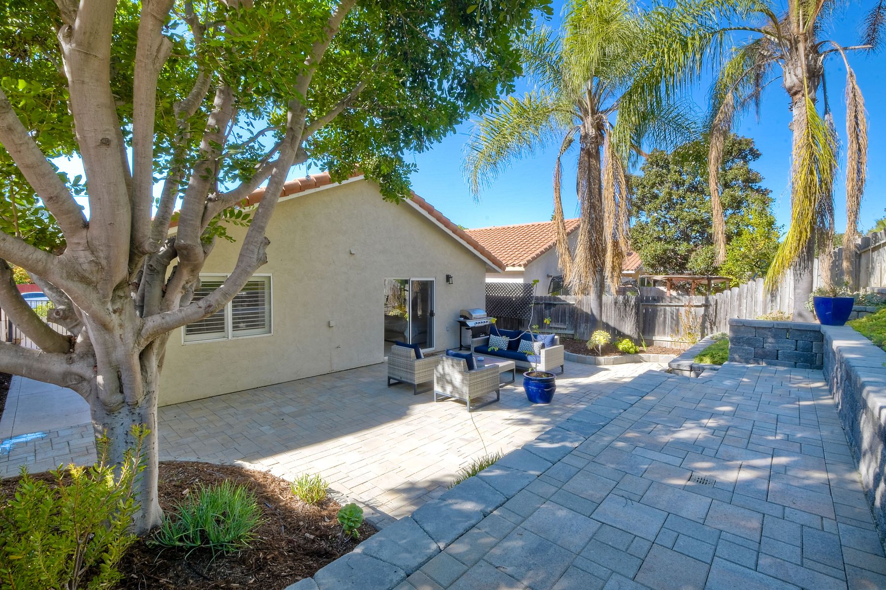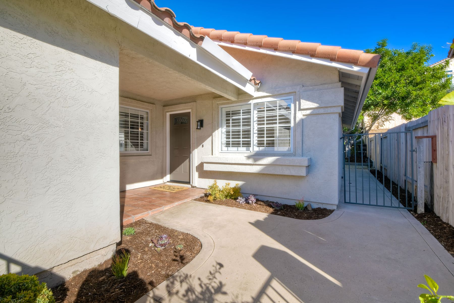 A must see single story home! Come see this meticulously maintained, recently upgraded, light and bright, home in the highly desired Santa Fe Hills community! You'll enjoy cooking in this designer kitchen with beautiful quartz countertops, tile backsplash, white shaker cabinets with the soft close feature, and stainless steel appliances. Cuddle up by the fireplace in the family room on cool evenings. Heading to the primary suite, enjoy the tastefully remodeled bathroom that enjoys dual vanities gorgeous shower and soaking bathtub, all with soothing trendy finishes. The generous primary suite enjoys dual closets with organizers, ceiling fan and access to the beautiful backyard. Enjoy a glass of wine on either the front or rear patios with the recently installed pavers. Have a mini garden in the raised area in the private backyard. The secondary bedroom is generous, has a closet organizer and ceiling fan. Your family and guests will enjoy the hall bathroom that is fresh and trendy. Enjoy our San Diego sun and keep your privacy with the nearly new split shutters! This home is MOVE IN READY! Both the front yard and the backyard have irrigation for efficiency and ease of maintenance. The entire family can enjoy the nearby Cerro Las Posas Park which features an aquatic facility, sports fields, tennis courts and playgrounds with NO HOA fees! As you visit the neighborhood enjoy the mature tree covered pathways and great trails in the beautiful community of Santa Fe Hills.