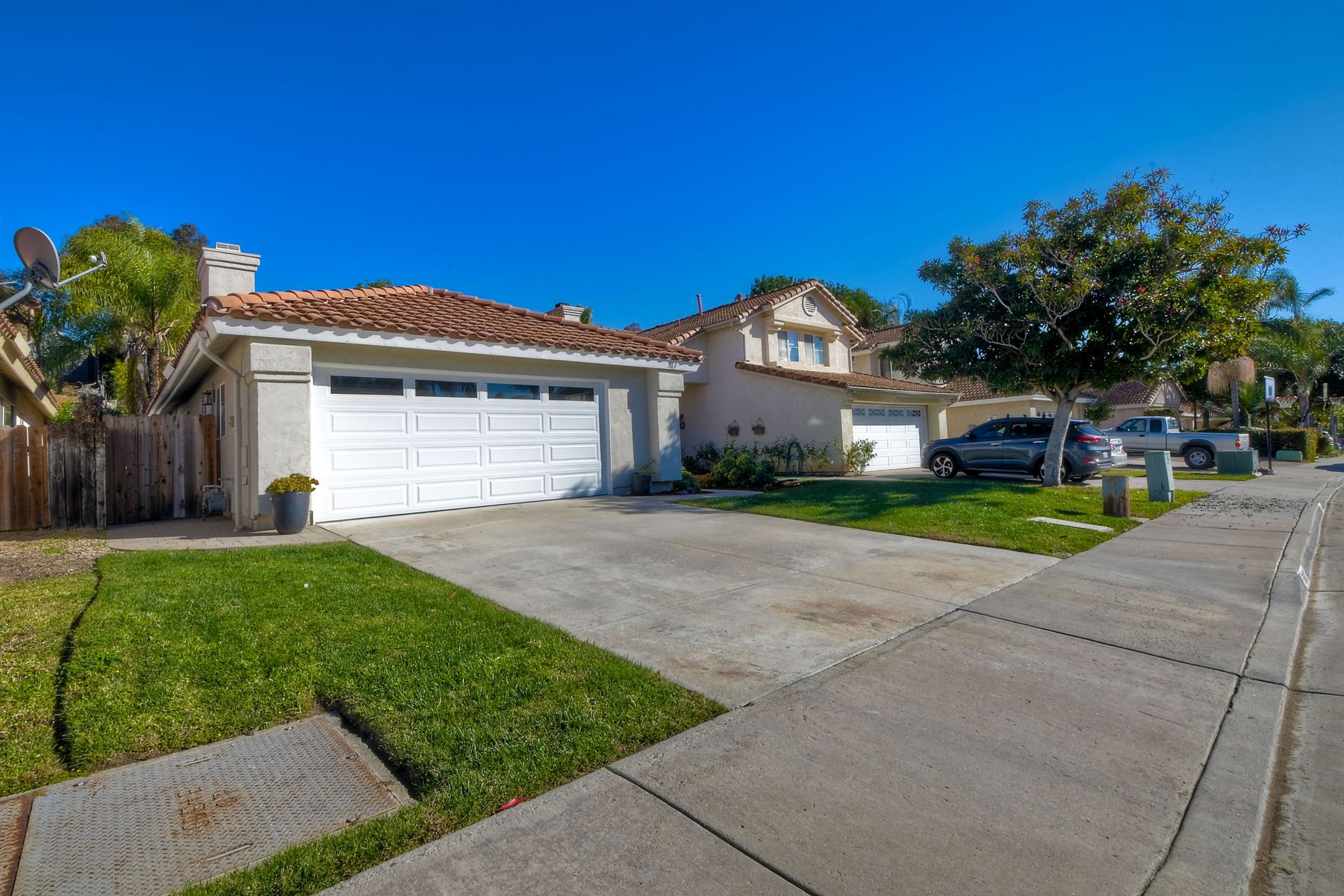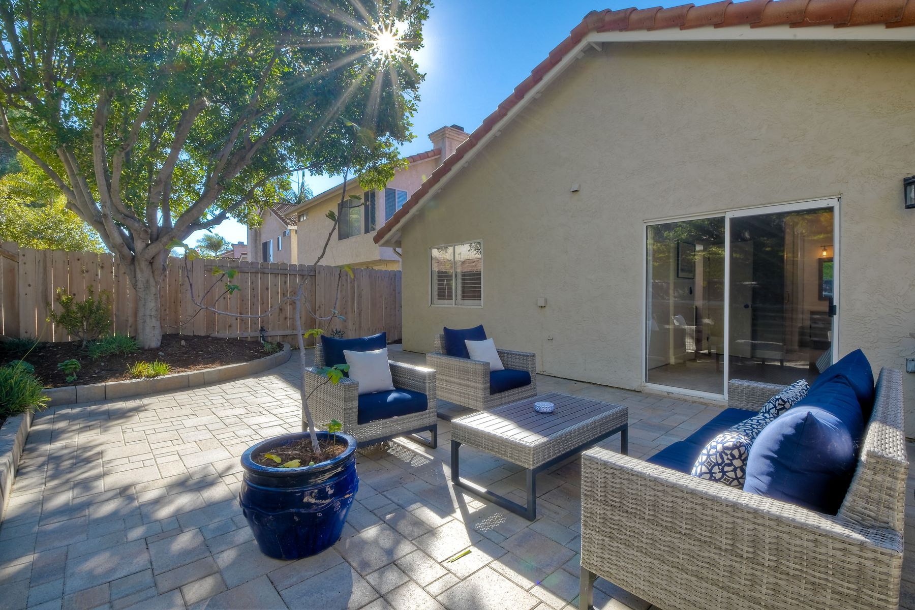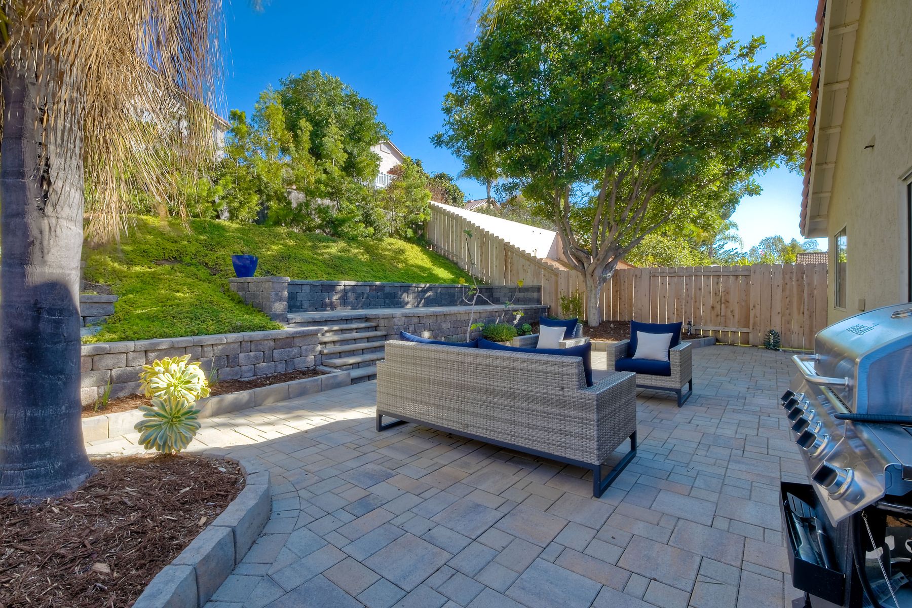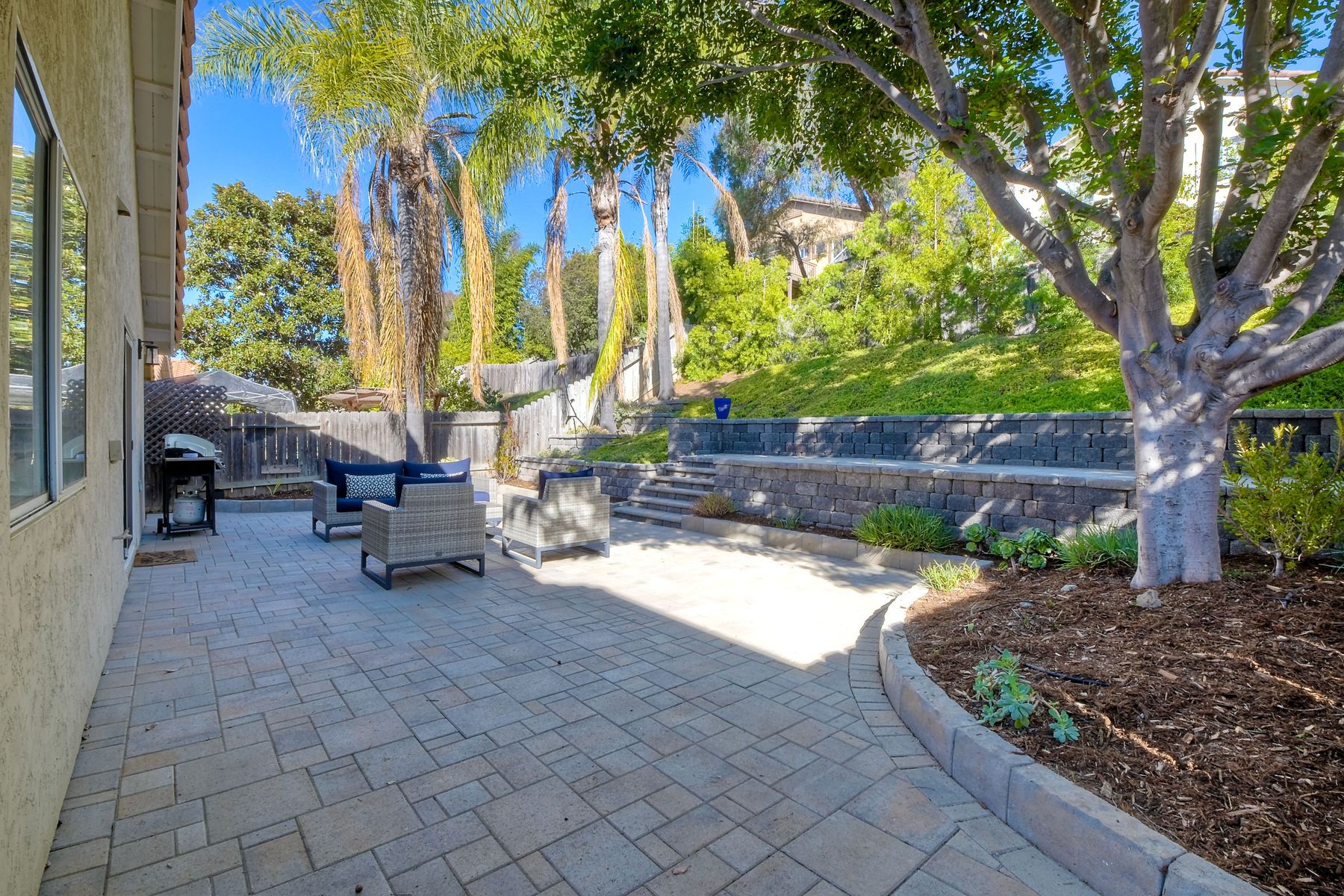 A must see single story home! Come see this meticulously maintained, recently upgraded, light and bright, home in the highly desired Santa Fe Hills community! You'll enjoy cooking in this designer kitchen with beautiful quartz countertops, tile backsplash, white shaker cabinets with the soft close feature, and stainless steel appliances. Cuddle up by the fireplace in the family room on cool evenings. Heading to the primary suite, enjoy the tastefully remodeled bathroom that enjoys dual vanities gorgeous shower and soaking bathtub, all with soothing trendy finishes. The generous primary suite enjoys dual closets with organizers, ceiling fan and access to the beautiful backyard. Enjoy a glass of wine on either the front or rear patios with the recently installed pavers. Have a mini garden in the raised area in the private backyard. The secondary bedroom is generous, has a closet organizer and ceiling fan. Your family and guests will enjoy the hall bathroom that is fresh and trendy. Enjoy our San Diego sun and keep your privacy with the nearly new split shutters! This home is MOVE IN READY! Both the front yard and the backyard have irrigation for efficiency and ease of maintenance. The entire family can enjoy the nearby Cerro Las Posas Park which features an aquatic facility, sports fields, tennis courts and playgrounds with NO HOA fees! As you visit the neighborhood enjoy the mature tree covered pathways and great trails in the beautiful community of Santa Fe Hills.