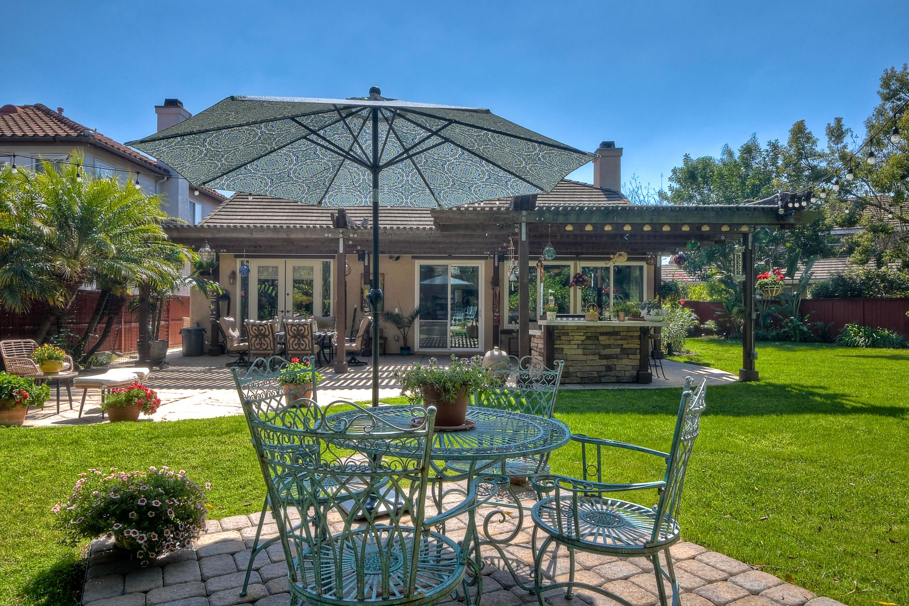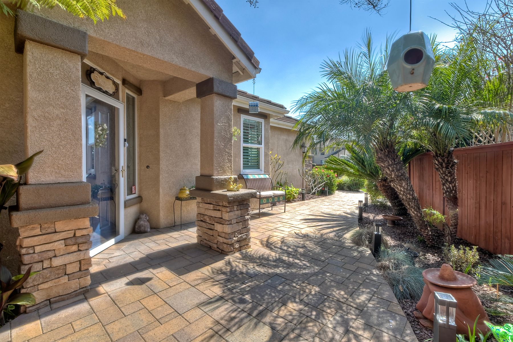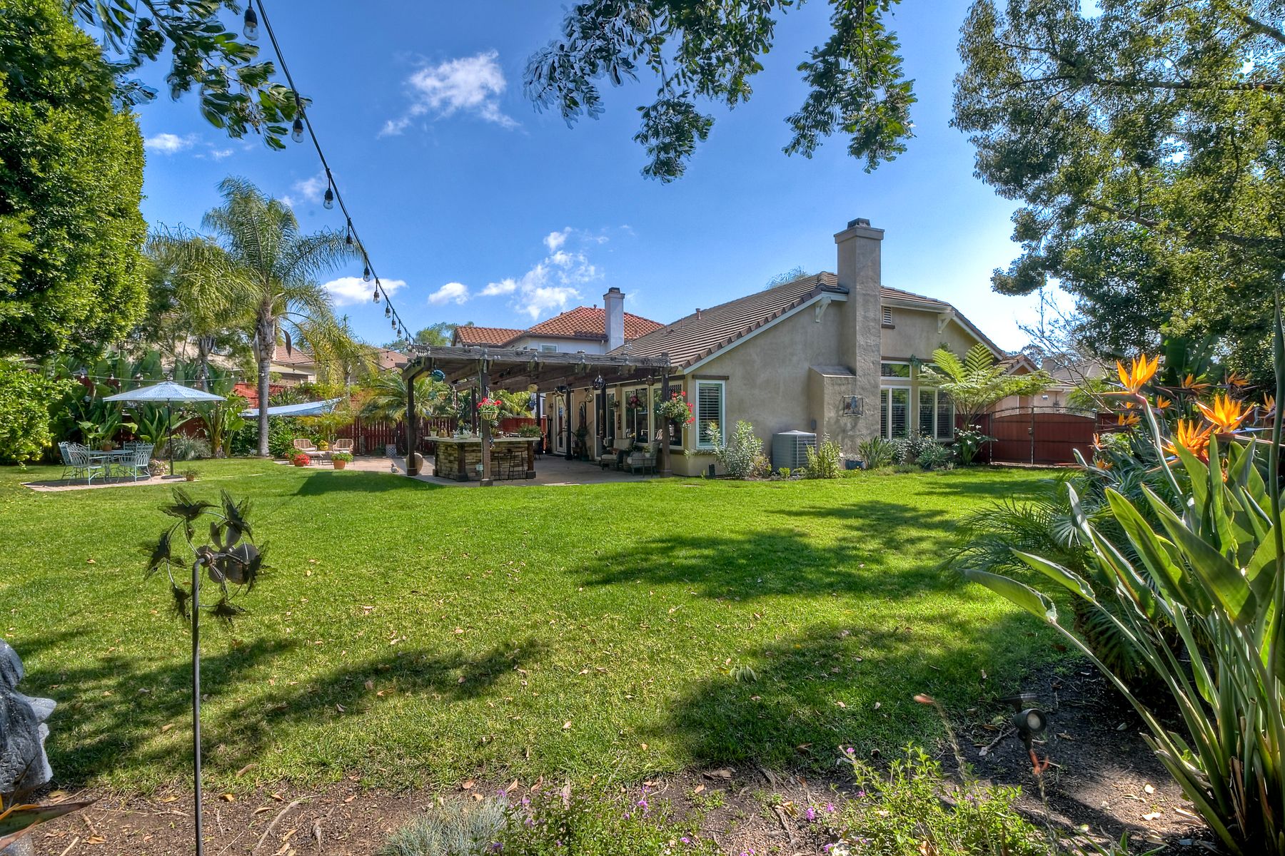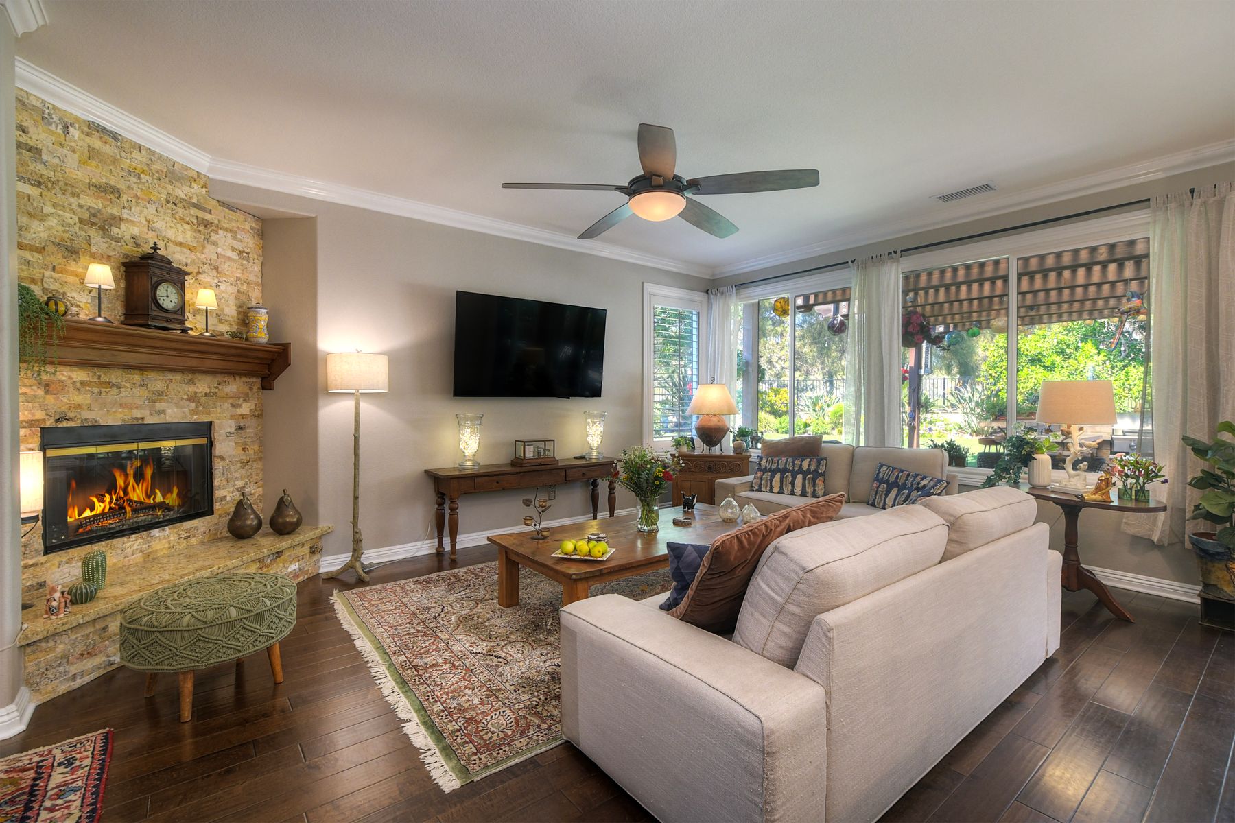 Welcome to this stunning and comfortable, golf view, 1-story home on a .27-acre pie-shaped lot, designed for modern luxury and panoramic fairway views. The gourmet kitchen was designed with gleaming granite countertops with endless space, stainless appliances, double ovens, a two-tiered breakfast bar, and custom pantry organizers. Seamlessly flowing from the family room, the home features hardwood floors, a cozy, stack-stone fireplace, LED lighting, crown molding, ceiling fans and plantation shutters. The primary suite is a private retreat with picture-window views, a walk-in closet with built-ins, and a spa-like bath with a soaking tub and step-in shower. The masterfully designed private backyard oasis is perfect for relaxing or entertaining, featuring an extended covered patio with a built-in kitchen and new BBQ, remote LED lighting, wired for sound, and a 220V-ready pad for a spa. Fully equipped with modern comforts: newer HVAC with air purification system, smart home tech (Nest/Ring). The 2-car garage has a new insulated garage door, is equipped with built-in cabinets, new water heater and overhead storage racks. Leased solar system and back up battery only $182/month which provides energy efficiency and more than covers the current electric bill. Be sure to also look at the 3D Virtual Tour in the link.