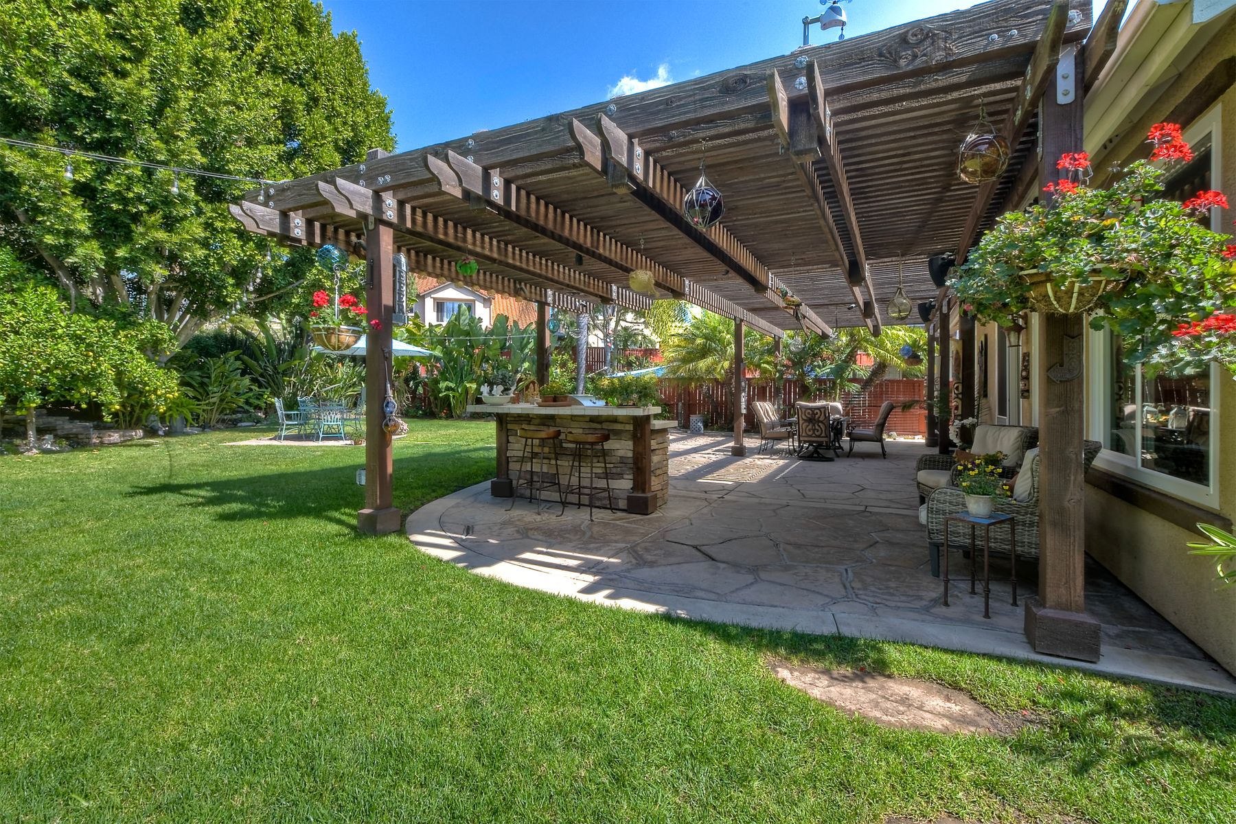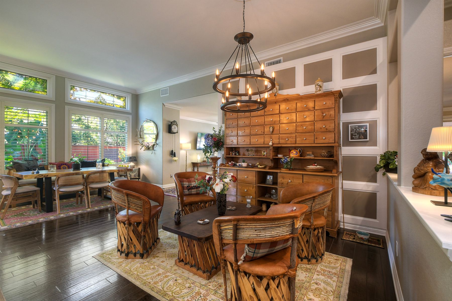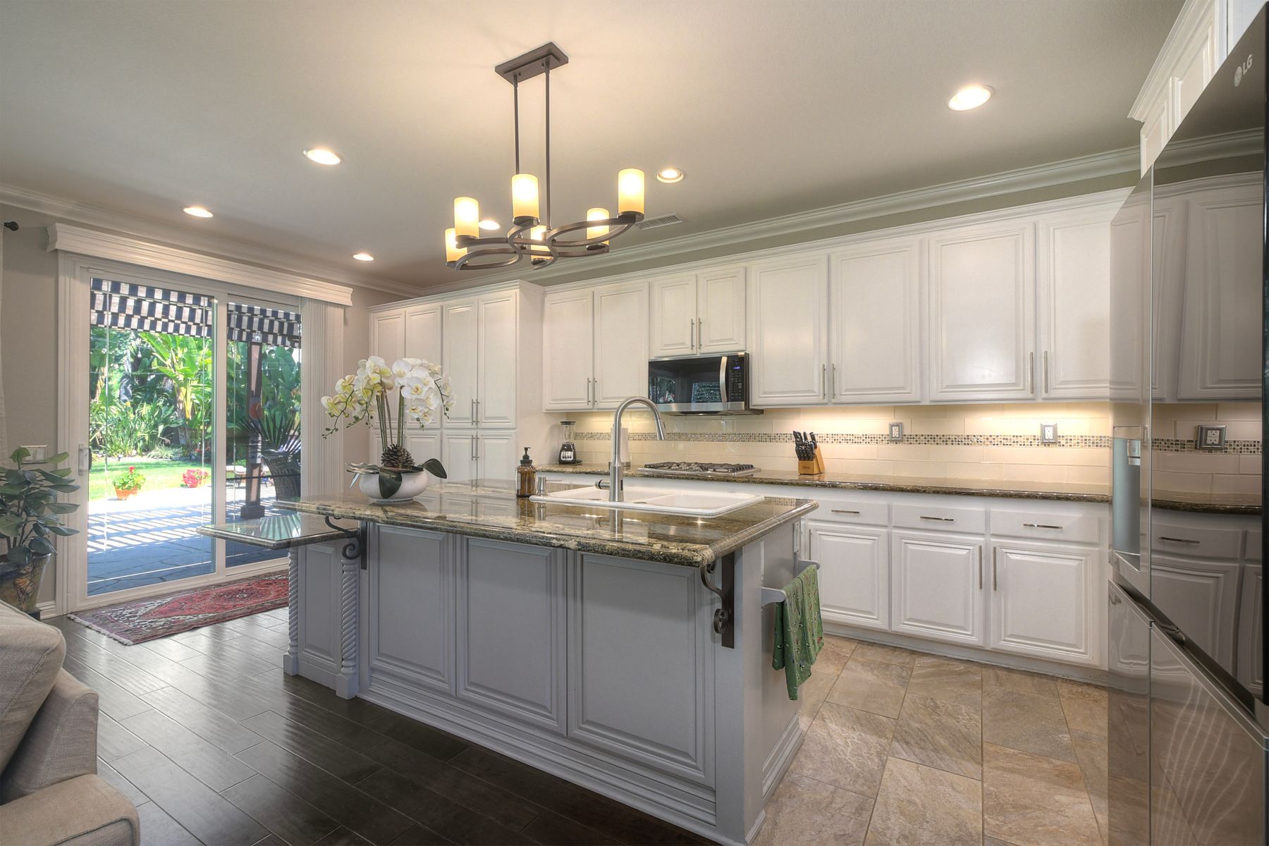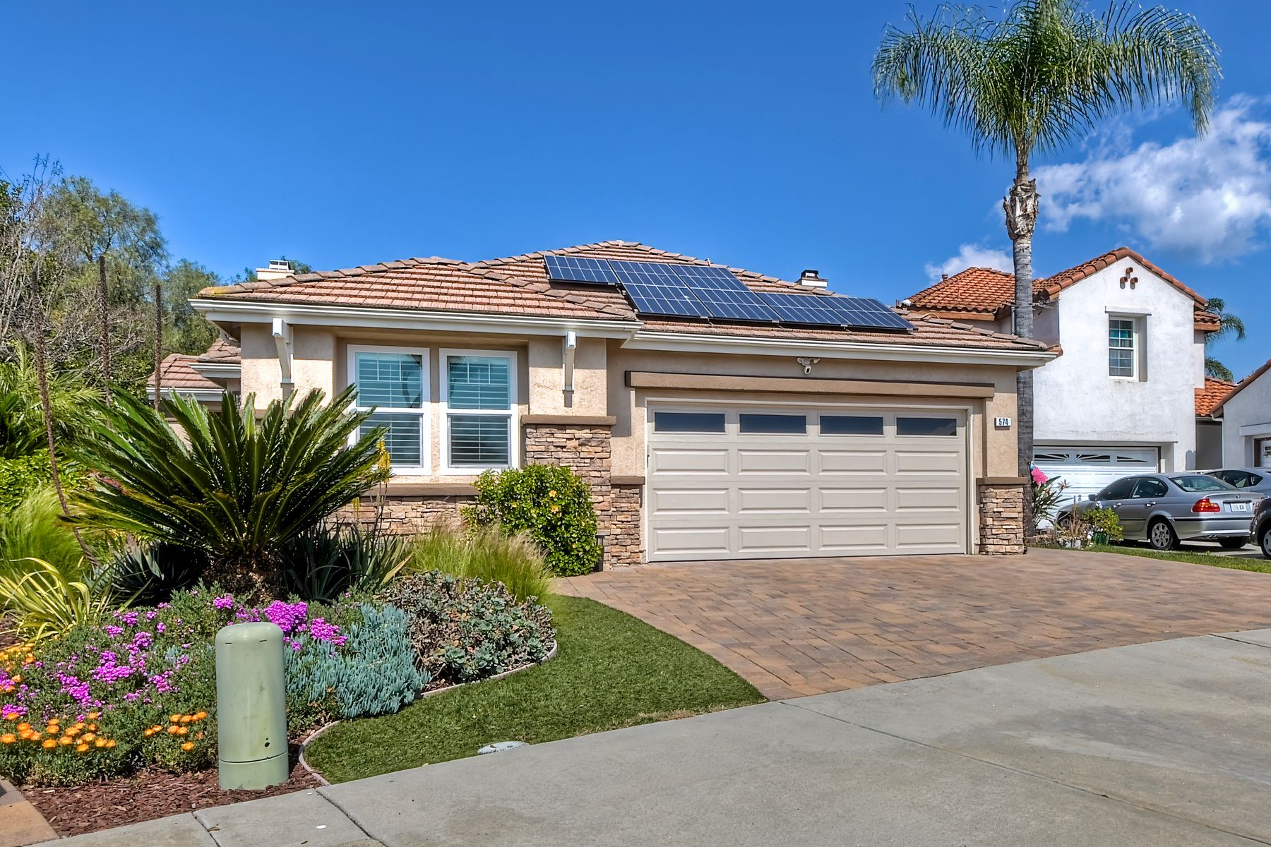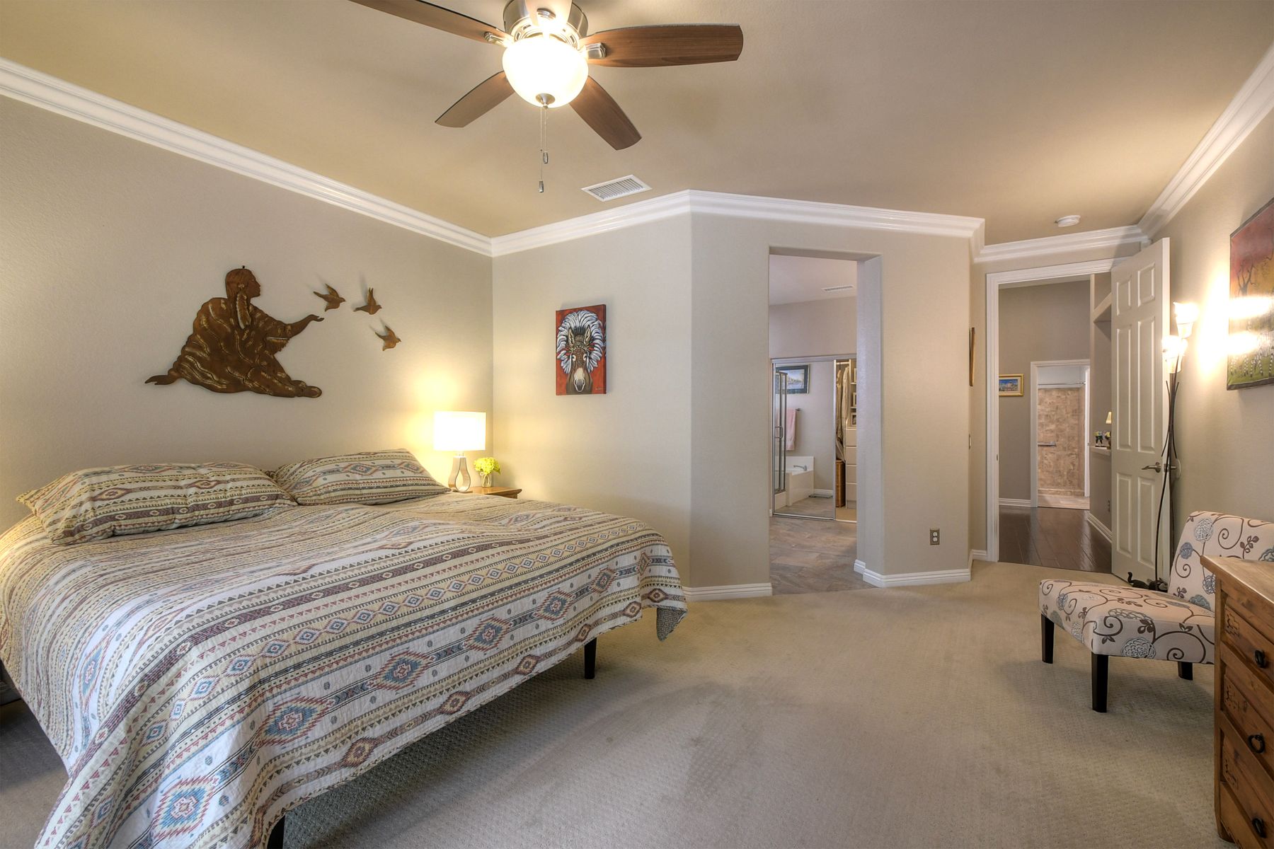 Welcome to this stunning and comfortable, golf view, 1-story home on a .27-acre pie-shaped lot, designed for modern luxury and panoramic fairway views. The gourmet kitchen was designed with gleaming granite countertops with endless space, stainless appliances, double ovens, a two-tiered breakfast bar, and custom pantry organizers. Seamlessly flowing from the family room, the home features hardwood floors, a cozy, stack-stone fireplace, LED lighting, crown molding, ceiling fans and plantation shutters. The primary suite is a private retreat with picture-window views, a walk-in closet with built-ins, and a spa-like bath with a soaking tub and step-in shower. The masterfully designed private backyard oasis is perfect for relaxing or entertaining, featuring an extended covered patio with a built-in kitchen and new BBQ, remote LED lighting, wired for sound, and a 220V-ready pad for a spa. Fully equipped with modern comforts: newer HVAC with air purification system, smart home tech (Nest/Ring). The 2-car garage has a new insulated garage door, is equipped with built-in cabinets, new water heater and overhead storage racks. Leased solar system and back up battery only $182/month which provides energy efficiency and more than covers the current electric bill. Be sure to also look at the 3D Virtual Tour in the link.