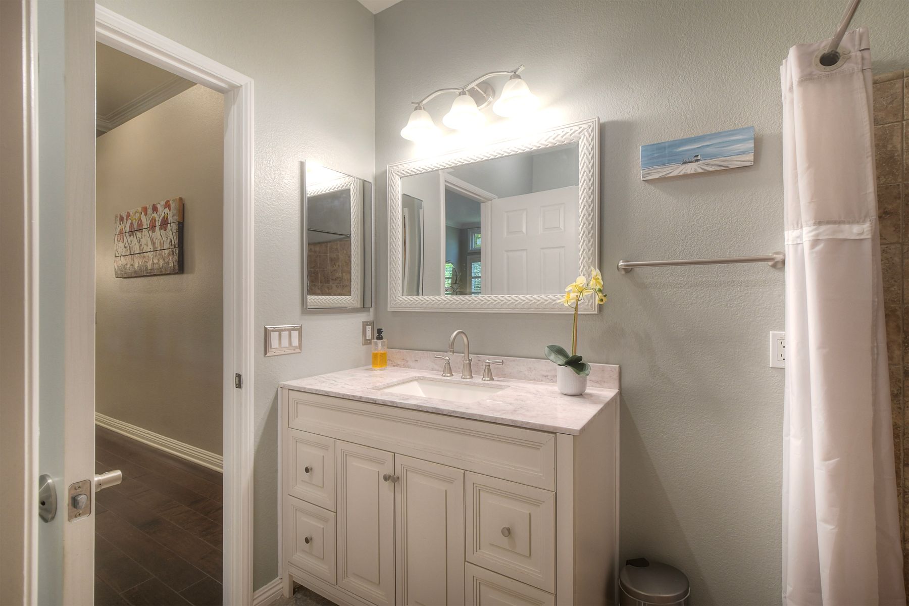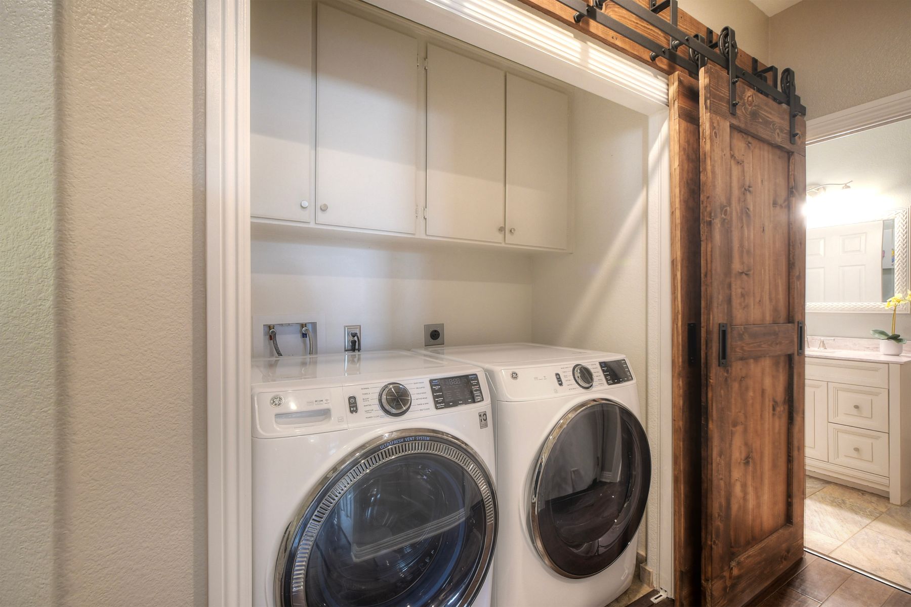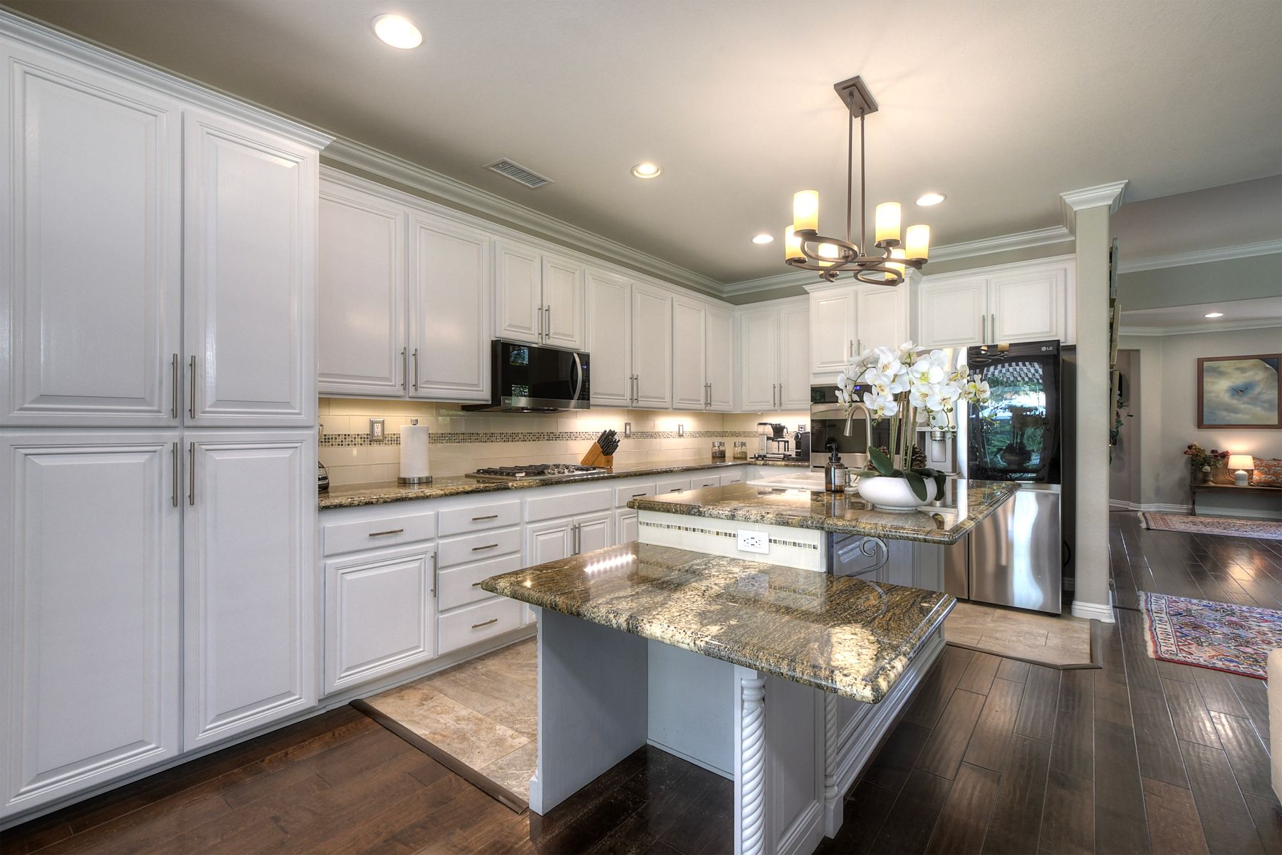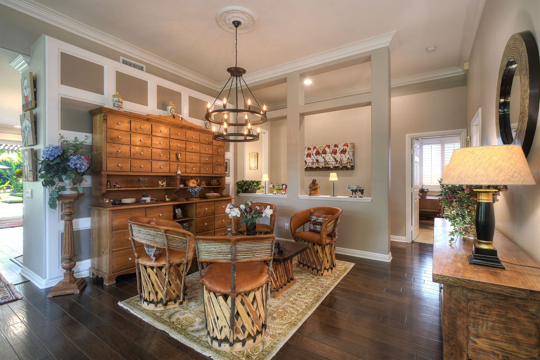 Welcome to this stunning and comfortable, golf view, 1-story home on a .27-acre pie-shaped lot, designed for modern luxury and panoramic fairway views. The gourmet kitchen was designed with gleaming granite countertops with endless space, stainless appliances, double ovens, a two-tiered breakfast bar, and custom pantry organizers. Seamlessly flowing from the family room, the home features hardwood floors, a cozy, stack-stone fireplace, LED lighting, crown molding, ceiling fans and plantation shutters. The primary suite is a private retreat with picture-window views, a walk-in closet with built-ins, and a spa-like bath with a soaking tub and step-in shower. The masterfully designed private backyard oasis is perfect for relaxing or entertaining, featuring an extended covered patio with a built-in kitchen and new BBQ, remote LED lighting, wired for sound, and a 220V-ready pad for a spa. Fully equipped with modern comforts: newer HVAC with air purification system, smart home tech (Nest/Ring). The 2-car garage has a new insulated garage door, is equipped with built-in cabinets, new water heater and overhead storage racks. Leased solar system and back up battery only $182/month which provides energy efficiency and more than covers the current electric bill. Be sure to also look at the 3D Virtual Tour in the link.