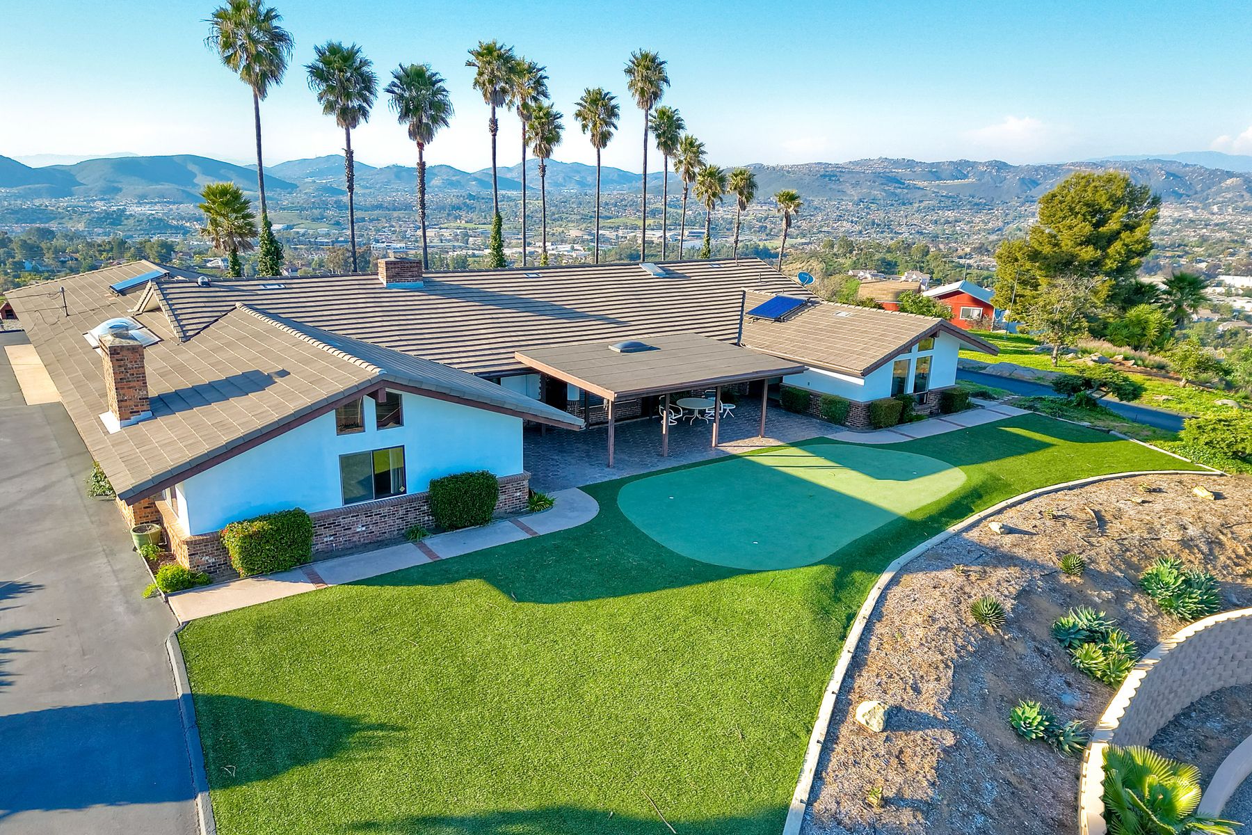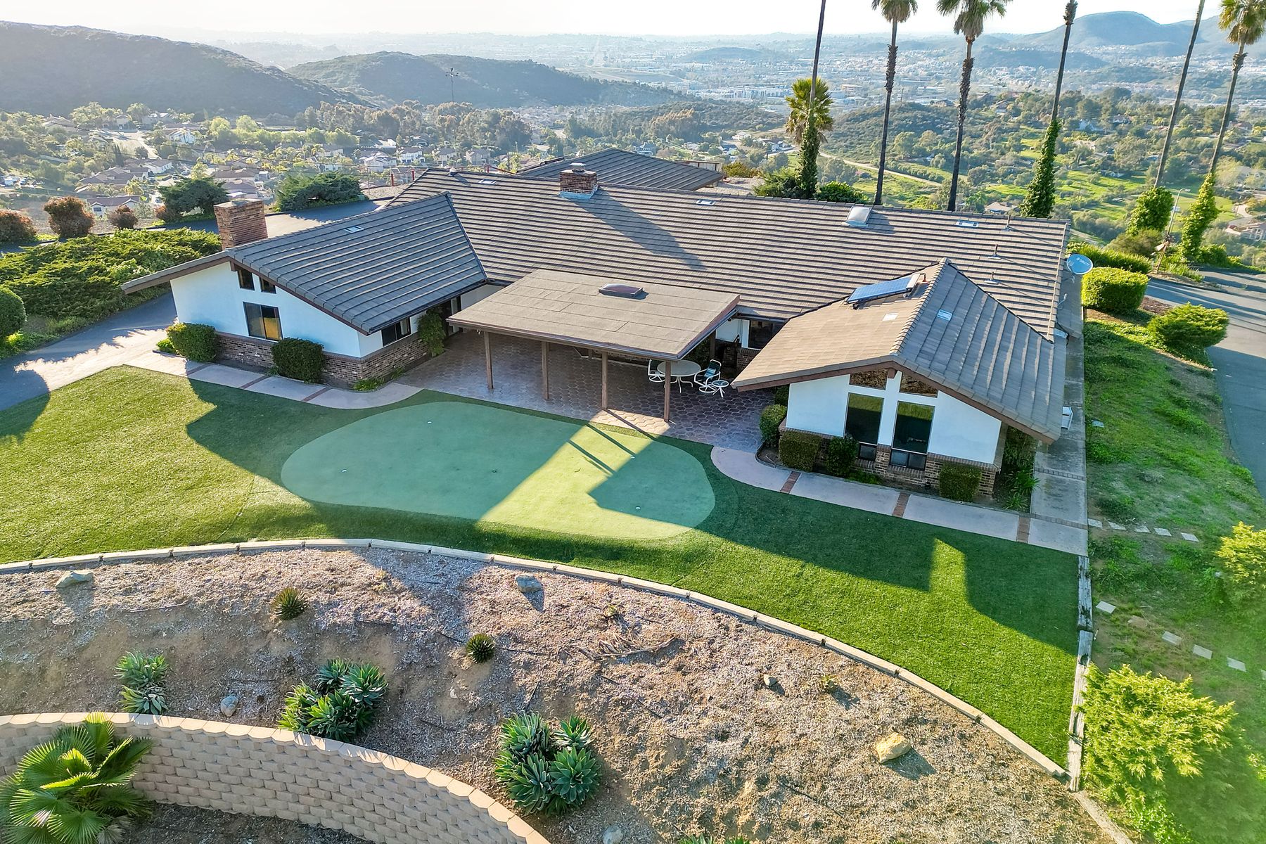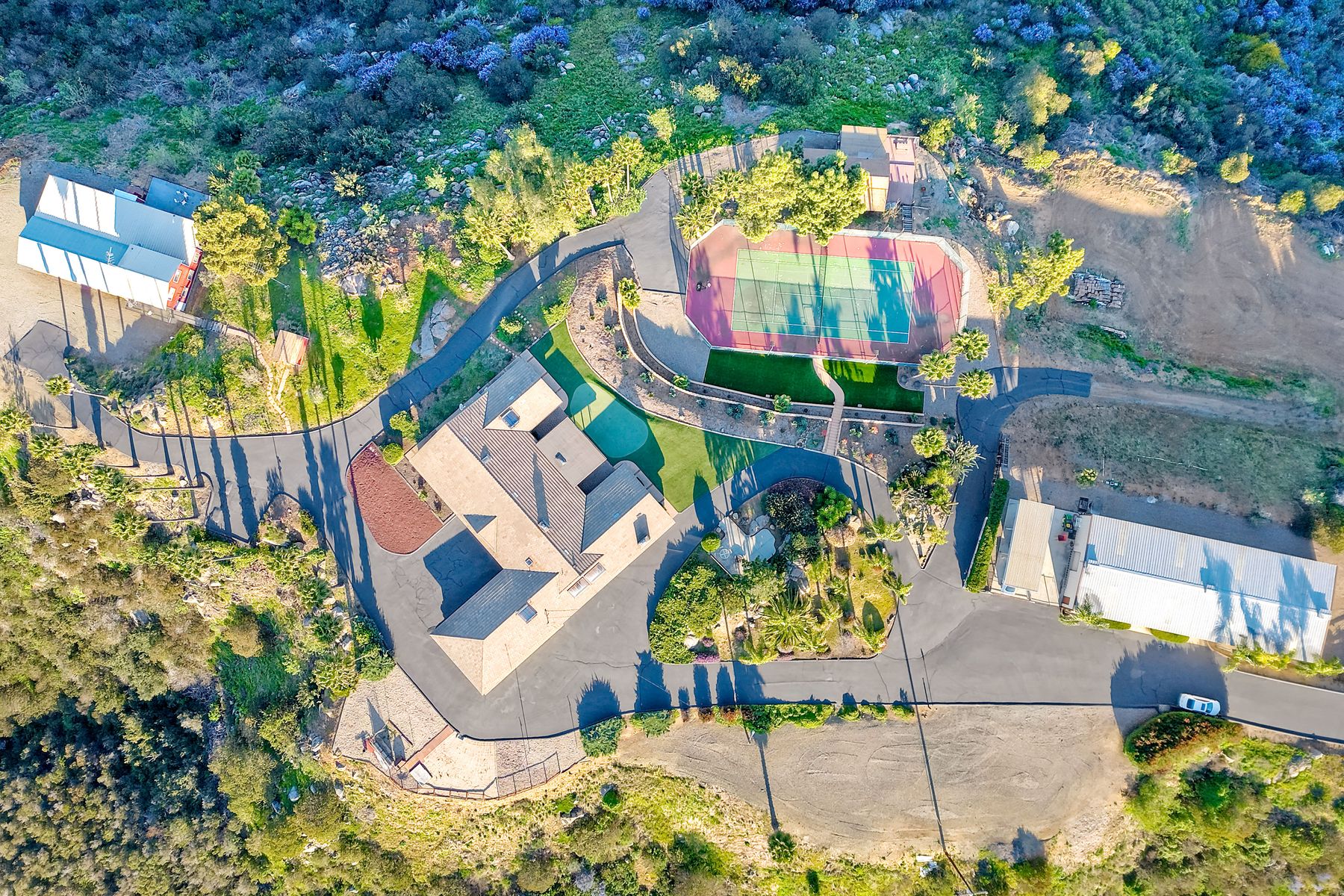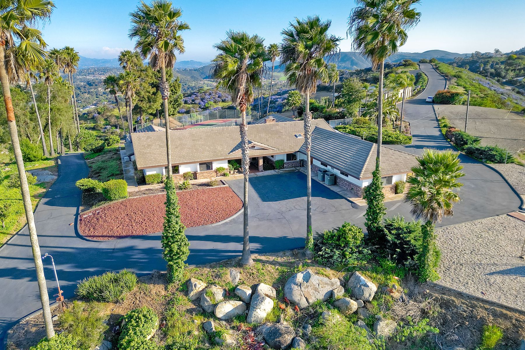 HELICOPTER VIEWS! Magnificent views of North San Diego county. City lights to the ocean! Unique multi-parcel property with ranch style home. Large living/dining/game rooms for entertaining. Multi-car, roll-up door workshop. Lighted tennis court and practice putting green. Property has accommodated guests, parties, weddings, hobbies and more. Gated entry. Freeway close to Hwy. 78, I-15 (San Diego, San Marcos, Escondido). Convenient to Cal State San Marcos and Palomar Hospital. Beautiful sunset views. Lots of possibilities!
