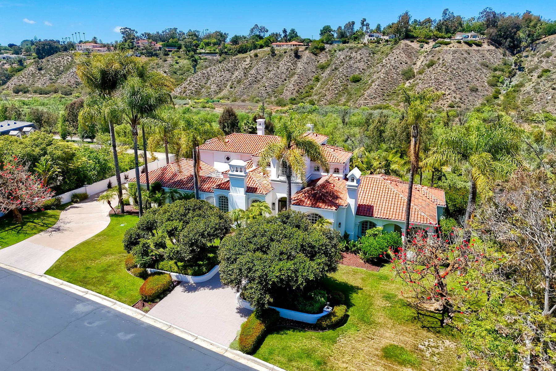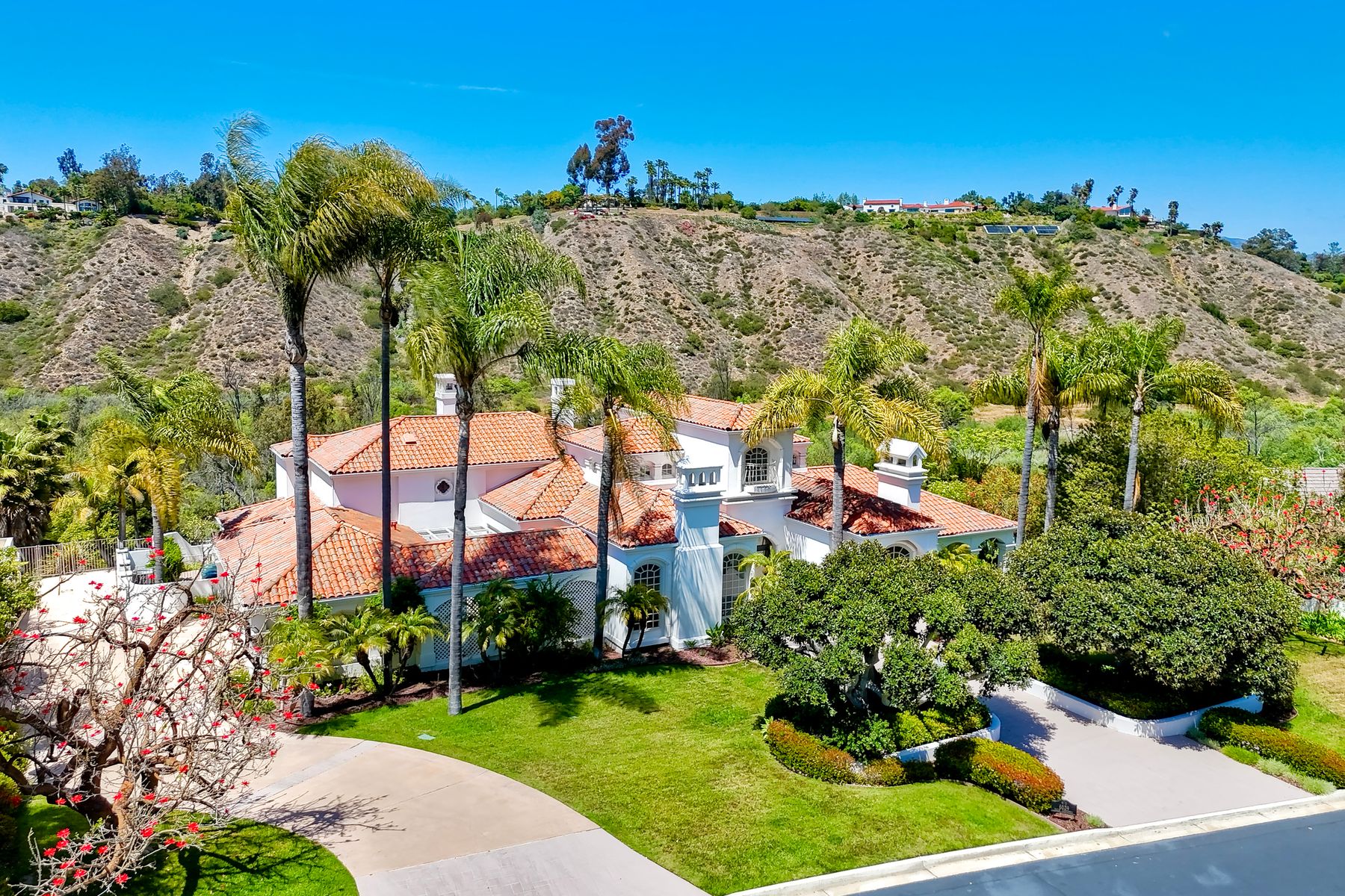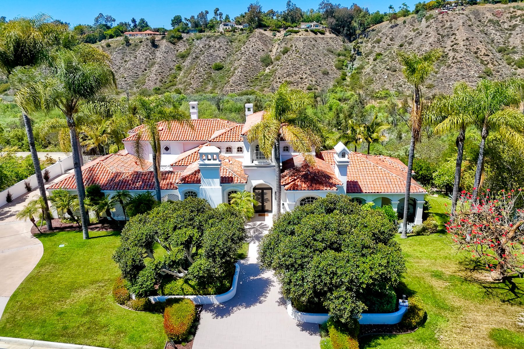 Modern luxury meets Mediterranean charm in this stunning Fairbanks Ranch estate. Perched on over two private acres, this completely renovated home offers striking architecture and sweeping panoramic views of the San Dieguito River Valley and the mountains beyond. Step through the elegant arched doorway and into a bright, open design featuring soaring ceilings, wide-plank hardwood flooring, and natural light pouring through expansive windows. The brand-new kitchen is a showstopper—boasting cascading quartzite countertops, built-in stainless steel appliances, and custom cabinetry. Each bedroom includes its own full en-suite bathroom, offering comfort and privacy throughout. Four fireplaces add warmth and character to the home’s inviting ambiance. The entire second floor is dedicated to the luxurious primary suite, complete with a private balcony, dual-sided fireplace, soaking tub, walk-in shower with frameless glass, an expansive walk-in closet, and a private sauna. Fairbanks Ranch, one of Rancho Santa Fe’s premier guard-gated communities, is renowned for its luxury estates, world-class amenities, and vibrant lifestyle. Residents enjoy 24-hour security, a top-tier equestrian center, tennis and pickleball courts, and scenic walking and hiking trails that wind through lush, landscaped grounds. This home enjoys the coveted north side of the community.