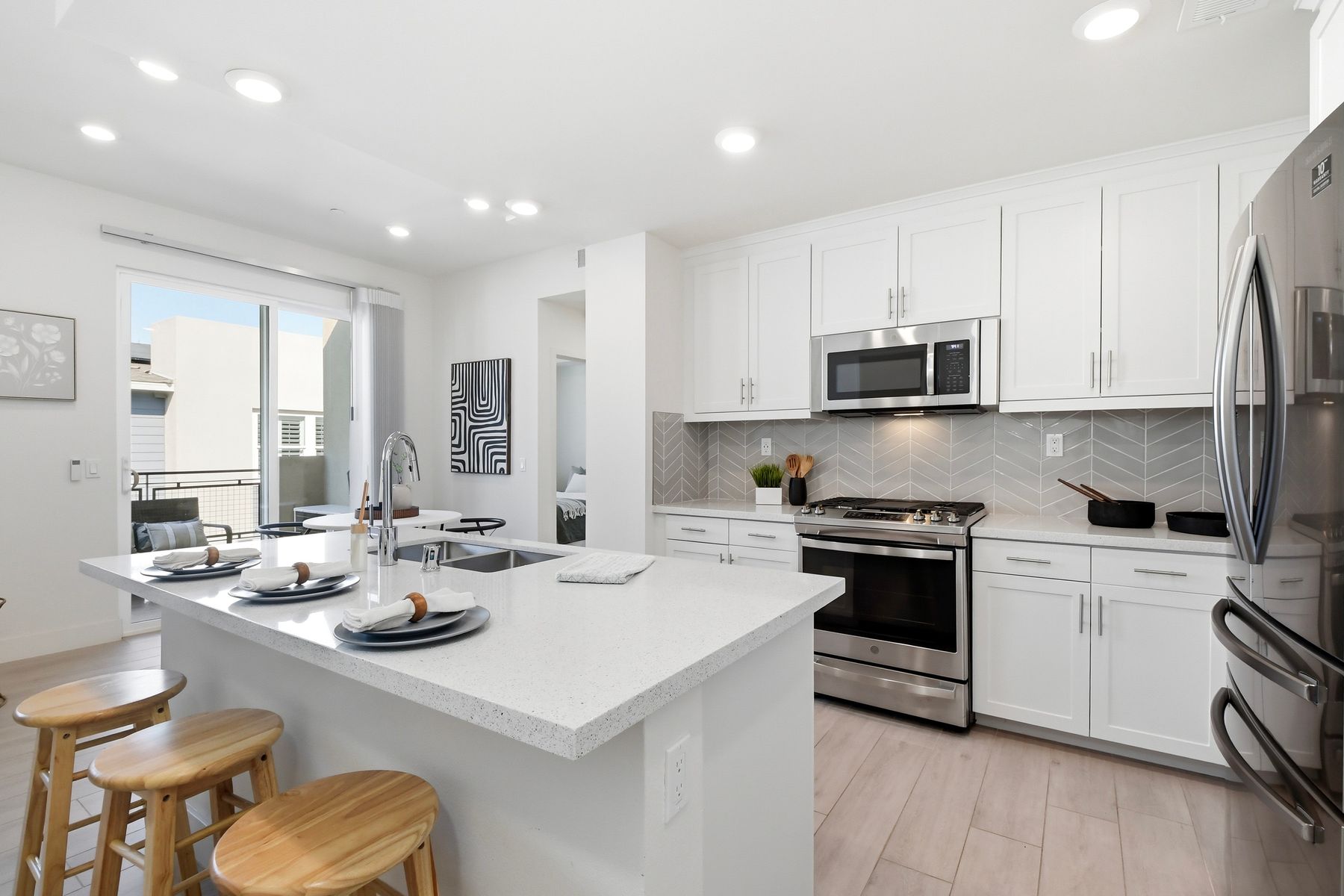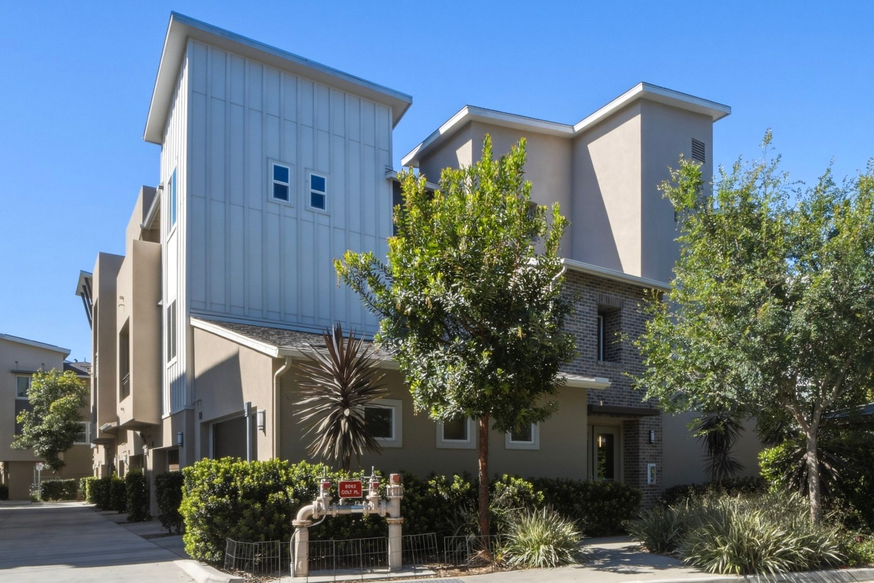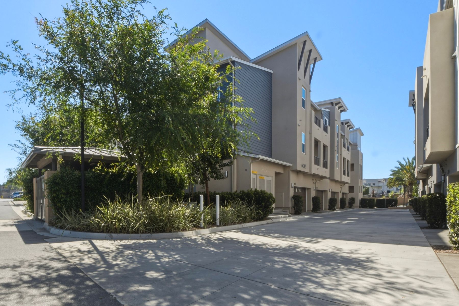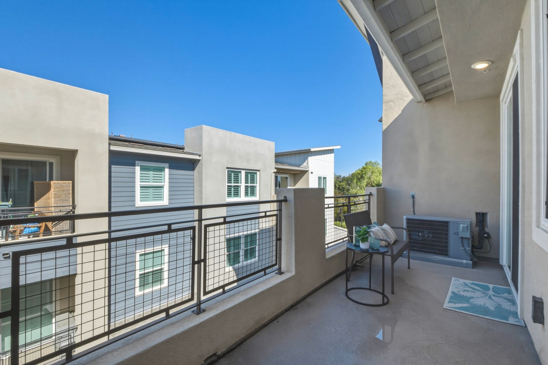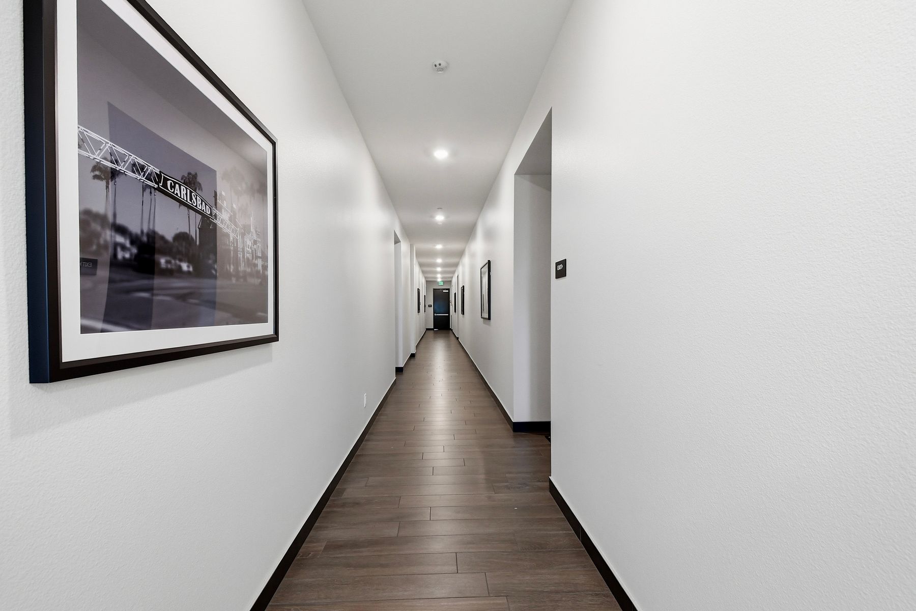 Single level luxury living at the penthouse level - elevator access. Built in 2020 this stacked low-rise building are 'The 'Flats.' An exclusive limited number of units within Kensington At The Square Bressi Ranch, The Flats offer elevator access from garage level up to two floors of stacked units. This top floor pristine unit is a fully upgraded smart home. The split floor plan adds privacy with each bedroom suite on opposite sides of the main living space. Thoughtfully designed with a spacious great room featuring warm wood like tile flooring complemented with solid wood white shaker cabinetry. Neutral quartz countertops in kitchen and baths. Enjoy the private covered balcony with western exposure where natural light flows seamlessly from outside to inside. Two extra large bedrooms have generous closet storage and luxurious extra plush carpeting. Primary bedroom features a large walk in closet. Stacked interior laundry center along side a large walk in storage closet. The building has an external secure lobby entrance with a My2N intercom system to allow for guest and delivery access from a smartphone application. Weekly janitorial service. Paid solar. Oversized 2-car garage including a work bench, storage cabinets and 5 overhead storage racks. Garage has been equipped with e-car charging wiring - ready to install a car charger device of your choice. The garage is at entry level with an interior hallway that leads to an elevator up the two floors of stacked units. Absolutely exquisite and unique lifestyle located in the heart of Bressi Square and Bressi Town Center - all the convenience of shopping, dining, entertainment and more! Community resort pool, bocce ball court, BBQ's, picnic tables and playground to enjoy. Minutes from Carlsbad beaches, top notch luxury golf resorts, LegoLand, outdoor outlet shopping mall, nature preserves and lagoons. Enjoy the Carlsbad lifestyle in this luxury newer construction Flat.