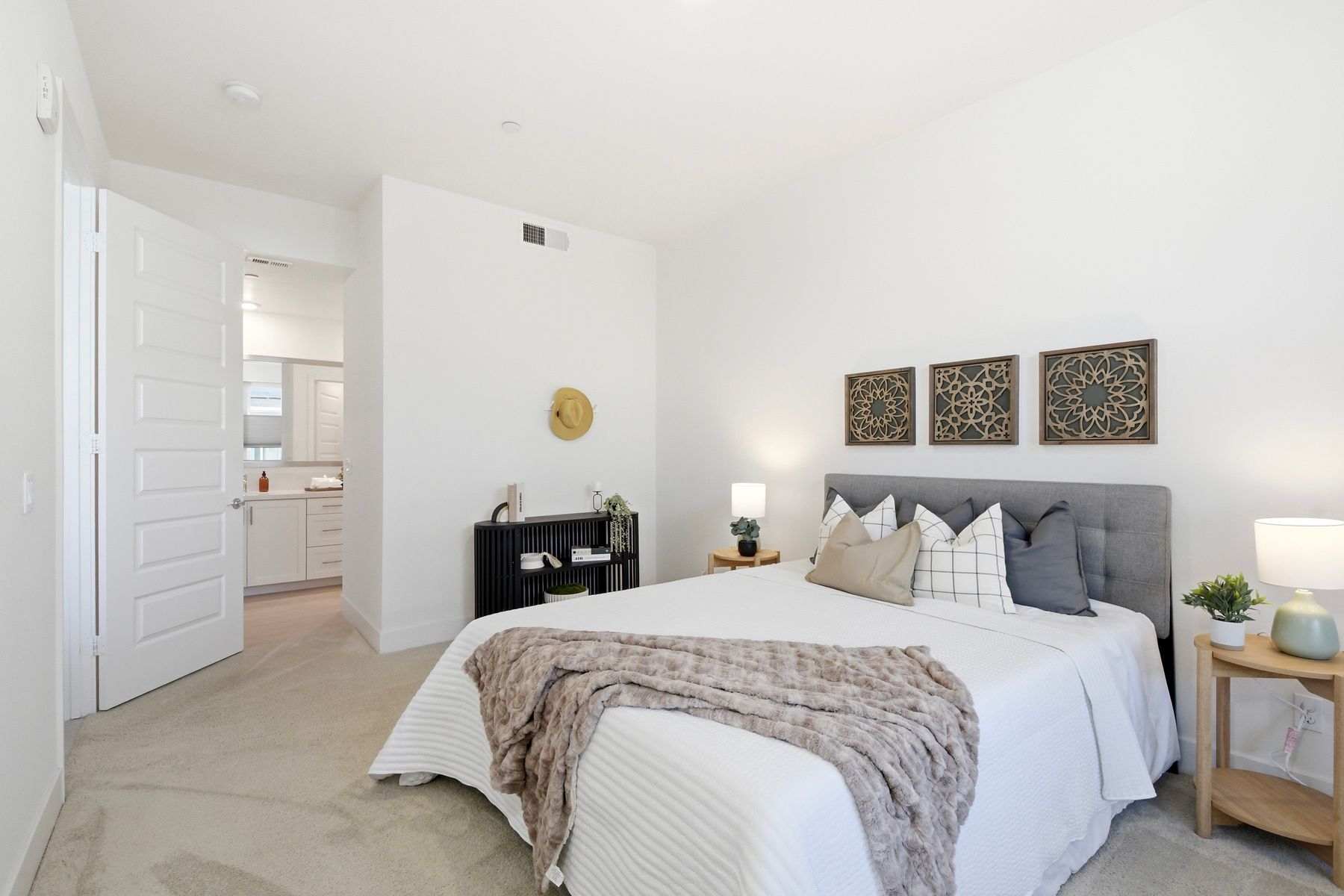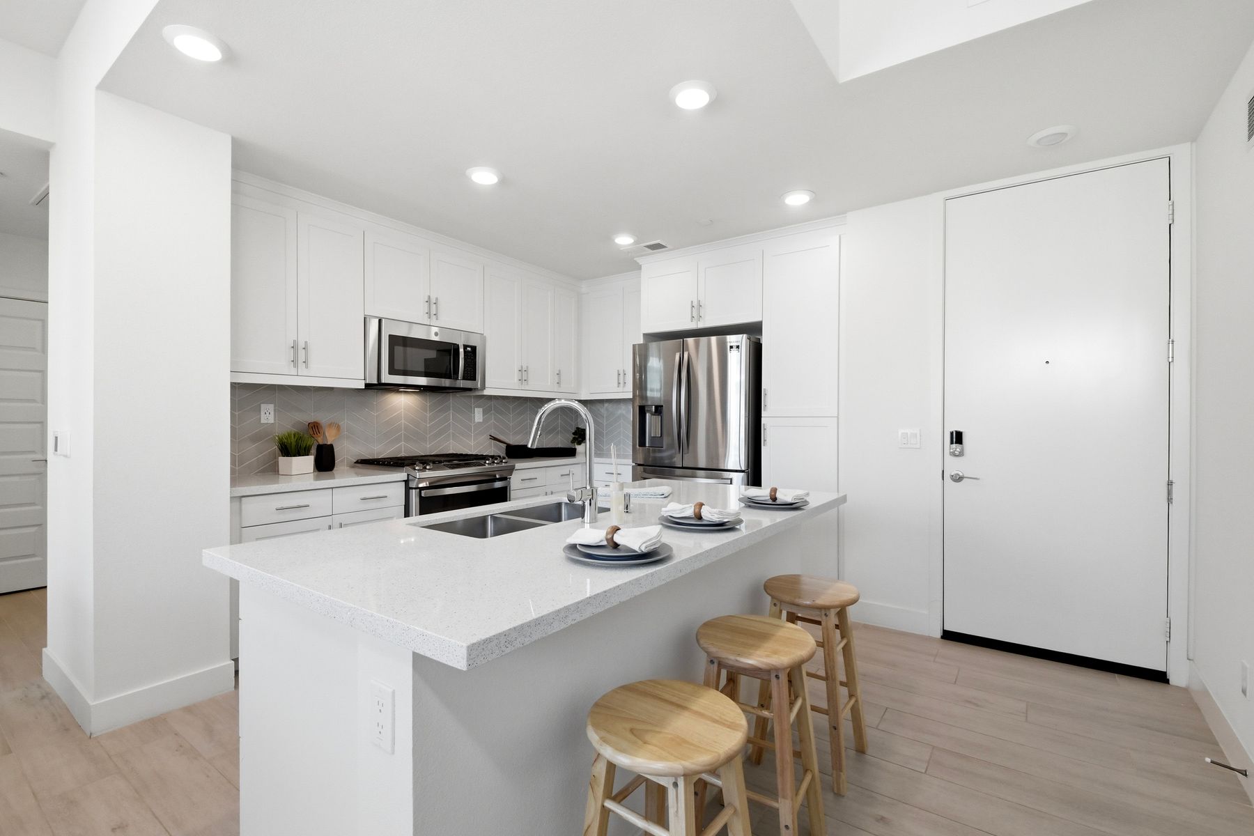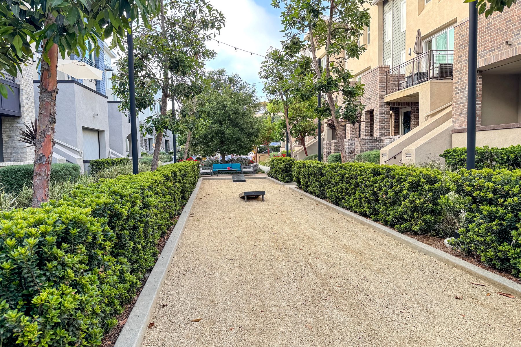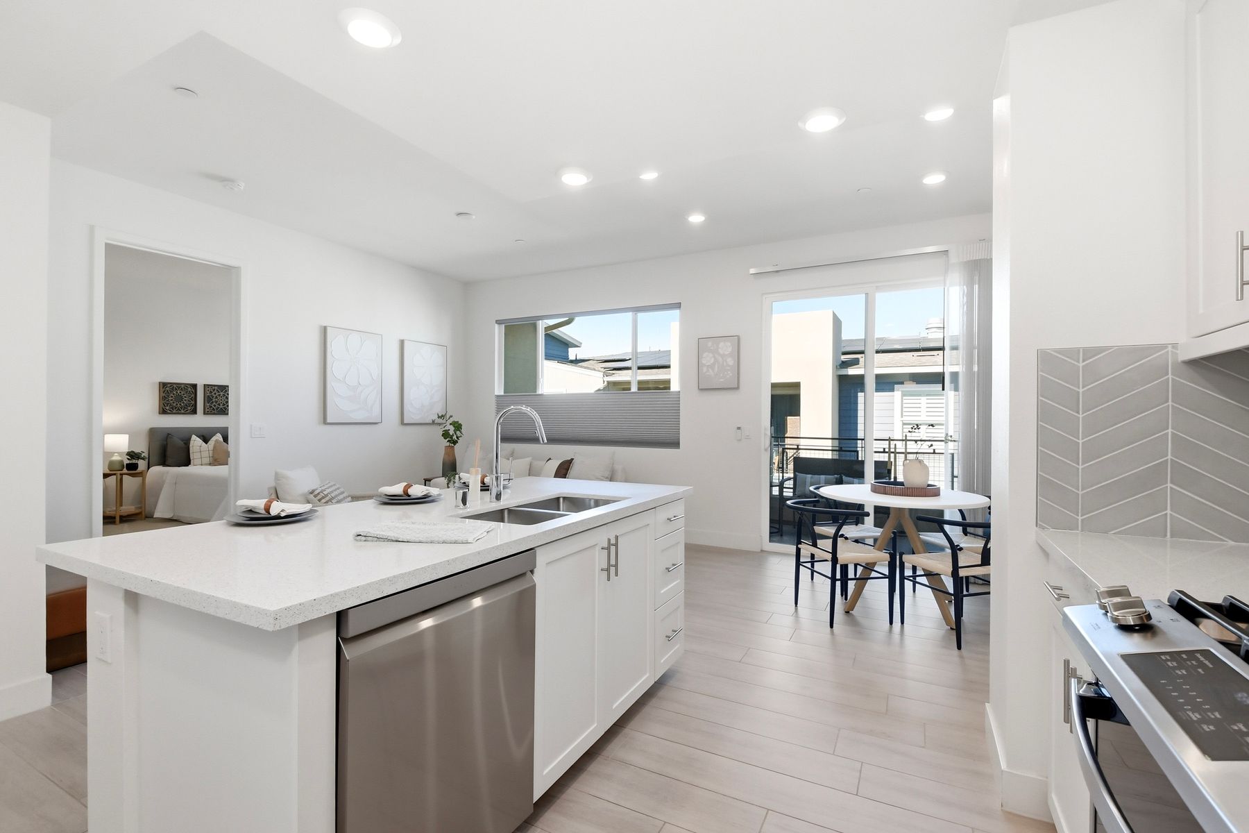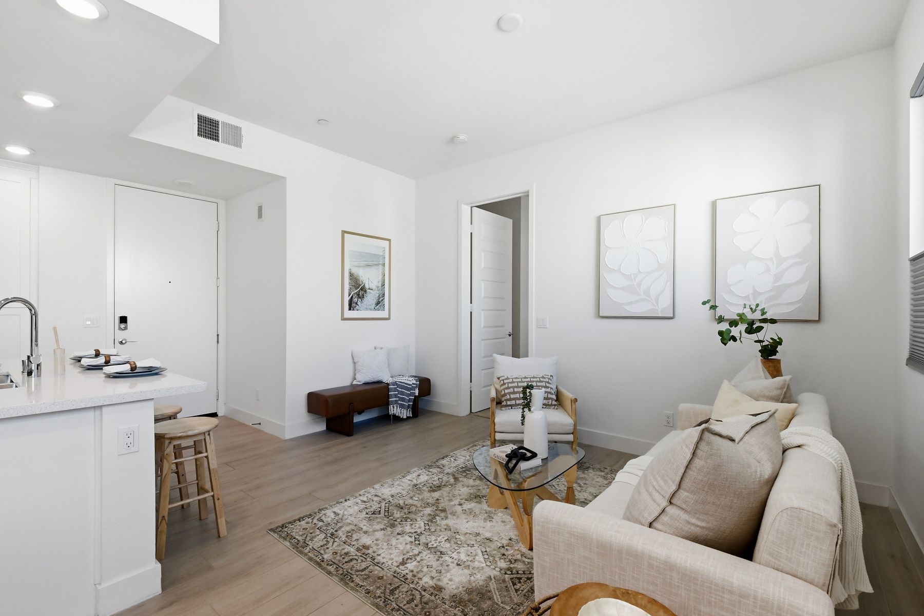 Single level luxury living at the penthouse level - elevator access. Built in 2020 this stacked low-rise building are 'The 'Flats.' An exclusive limited number of units within Kensington At The Square Bressi Ranch, The Flats offer elevator access from garage level up to two floors of stacked units. This top floor pristine unit is a fully upgraded smart home. The split floor plan adds privacy with each bedroom suite on opposite sides of the main living space. Thoughtfully designed with a spacious great room featuring warm wood like tile flooring complemented with solid wood white shaker cabinetry. Neutral quartz countertops in kitchen and baths. Enjoy the private covered balcony with western exposure where natural light flows seamlessly from outside to inside. Two extra large bedrooms have generous closet storage and luxurious extra plush carpeting. Primary bedroom features a large walk in closet. Stacked interior laundry center along side a large walk in storage closet. The building has an external secure lobby entrance with a My2N intercom system to allow for guest and delivery access from a smartphone application. Weekly janitorial service. Paid solar. Oversized 2-car garage including a work bench, storage cabinets and 5 overhead storage racks. Garage has been equipped with e-car charging wiring - ready to install a car charger device of your choice. The garage is at entry level with an interior hallway that leads to an elevator up the two floors of stacked units. Absolutely exquisite and unique lifestyle located in the heart of Bressi Square and Bressi Town Center - all the convenience of shopping, dining, entertainment and more! Community resort pool, bocce ball court, BBQ's, picnic tables and playground to enjoy. Minutes from Carlsbad beaches, top notch luxury golf resorts, LegoLand, outdoor outlet shopping mall, nature preserves and lagoons. Enjoy the Carlsbad lifestyle in this luxury newer construction Flat.