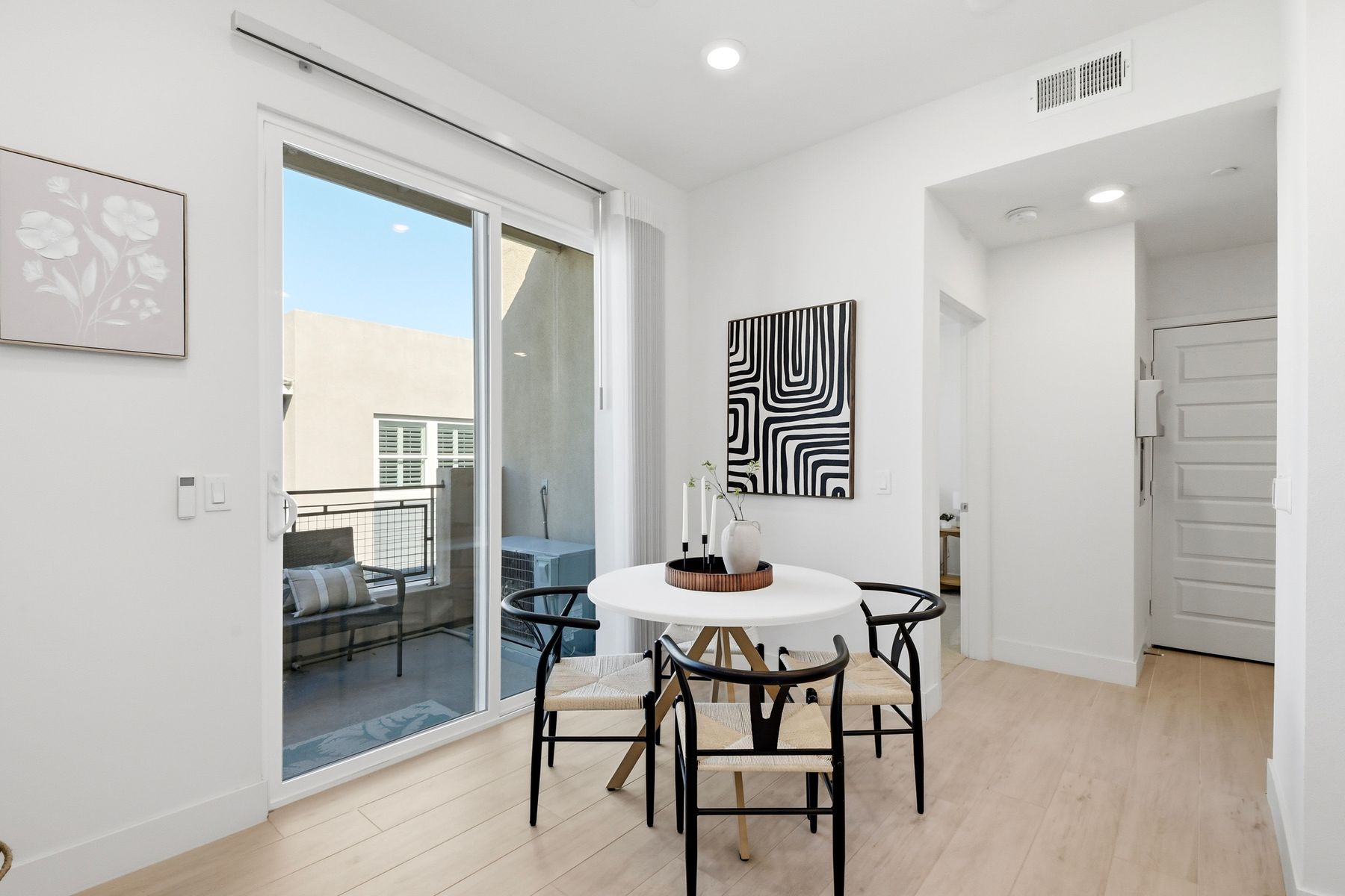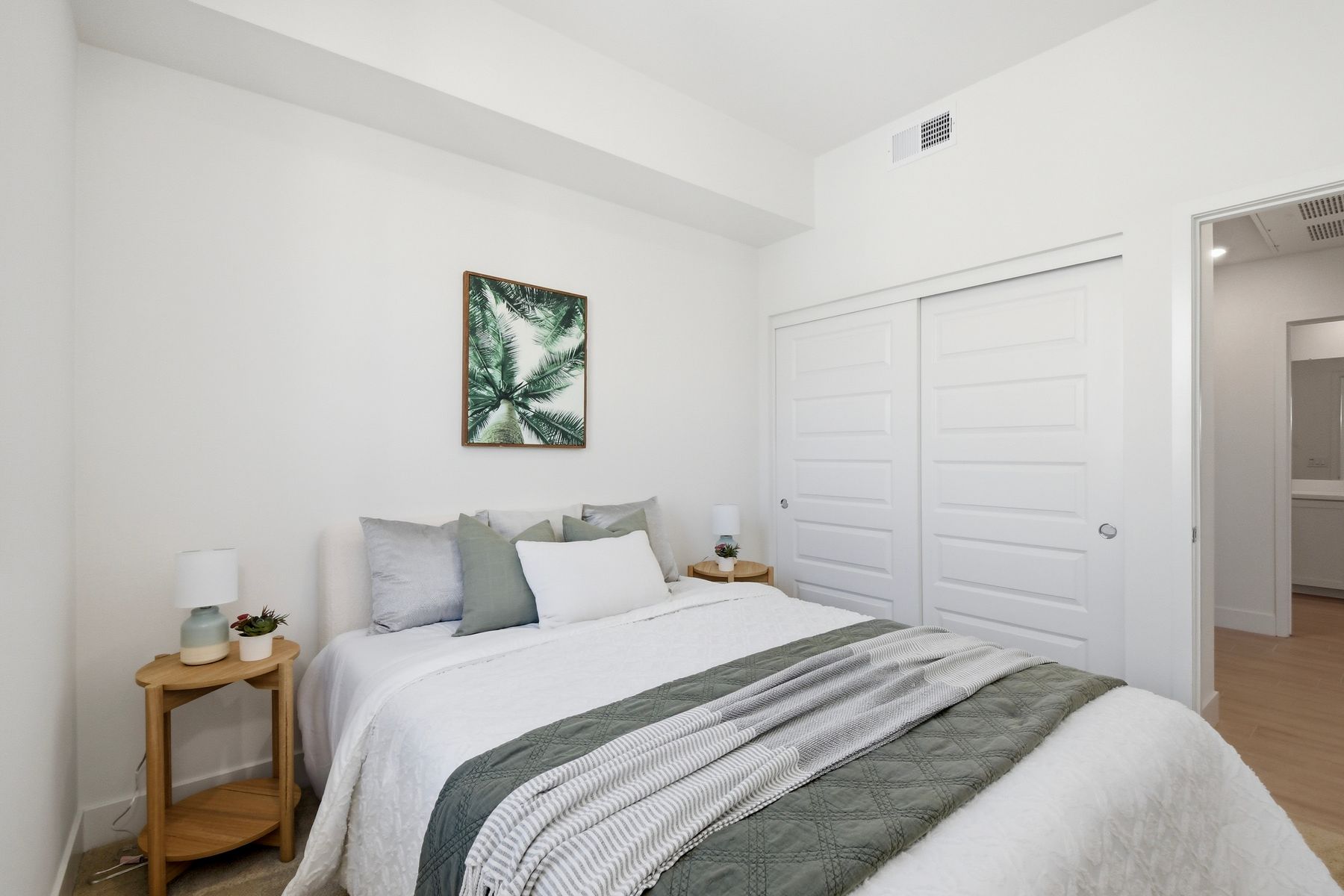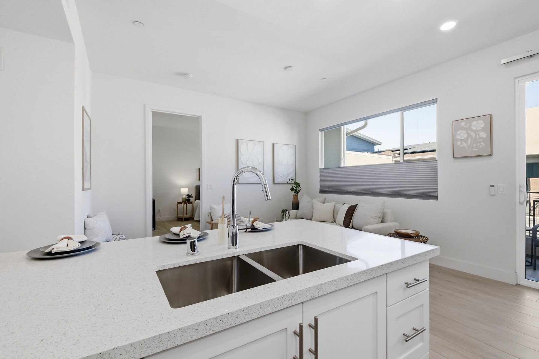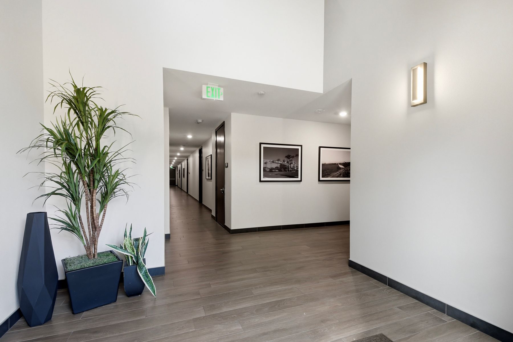 Single level luxury living at the penthouse level - elevator access. Built in 2020 this stacked low-rise building are 'The 'Flats.' An exclusive limited number of units within Kensington At The Square Bressi Ranch, The Flats offer elevator access from garage level up to two floors of stacked units. This top floor pristine unit is a fully upgraded smart home. The split floor plan adds privacy with each bedroom suite on opposite sides of the main living space. Thoughtfully designed with a spacious great room featuring warm wood like tile flooring complemented with solid wood white shaker cabinetry. Neutral quartz countertops in kitchen and baths. Enjoy the private covered balcony with western exposure where natural light flows seamlessly from outside to inside. Two extra large bedrooms have generous closet storage and luxurious extra plush carpeting. Primary bedroom features a large walk in closet. Stacked interior laundry center along side a large walk in storage closet. The building has an external secure lobby entrance with a My2N intercom system to allow for guest and delivery access from a smartphone application. Weekly janitorial service. Paid solar. Oversized 2-car garage including a work bench, storage cabinets and 5 overhead storage racks. Garage has been equipped with e-car charging wiring - ready to install a car charger device of your choice. The garage is at entry level with an interior hallway that leads to an elevator up the two floors of stacked units. Absolutely exquisite and unique lifestyle located in the heart of Bressi Square and Bressi Town Center - all the convenience of shopping, dining, entertainment and more! Community resort pool, bocce ball court, BBQ's, picnic tables and playground to enjoy. Minutes from Carlsbad beaches, top notch luxury golf resorts, LegoLand, outdoor outlet shopping mall, nature preserves and lagoons. Enjoy the Carlsbad lifestyle in this luxury newer construction Flat.