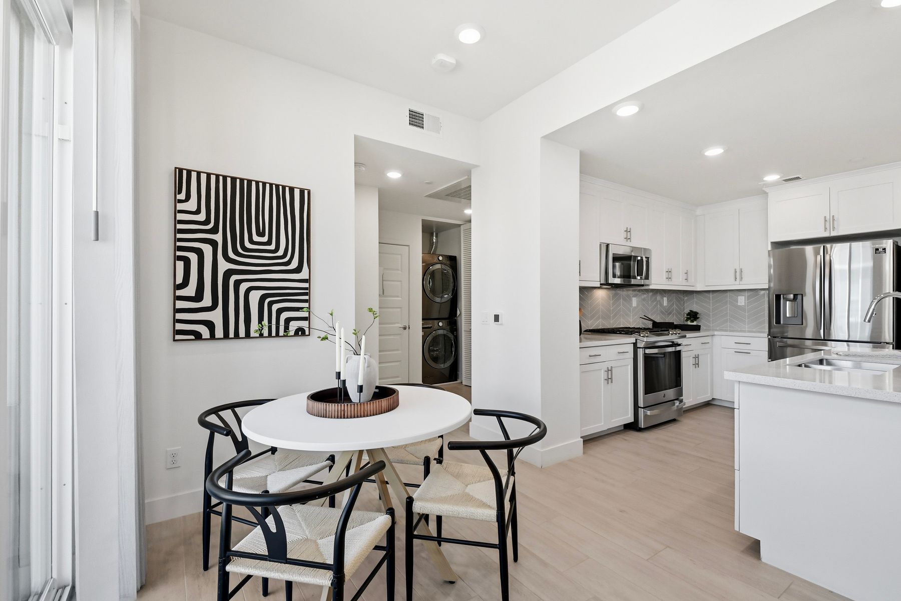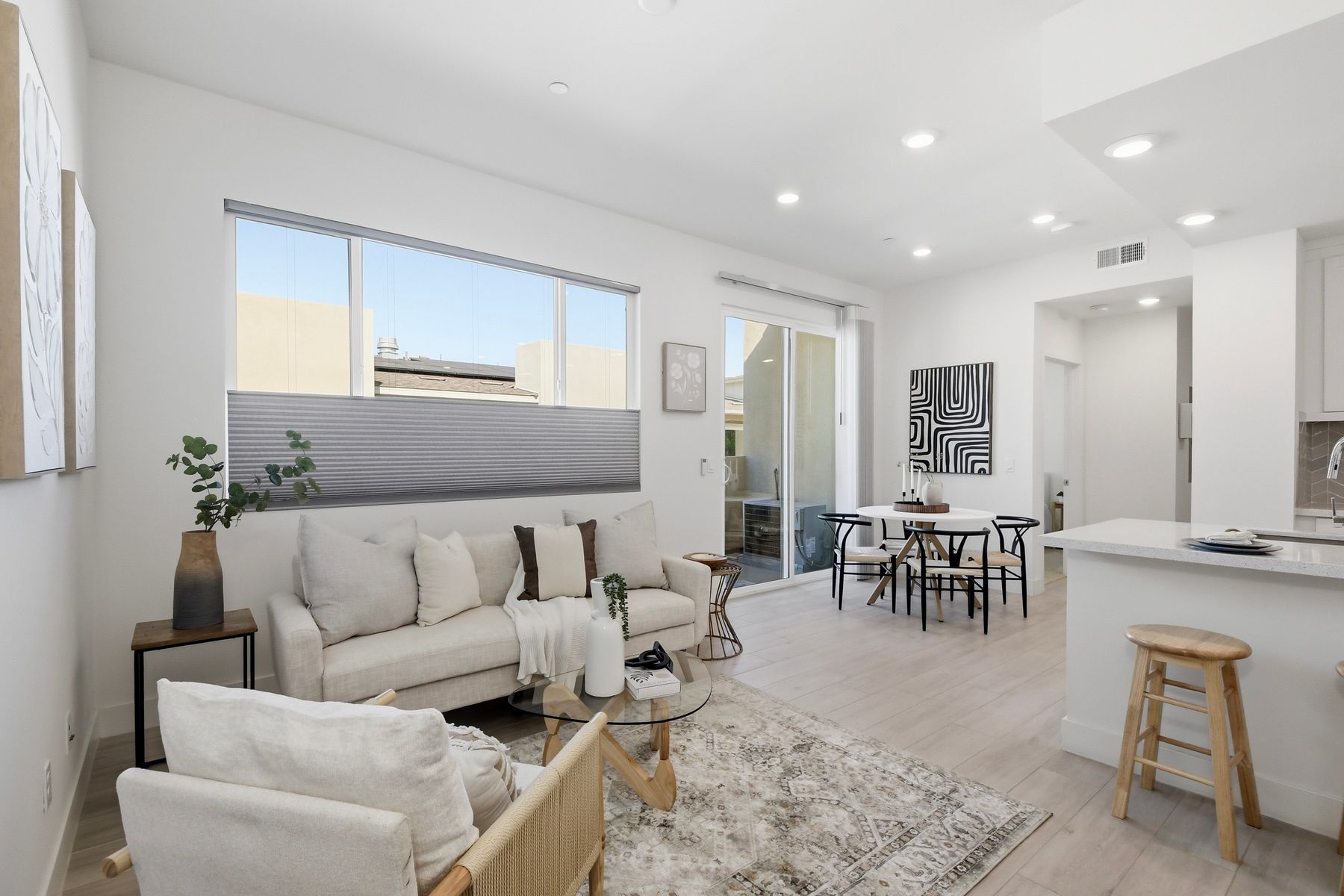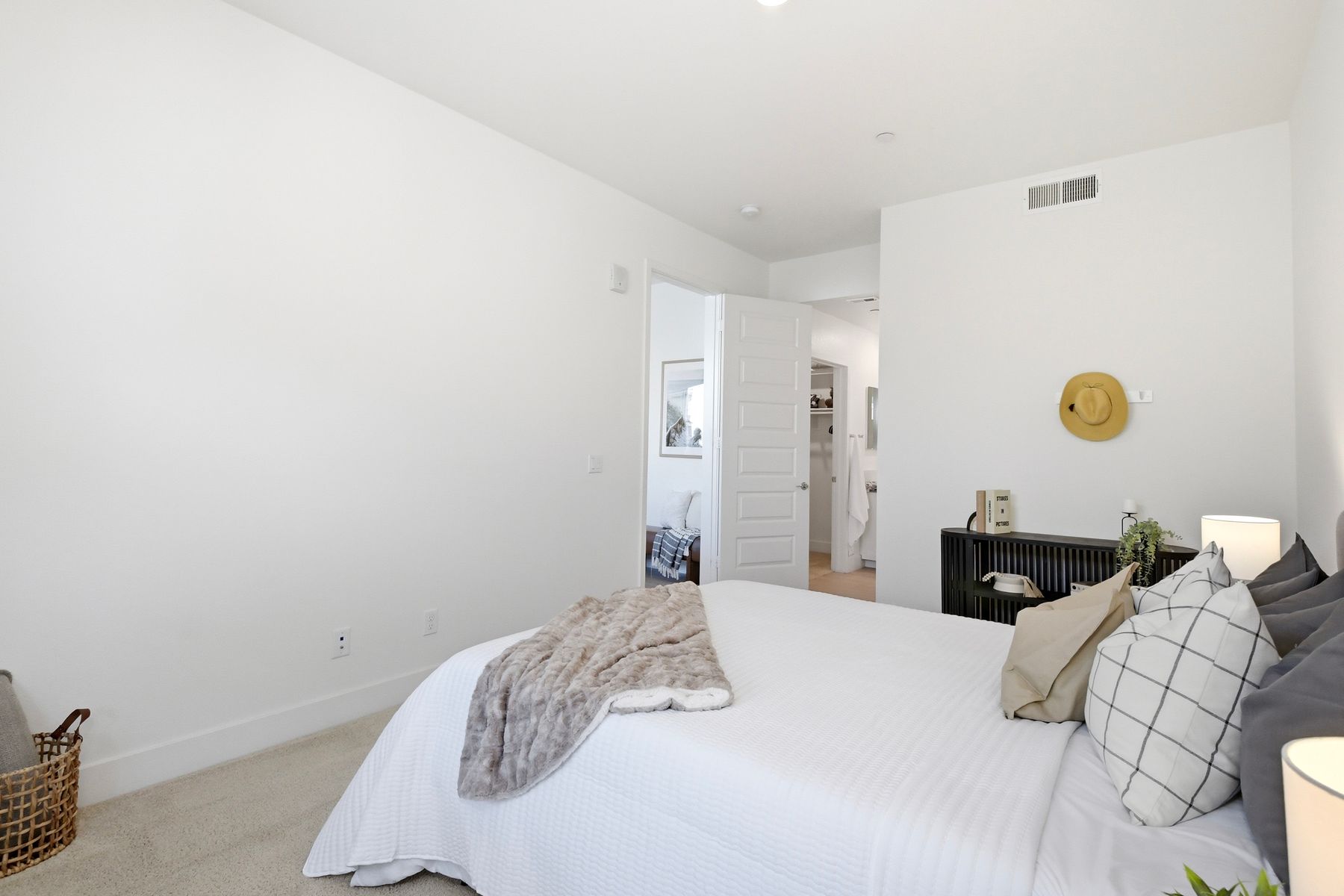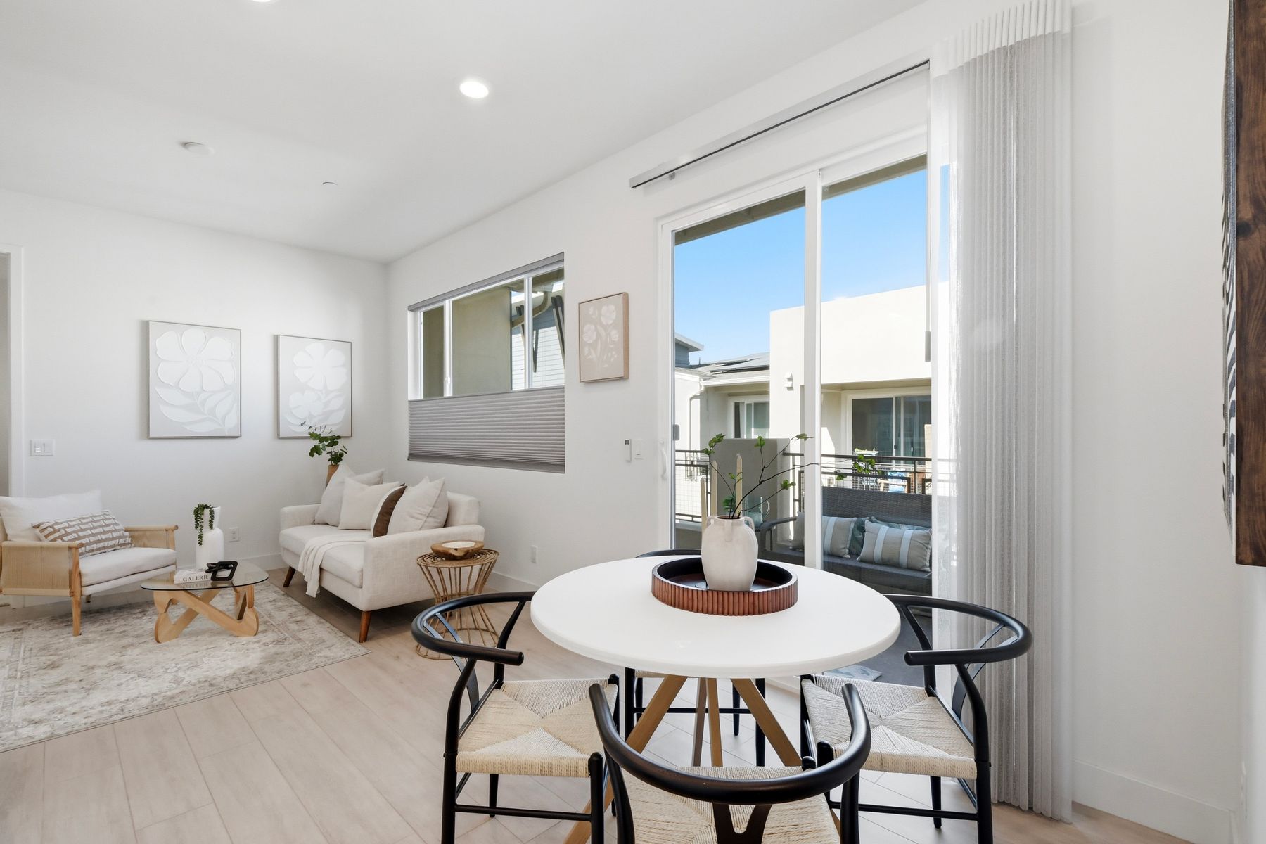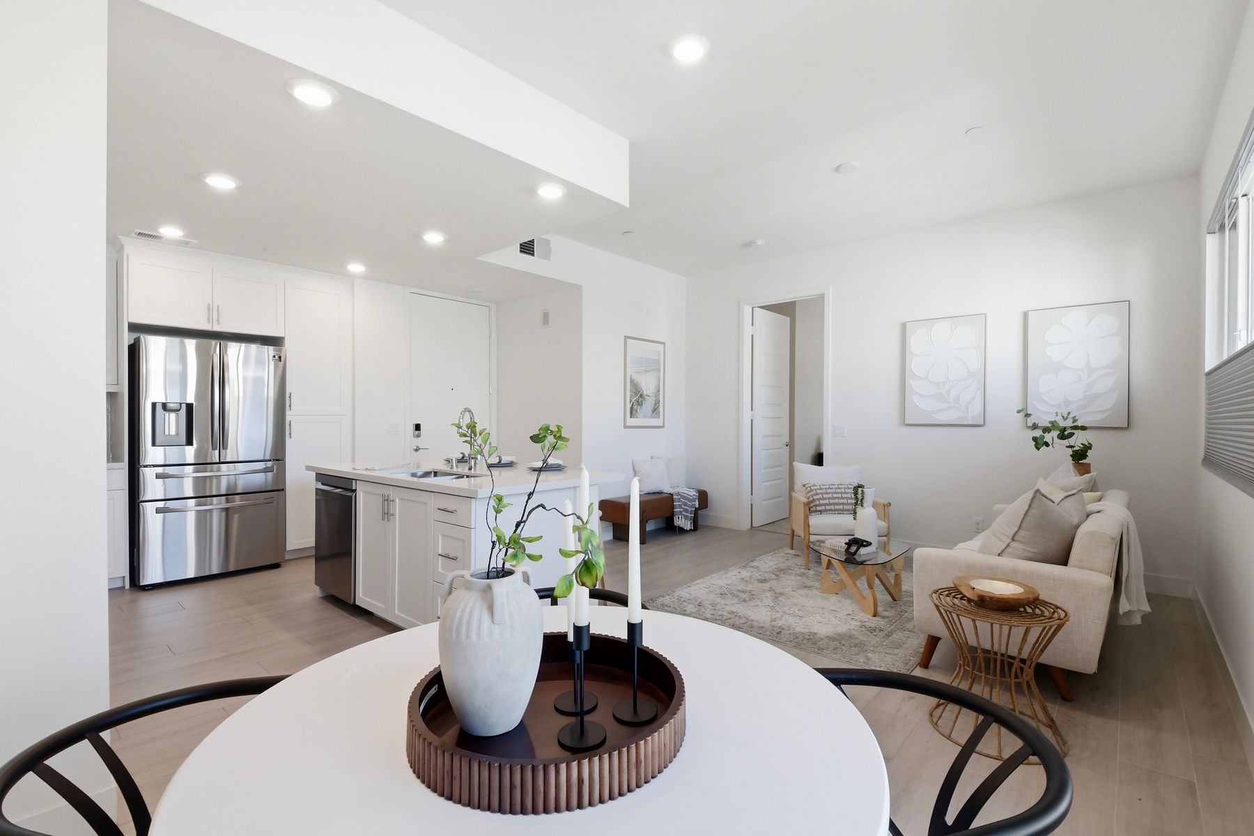 Single level luxury living at the penthouse level - elevator access. Built in 2020 this stacked low-rise building are 'The 'Flats.' An exclusive limited number of units within Kensington At The Square Bressi Ranch, The Flats offer elevator access from garage level up to two floors of stacked units. This top floor pristine unit is a fully upgraded smart home. The split floor plan adds privacy with each bedroom suite on opposite sides of the main living space. Thoughtfully designed with a spacious great room featuring warm wood like tile flooring complemented with solid wood white shaker cabinetry. Neutral quartz countertops in kitchen and baths. Enjoy the private covered balcony with western exposure where natural light flows seamlessly from outside to inside. Two extra large bedrooms have generous closet storage and luxurious extra plush carpeting. Primary bedroom features a large walk in closet. Stacked interior laundry center along side a large walk in storage closet. The building has an external secure lobby entrance with a My2N intercom system to allow for guest and delivery access from a smartphone application. Weekly janitorial service. Paid solar. Oversized 2-car garage including a work bench, storage cabinets and 5 overhead storage racks. Garage has been equipped with e-car charging wiring - ready to install a car charger device of your choice. The garage is at entry level with an interior hallway that leads to an elevator up the two floors of stacked units. Absolutely exquisite and unique lifestyle located in the heart of Bressi Square and Bressi Town Center - all the convenience of shopping, dining, entertainment and more! Community resort pool, bocce ball court, BBQ's, picnic tables and playground to enjoy. Minutes from Carlsbad beaches, top notch luxury golf resorts, LegoLand, outdoor outlet shopping mall, nature preserves and lagoons. Enjoy the Carlsbad lifestyle in this luxury newer construction Flat.