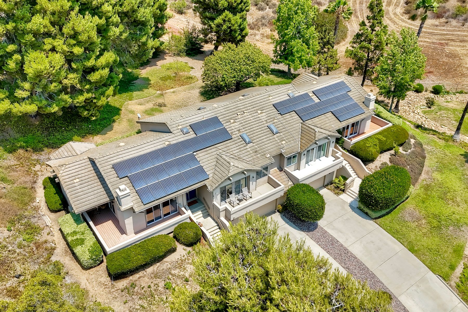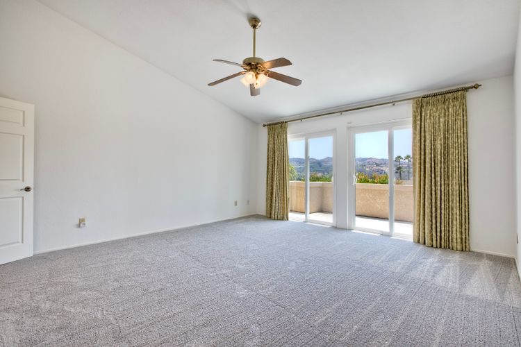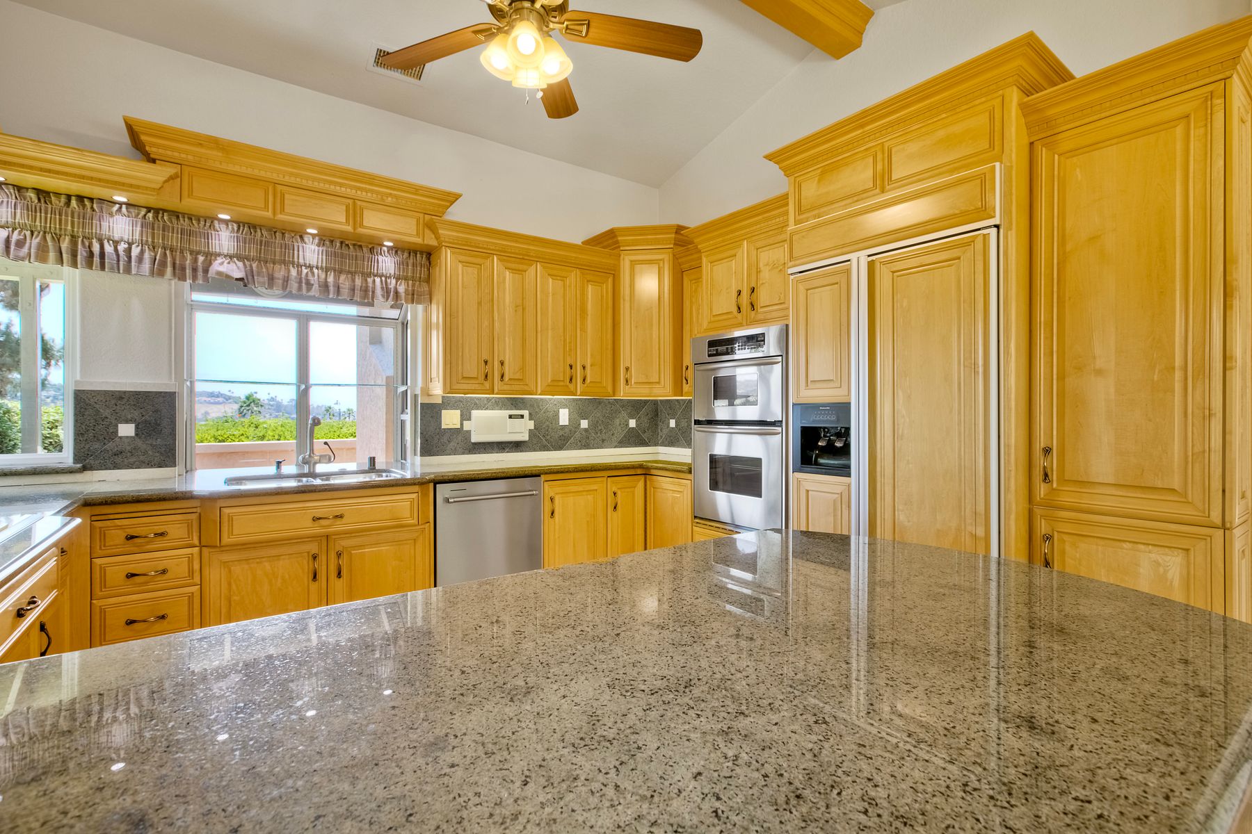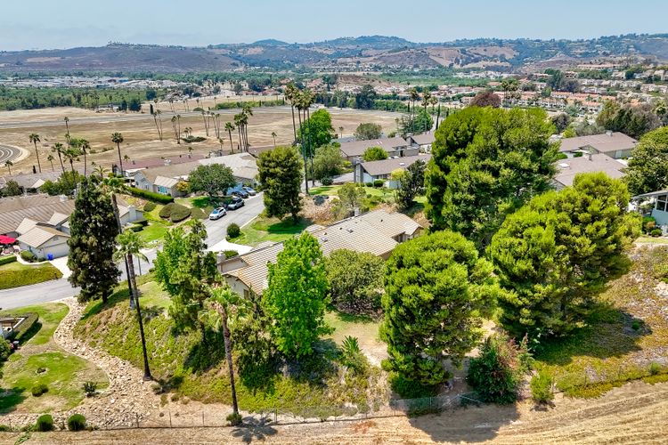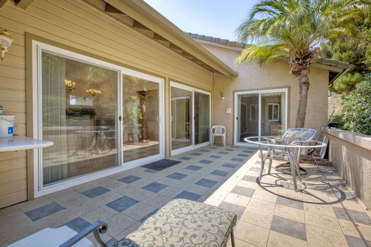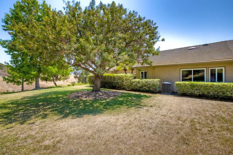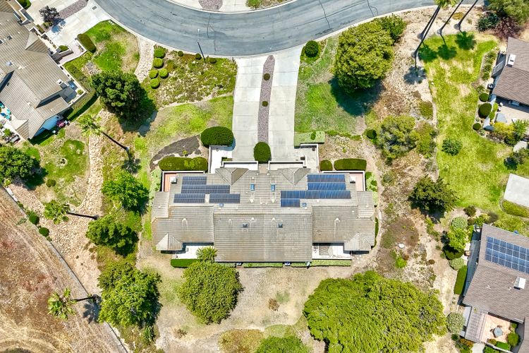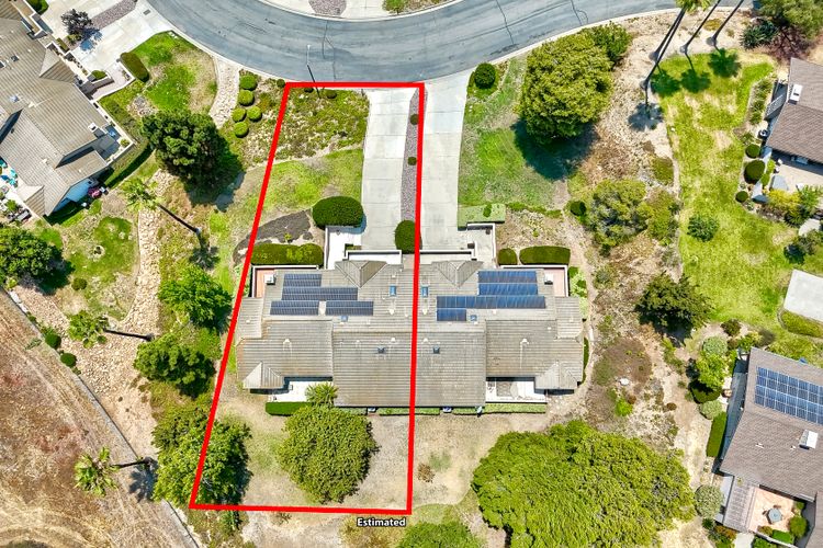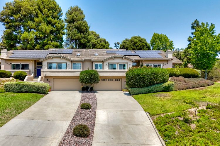 Beautiful townhouse located in gated Terrace Downs of Bonsall. Double door entry enters into great room with soaring ceilings, electric fireplace with blower and 2 built in cabinets. Formal dining area. Wrap around front deck can be accessed from 2 different doors. Private back patio looks out on open space and mature trees. Fantastic kitchen with custom cabinetry and granite counters, Kitchen Aid appliances, double SS sink, whole house intercom system, eat in counter and spacious breakfast nook. Large primary suite features upgraded cabinetry with granite counter top, dual vanities. Deep soaking tub, walk in shower and closet. 2 additional bedrooms and full bathroom in the hall. One bedroom has been converted to an office with custom built in desk and shelving. Laundry room. Recessed lighting. Laminate wood flooring throughout except new carpet in primary and one bedroom. Central HVAC. Owned Panasonic NEM 2.0 solar system for low electric bills. 2 car attached garage. Electric chair lift installed on stairs coming up from garage. 2 community pools. Just minutes to I-15 or Hwy 76. This home is move in ready!