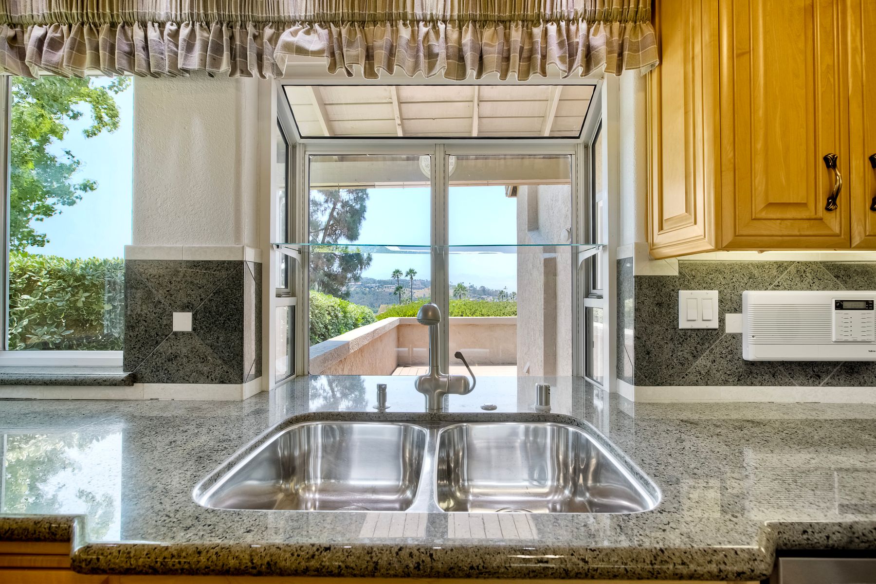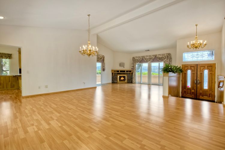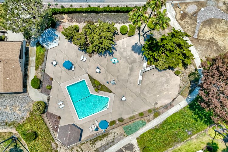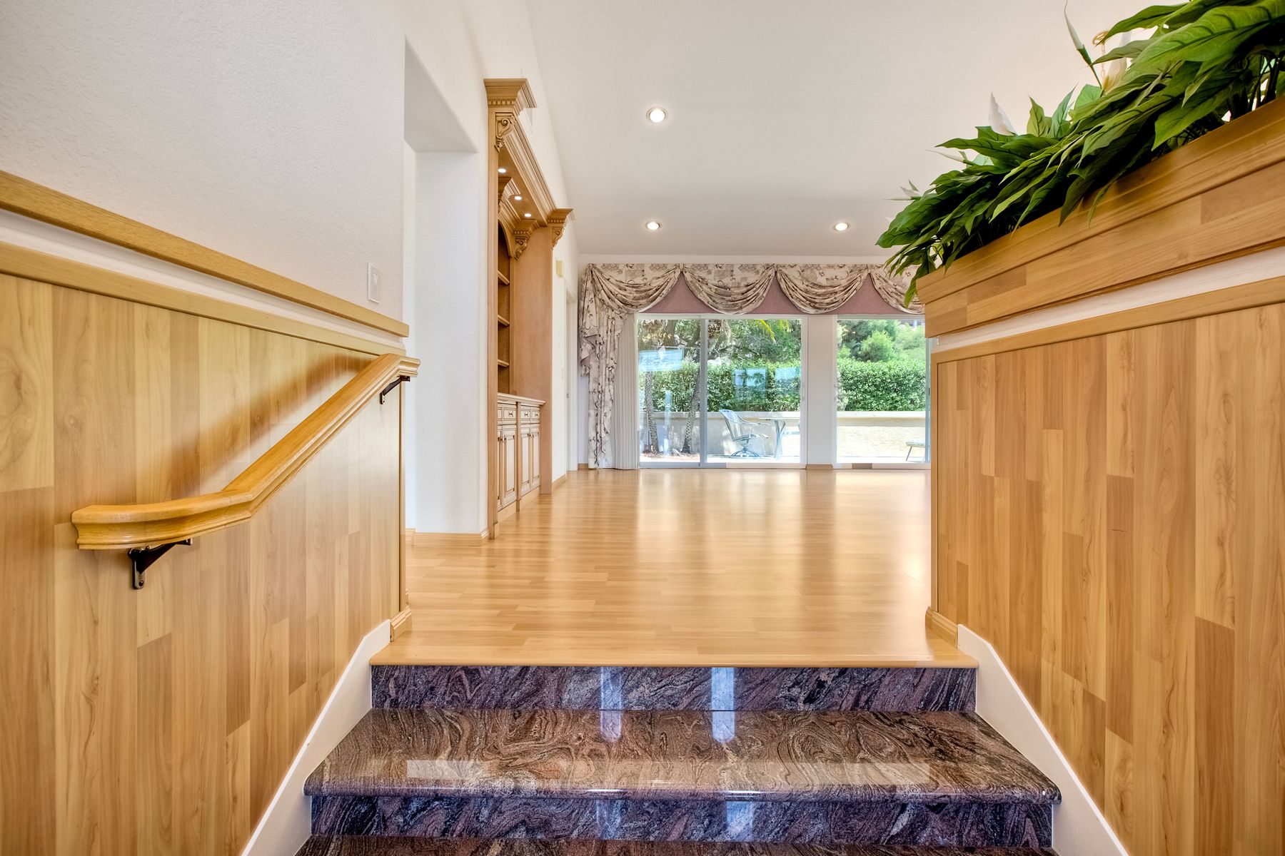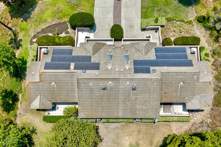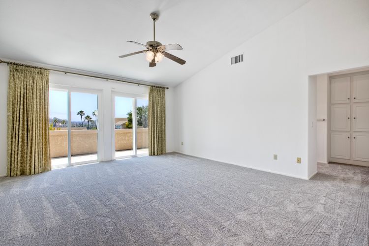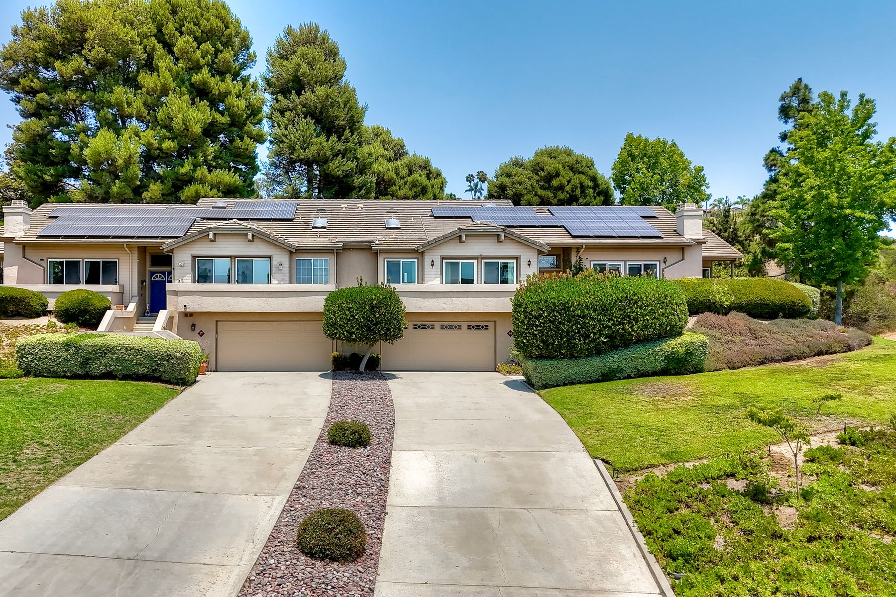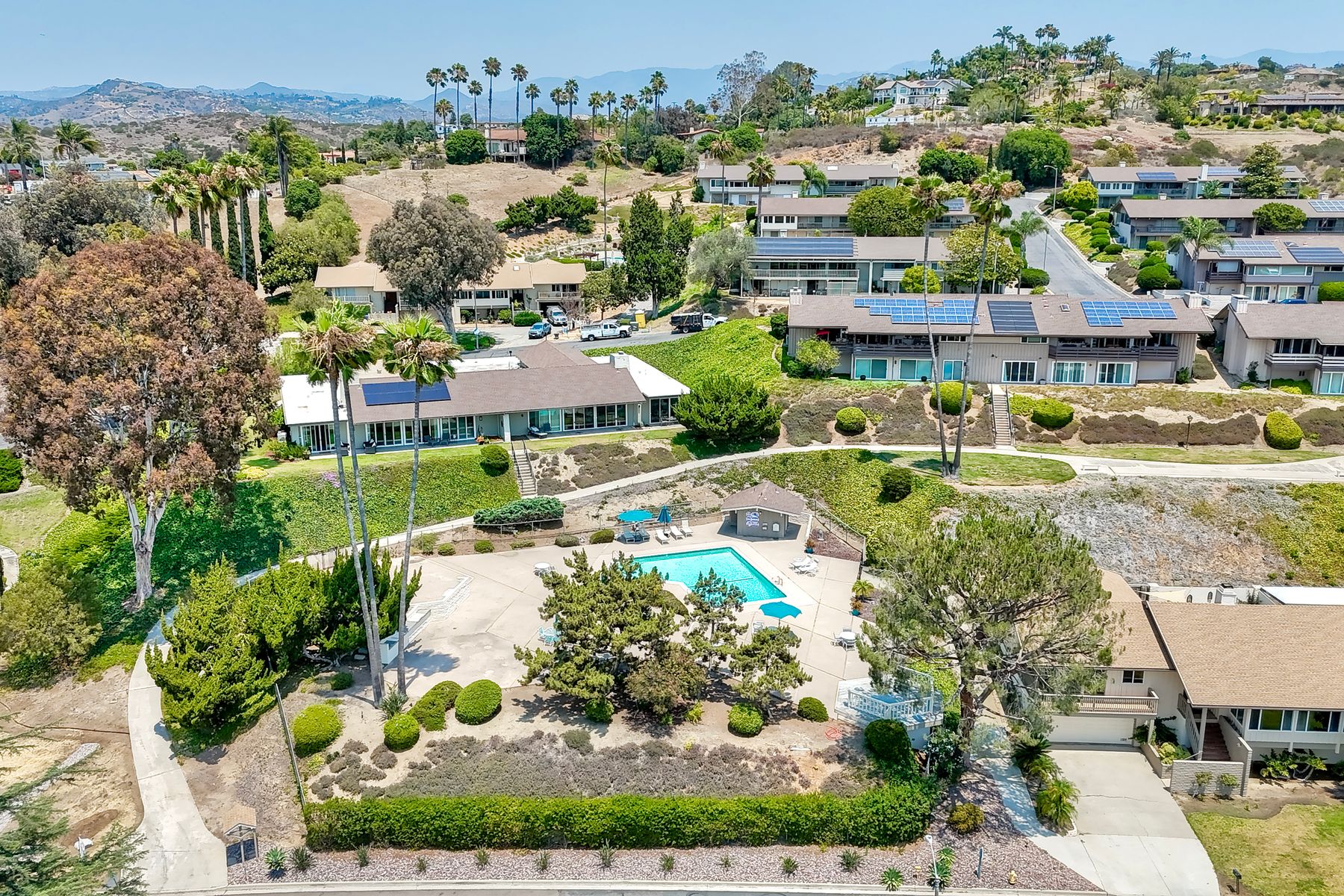 Beautiful townhouse located in gated Terrace Downs of Bonsall. Double door entry enters into great room with soaring ceilings, electric fireplace with blower and 2 built in cabinets. Formal dining area. Wrap around front deck can be accessed from 2 different doors. Private back patio looks out on open space and mature trees. Fantastic kitchen with custom cabinetry and granite counters, Kitchen Aid appliances, double SS sink, whole house intercom system, eat in counter and spacious breakfast nook. Large primary suite features upgraded cabinetry with granite counter top, dual vanities. Deep soaking tub, walk in shower and closet. 2 additional bedrooms and full bathroom in the hall. One bedroom has been converted to an office with custom built in desk and shelving. Laundry room. Recessed lighting. Laminate wood flooring throughout except new carpet in primary and one bedroom. Central HVAC. Owned Panasonic NEM 2.0 solar system for low electric bills. 2 car attached garage. Electric chair lift installed on stairs coming up from garage. 2 community pools. Just minutes to I-15 or Hwy 76. This home is move in ready!