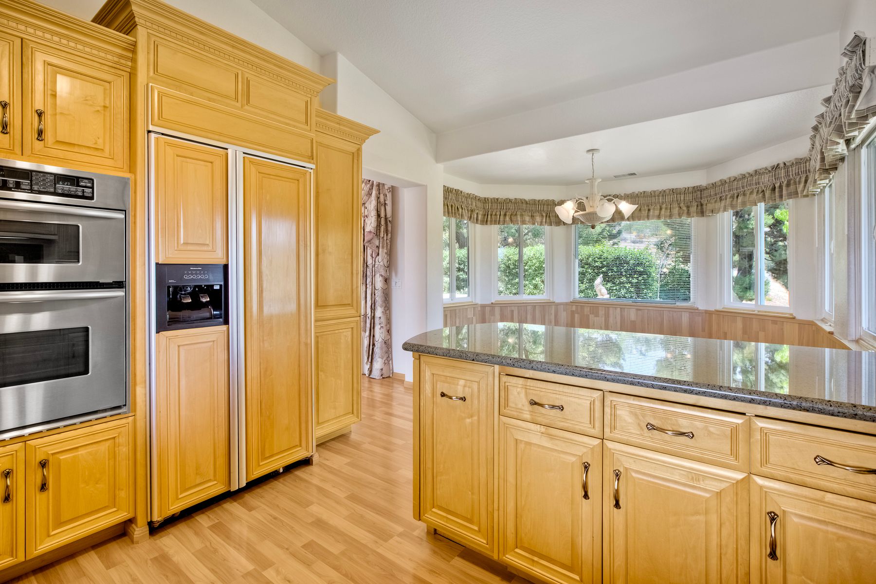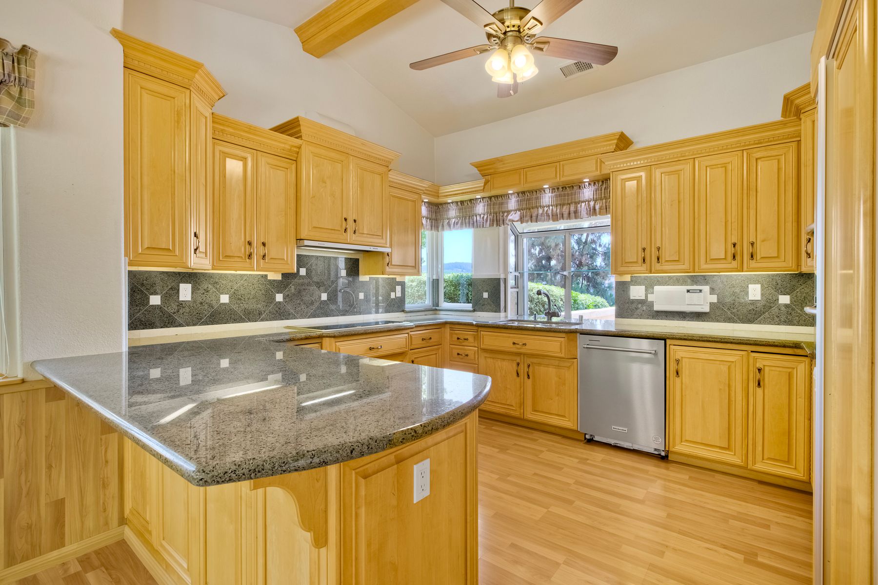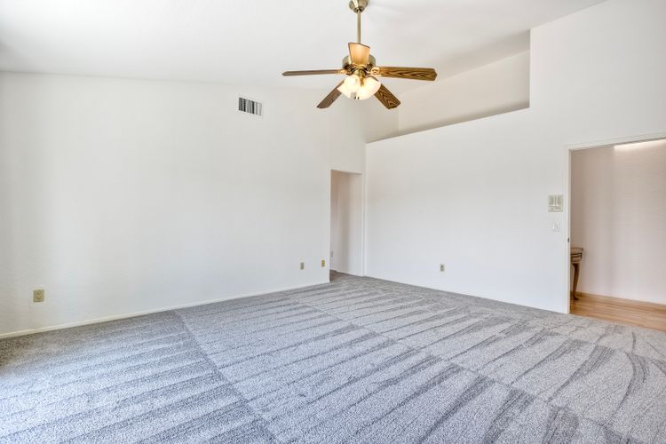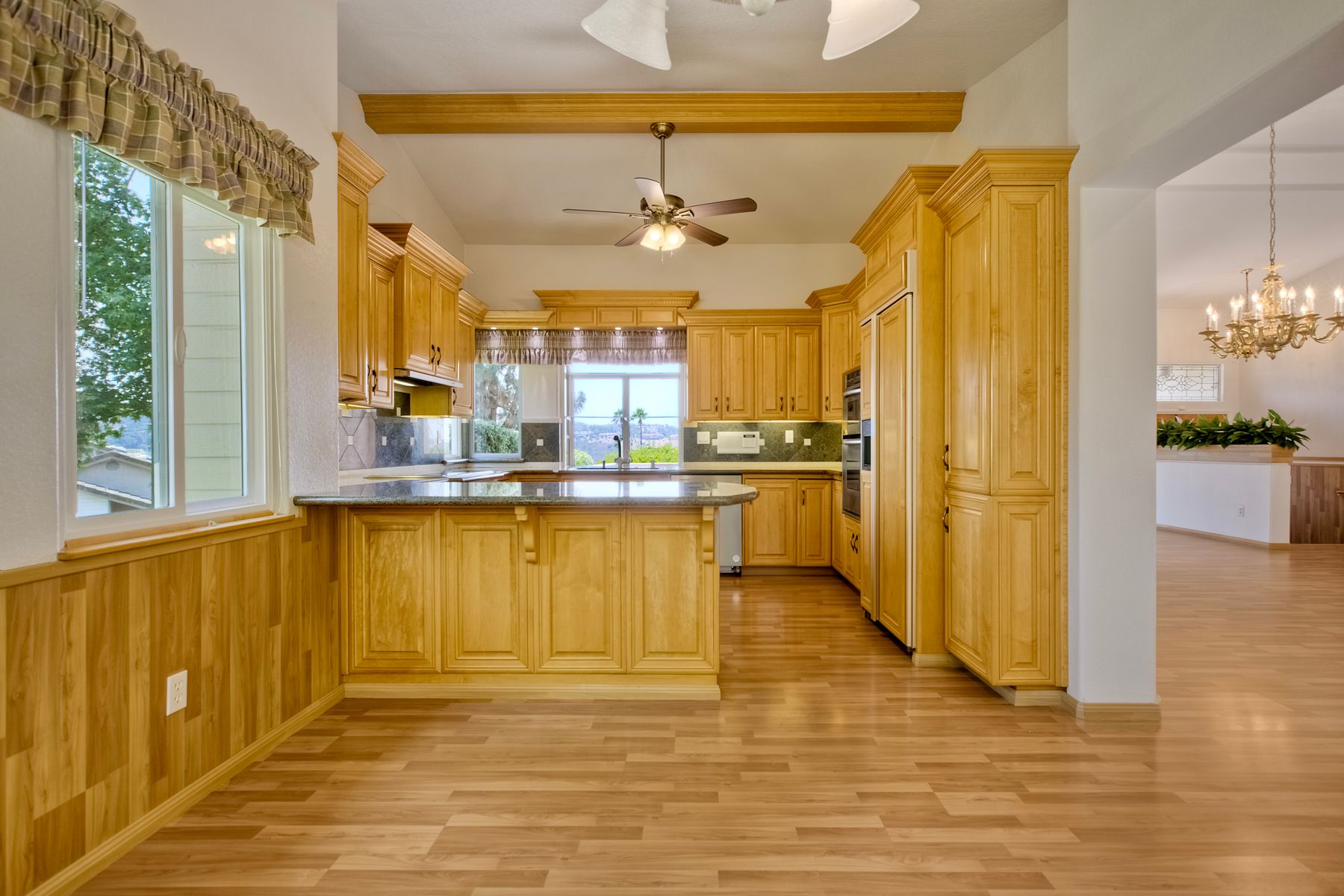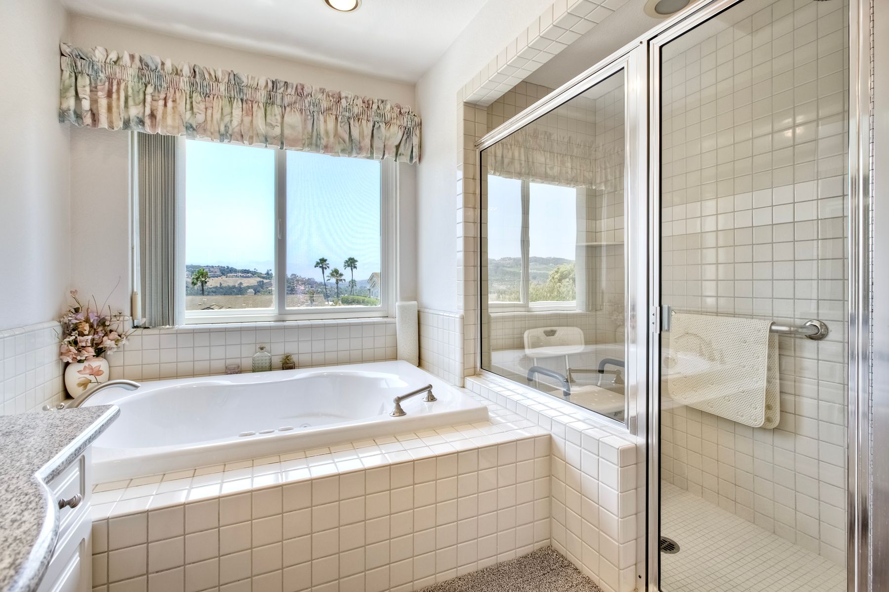 Beautiful townhouse located in gated Terrace Downs of Bonsall. Double door entry enters into great room with soaring ceilings, electric fireplace with blower and 2 built in cabinets. Formal dining area. Wrap around front deck can be accessed from 2 different doors. Private back patio looks out on open space and mature trees. Fantastic kitchen with custom cabinetry and granite counters, Kitchen Aid appliances, double SS sink, whole house intercom system, eat in counter and spacious breakfast nook. Large primary suite features upgraded cabinetry with granite counter top, dual vanities. Deep soaking tub, walk in shower and closet. 2 additional bedrooms and full bathroom in the hall. One bedroom has been converted to an office with custom built in desk and shelving. Laundry room. Recessed lighting. Laminate wood flooring throughout except new carpet in primary and one bedroom. Central HVAC. Owned Panasonic NEM 2.0 solar system for low electric bills. 2 car attached garage. Electric chair lift installed on stairs coming up from garage. 2 community pools. Just minutes to I-15 or Hwy 76. This home is move in ready!