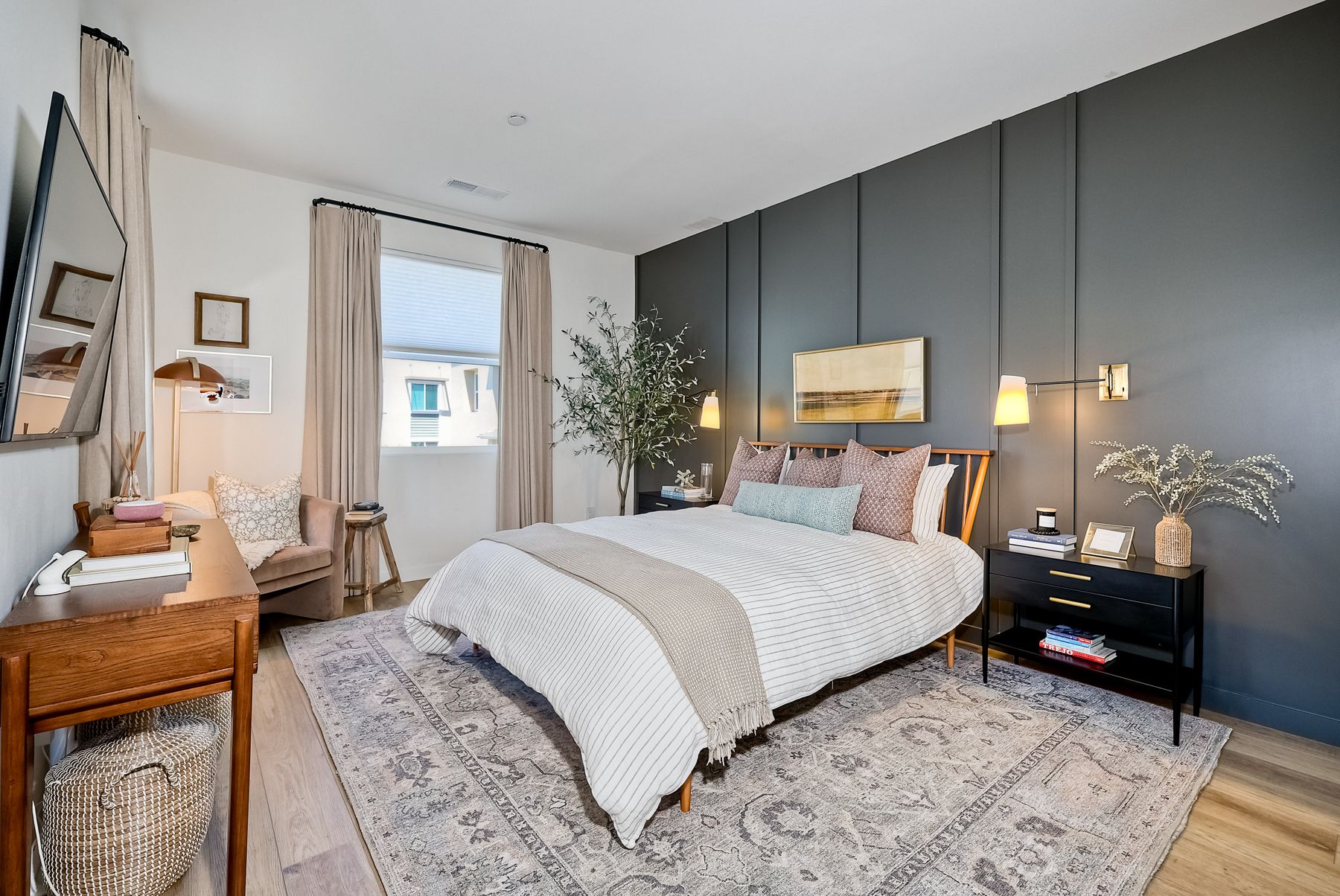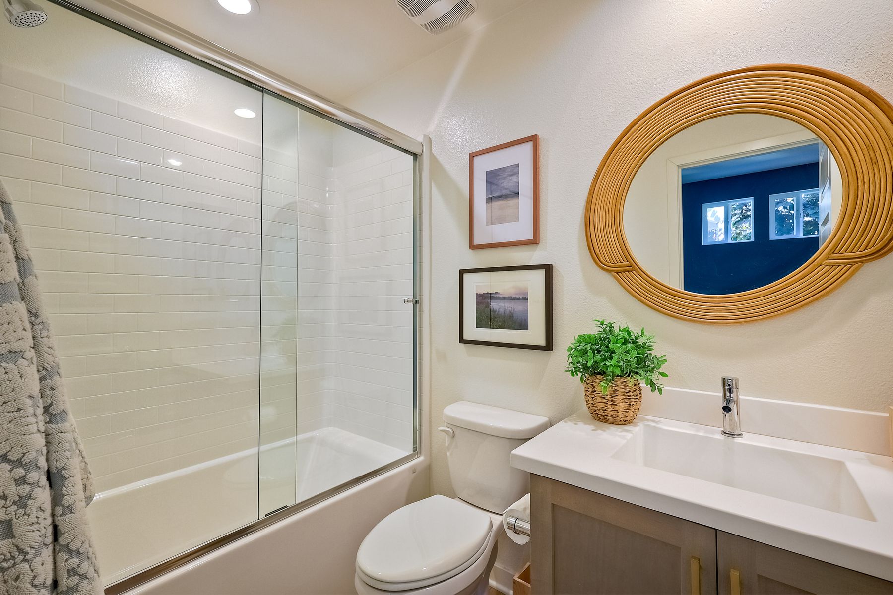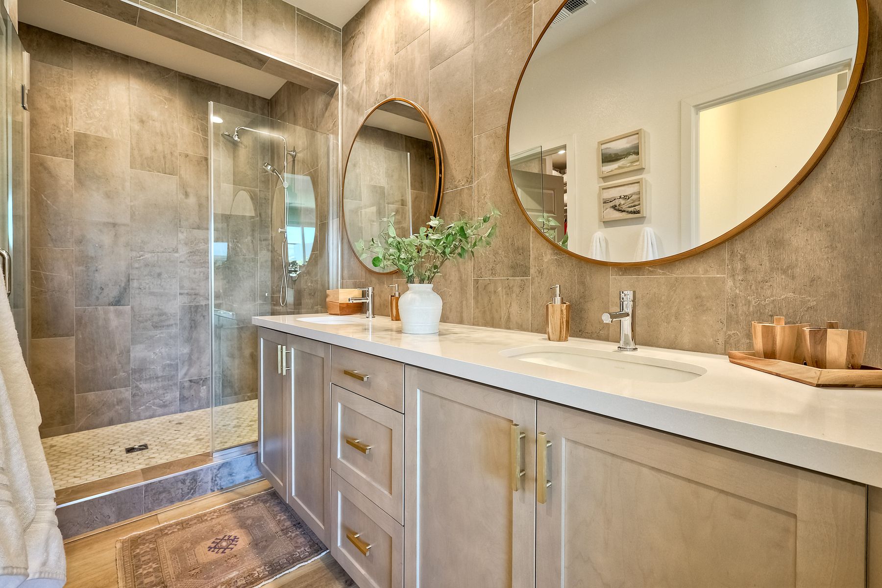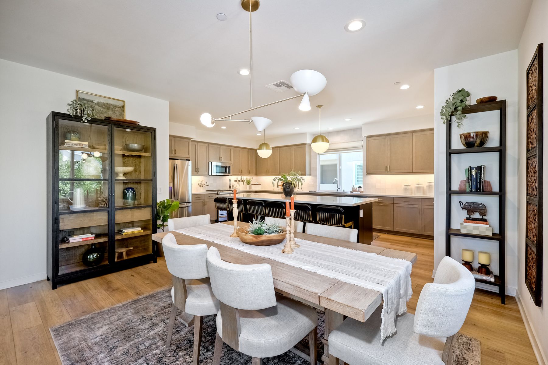 Step into this unique home with exquisite custom details straight from a magazine! Discover carefully chosen finishes, from stunning lighting and mirrors to custom paint, luxury vinyl flooring, elegant tile, shiplap/wood wall accents, wallpaper, beautiful window treatments, and upgraded glass enclosures in the bathrooms. The main level boasts a designer kitchen featuring a striking island with seating for six, ample cabinets and counters, custom tile backsplash, pendant lighting, stylish shaker cabinets, and a spacious pantry. The dining room with a distinctive chandelier seamlessly connects to the light-filled living room with large windows offering views of lush greenery. Relax on the spacious patio with Trex decking while admiring the park and beautiful scenery. This level also includes a tastefully designed powder room with shiplap and custom tile. The third floor houses the primary suite with a luxurious bathroom featuring a walk-in shower with stunning tile extending up the wall above the vanity and a dreamy custom walk-in closet. Another generously sized bedroom with a unique feature wall and en suite bath with designer wallpaper can be found on this level, along with a convenient stackable washer and dryer in the hall. The first floor of this tri-level home features a private bedroom with its own en suite bath and a sliding door opening to a private, covered patio overlooking the park. Additionally, the first level offers access to the two-car garage. Beyond the stunning aesthetics, enjoy fully owned solar, epoxy garage floors, and smart features like a tankless water heater, keyless entry, and thermostat. Take advantage of the neighborhood's amenities including a salt water pool, park/play area, barbecues, picnic tables, Bocci Ball, a Tesla charging station, and more. No need for a car with the Bressi Ranch Shopping Center with local dining and shopping! Trader Joe's and Sprouts are just a stones throw away. This fantastic location is just a short distance from the beautiful beaches of Carlsbad and Encinitas, as well as top-rated schools. Don’t miss out on this stunning home with an amazing location!