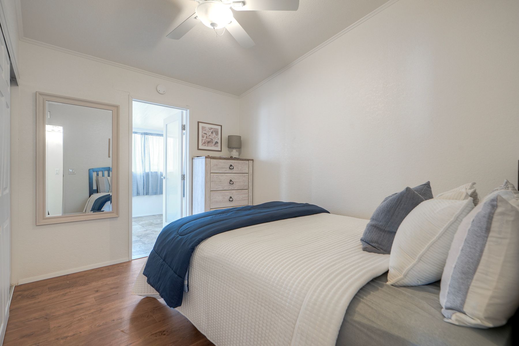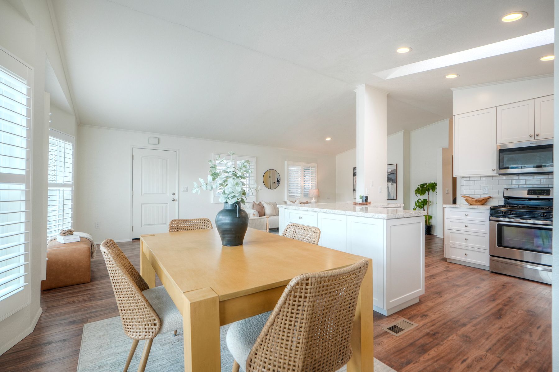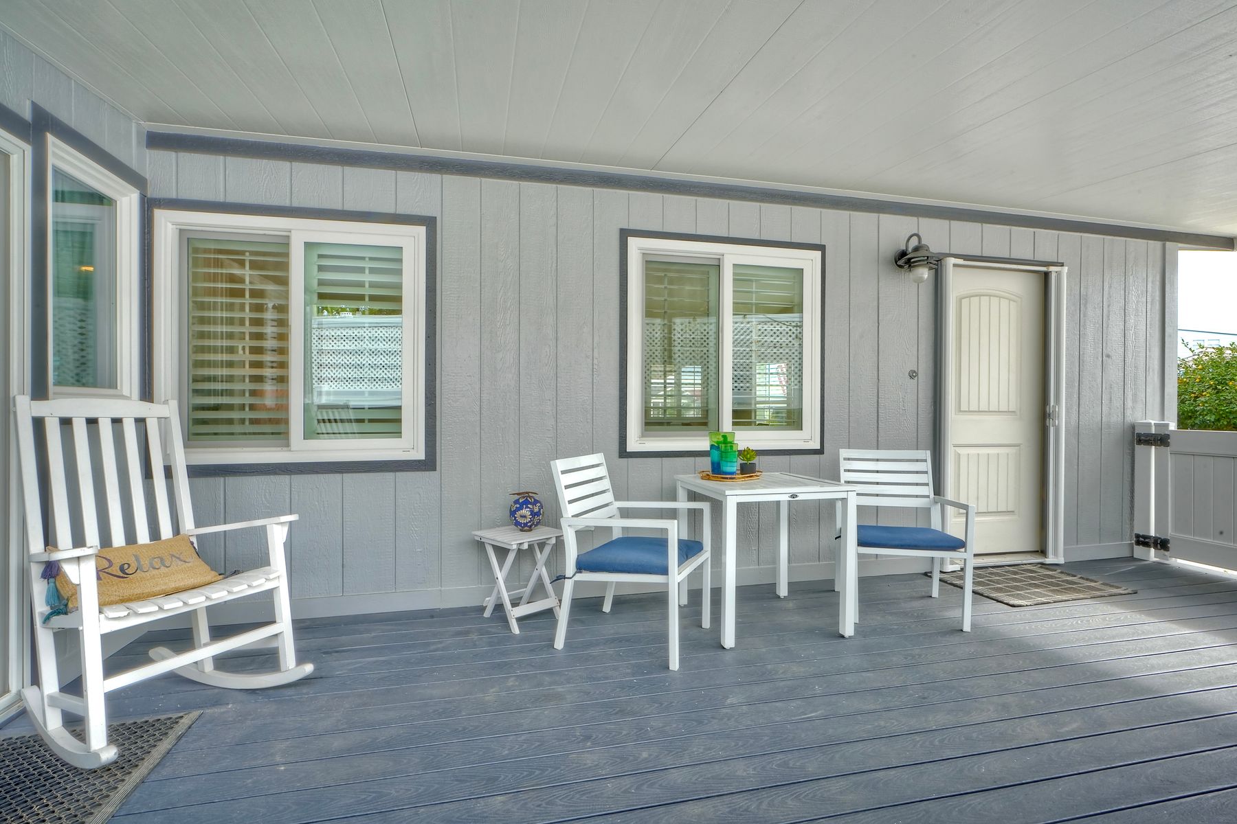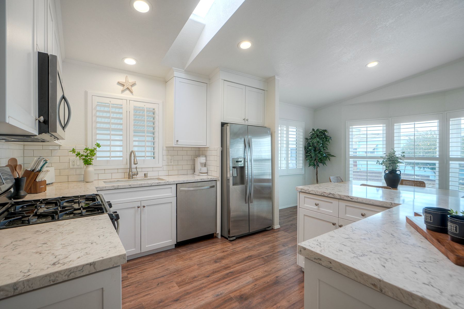 Welcome to your new Carlsbad beach home! This coastal cutie features a bright and airy open floor plan with soaring ceilings and skylights that fill the space with natural light. The remodeled kitchen is spacious and seamlessly connects to the living and dining areas, offering generous quartz countertops, shaker cabinetry, a porcelain farmhouse sink, and sleek stainless-steel appliances. The primary suite is roomy and inviting, complete with high ceilings and an impressively large ensuite bath. The secondary bedroom and bath provide a perfect setup for guests. A dedicated office offers excellent flexibility—ideal as a workspace, art studio, or workout room. Enjoy your laundry room in the house for total ease. Step outside to a peaceful trex deck patio and outdoor area made for unwinding and enjoying spectacular sunsets. Vinyl fencing perfectly maintains your privacy. An attached carport adds convenience, while a detached shed is perfect for storing bikes and extra gear. This home is a perfect fit for full-time living or a great second home. Catch the wave at Solamar. The Solamar community offers exceptional amenities, including a heated saltwater pool, jacuzzi, pickleball court, clubhouse, library, car-wash station, and more. HOA fees are only $390, including cable, sewer & trash.--this is a Land Owned community--there is NO Space Rent Welcome home to coastal living at its finest.