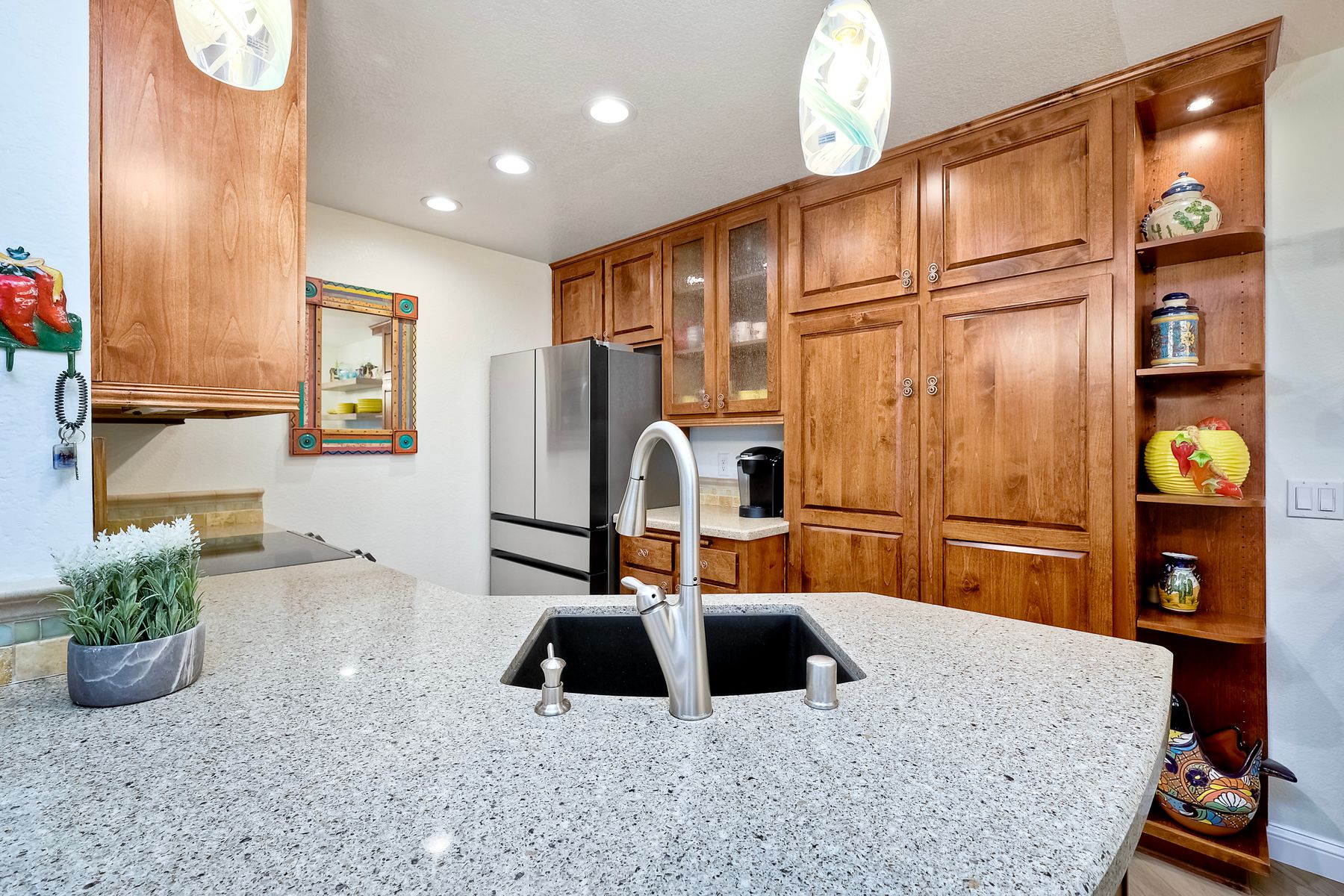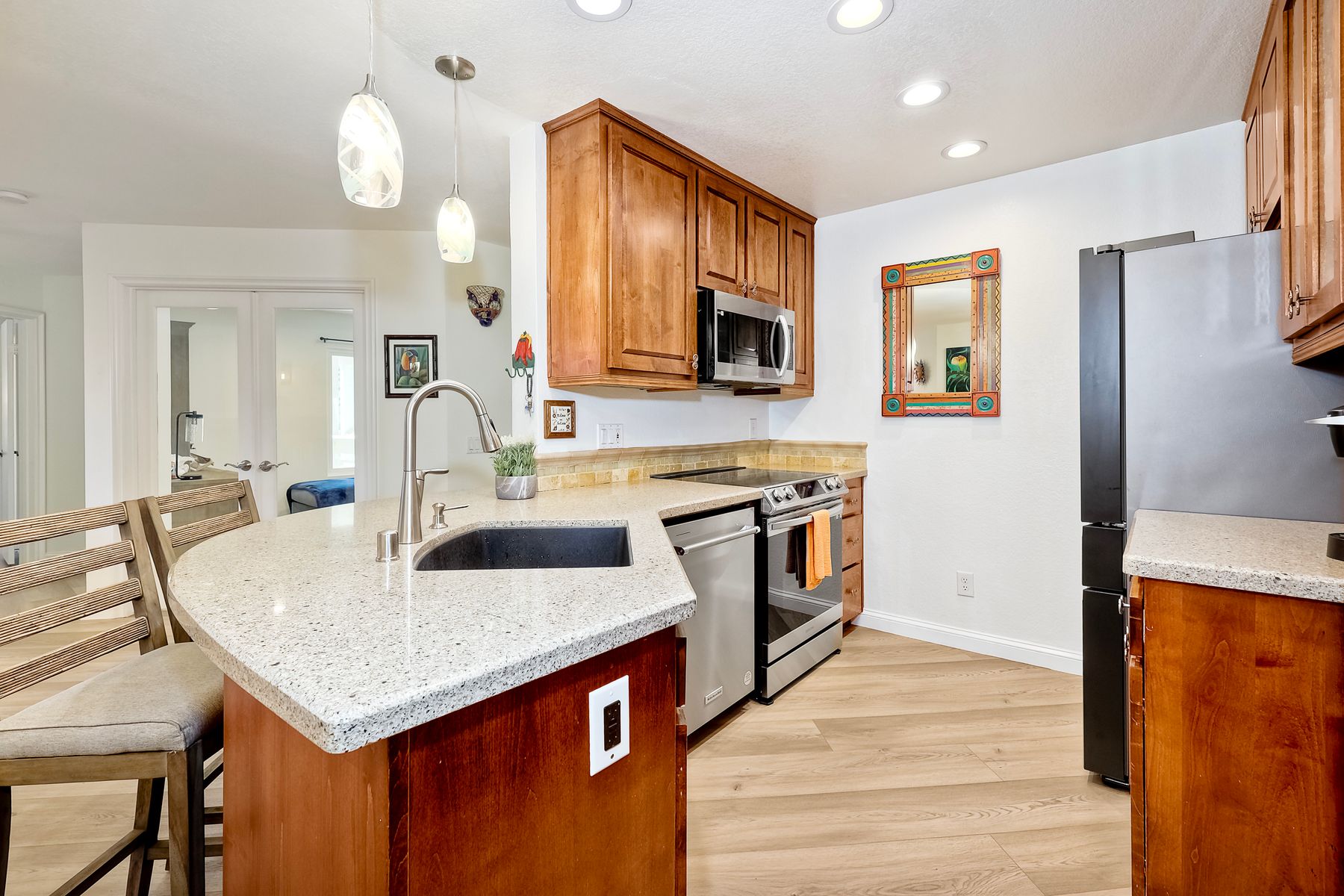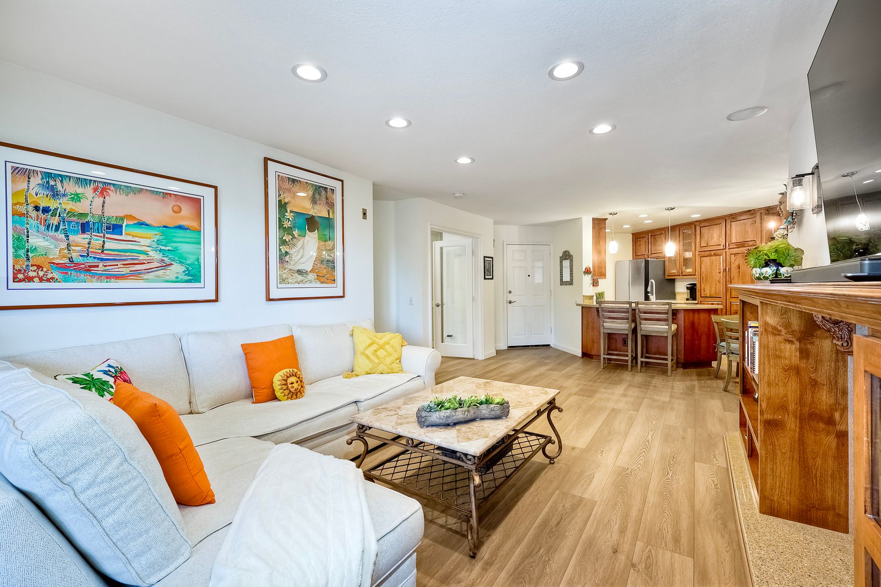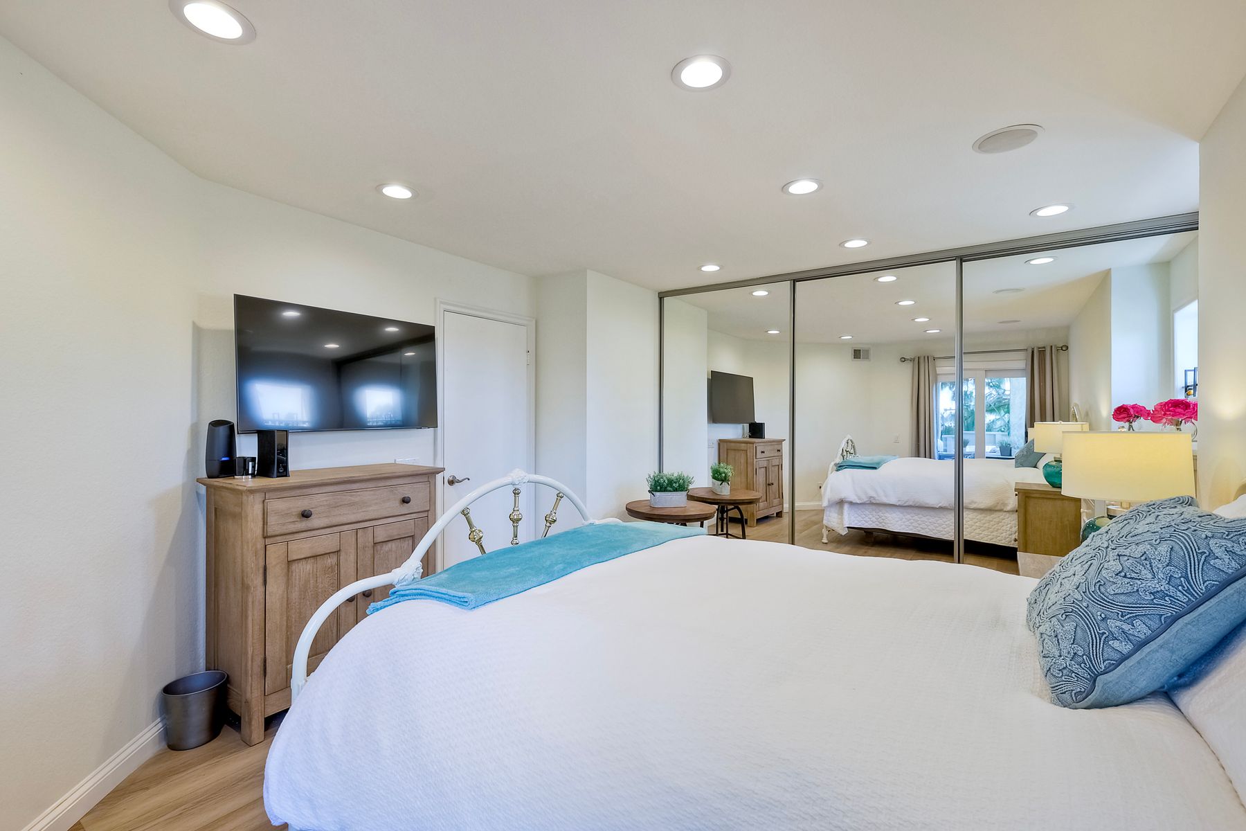 A rare find located in the heart of San Diego. This is a one level, end unit condo w/ no stairs to and from the unit, parking lot and two car tandem garage and yes, it's absolutely gorgeous! There are 3 bed, 2 bath, an open floorplan w/ all rooms leading onto a spacious, covered relaxing patio w/ unobstructed views. The bedrooms are generous in size, triple door closets, luxury vinyl planks throughout, fireplace in living room, new LED recessed lighting, upgraded bath vanities and shower, upgraded kitchen cabinets & Silestone countertops. City Scene complex comes w/ access to pool, spa, BBQ and exercise room and HOA fees include water and trash. Location, Location, Location! Fashion Valley Mall across the street, Snapdragon Stadium, USD, SDSU, Mesa College, Downtown, Beaches, Hospitals, SD Airport all close by.