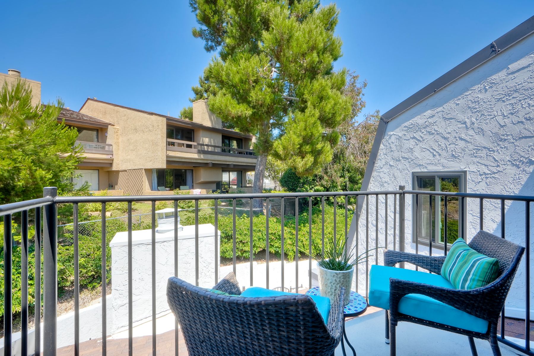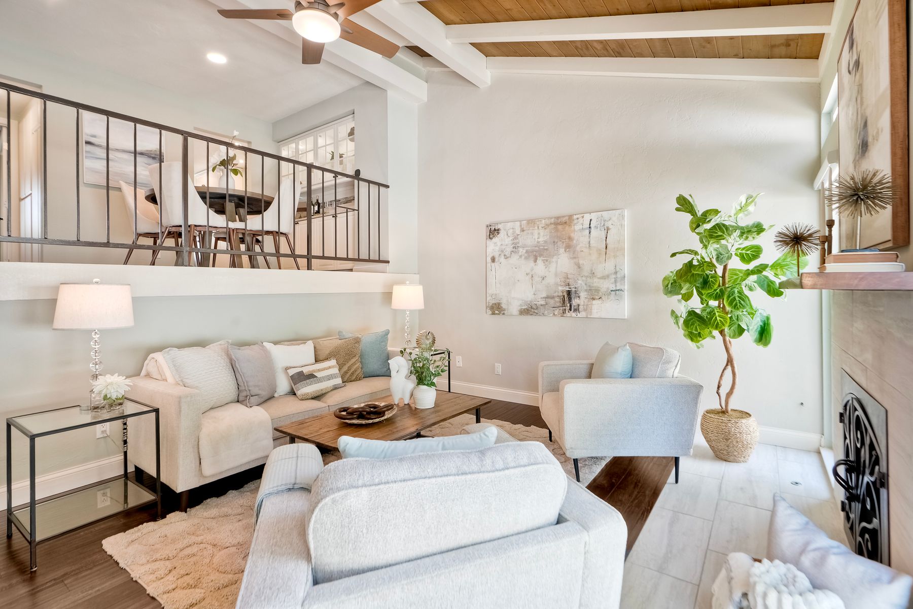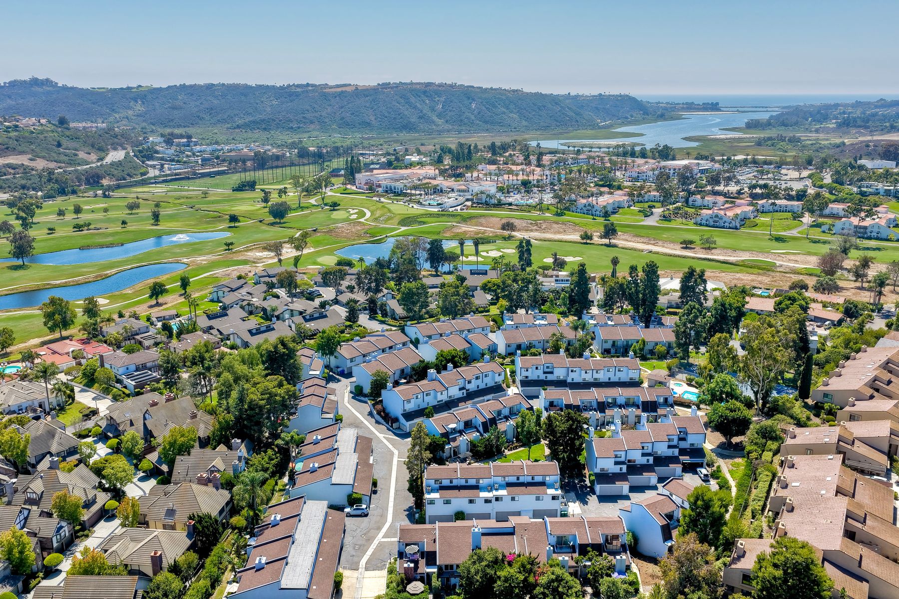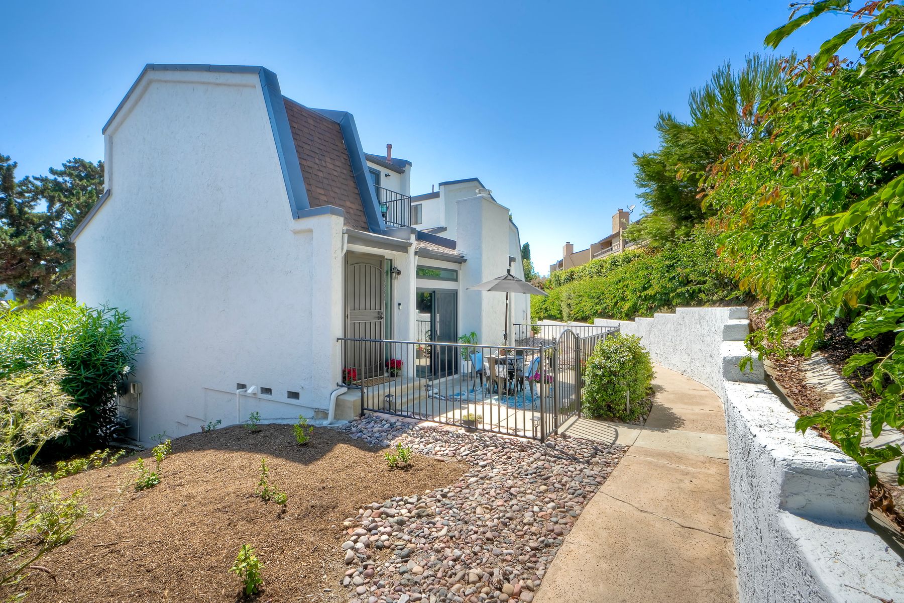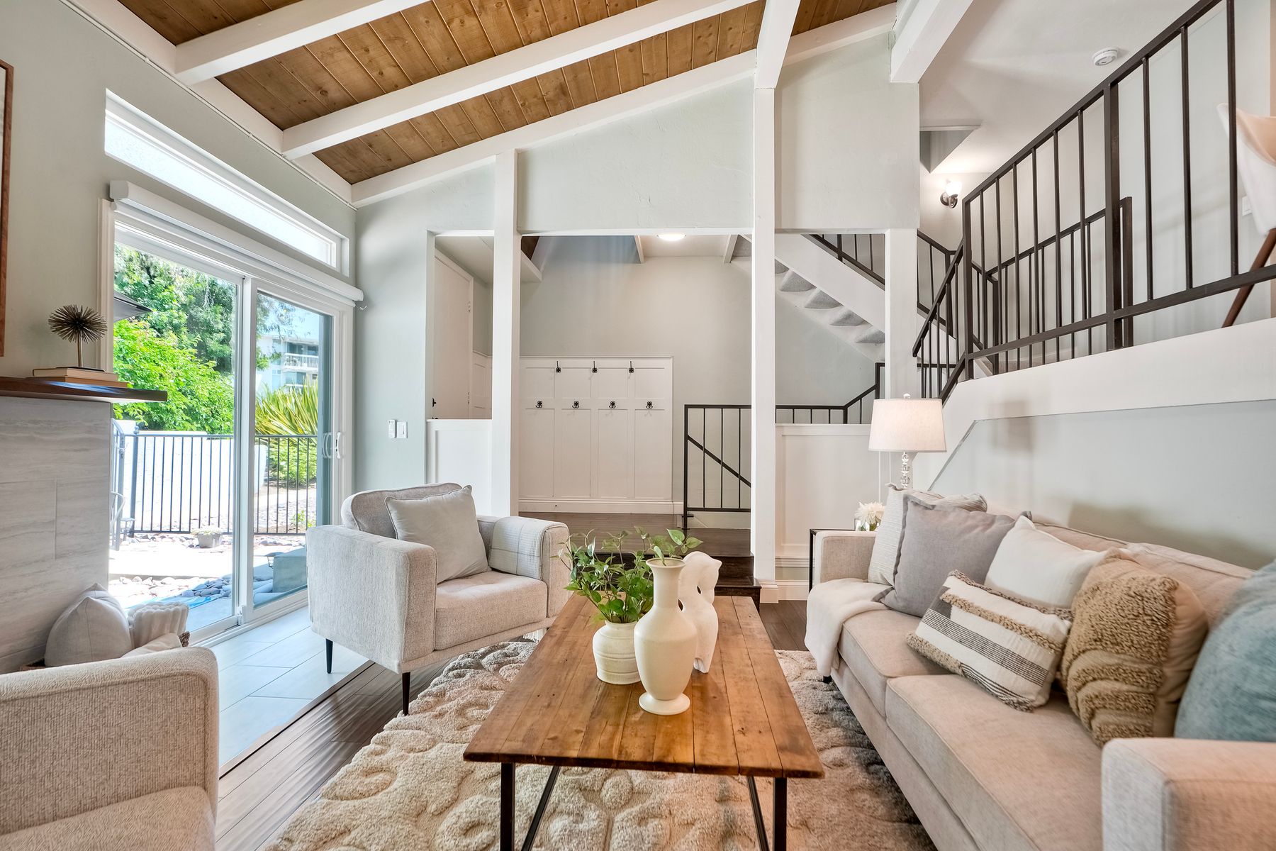 Peace. Privacy. Perfection. Location and privacy are key in this highly sought-after, duplex-style, end unit that shares only one wall. This upscale coastal charmer offers the feel of a private home in a beautifully landscaped community to enjoy expansive greenbelts perfect for morning walks, outdoor relaxation, or simply taking in the serene surroundings. This upgraded beauty features on-trend finishes. Vaulted ceilings with exposed beams, and natural light from the numerous windows that create a farmhouse design style with an open and airy feel. Beautifully remodeled eat-in kitchen with shaker style, soft close cabinets and light, neutral quartz countertops that extend from the kitchen into the dining area with ample storage. Step into your secluded front patio, thoughtfully designed to ensure privacy with no direct views of neighboring units. Inside, you'll find countless high-end upgrades throughout: Dual-pane windows & sliding doors (select sliders tinted for added privacy), Motorized blinds and solar shades—conveniently remote-operated, Custom closets with built-in drawers and cabinetry, Durable vinyl plank flooring in main living areas, plus new carpet in the primary bedroom and stairs, Tiled fireplace with wood mantle and custom cabinet-style screen (gas), Ceiling fans in both bedrooms and the living room, Stylish tile flooring and updated tiled enclosures in both bathrooms.Stay comfortable year-round with a NEW modern, energy-efficient HVAC system. A/C fully updated in July 2024. The spacious two-car garage has been upgraded with epoxy floors, insulated steel door, painted walls, and ample storage. A refrigerator and full-size washer and dryer are included for convenience. With only two units in the building, this home offers a uniquely private and quiet living experience. Move-in ready and thoughtfully upgraded, it’s the ideal blend of comfort, style, and low-maintenance living in La Costa. Ideally located to top rated schools, golf courses, shopping, dining and just minutes from Carlsbad’s world class beaches.