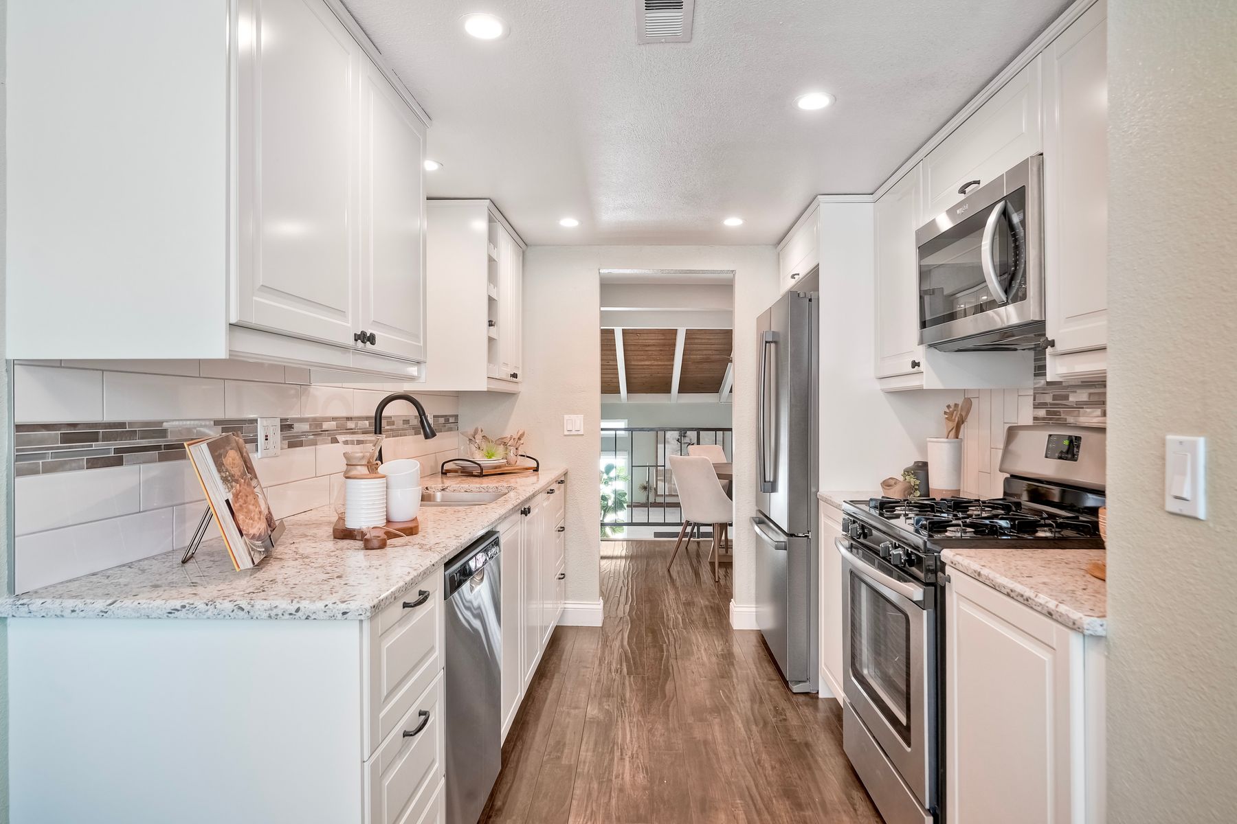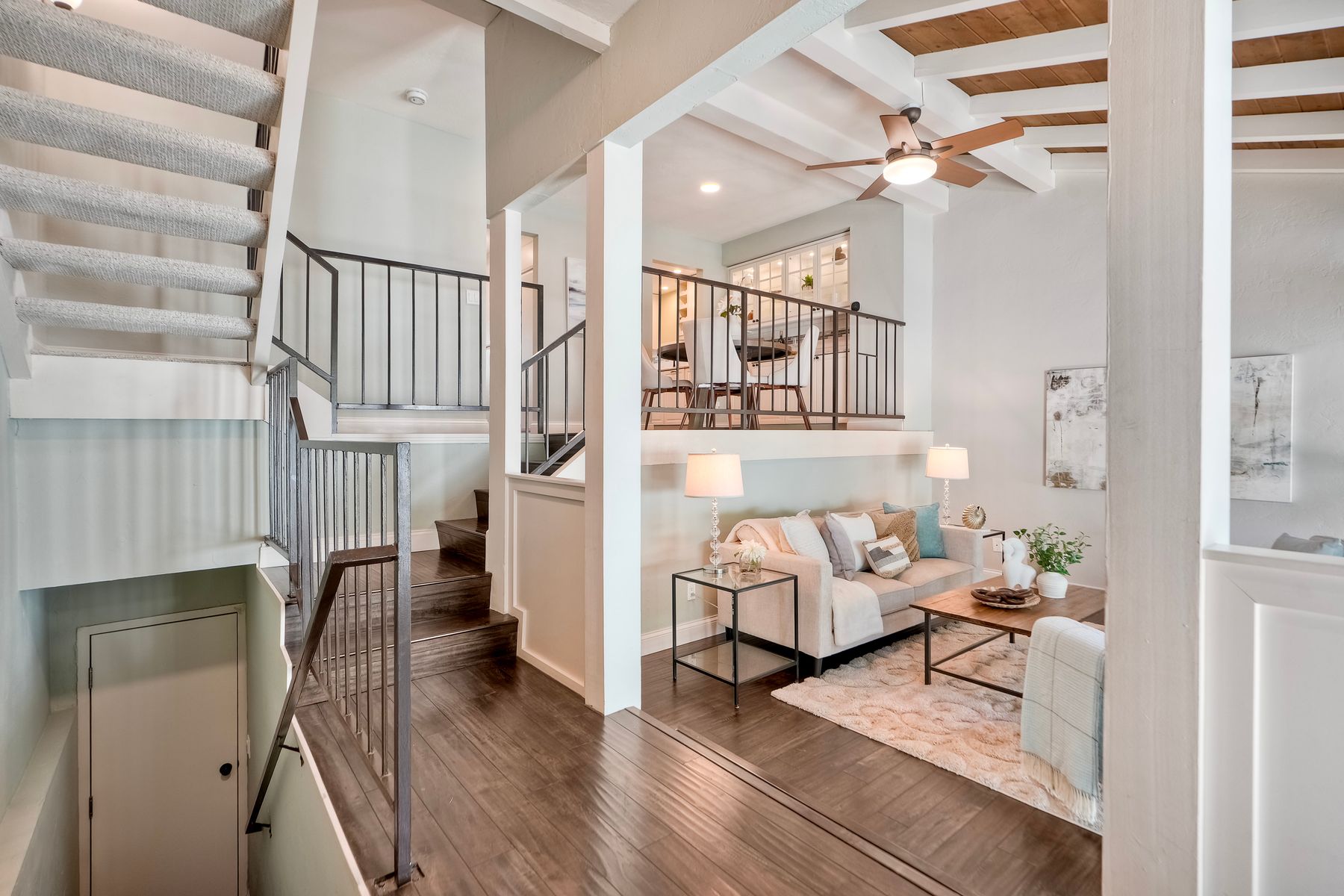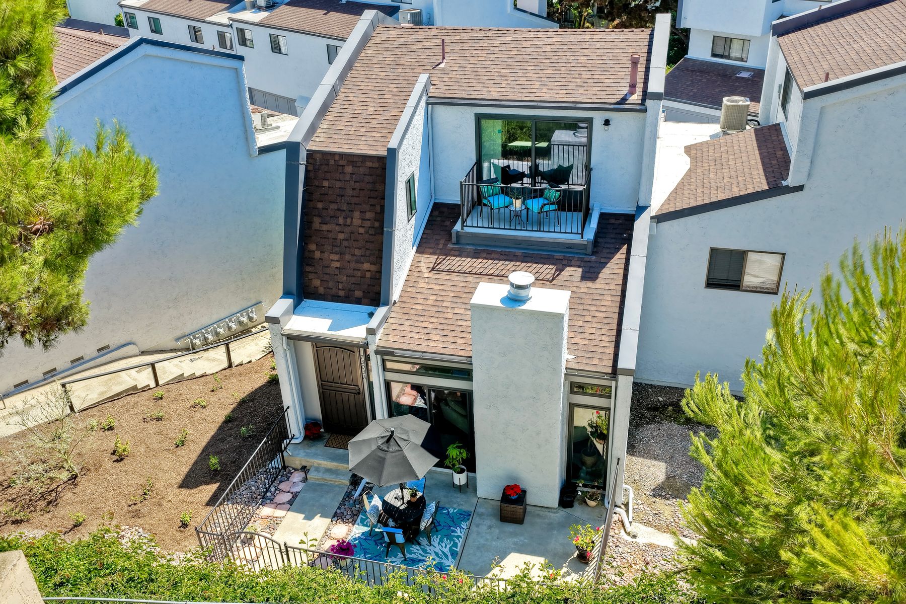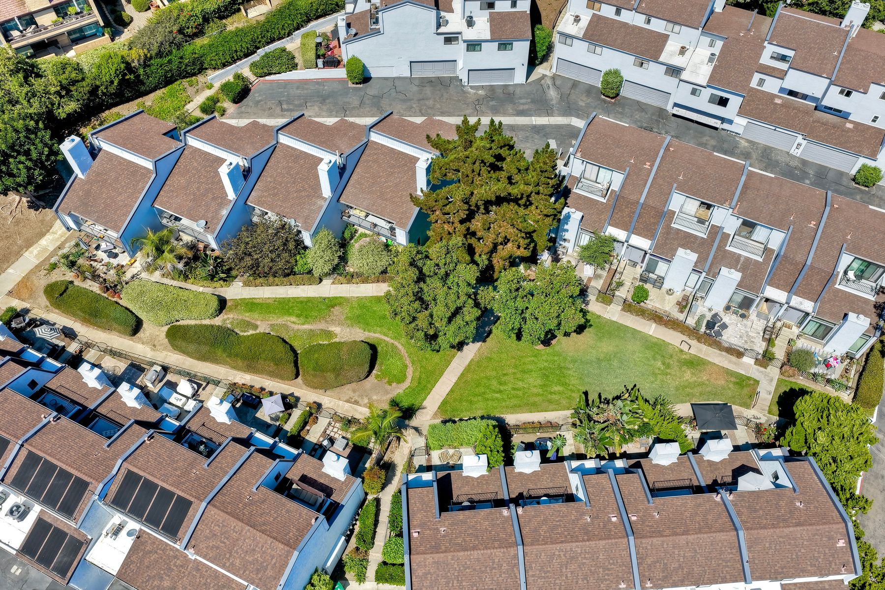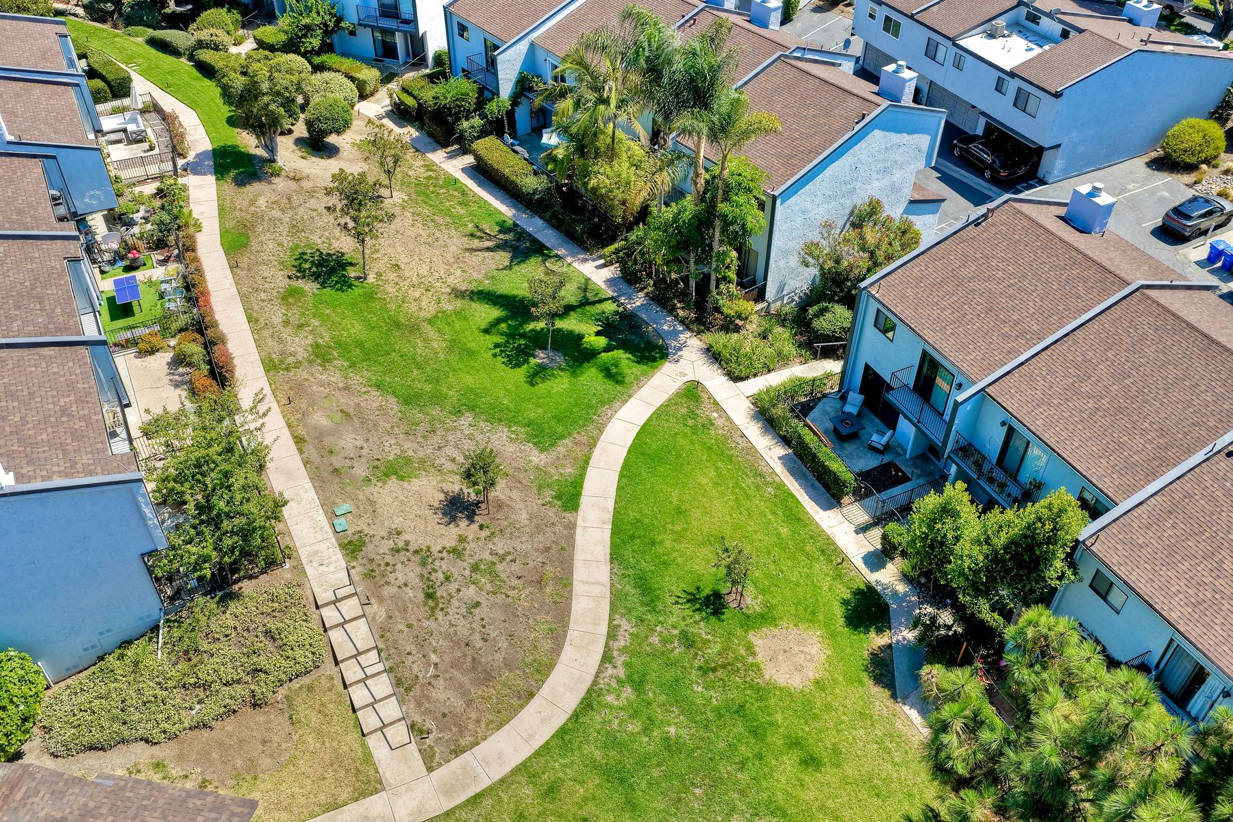 Peace. Privacy. Perfection. Location and privacy are key in this highly sought-after, duplex-style, end unit that shares only one wall. This upscale coastal charmer offers the feel of a private home in a beautifully landscaped community to enjoy expansive greenbelts perfect for morning walks, outdoor relaxation, or simply taking in the serene surroundings. This upgraded beauty features on-trend finishes. Vaulted ceilings with exposed beams, and natural light from the numerous windows that create a farmhouse design style with an open and airy feel. Beautifully remodeled eat-in kitchen with shaker style, soft close cabinets and light, neutral quartz countertops that extend from the kitchen into the dining area with ample storage. Step into your secluded front patio, thoughtfully designed to ensure privacy with no direct views of neighboring units. Inside, you'll find countless high-end upgrades throughout: Dual-pane windows & sliding doors (select sliders tinted for added privacy), Motorized blinds and solar shades—conveniently remote-operated, Custom closets with built-in drawers and cabinetry, Durable vinyl plank flooring in main living areas, plus new carpet in the primary bedroom and stairs, Tiled fireplace with wood mantle and custom cabinet-style screen (gas), Ceiling fans in both bedrooms and the living room, Stylish tile flooring and updated tiled enclosures in both bathrooms.Stay comfortable year-round with a NEW modern, energy-efficient HVAC system. A/C fully updated in July 2024. The spacious two-car garage has been upgraded with epoxy floors, insulated steel door, painted walls, and ample storage. A refrigerator and full-size washer and dryer are included for convenience. With only two units in the building, this home offers a uniquely private and quiet living experience. Move-in ready and thoughtfully upgraded, it’s the ideal blend of comfort, style, and low-maintenance living in La Costa. Ideally located to top rated schools, golf courses, shopping, dining and just minutes from Carlsbad’s world class beaches.