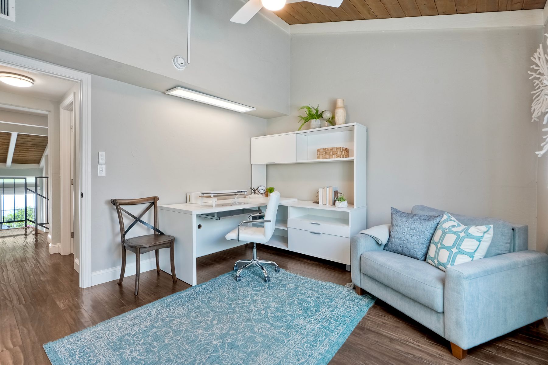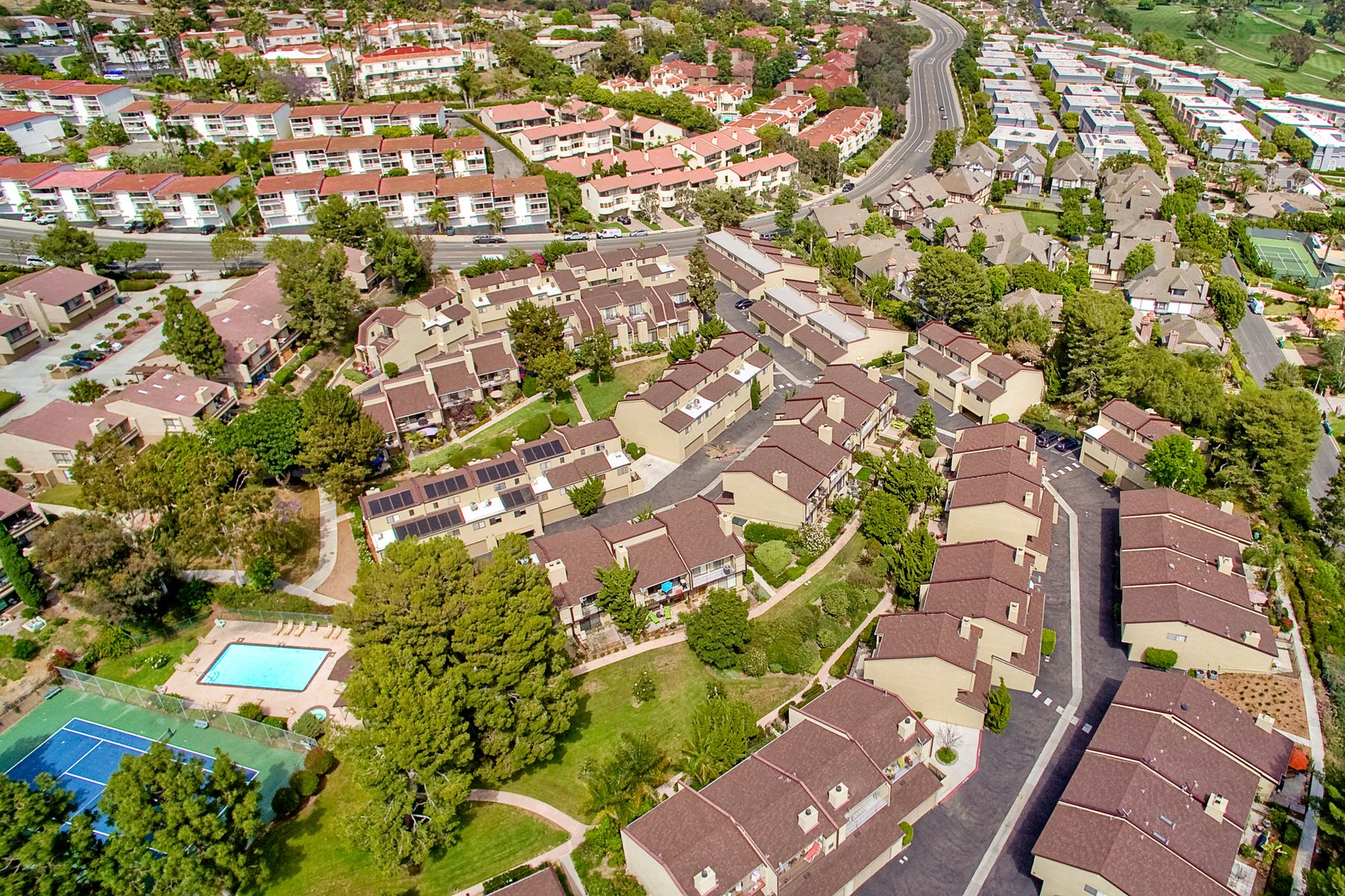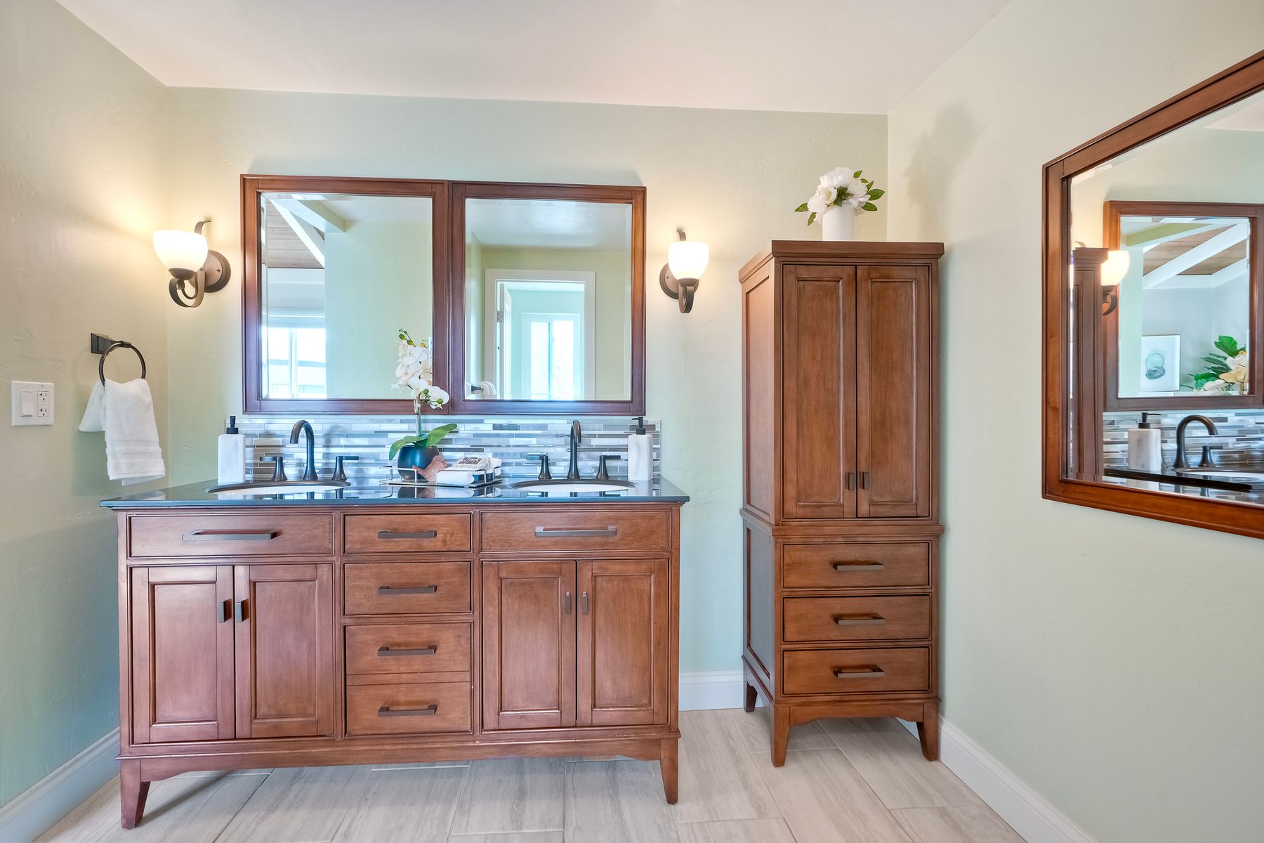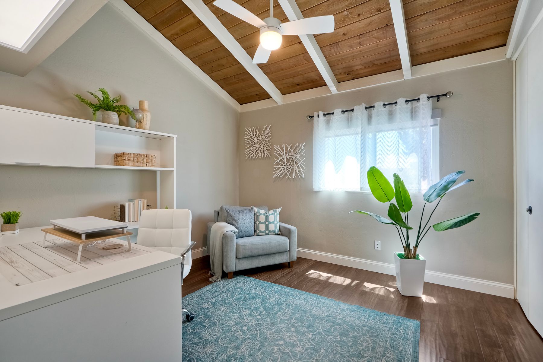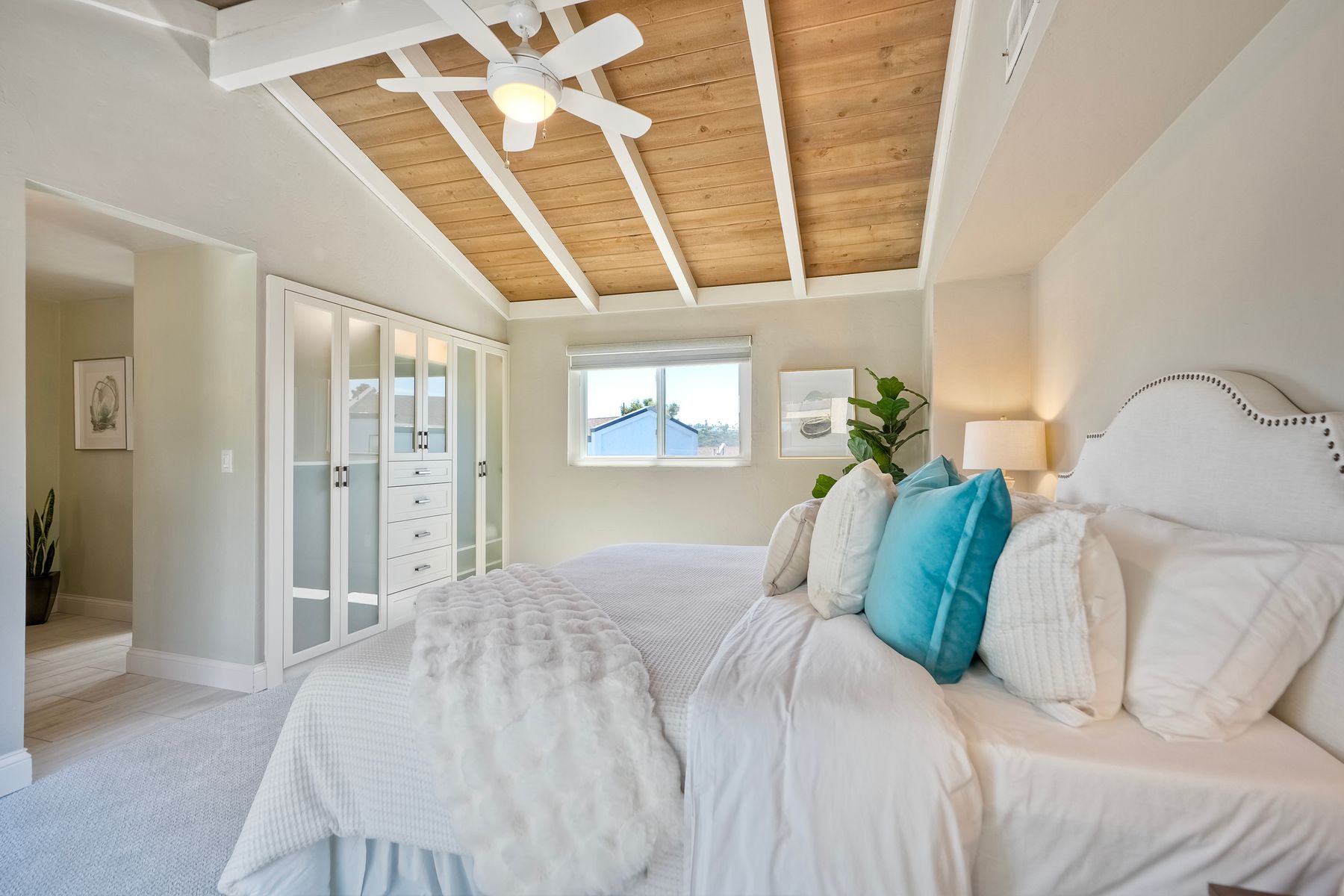 Peace. Privacy. Perfection. Location and privacy are key in this highly sought-after, duplex-style, end unit that shares only one wall. This upscale coastal charmer offers the feel of a private home in a beautifully landscaped community to enjoy expansive greenbelts perfect for morning walks, outdoor relaxation, or simply taking in the serene surroundings. This upgraded beauty features on-trend finishes. Vaulted ceilings with exposed beams, and natural light from the numerous windows that create a farmhouse design style with an open and airy feel. Beautifully remodeled eat-in kitchen with shaker style, soft close cabinets and light, neutral quartz countertops that extend from the kitchen into the dining area with ample storage. Step into your secluded front patio, thoughtfully designed to ensure privacy with no direct views of neighboring units. Inside, you'll find countless high-end upgrades throughout: Dual-pane windows & sliding doors (select sliders tinted for added privacy), Motorized blinds and solar shades—conveniently remote-operated, Custom closets with built-in drawers and cabinetry, Durable vinyl plank flooring in main living areas, plus new carpet in the primary bedroom and stairs, Tiled fireplace with wood mantle and custom cabinet-style screen (gas), Ceiling fans in both bedrooms and the living room, Stylish tile flooring and updated tiled enclosures in both bathrooms.Stay comfortable year-round with a NEW modern, energy-efficient HVAC system. A/C fully updated in July 2024. The spacious two-car garage has been upgraded with epoxy floors, insulated steel door, painted walls, and ample storage. A refrigerator and full-size washer and dryer are included for convenience. With only two units in the building, this home offers a uniquely private and quiet living experience. Move-in ready and thoughtfully upgraded, it’s the ideal blend of comfort, style, and low-maintenance living in La Costa. Ideally located to top rated schools, golf courses, shopping, dining and just minutes from Carlsbad’s world class beaches.