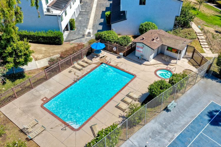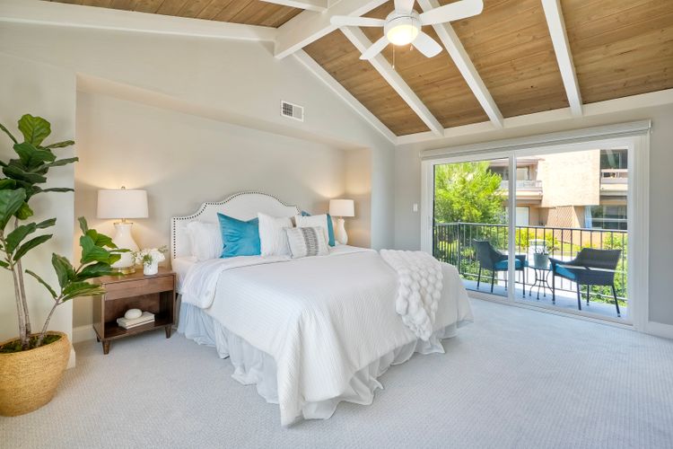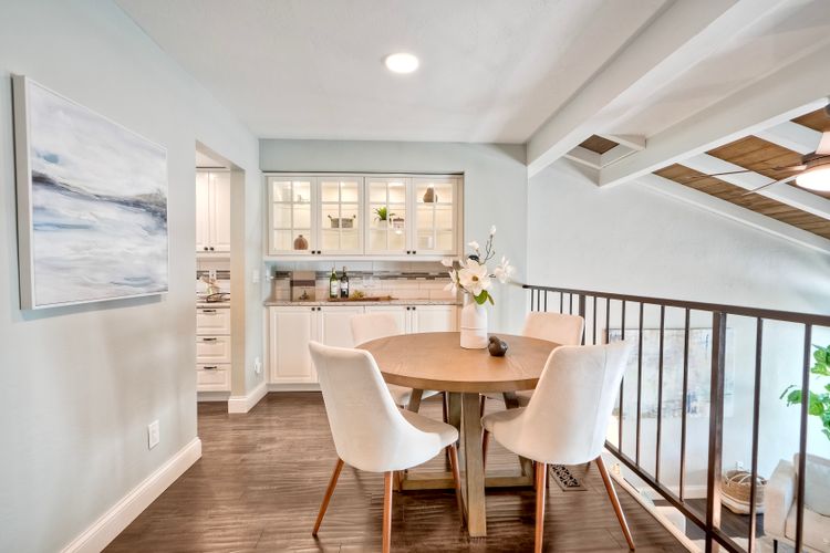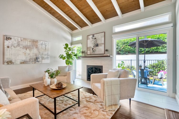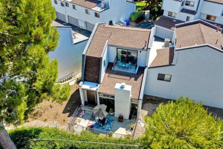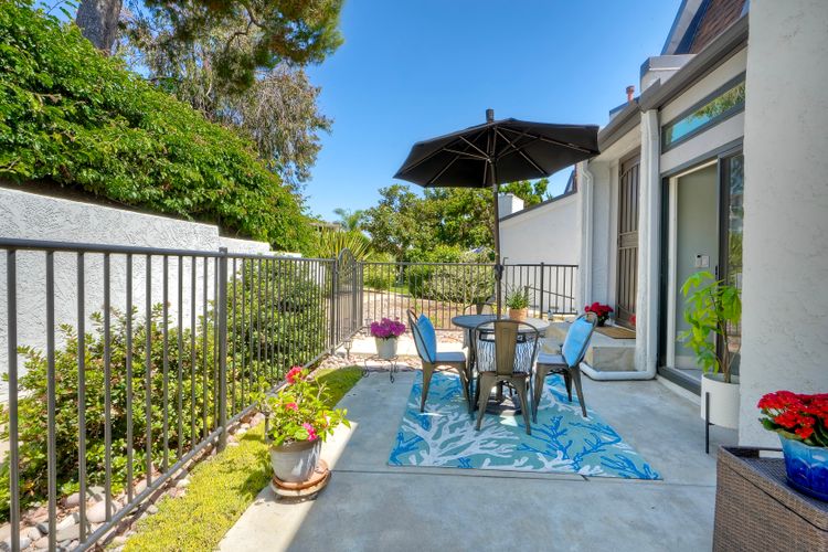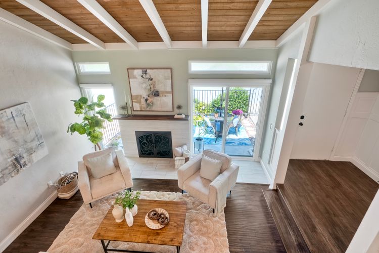 Peace. Privacy. Perfection. Location and privacy are key in this highly sought-after, duplex-style, end unit that shares only one wall. This upscale coastal charmer offers the feel of a private home in a beautifully landscaped community to enjoy expansive greenbelts perfect for morning walks, outdoor relaxation, or simply taking in the serene surroundings. This upgraded beauty features on-trend finishes. Vaulted ceilings with exposed beams, and natural light from the numerous windows that create a farmhouse design style with an open and airy feel. Beautifully remodeled eat-in kitchen with shaker style, soft close cabinets and light, neutral quartz countertops that extend from the kitchen into the dining area with ample storage. Step into your secluded front patio, thoughtfully designed to ensure privacy with no direct views of neighboring units. Inside, you'll find countless high-end upgrades throughout: Dual-pane windows & sliding doors (select sliders tinted for added privacy), Motorized blinds and solar shades—conveniently remote-operated, Custom closets with built-in drawers and cabinetry, Durable vinyl plank flooring in main living areas, plus new carpet in the primary bedroom and stairs, Tiled fireplace with wood mantle and custom cabinet-style screen (gas), Ceiling fans in both bedrooms and the living room, Stylish tile flooring and updated tiled enclosures in both bathrooms.Stay comfortable year-round with a NEW modern, energy-efficient HVAC system. A/C fully updated in July 2024. The spacious two-car garage has been upgraded with epoxy floors, insulated steel door, painted walls, and ample storage. A refrigerator and full-size washer and dryer are included for convenience. With only two units in the building, this home offers a uniquely private and quiet living experience. Move-in ready and thoughtfully upgraded, it’s the ideal blend of comfort, style, and low-maintenance living in La Costa. Ideally located to top rated schools, golf courses, shopping, dining and just minutes from Carlsbad’s world class beaches.