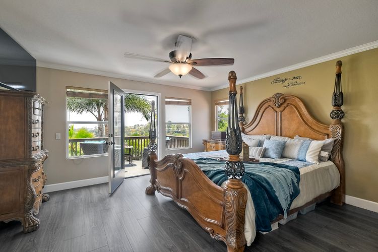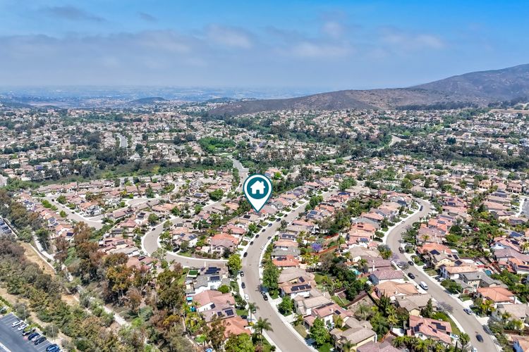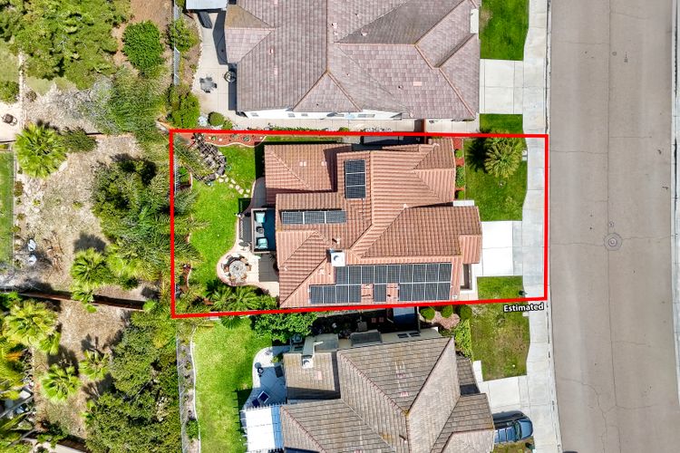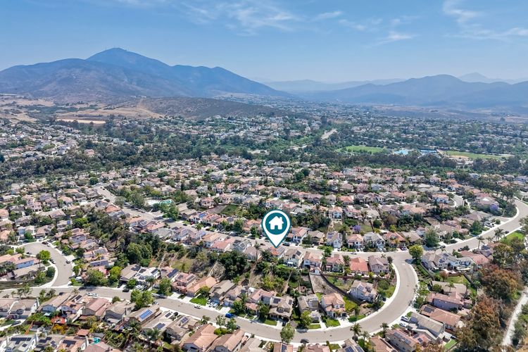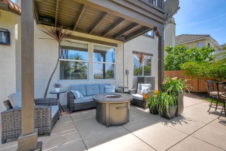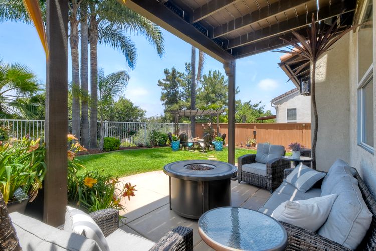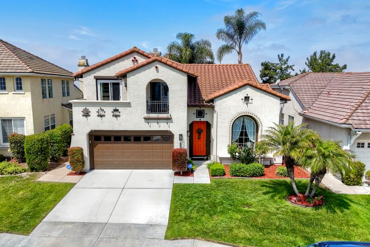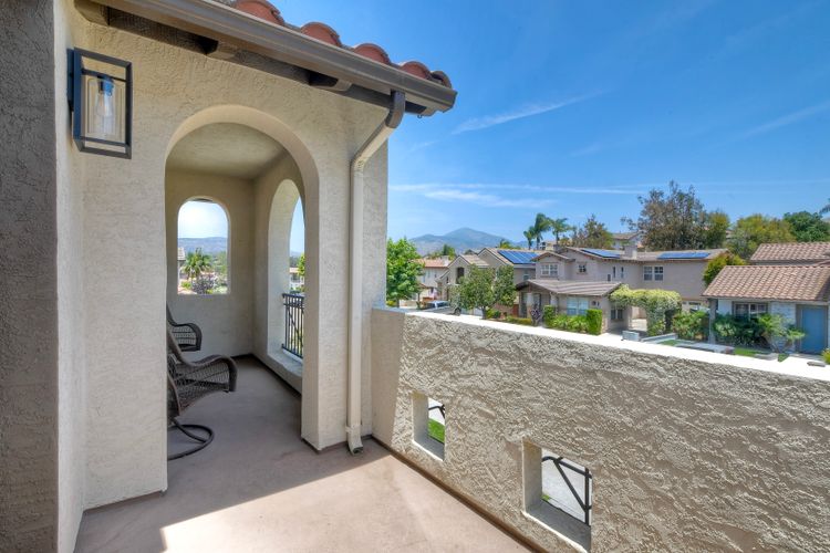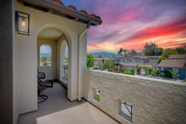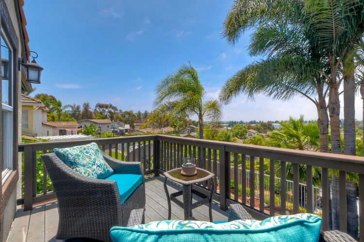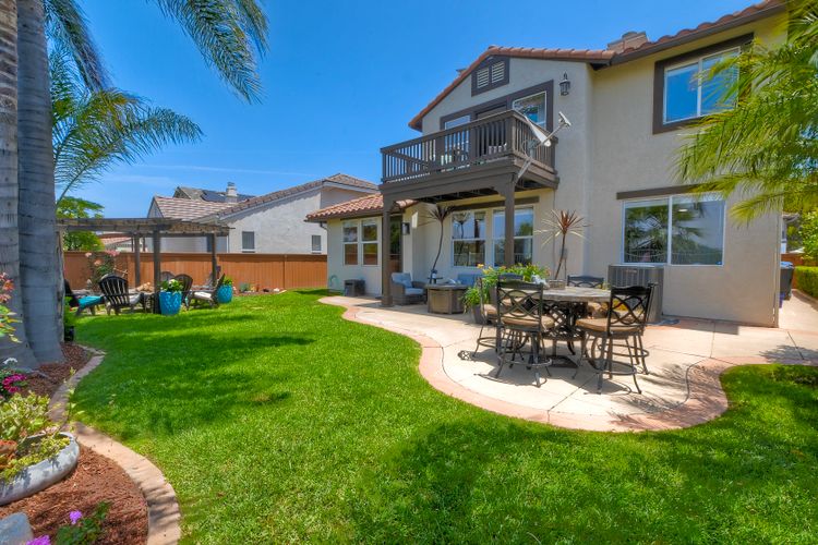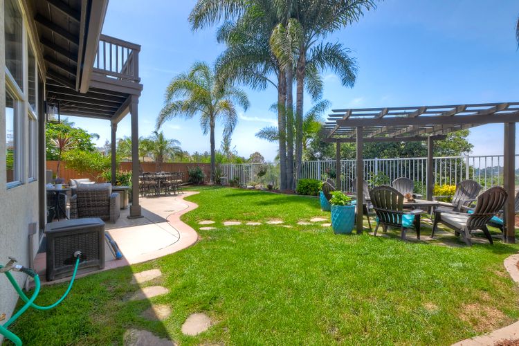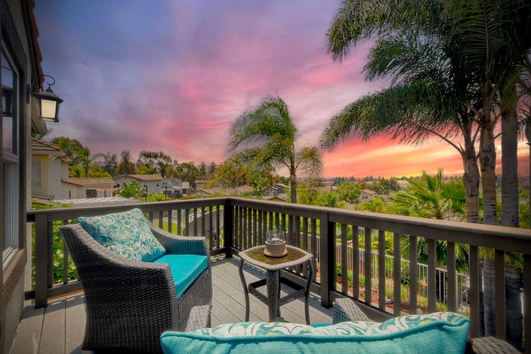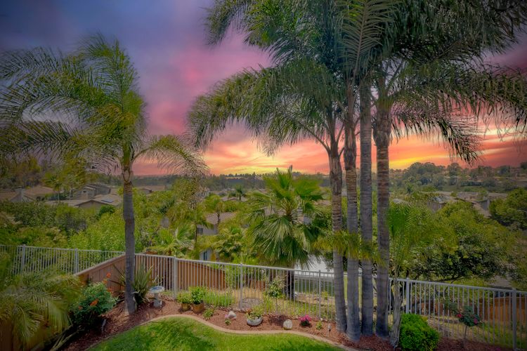 Drop-dead gorgeous Rolling Hills Ranch home with an impeccable curb appeal, an entertainer’s dream backyard, paid solar, and a desirable main-level bedroom with a full bath. This home is move-in ready and perfectly situated for your summer fun in a vibrant community. Enjoy access to multiple resort-style pools, green parks, playgrounds, and a prime location near shopping, dining, and scenic hiking and biking trails. In addition, you're just a short drive from the North Island Credit Union Amphitheatre, where the biggest names in music perform year-round. Step inside to soaring ceilings, abundant natural light, fresh interior paint, crown molding, and beautiful laminate flooring throughout (excluding bathrooms and stairs). The grand, curved staircase is a showpiece of this home, and the surrounding living room is the perfect place to entertain friends and family. The spacious kitchen is a chef’s dream. It features a center island with bar seating, a cozy breakfast nook, stainless steel appliances, and an entire wall of storage cabinets for all of your supplies, plus an open sightline to the cozy family room with fireplace. Upstairs, all bedrooms have their own private balconies, including the primary suite which offers breathtaking sunset views. Its ensuite bathroom boasts beautiful cabinetry, dual sinks, a soaking tub, and a separate walk-in shower. Enjoy San Diego’s amazing weather as you step outside to your ultra-private tropical backyard, complete with lush green trees, mature palms, grass, gazebo, and patio. No visible neighbors behind you! Offering unobstructed panoramic views and cool breezes, it's a true entertainers paradise. Updates include newer cabinetry in the primary suite, updated bathroom fixtures, newer A/C and HVAC systems, and a pressure gauge. A wired security system and home alarm with ADT provides peace of mind. Ceiling fans and A/C keep you comfortable. The spacious garage includes ceiling-mounted pulley racks to maximize your storage potential. No Mello-Roos and low HOA! Paid solar! Excellent local public schools. Make this spectacular home your San Diego oasis before it's gone!