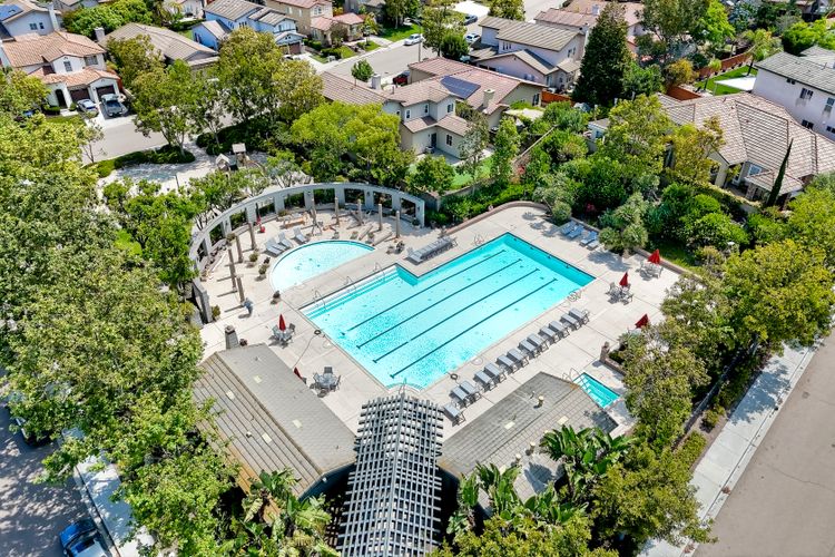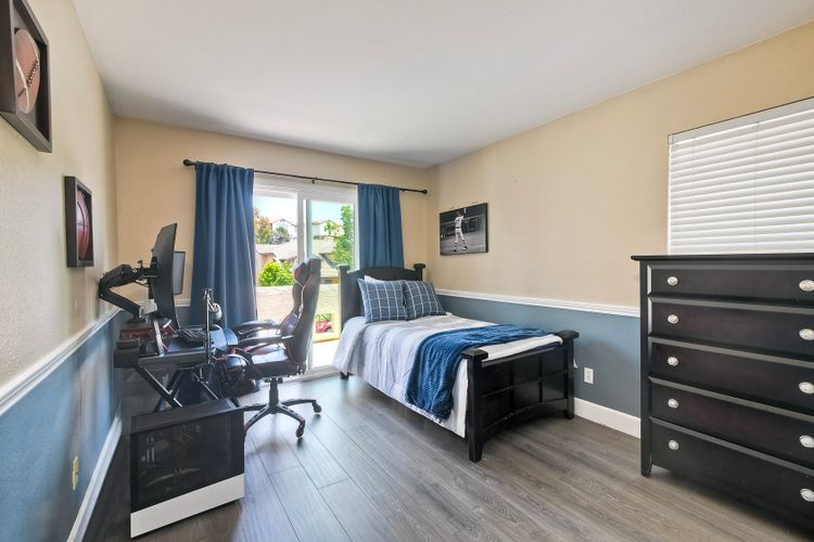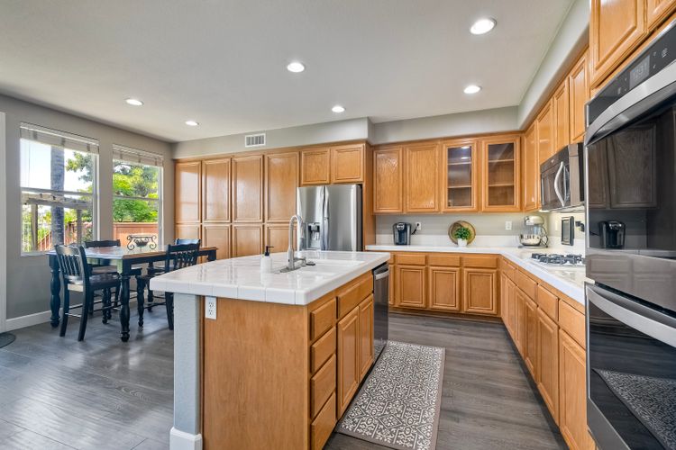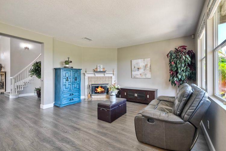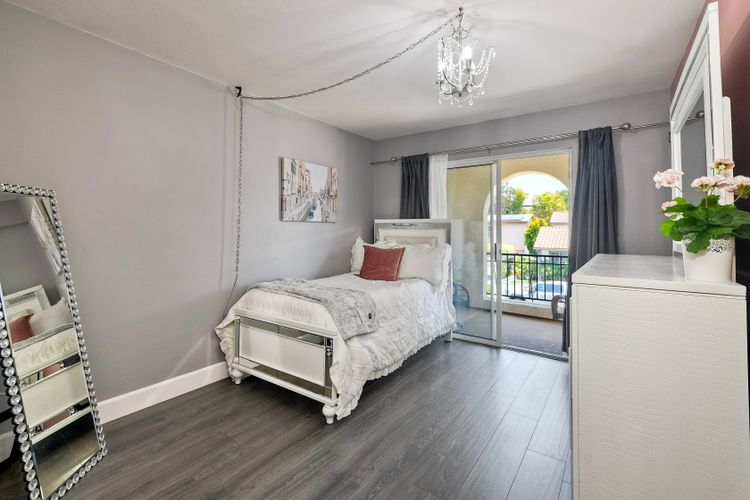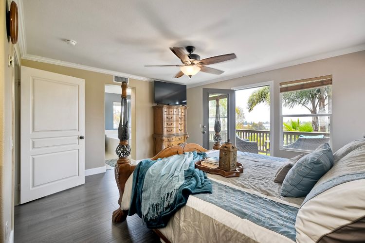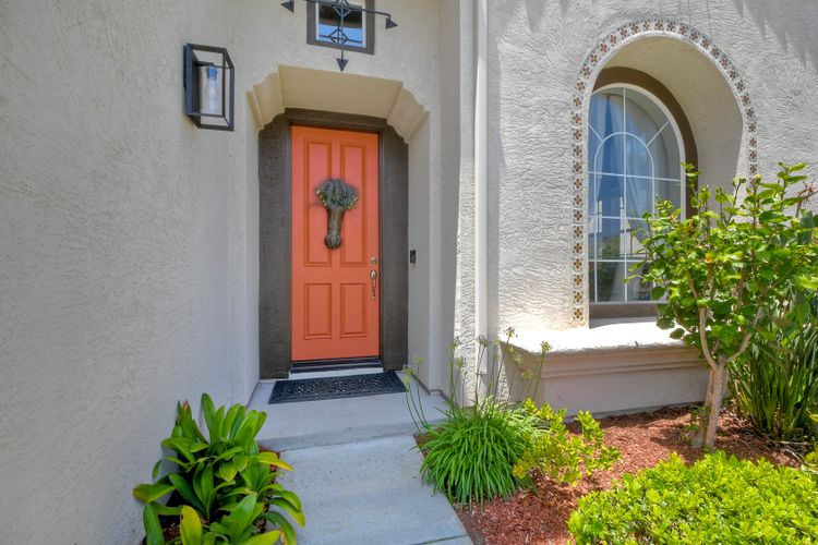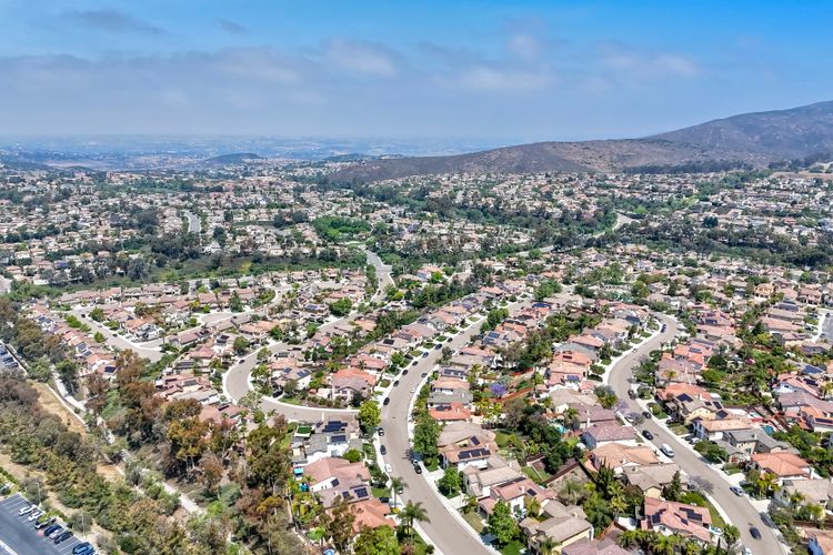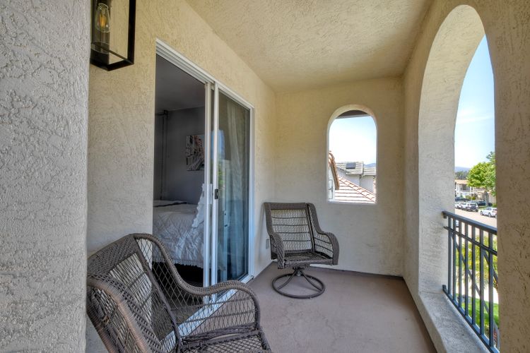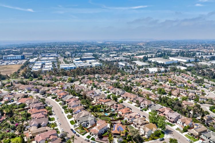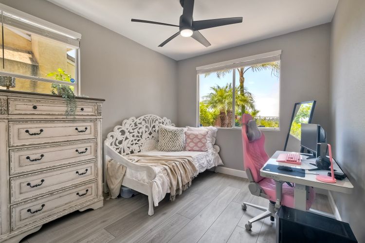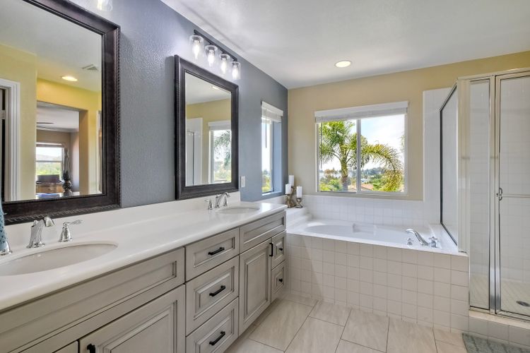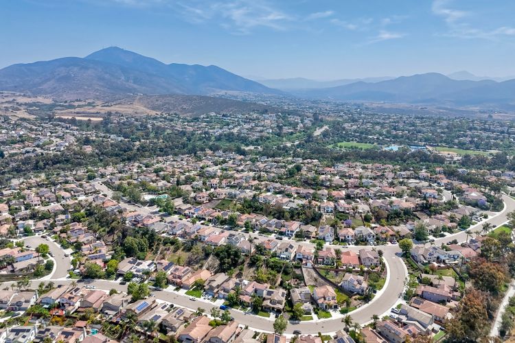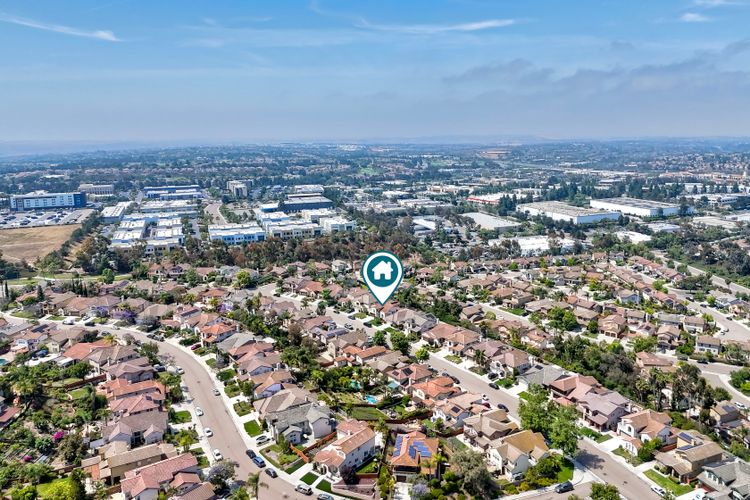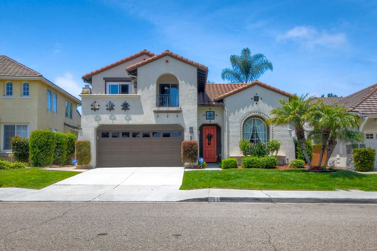 Drop-dead gorgeous Rolling Hills Ranch home with an impeccable curb appeal, an entertainer’s dream backyard, paid solar, and a desirable main-level bedroom with a full bath. This home is move-in ready and perfectly situated for your summer fun in a vibrant community. Enjoy access to multiple resort-style pools, green parks, playgrounds, and a prime location near shopping, dining, and scenic hiking and biking trails. In addition, you're just a short drive from the North Island Credit Union Amphitheatre, where the biggest names in music perform year-round. Step inside to soaring ceilings, abundant natural light, fresh interior paint, crown molding, and beautiful laminate flooring throughout (excluding bathrooms and stairs). The grand, curved staircase is a showpiece of this home, and the surrounding living room is the perfect place to entertain friends and family. The spacious kitchen is a chef’s dream. It features a center island with bar seating, a cozy breakfast nook, stainless steel appliances, and an entire wall of storage cabinets for all of your supplies, plus an open sightline to the cozy family room with fireplace. Upstairs, all bedrooms have their own private balconies, including the primary suite which offers breathtaking sunset views. Its ensuite bathroom boasts beautiful cabinetry, dual sinks, a soaking tub, and a separate walk-in shower. Enjoy San Diego’s amazing weather as you step outside to your ultra-private tropical backyard, complete with lush green trees, mature palms, grass, gazebo, and patio. No visible neighbors behind you! Offering unobstructed panoramic views and cool breezes, it's a true entertainers paradise. Updates include newer cabinetry in the primary suite, updated bathroom fixtures, newer A/C and HVAC systems, and a pressure gauge. A wired security system and home alarm with ADT provides peace of mind. Ceiling fans and A/C keep you comfortable. The spacious garage includes ceiling-mounted pulley racks to maximize your storage potential. No Mello-Roos and low HOA! Paid solar! Excellent local public schools. Make this spectacular home your San Diego oasis before it's gone!