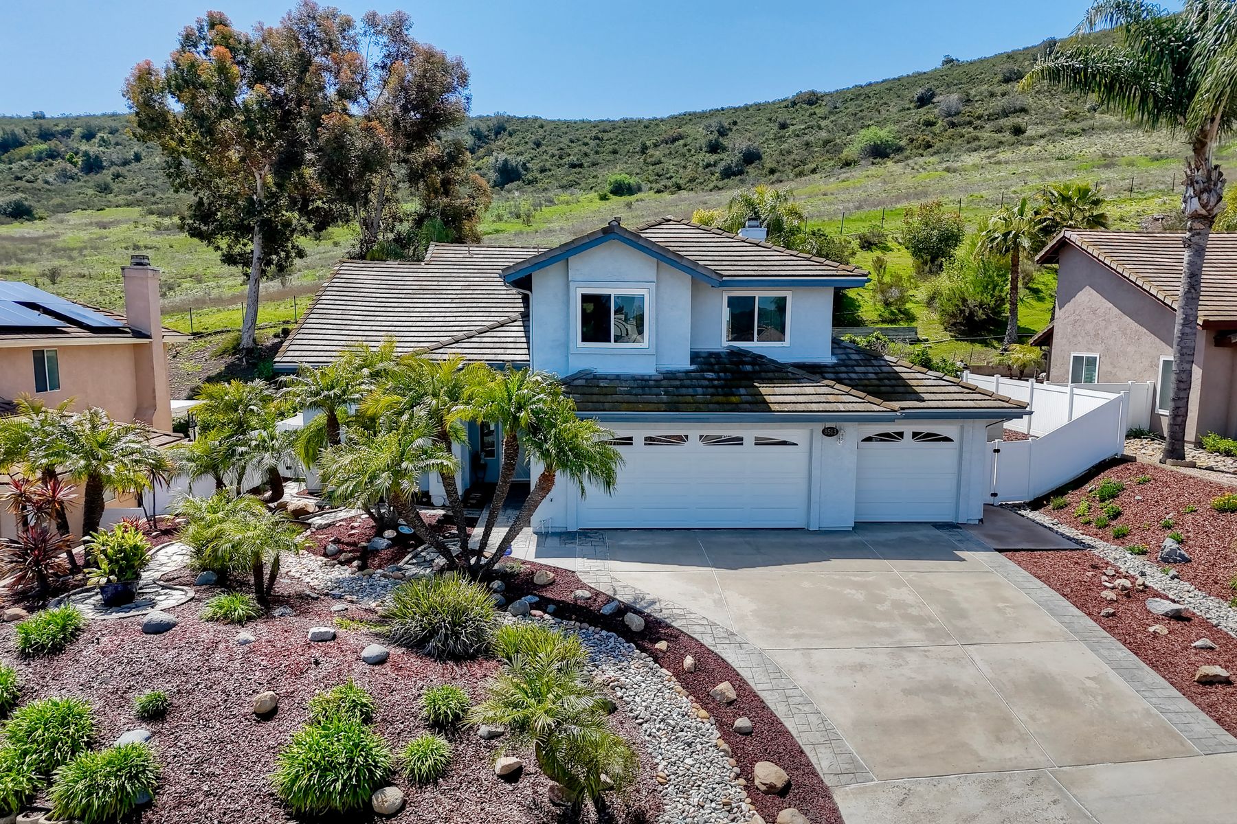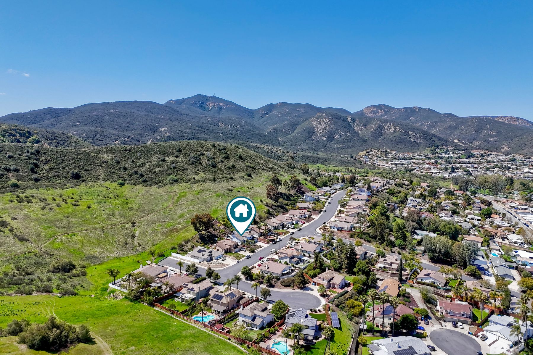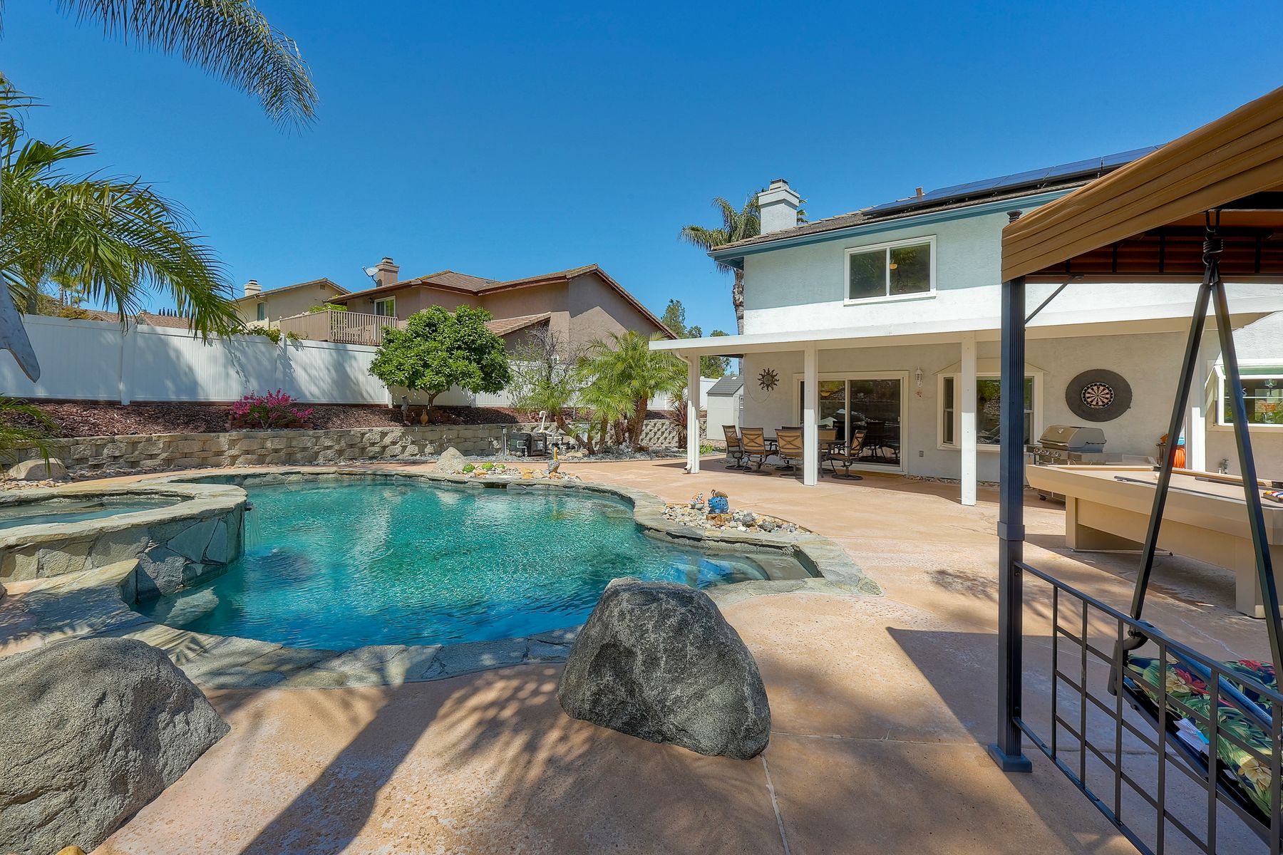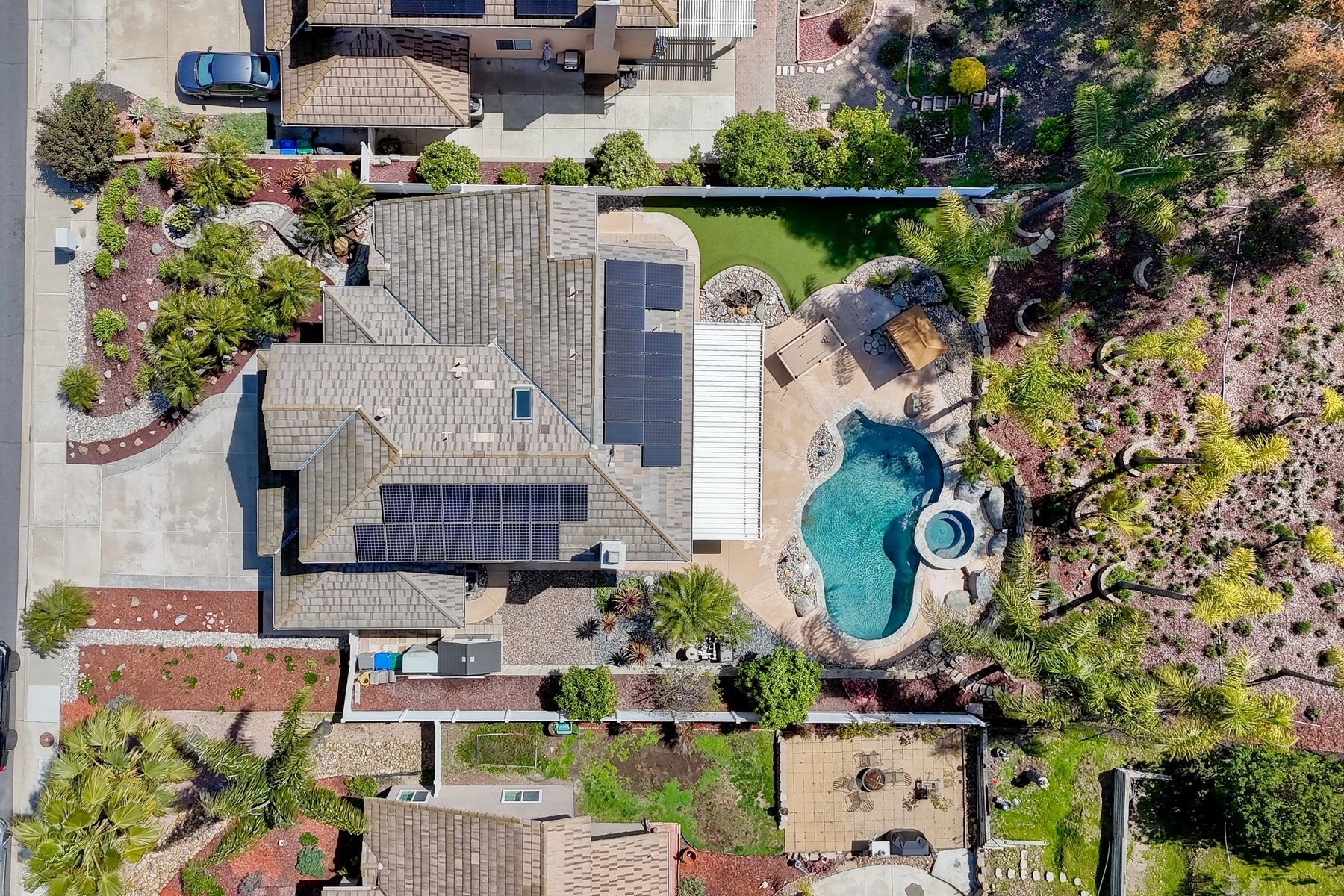 How can it get any better? Beyond turnkey 2,400 SqFt Home on .25 acre meticulously landscaped lot complete with pool/spa, fully owned solar, fruit trees and backing up to Cowles Mountain views!! If you have been seeking a home for your family that provides entertainment opportunities & memories which will last for years ~ you may well have found it! Offering 4 bedrooms (of which one is on entry level), PLUS an office (attached to Primary) and three FULL bathrooms (one on entry level). This open floorplan encourages everyone to share time and space together yet also offers privacy when one needs it. The interior: tastefully upgraded with colors and finishes that are sure to please the most particular of buyers. Kitchen and all three bathrooms have been renovated in neutral tones and impeccable finishes. Cherry laminate flooring - tasteful and easy to care for. The exterior: Designed with FUN in mind - this spacious backyard and pool will make your home the place that everyone wants to be!! ADDITIONAL benefits: FULLY OWNED solar panels. EV charger in the garage. Up-down blinds. Dual pane windows installed 15 years ago. NEW ROOF in 2018. 10-Year New HVAC. House exterior painted within last 5 years. Over-sized 3-car garage w/ ample storage and shelving. This home - situated in the very Southwest corner of Santee puts you close to freeway access, within 30 minutes of the airport, within 30 minutes of the coast, at the base of Cowles Mountain (for the adventurer in you). Just when you may have lost hope that the perfect home existed for you ~ 8513 Mesa Heights is here to restore that hope and waiting for you to start enjoying all the future has to offer!!